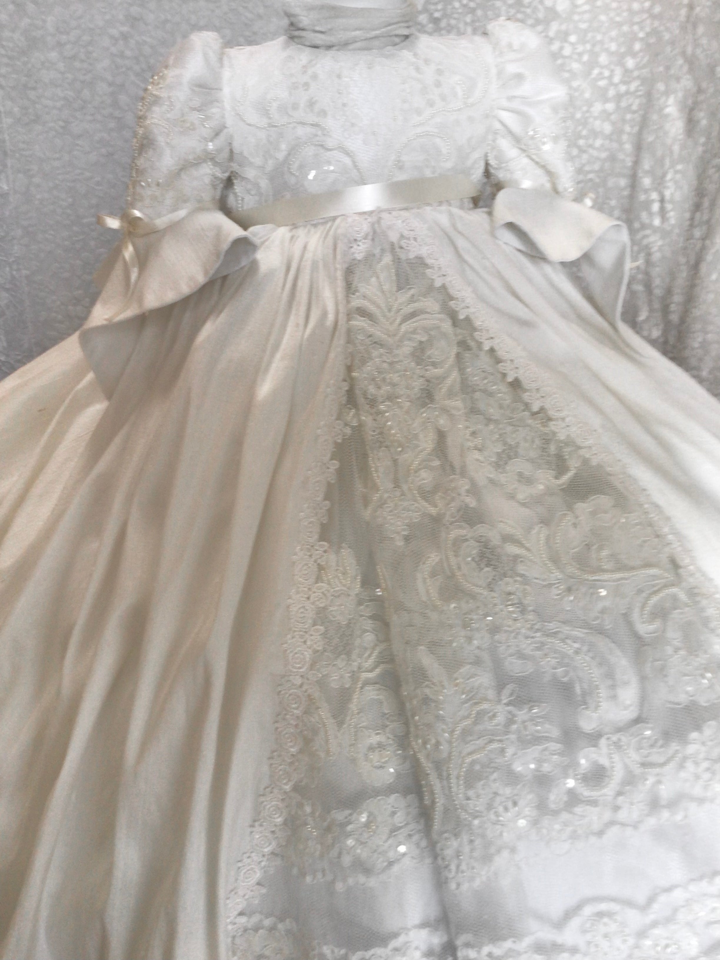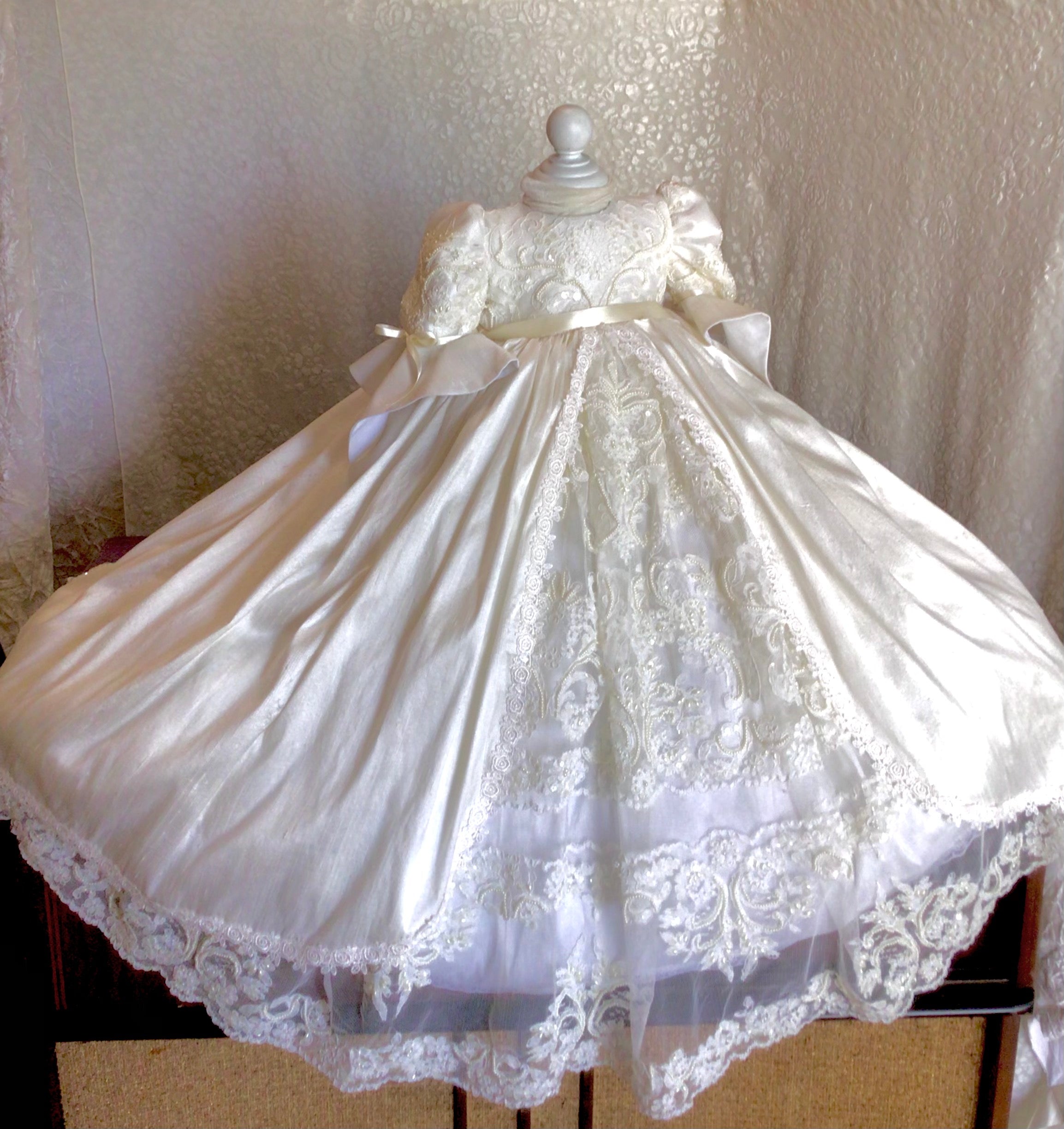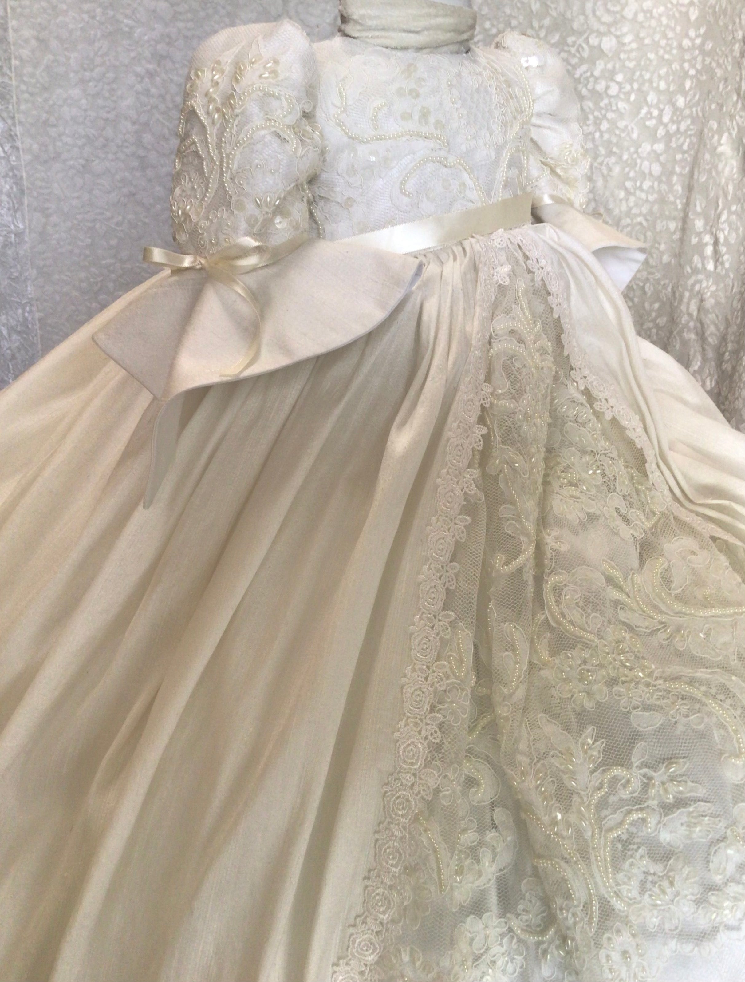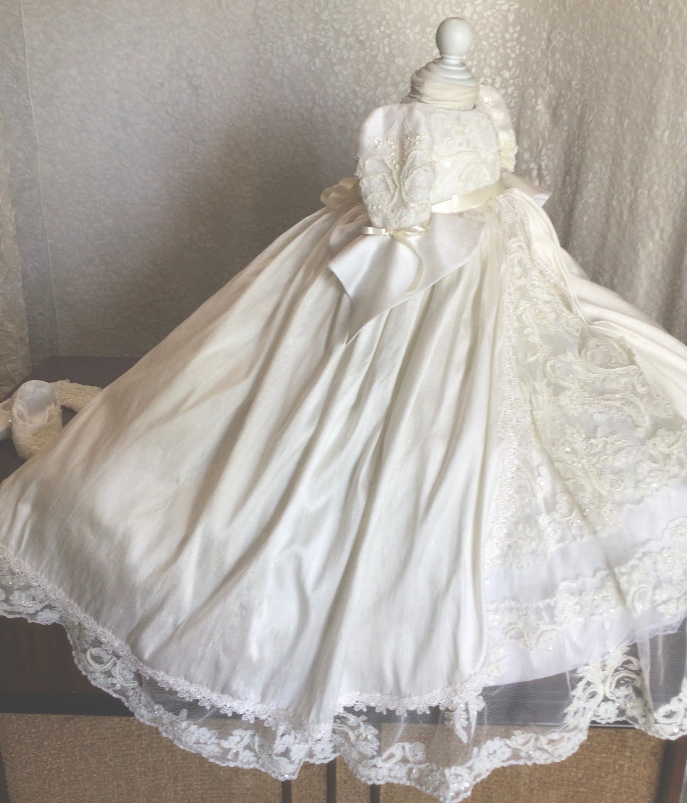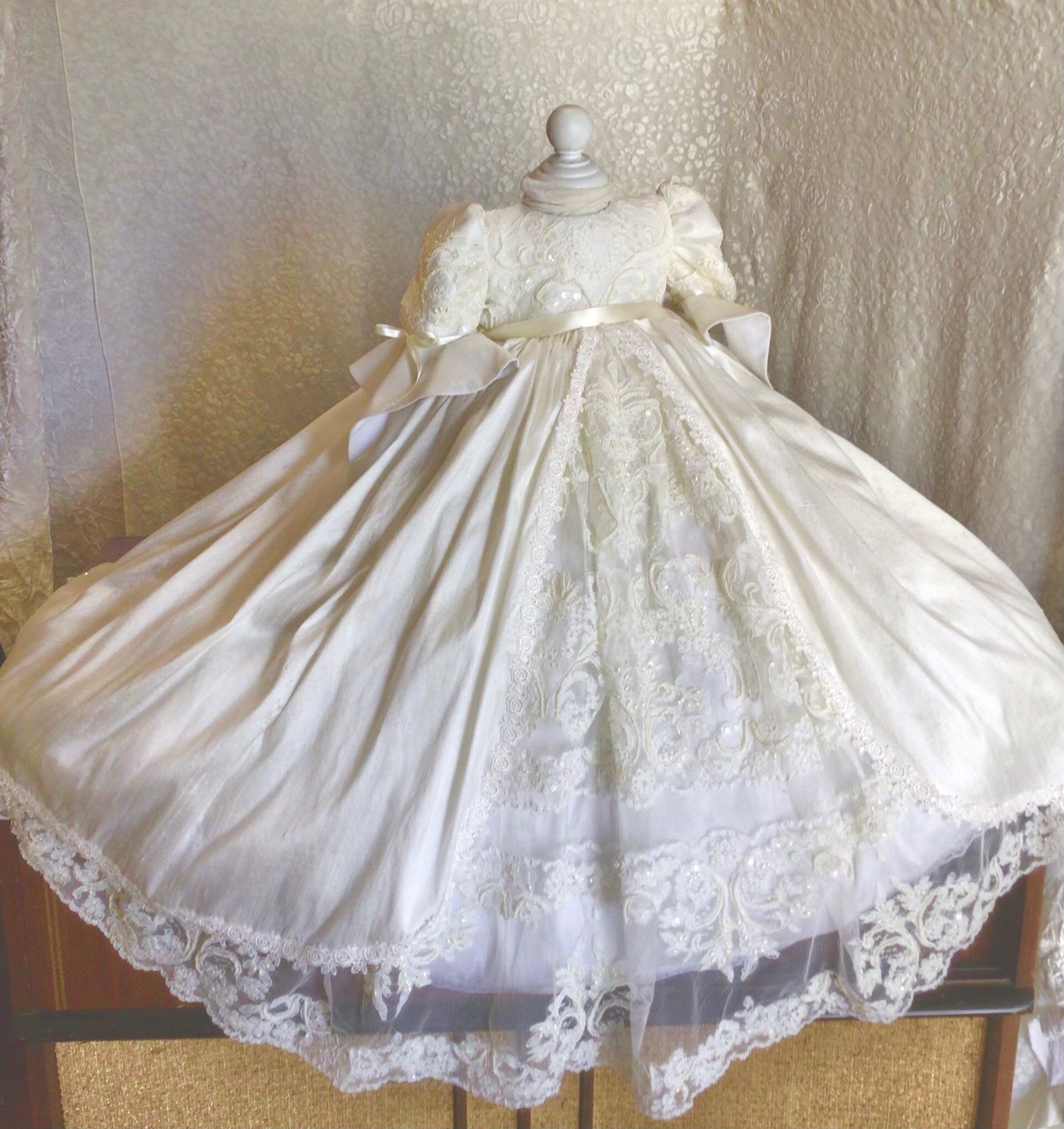 Celebrate your baby's special occasion with this elegant vintage-inspired Victorian heirloom baptism gown, handcrafted in the USA. The gown features luxurious fabrics and exquisite details for a timeless look: • 100% silk • Hand-beaded lace overlay • Built-in crinoline for volume Additional highlights include 3/4 puffed sleeves, a dramatic 90” wide skirt, a classic open-back closure, and full lining for comfort. Available in white and antique white, this couture gown pairs beautifully with matching accessories available by preorder.