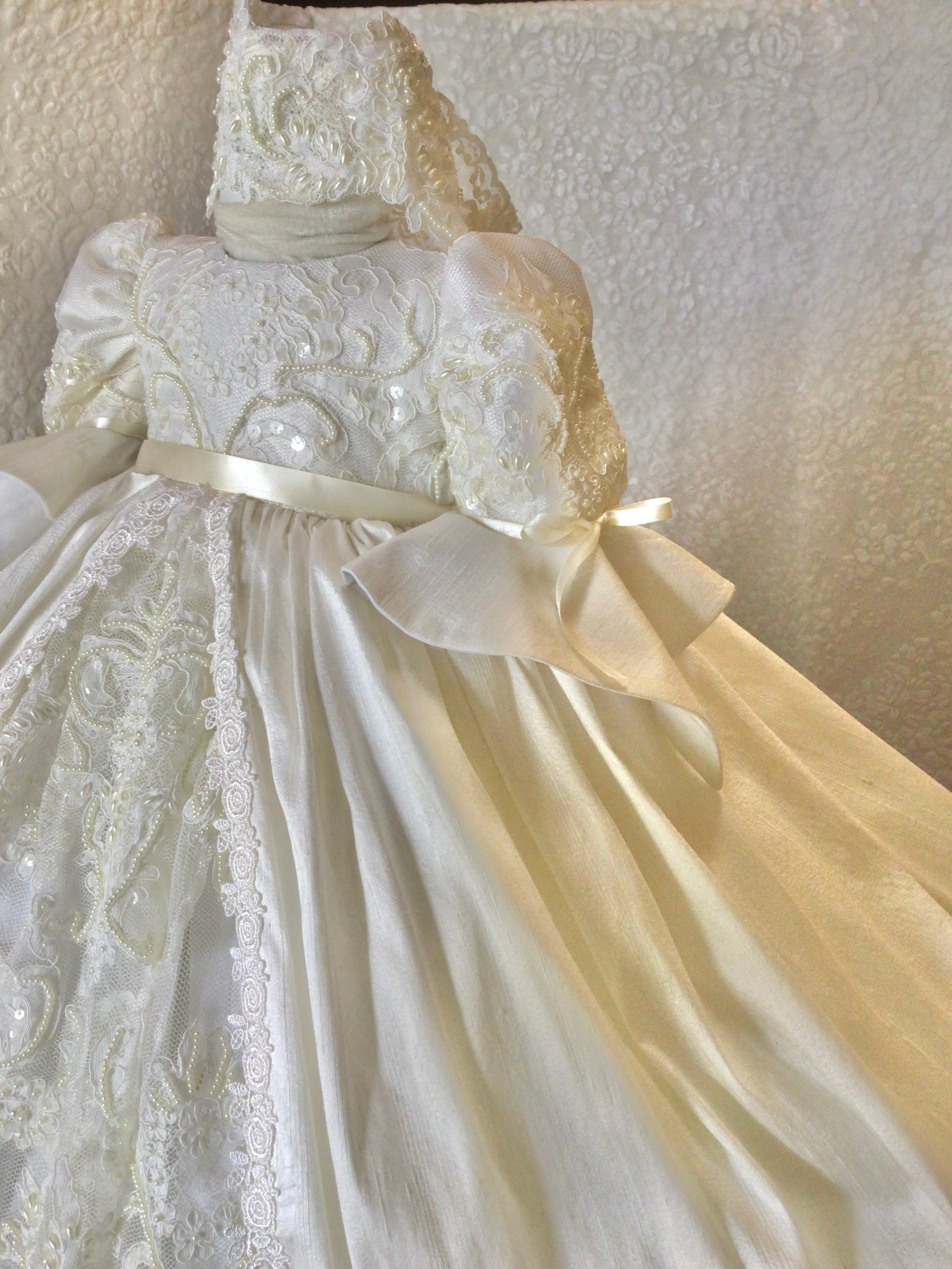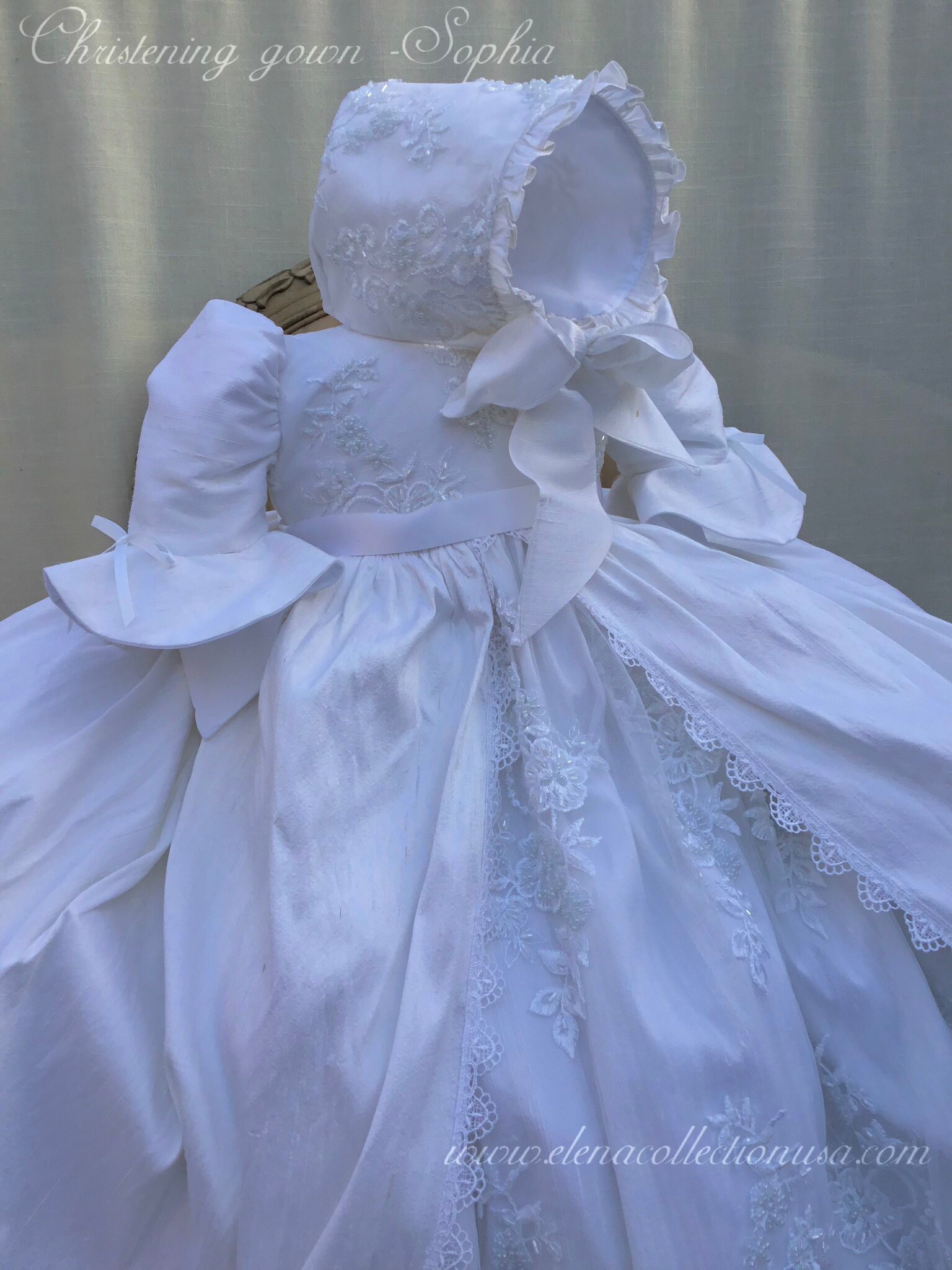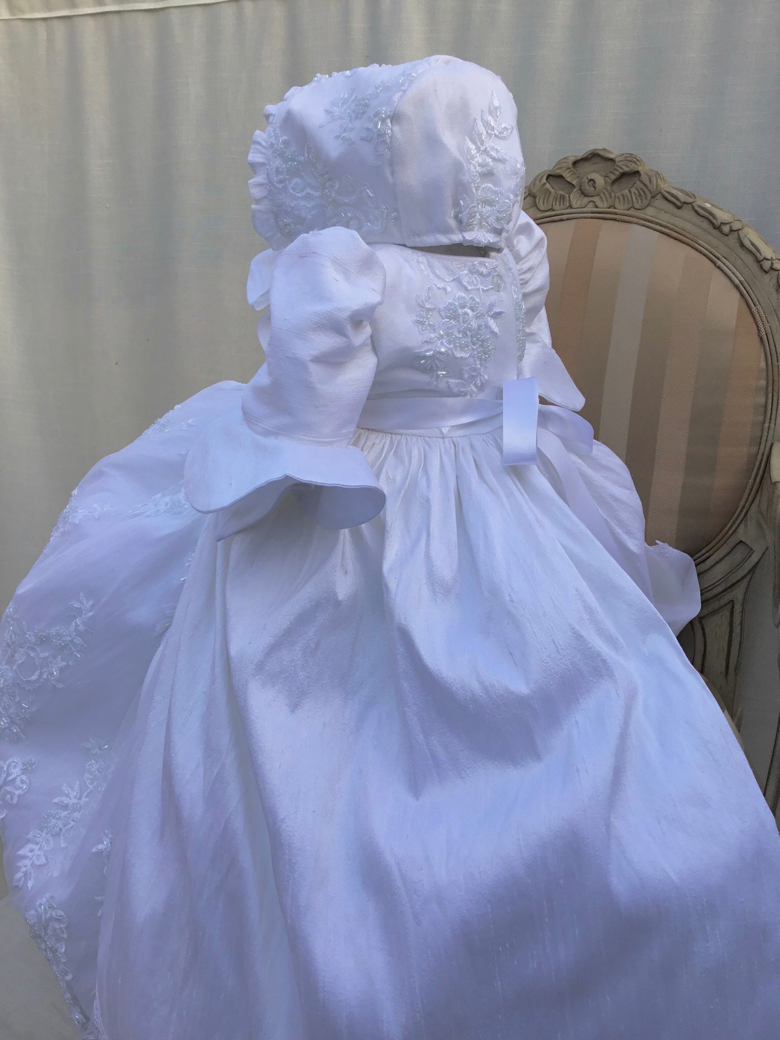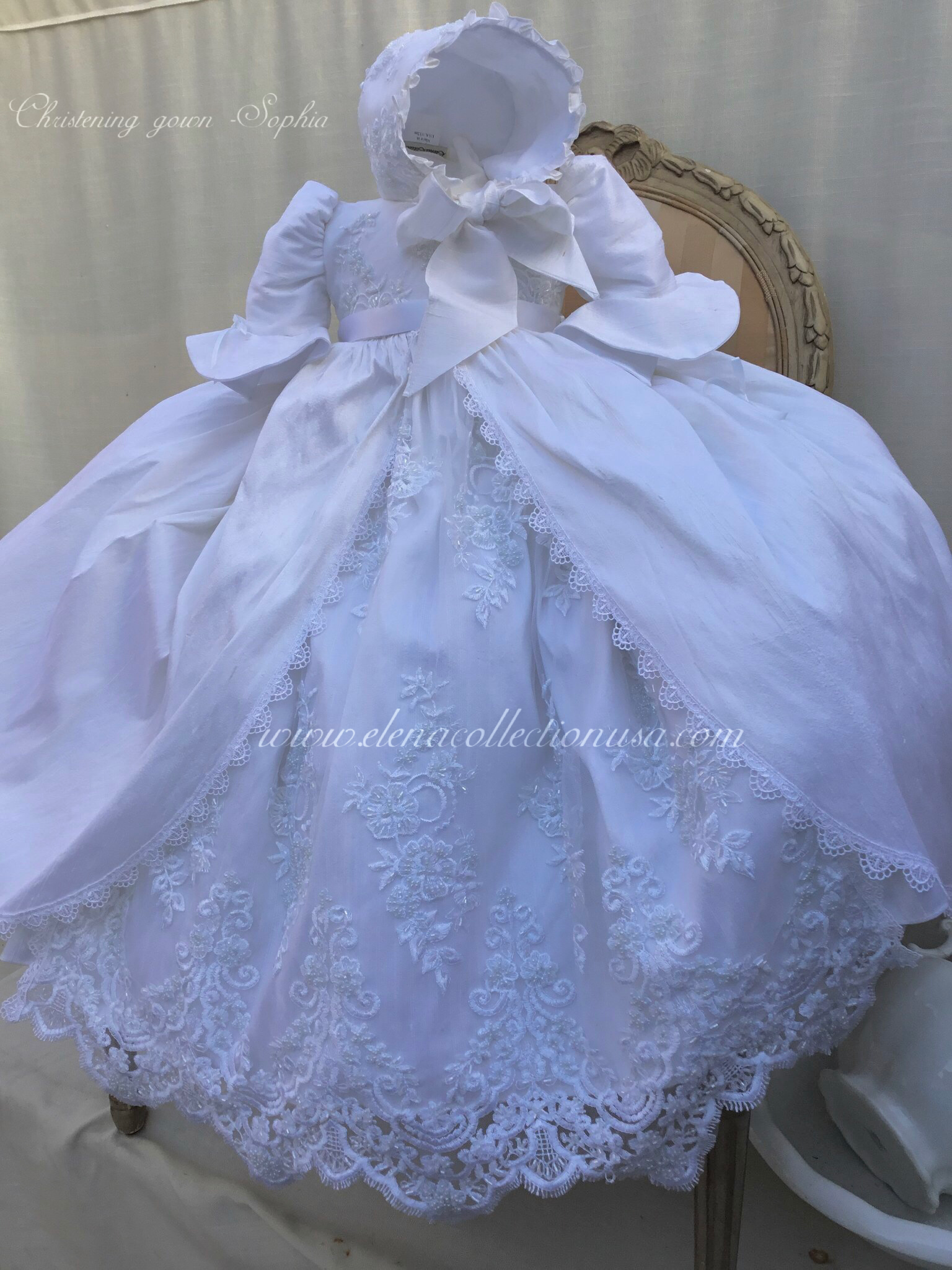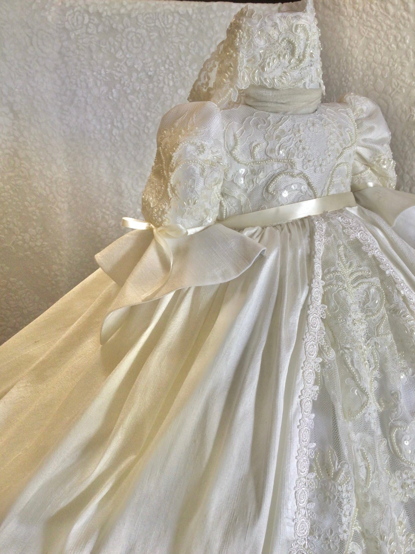 Celebrate your baby's special occasion with this elegant vintage-inspired Victorian heirloom baptism gown, handcrafted in the USA. The gown features luxurious fabrics and exquisite details for a timeless look: • 100% silk • Hand-beaded lace overlay • Built-in crinoline for volume Additional highlights include 3/4 puffed sleeves, a dramatic 90” wide skirt, a classic open-back closure, and full lining for comfort. Available in white and antique white, this couture gown pairs beautifully with matching accessories available by preorder.