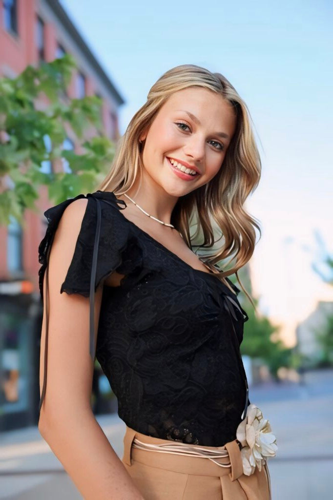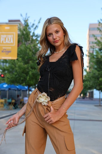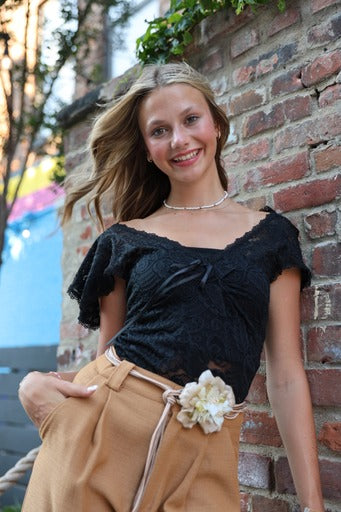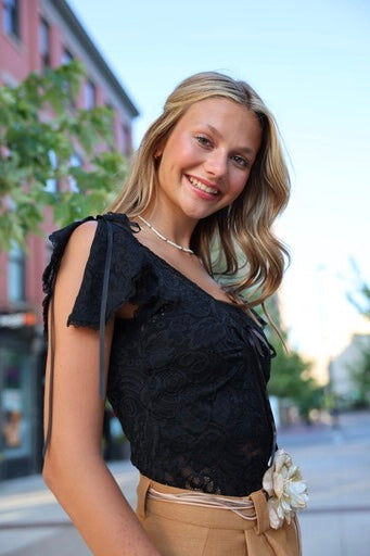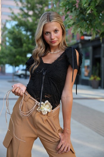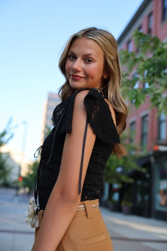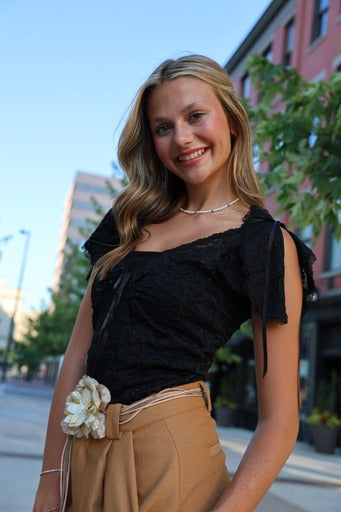 This darling butterfly lace top comes with ribbon bows on the shoulders and the front. Wear it as an essential for the office or while heading out on the town.