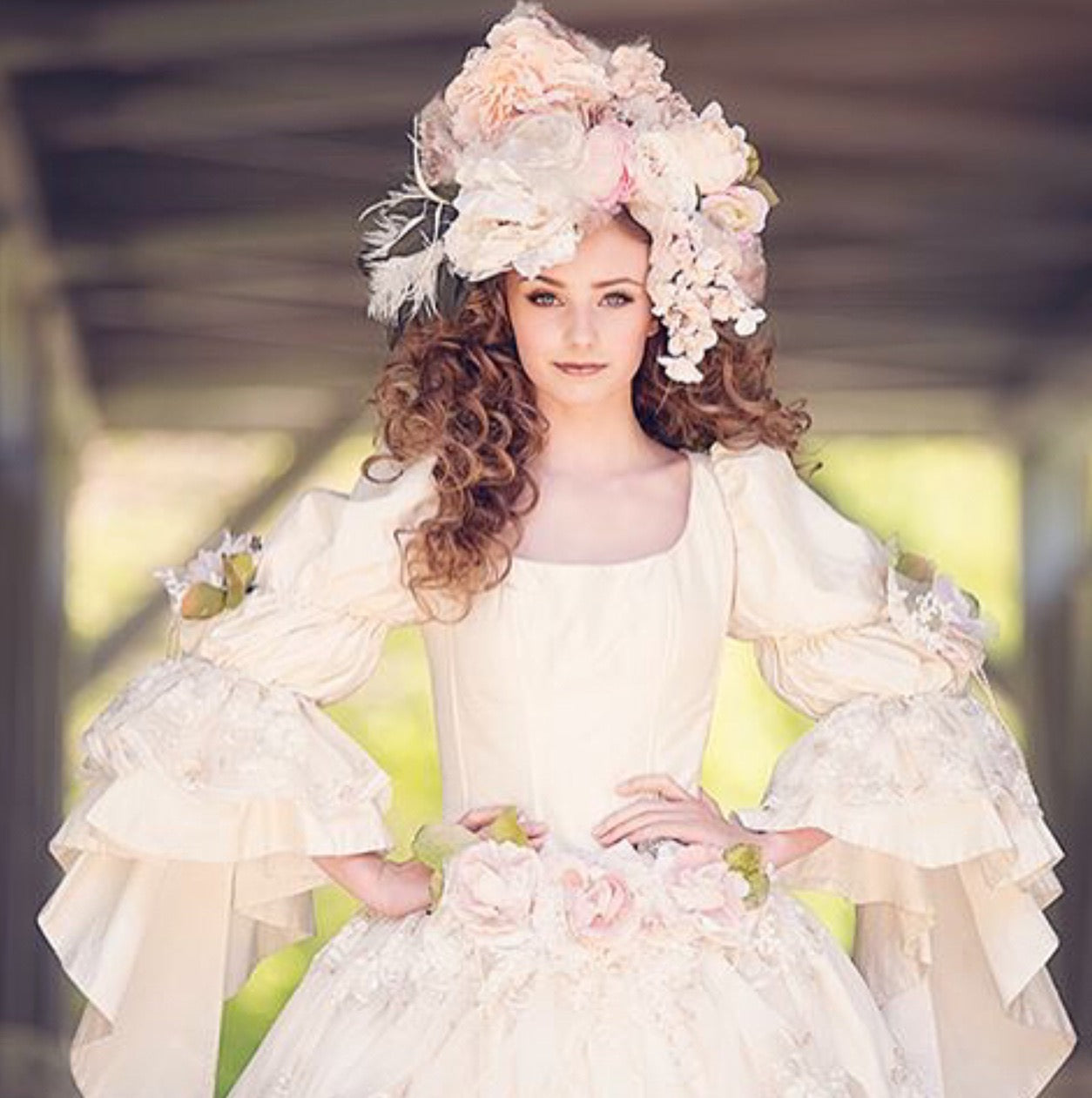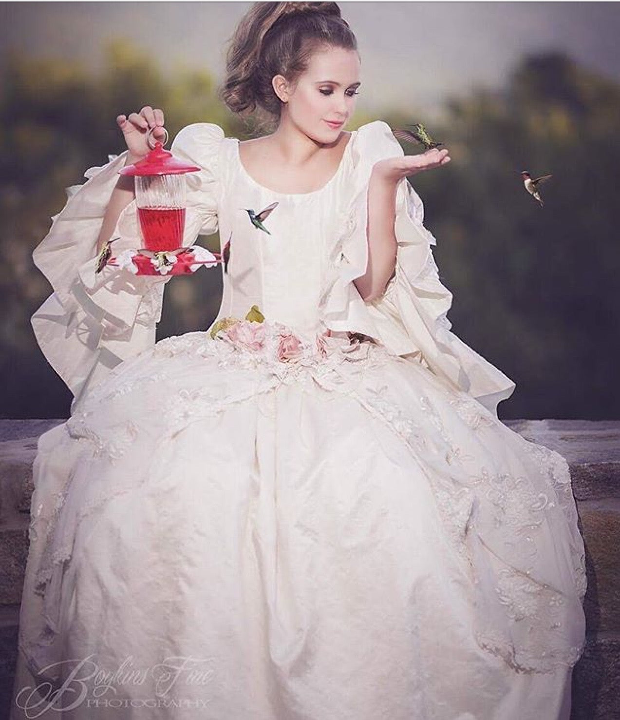 ’Dee is one of our most beautiful and elaborated Victorian inspired wedding gown feature a corset back to adjust your silhouette to your comfort, It is fully lined with added crinoline for the fullness of the entire skirt.