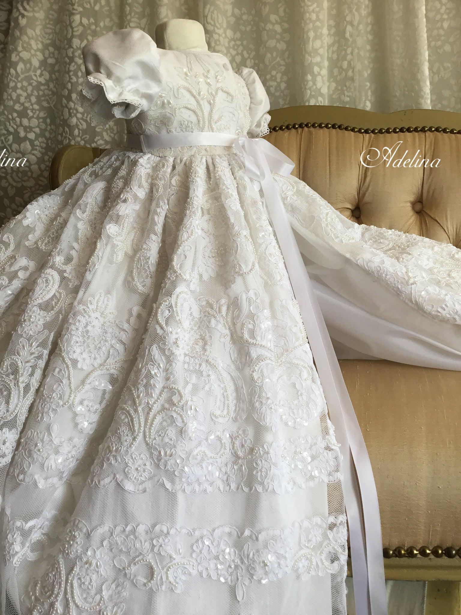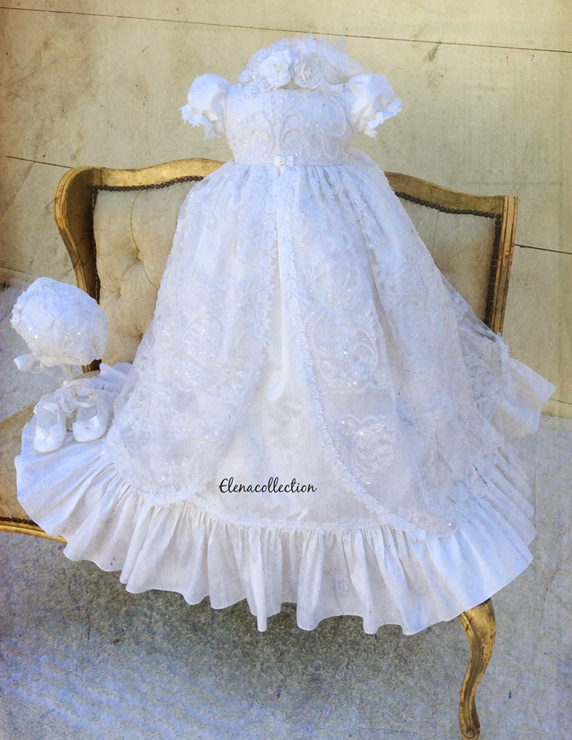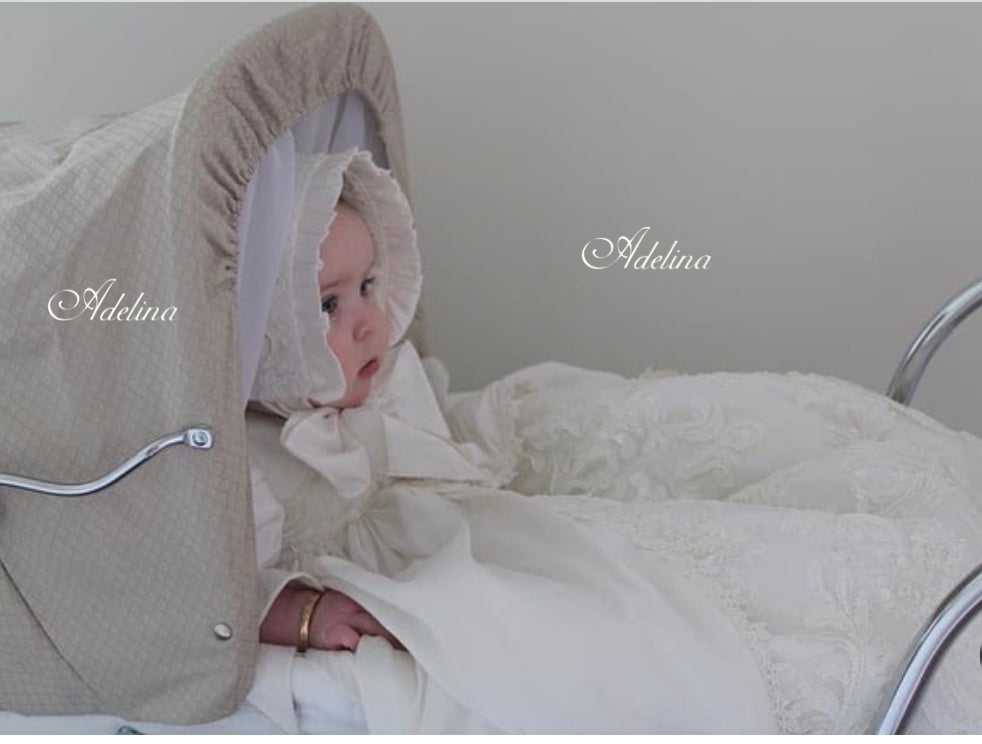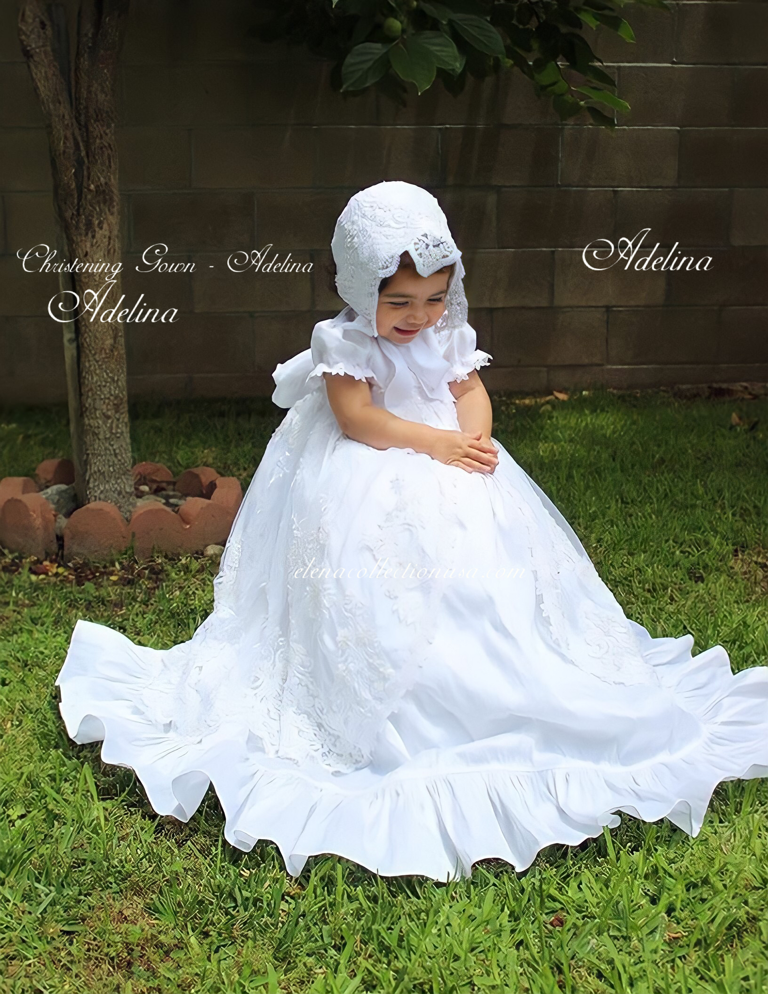 Adelina is a luxurious, handmade silk christening gown featuring delicate hand-beaded lace embroidery and a full, flowing skirt. Designed with puffy silk sleeves and an open back secured by two hand-sewn buttons, this heirloom-quality gown includes a matching bonnet and soft cotton lining for comfort. Made to order in California, it ships worldwide within 1-2 weeks via UPS Priority. Custom sizing and accessories are available. Fabrics and materials: • Silk • Beaded lace • Tulle • Piping • Fusing • Cotton lining