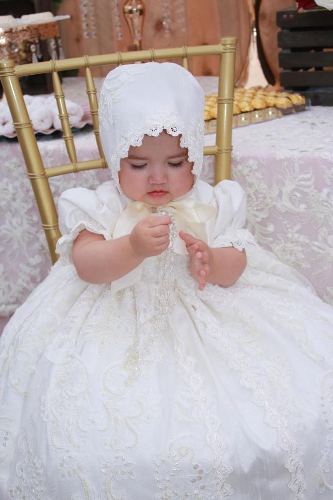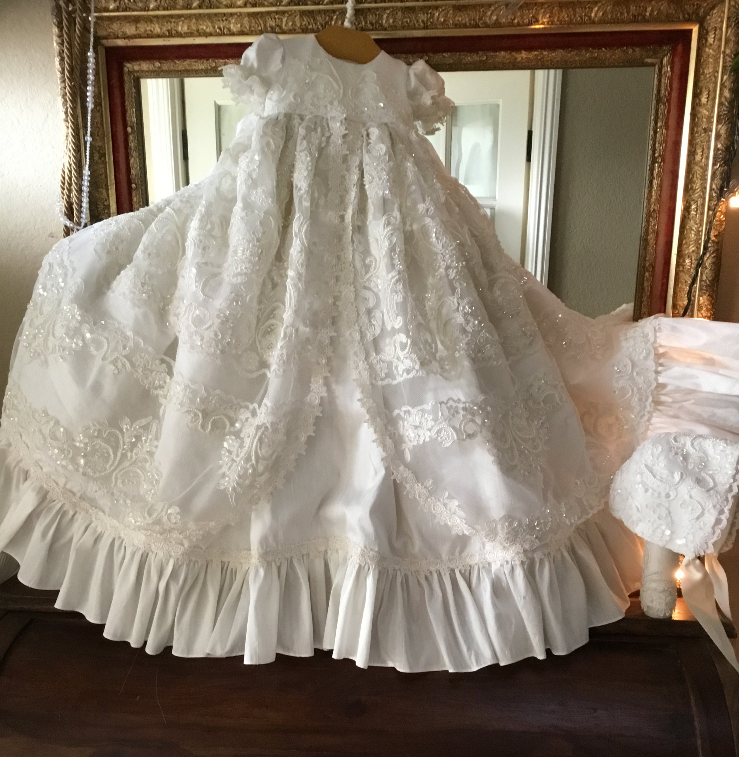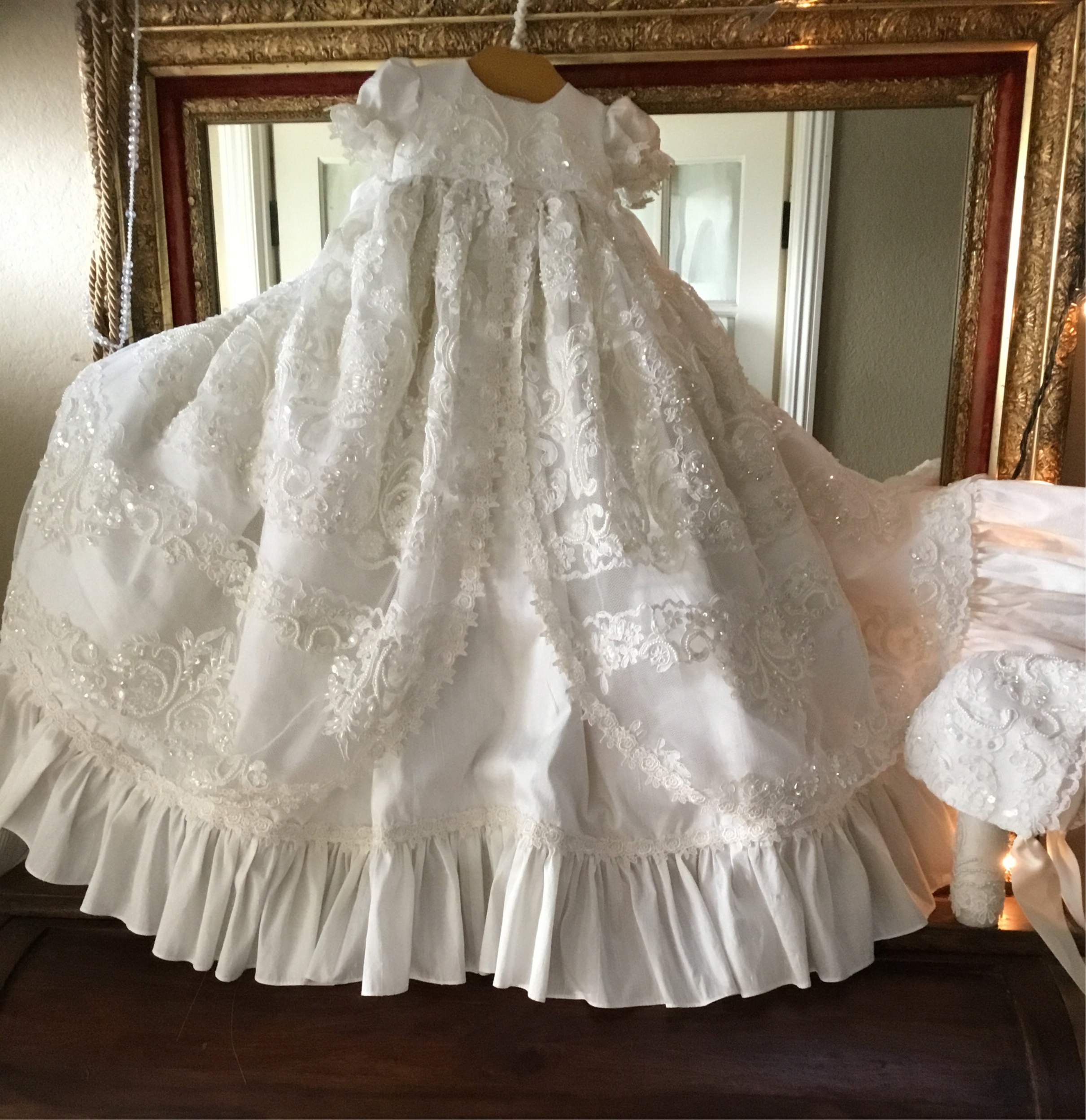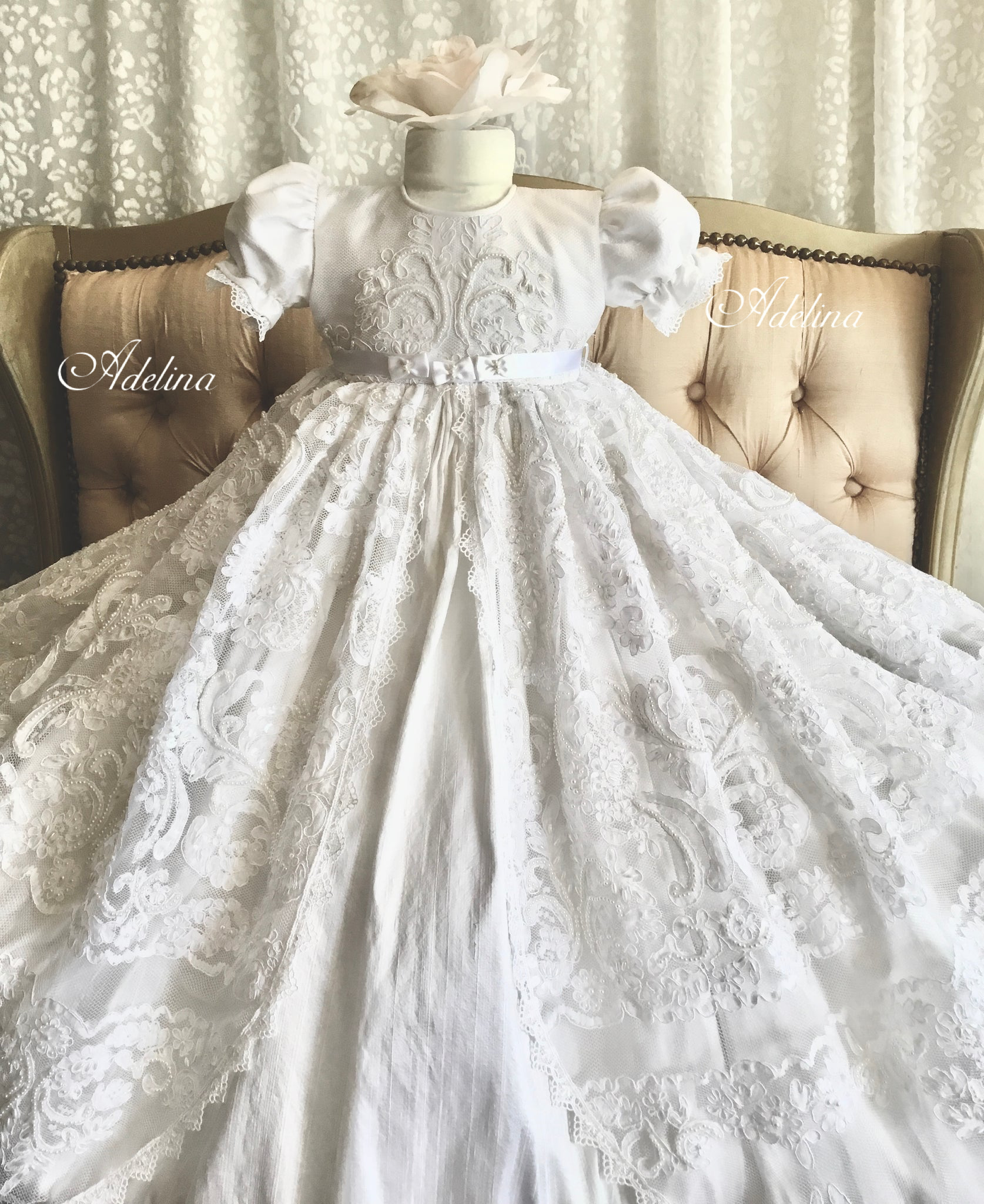 Adelina is a luxurious, handmade silk christening gown featuring delicate hand-beaded lace embroidery and a full, flowing skirt. Designed with puffy silk sleeves and an open back secured by two hand-sewn buttons, this heirloom-quality gown includes a matching bonnet and soft cotton lining for comfort. Made to order in California, it ships worldwide within 1-2 weeks via UPS Priority. Custom sizing and accessories are available. Fabrics and materials: • Silk • Beaded lace • Tulle • Piping • Fusing • Cotton lining