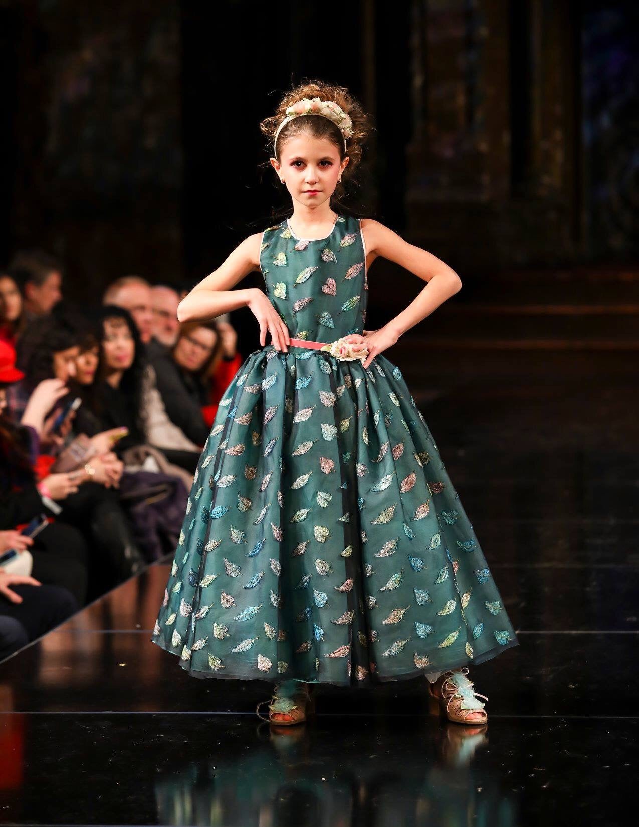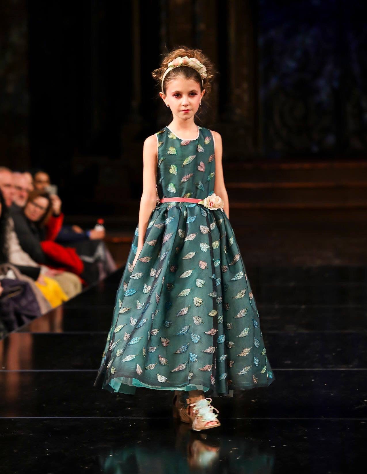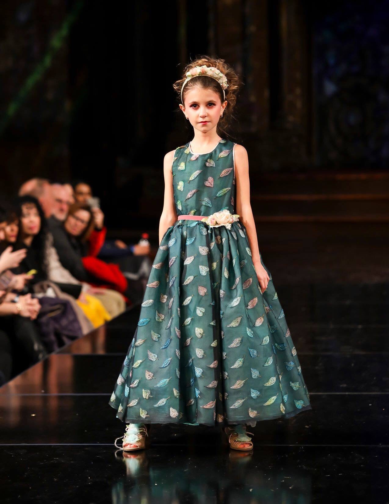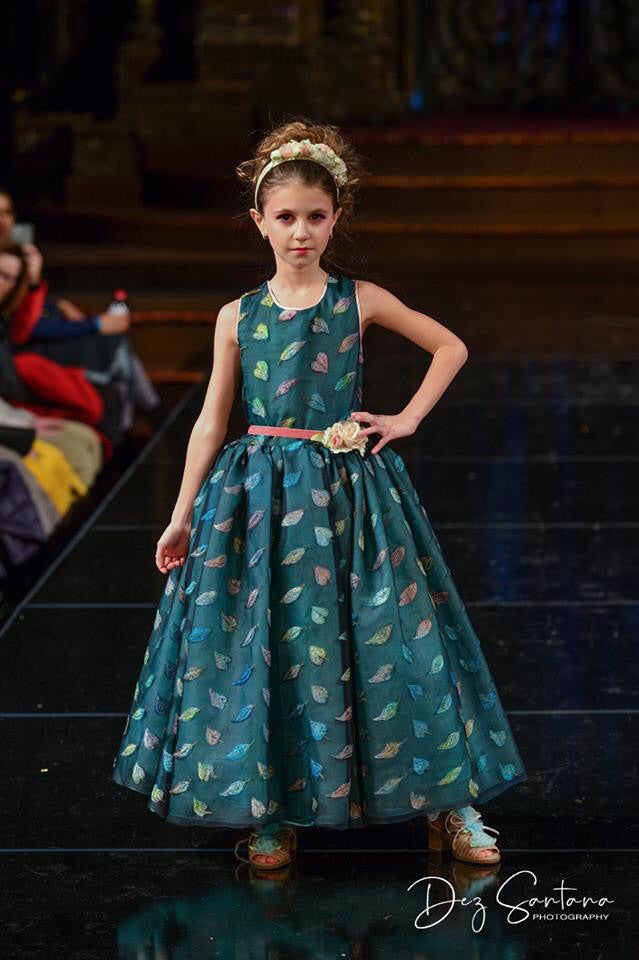 Alessandra, is a beautiful dress for flower girls. Is made of a unique silk embroidery organza limited edition fabric. It is adorn at the waist with velvet ribbon and a detachable flower brooch or hair pice.