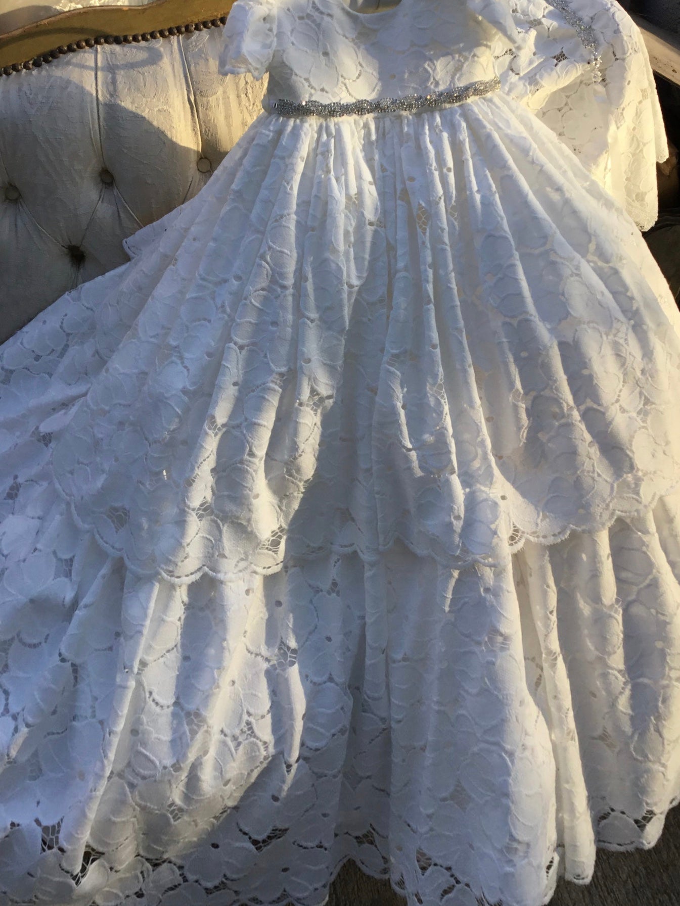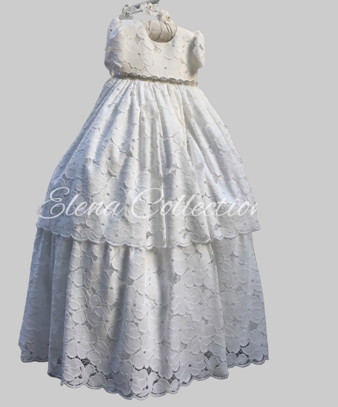 A timeless heirloom gown, handcrafted in a soft 80% cotton blend lace for comfort and elegance. The gown features a classic round neckline, puff sleeves, and a beautifully layered skirt with scalloped lace edging. A hand-embellished beaded sash adds a touch of shimmer, making this piece perfect for a sacred occasion.