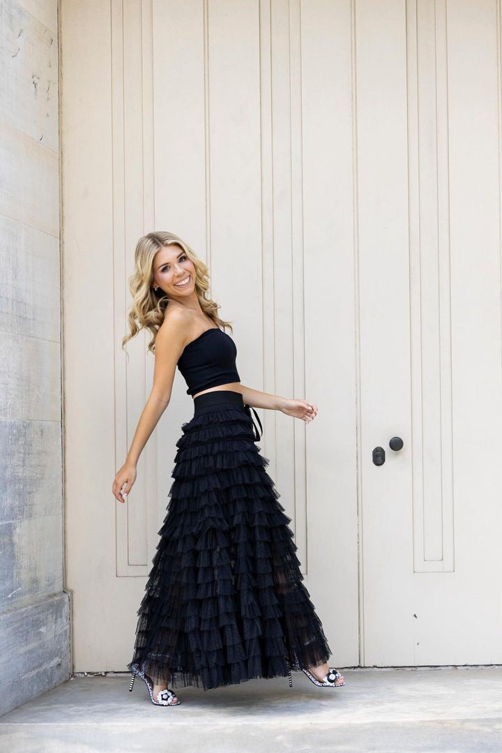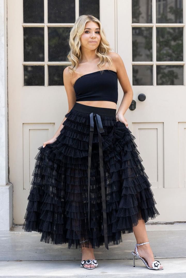 Tiered elastic waist maxi lace skirt perfect for any occasion.