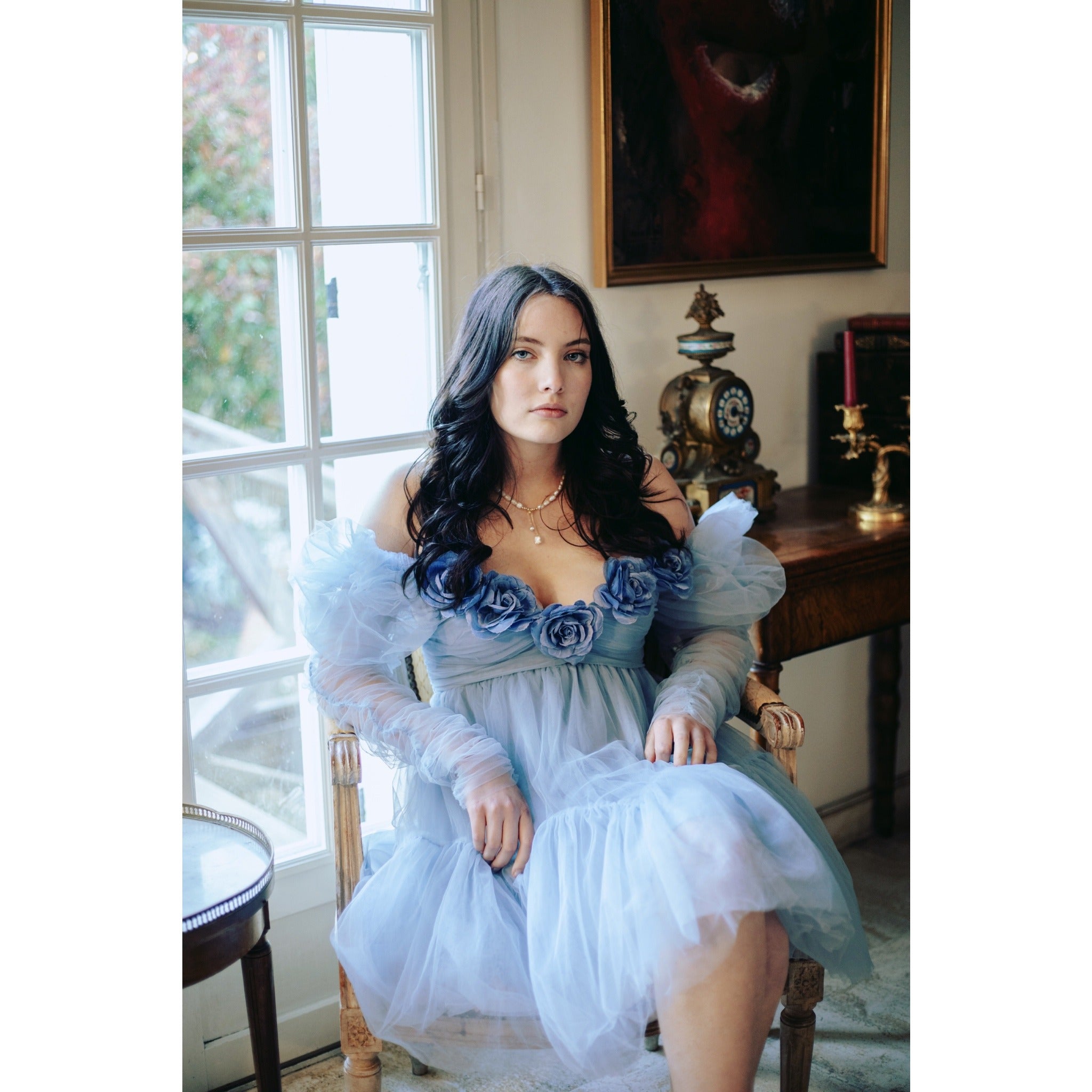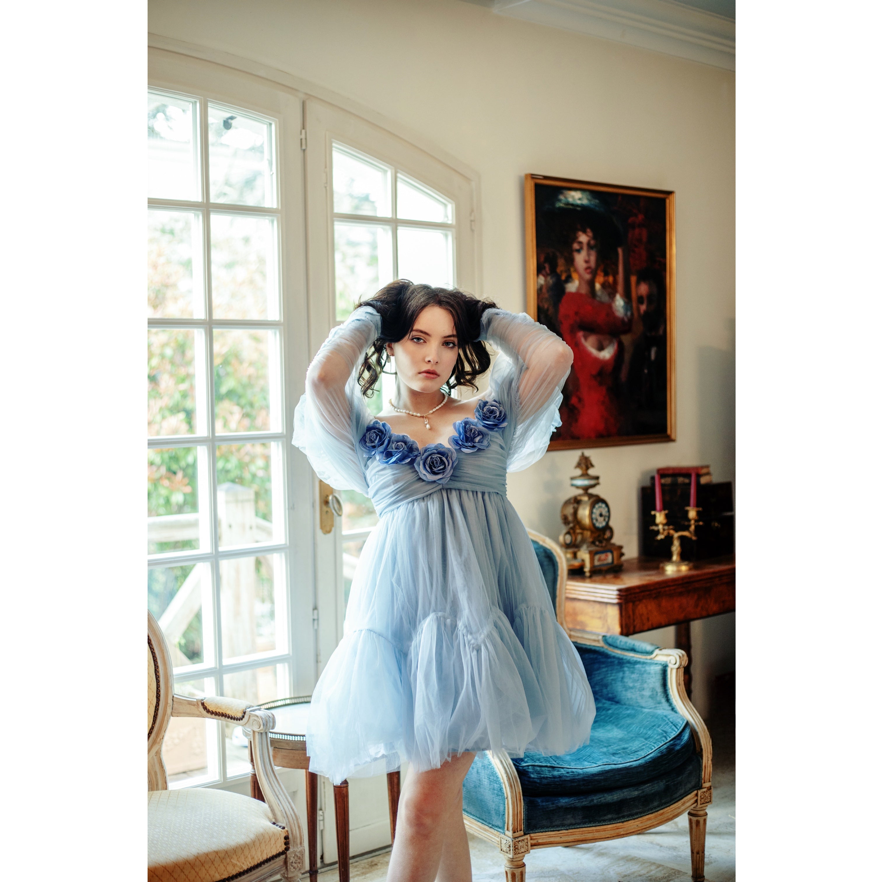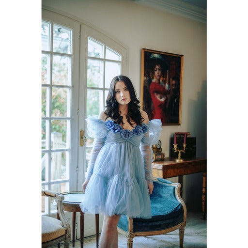 Embody ethereal romance with this blue tulle dress. The fitted body enhances your upper body silhouette. Gathered long and puff sleeves as well as the full romantic skirt complete the design. Comes in two soft pastel shades.