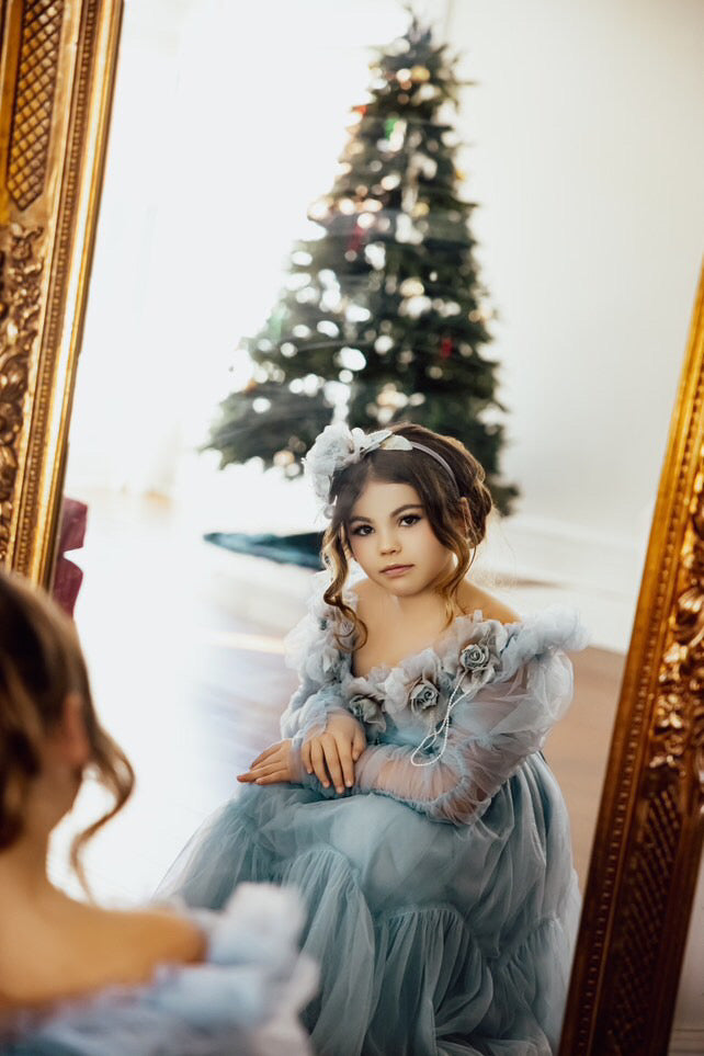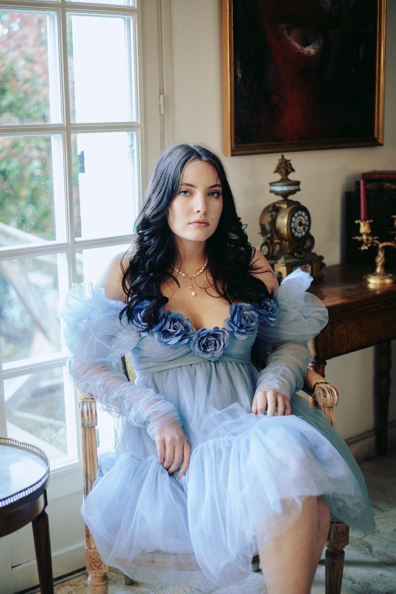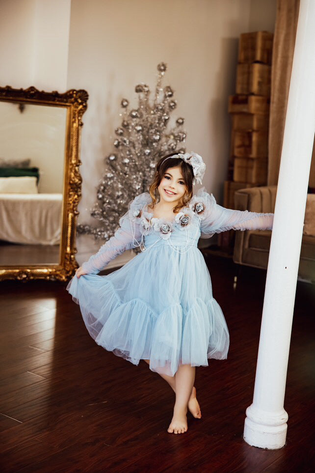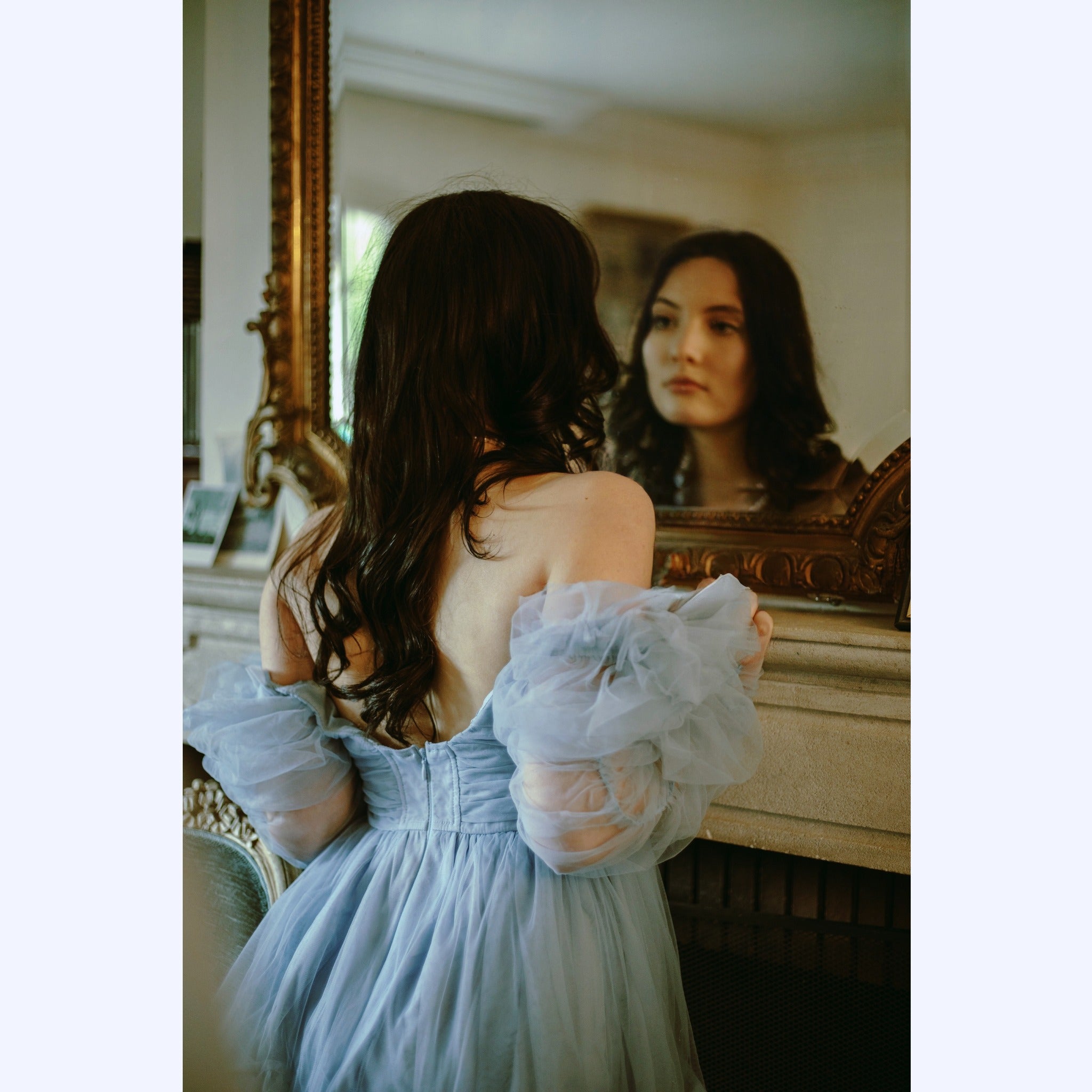 Embody ethereal romance with this blue tulle dress. The fitted body enhances your upper body silhouette. Gathered long and puff sleeves as well as the full romantic skirt complete the design. Comes in two soft pastel shades.
