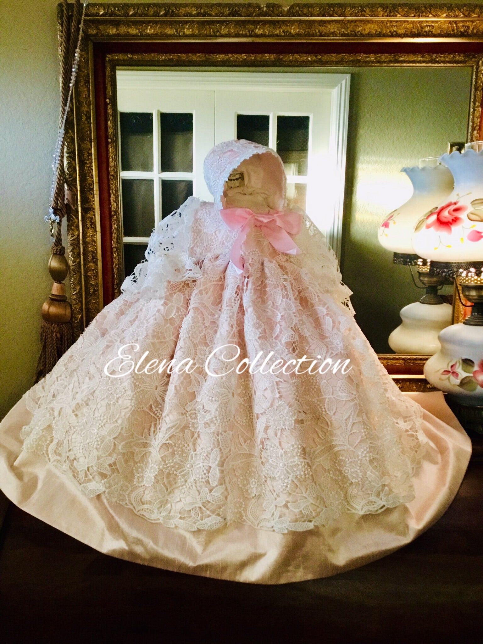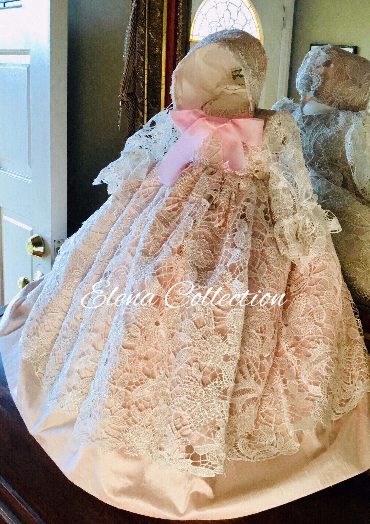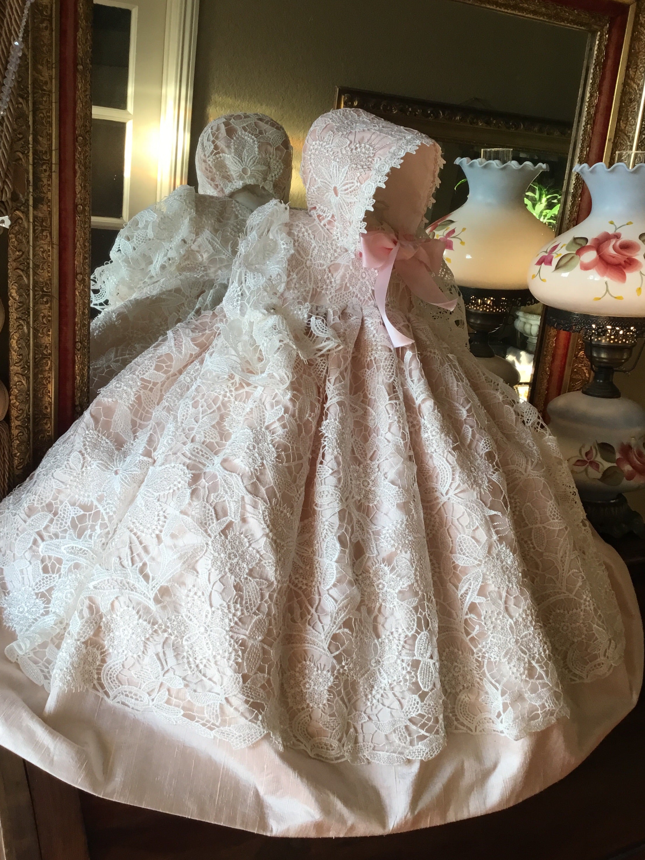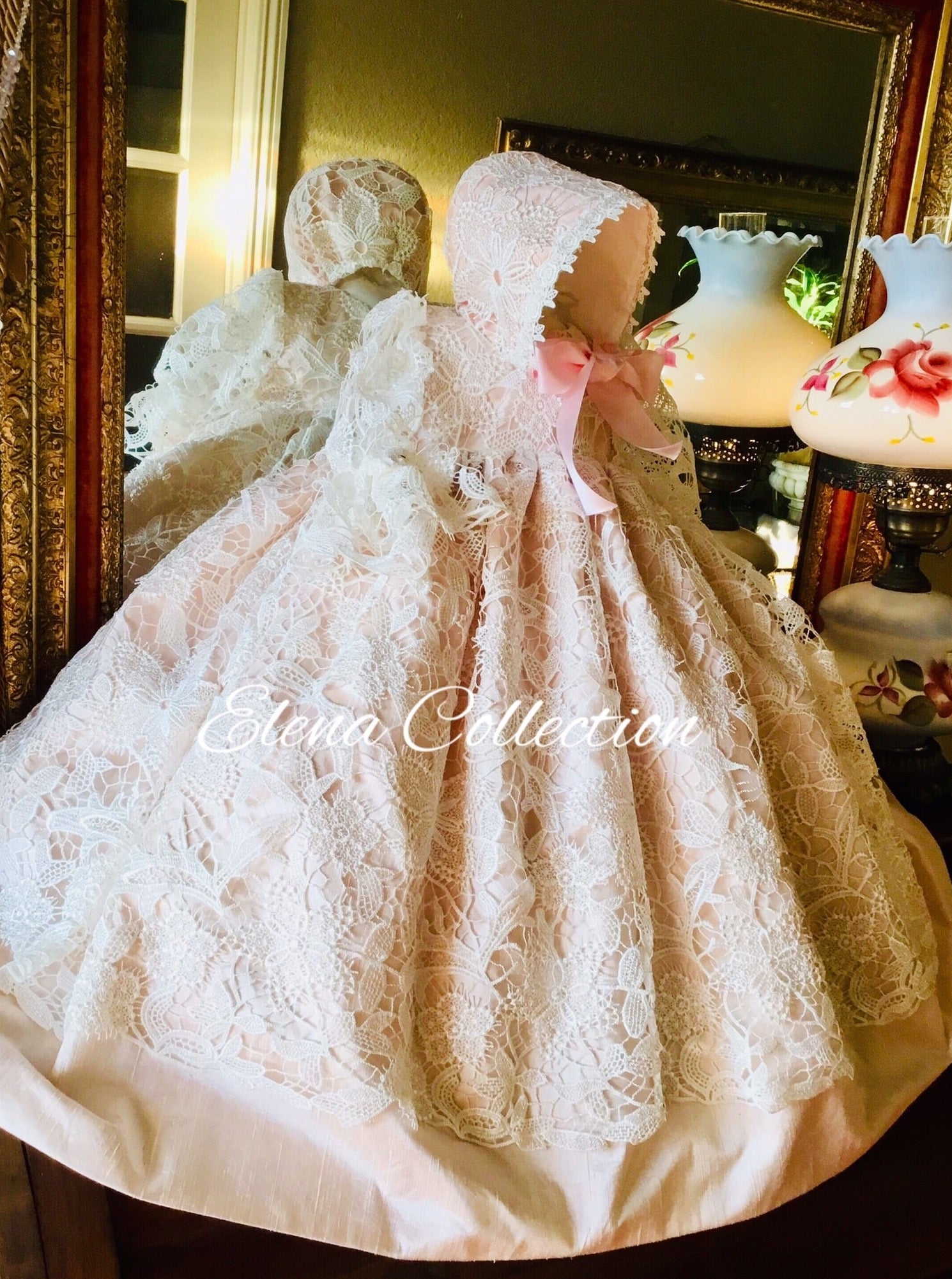 Blush Melanie is an exquisite, handmade christening gown crafted from luxurious fabrics for your baby’s special day. This heirloom-quality gown features silk puff sleeves, a delicate lace overlay, and an open back with hand-sewn buttons. It comes with a matching bonnet and a soft 100% cotton lining for comfort. Made to order in the USA, it ensures a perfect fit through detailed sizing guidance and custom options. Fabrics: - Cotton blend lace - Silk - Tulle - Piping - Fusing - 100% pure cotton lining