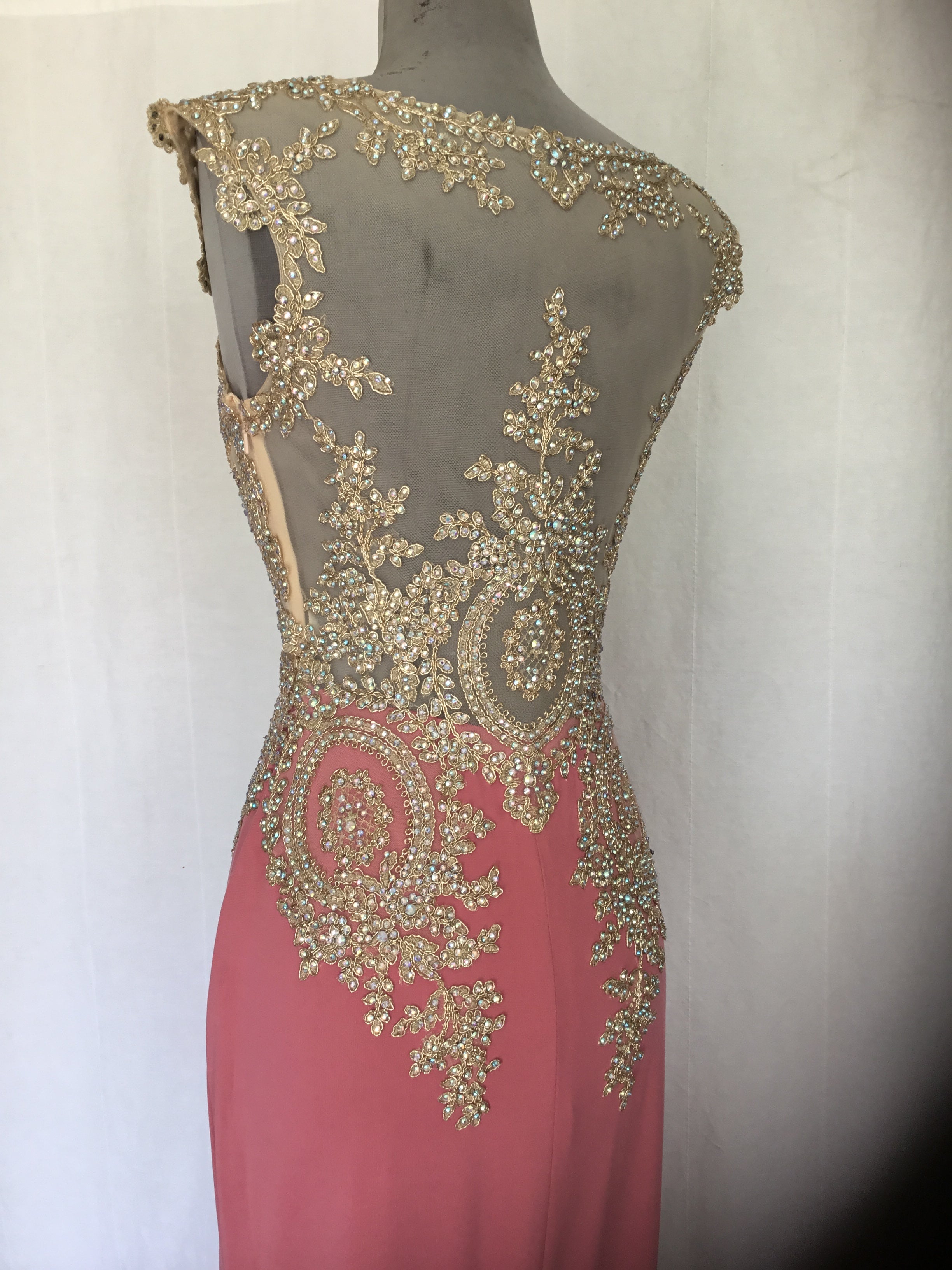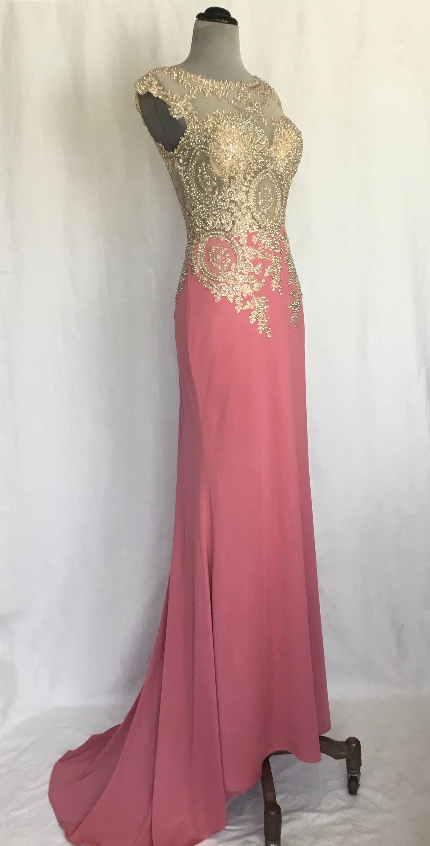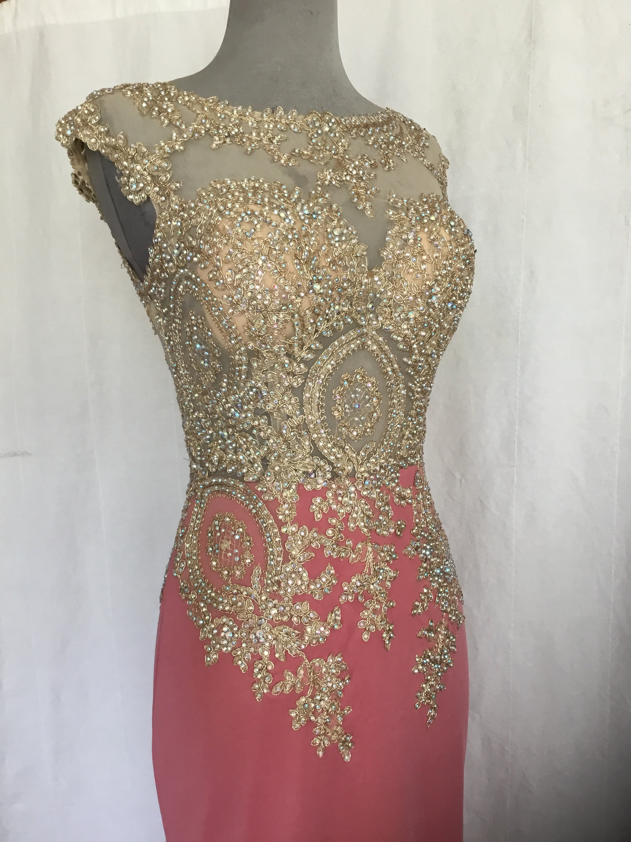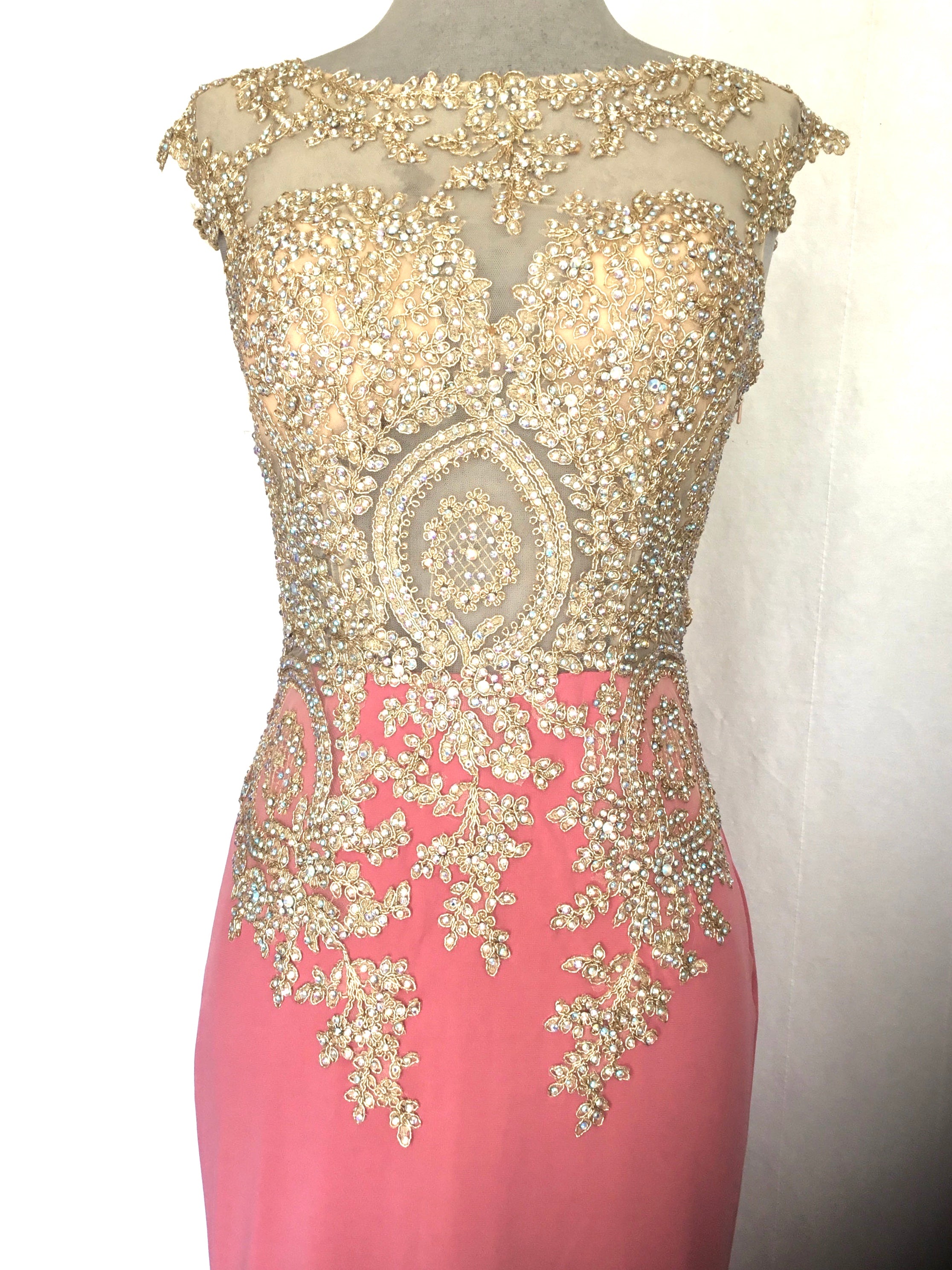 Command attention in this stunning blush pink evening gown featuring an intricately embellished bodice and a sweeping silhouette. The fitted top is adorned with exquisite gold beadwork and shimmering sequins, designed in regal patterns that cascade gracefully over the sheer illusion neckline and cap sleeves.