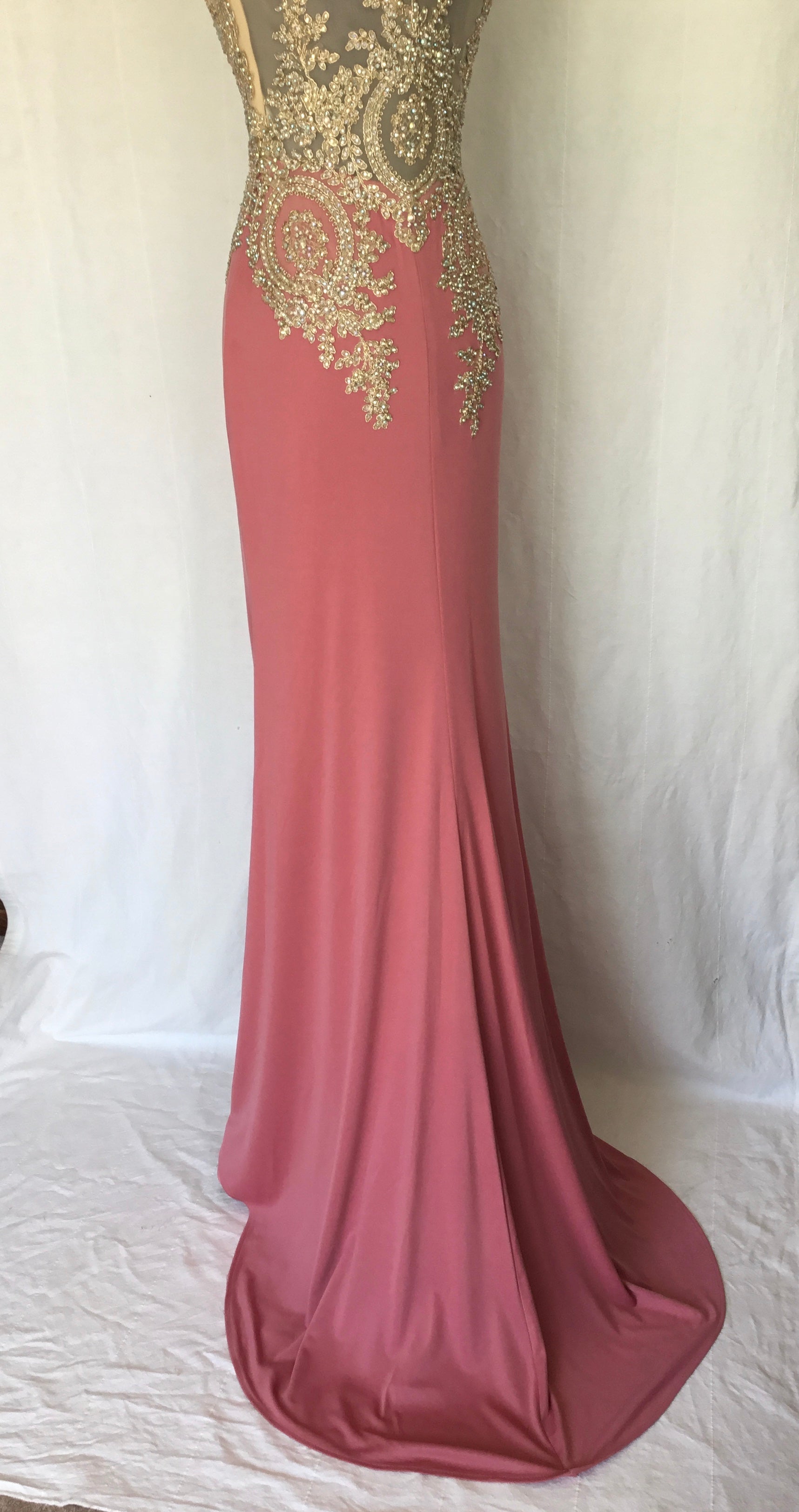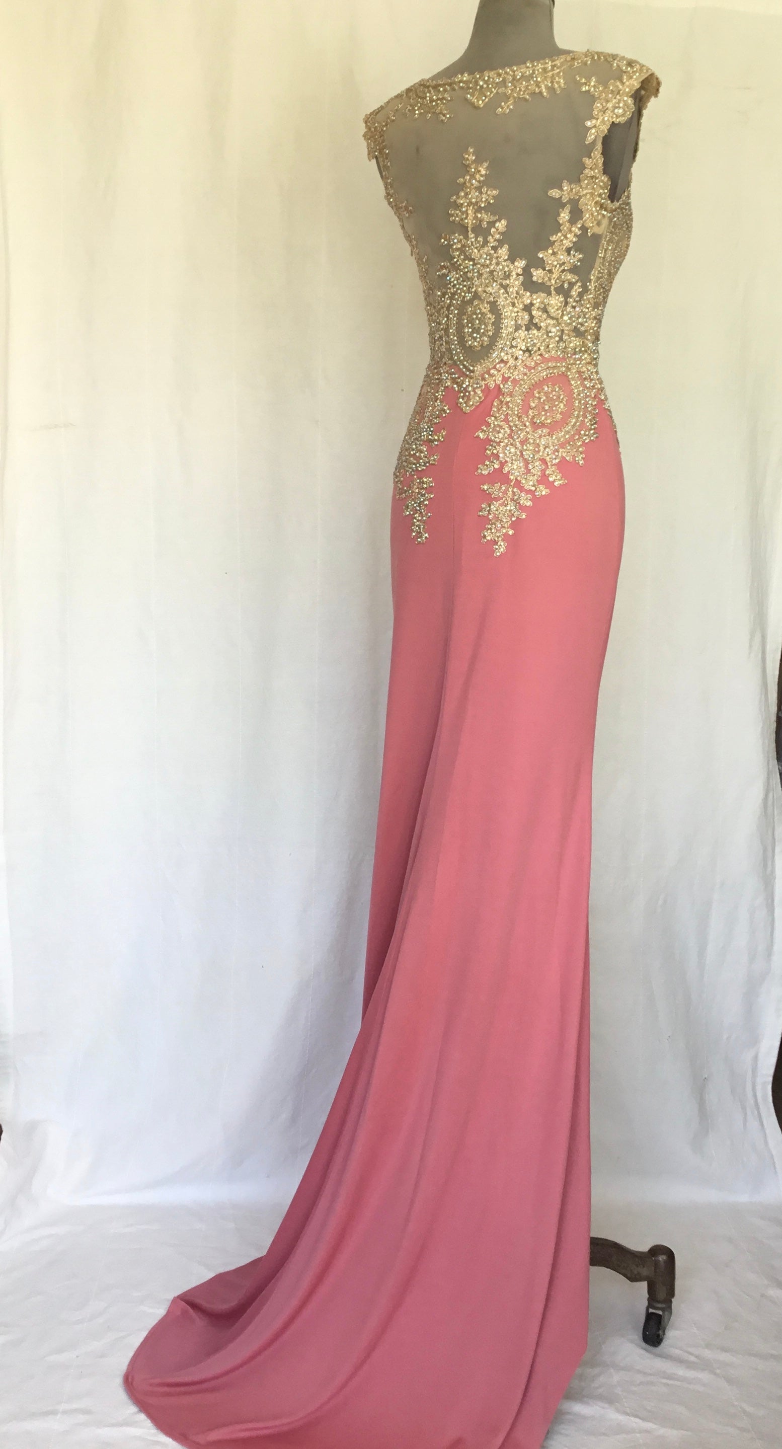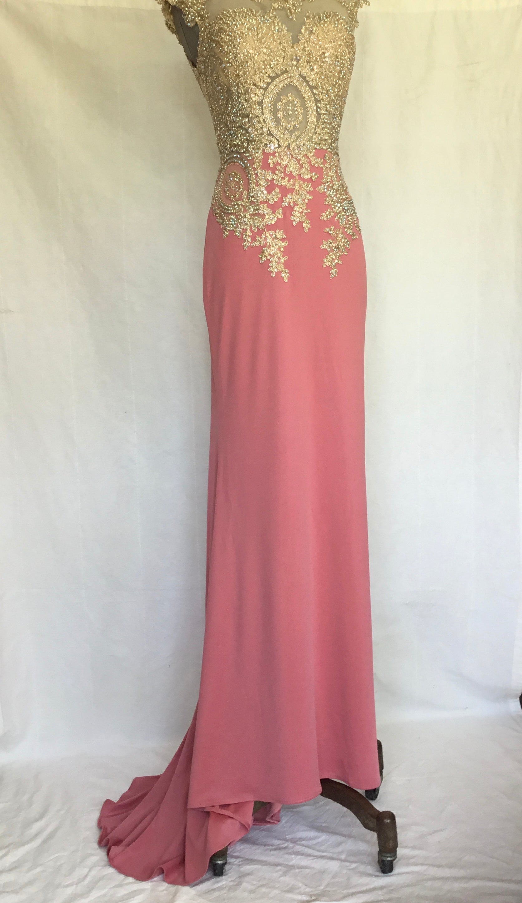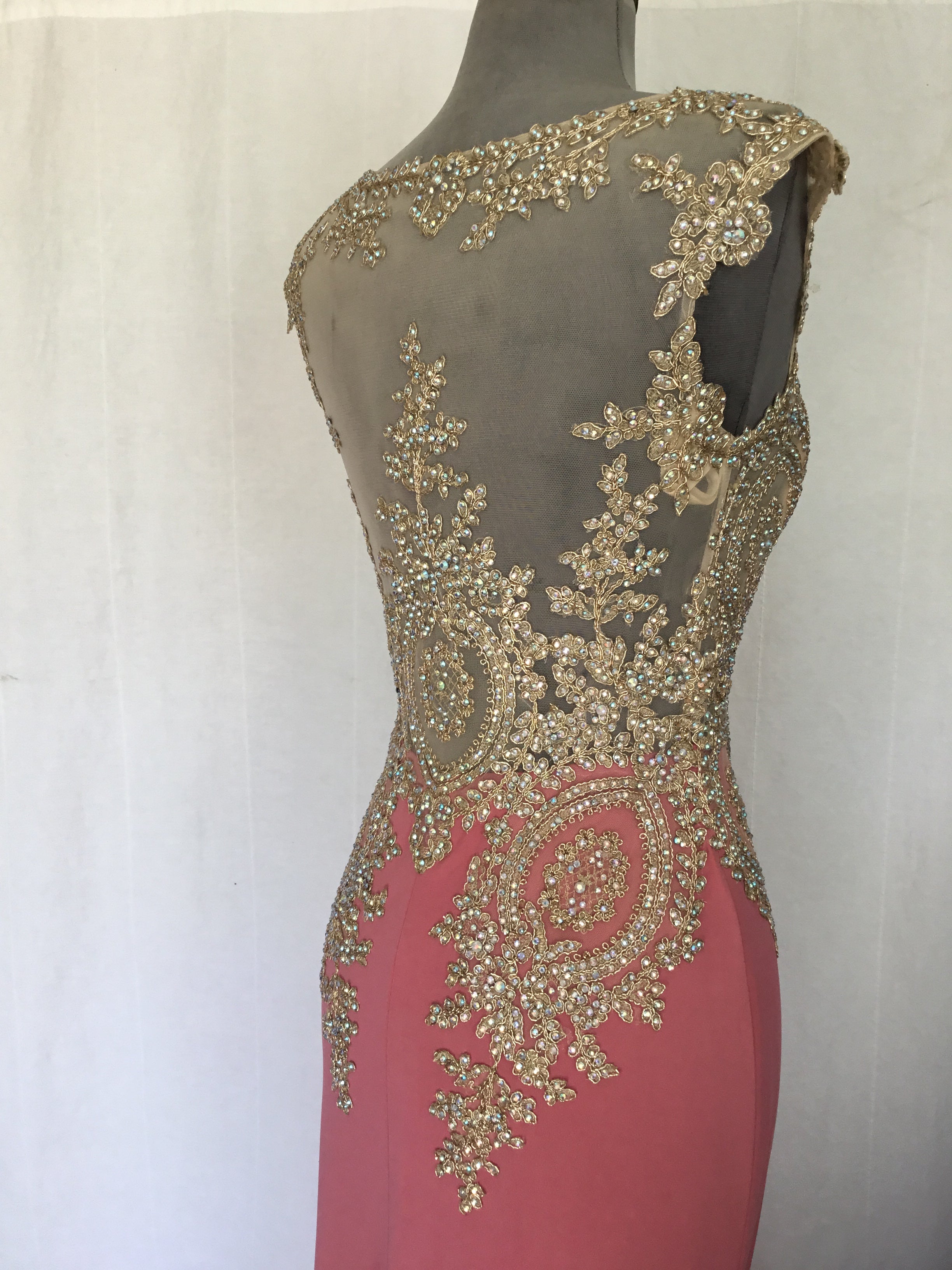 Command attention in this stunning blush pink evening gown featuring an intricately embellished bodice and a sweeping silhouette. The fitted top is adorned with exquisite gold beadwork and shimmering sequins, designed in regal patterns that cascade gracefully over the sheer illusion neckline and cap sleeves.