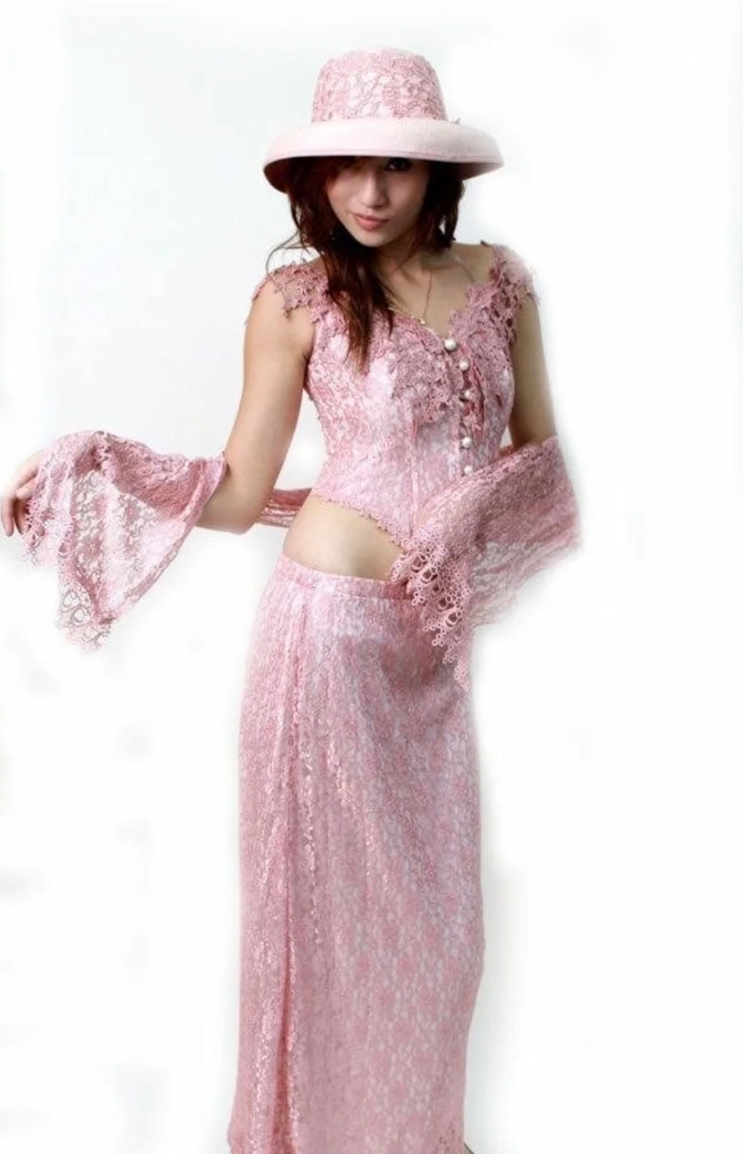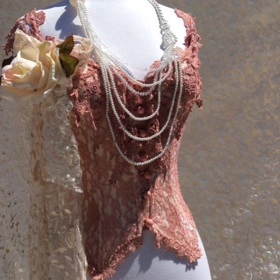 with front buttons, boning and a 6” Venetian trim around the off the shoulders neckline.