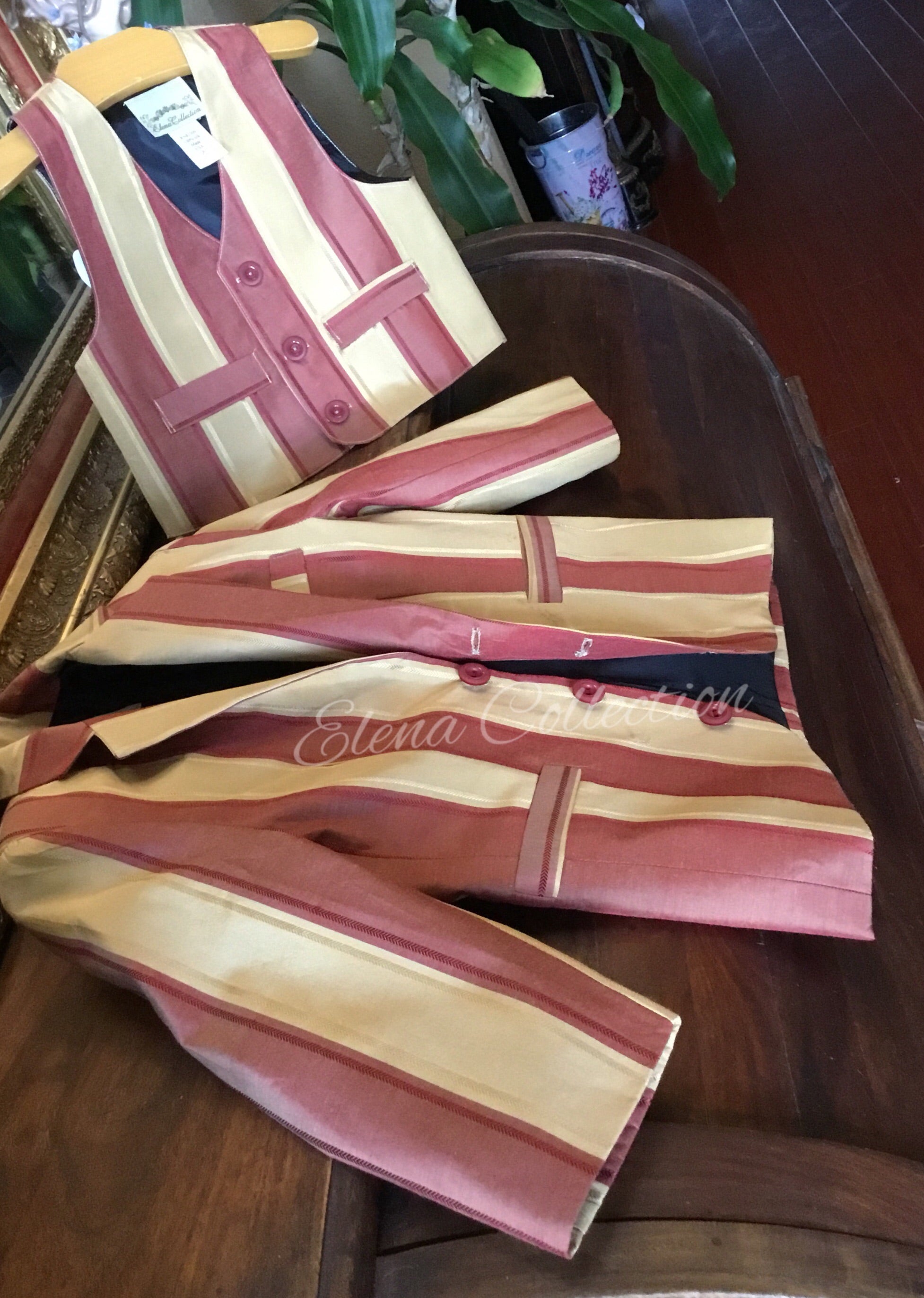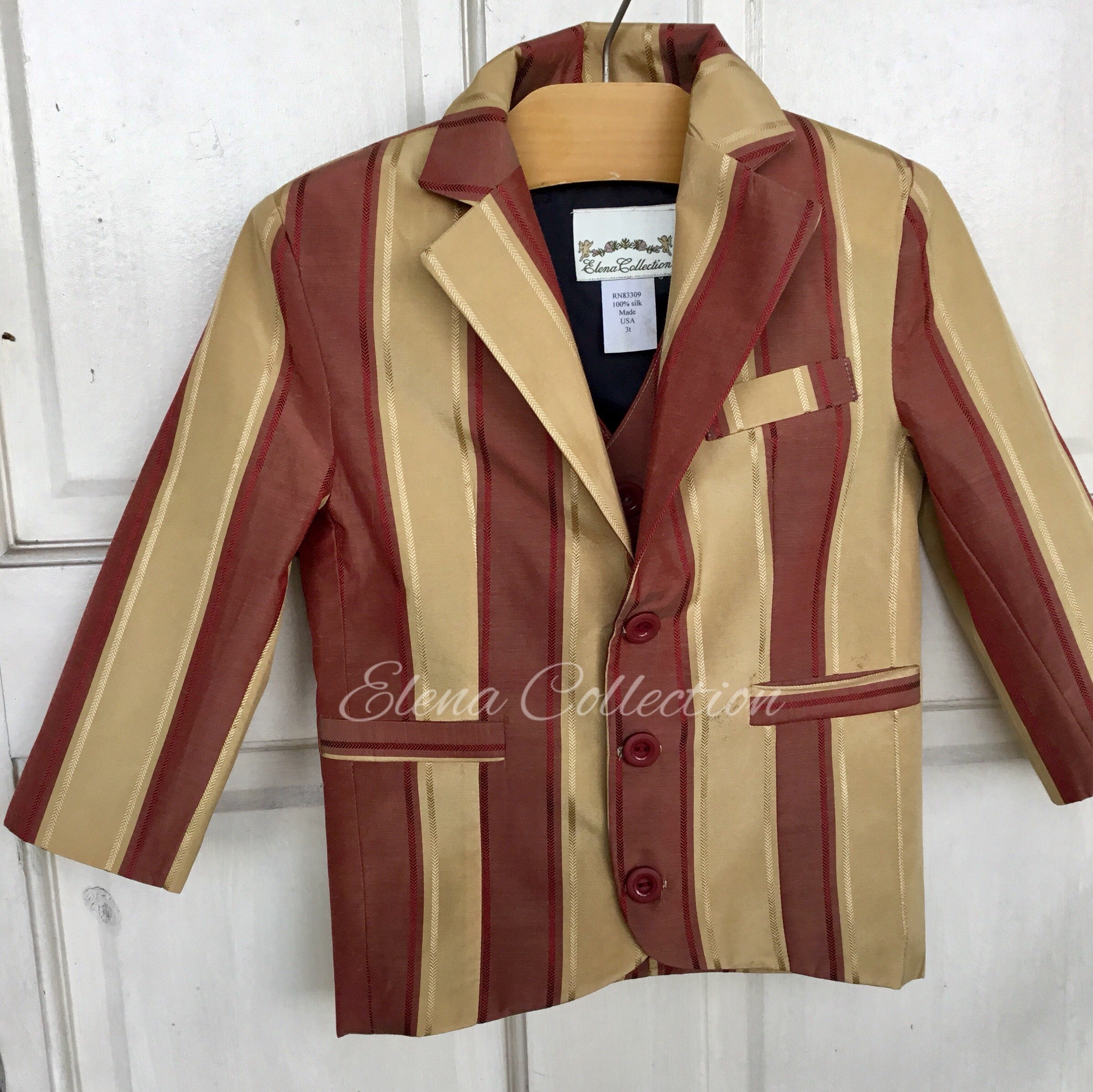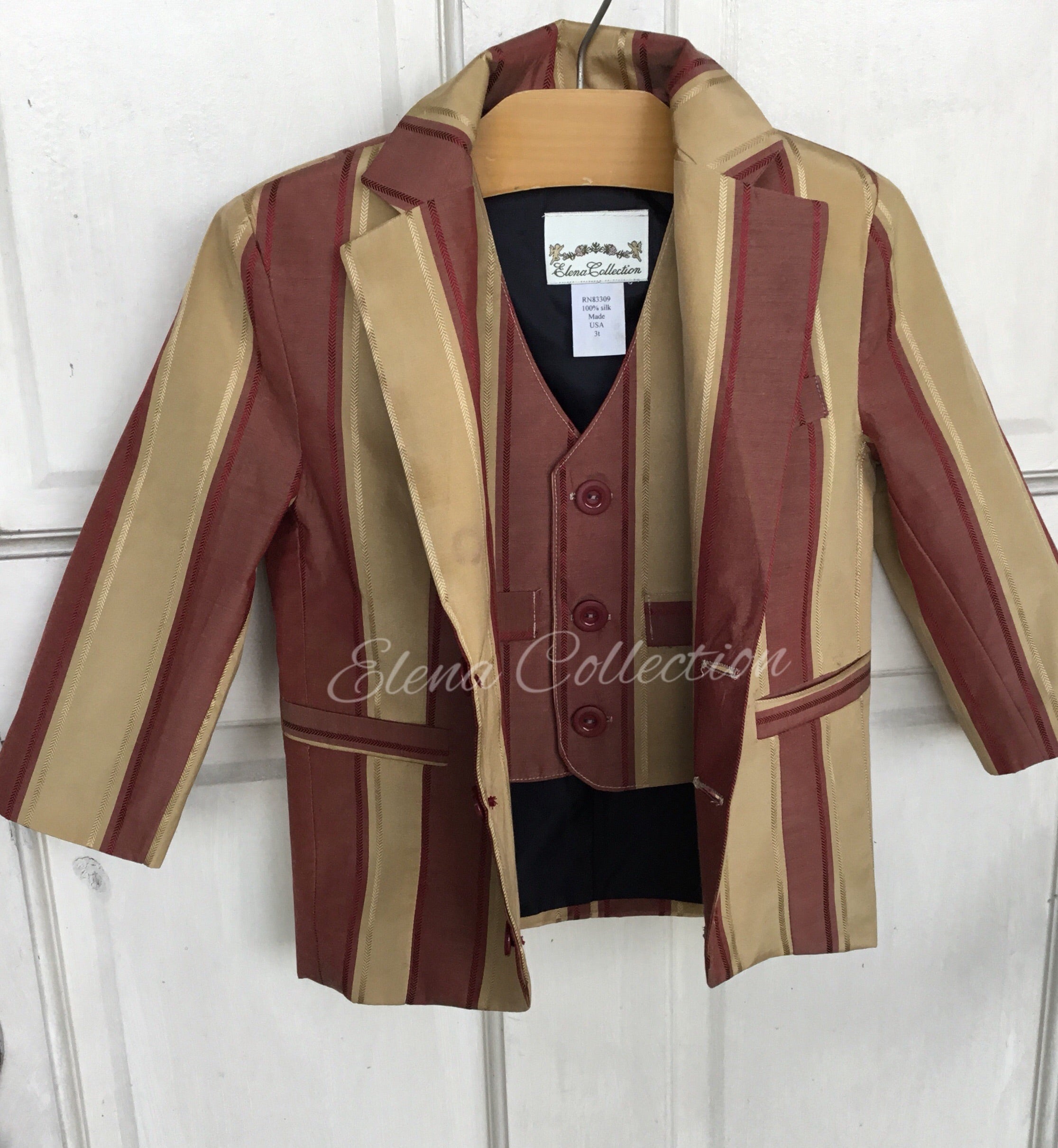 Luxury Silk Striped Toddler Vest & Jacket Set – Dark Beige & Rust