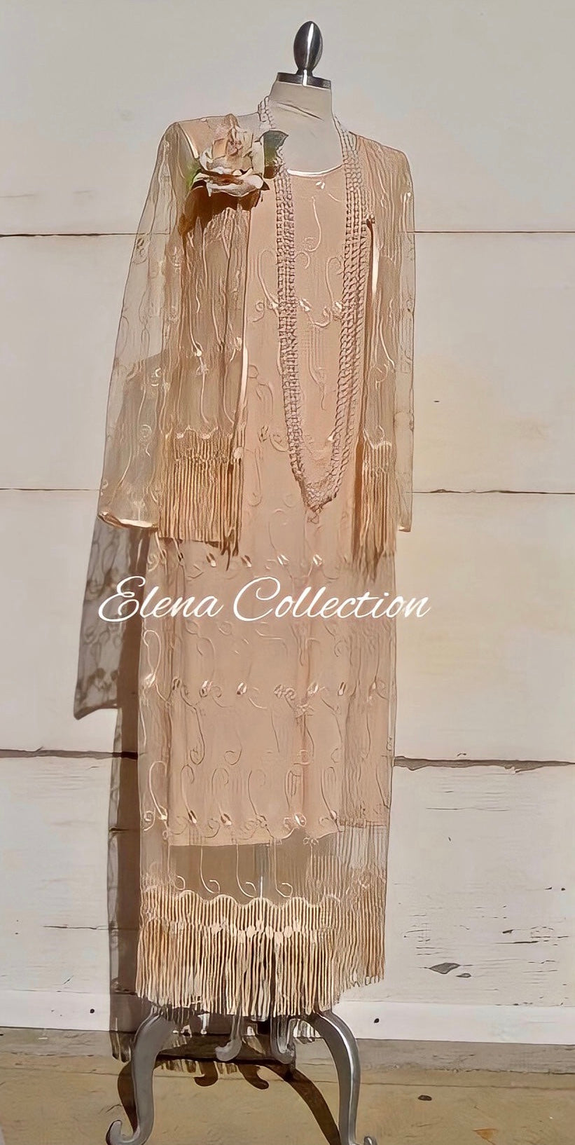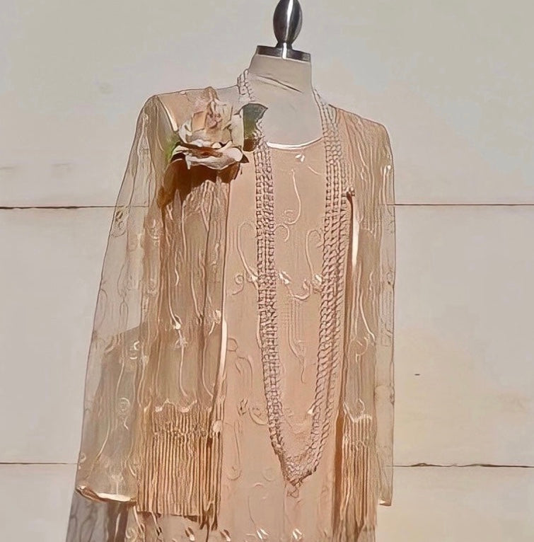 This elegant Bohemian lace fringe dress features a soft nude color and a relaxed, comfortable fit with slight stretch. Perfect for a godmother-to-be, it pairs beautifully with a matching lace fringe jacket for a refined look or can be styled with a flower belt for added charm. A timeless, romantic piece ideal for any special occasion. Gentle washing and air drying are recommended to maintain its delicate quality. Fabrics and details: - Bohemian embroidery lace - Fringe accents - Soft, stretchy nude fabric - Matching lace fringe jacket available on request