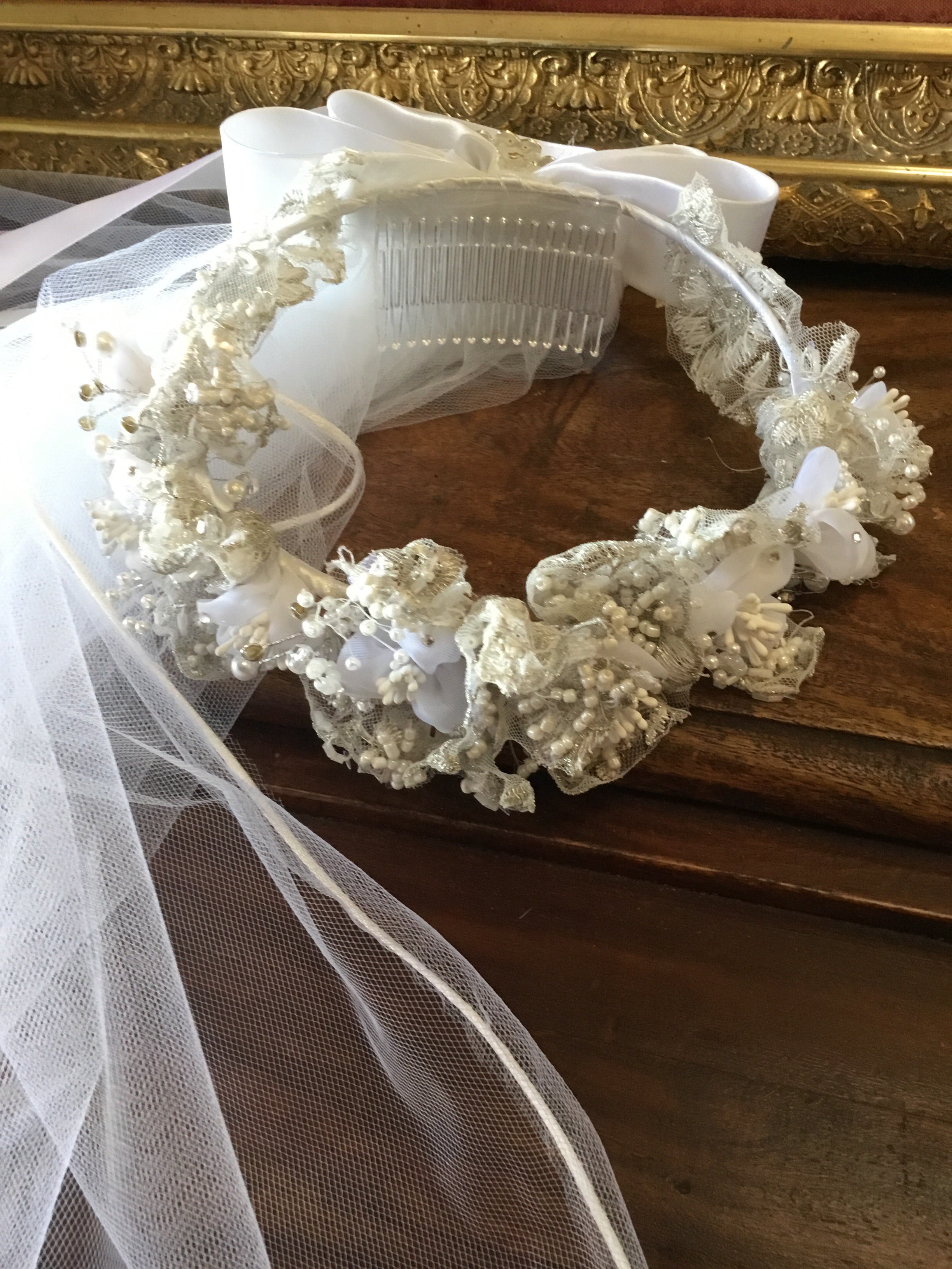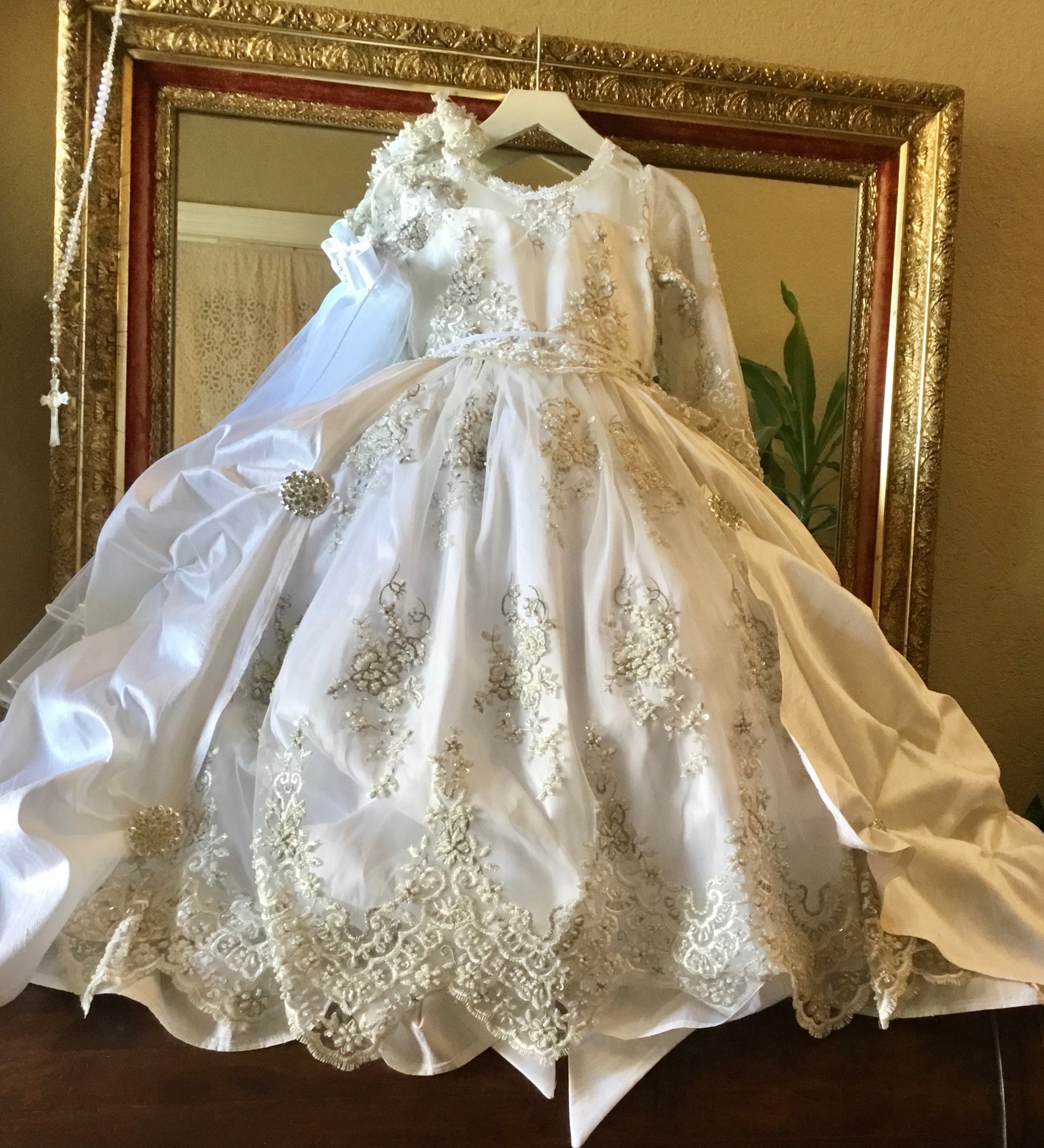 Lite Ivory lace and polysilk communion couture dress dress, long sleeves ( can be made with cup sleeves) fully lined with hidden seams and attached crinoline for fullness.