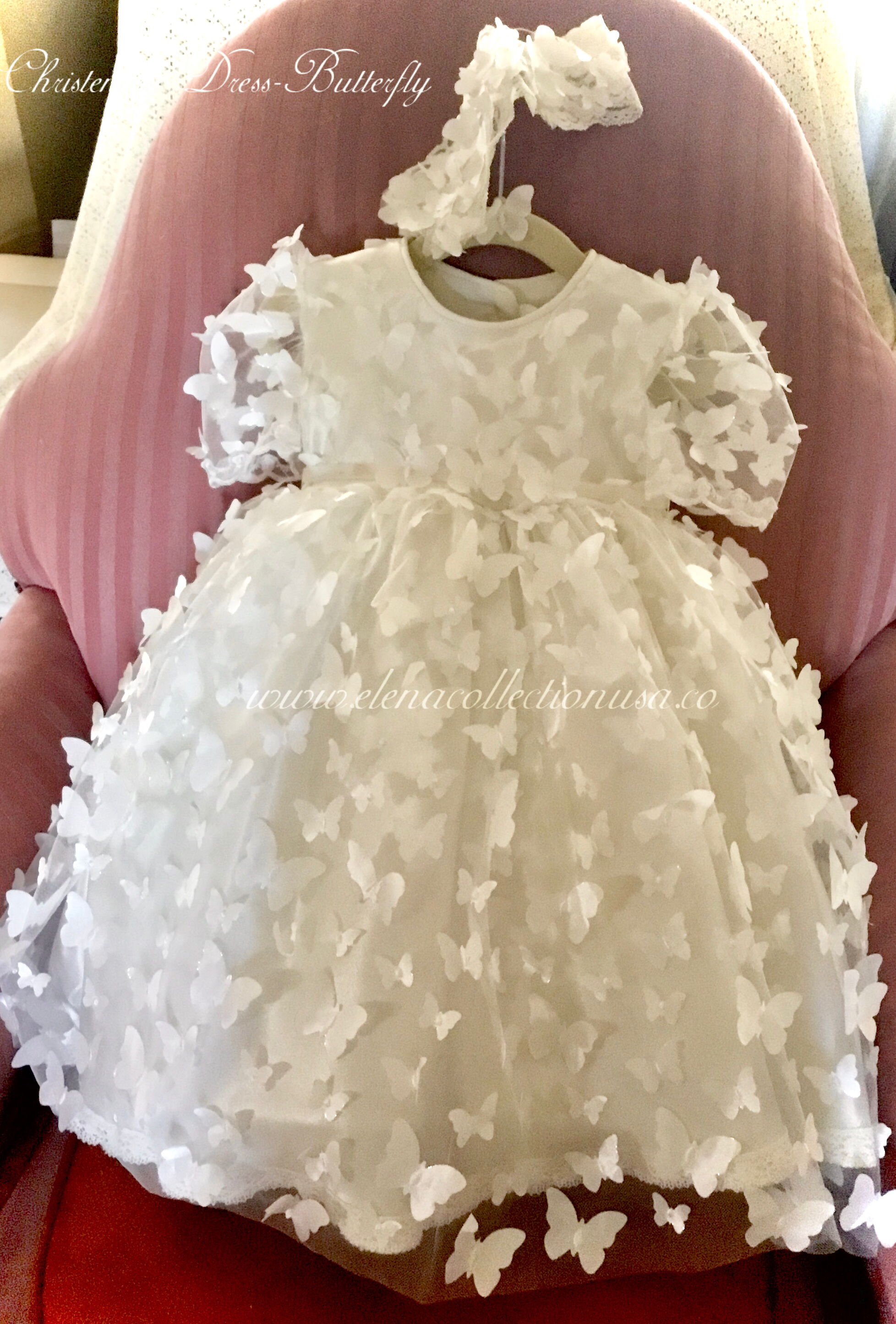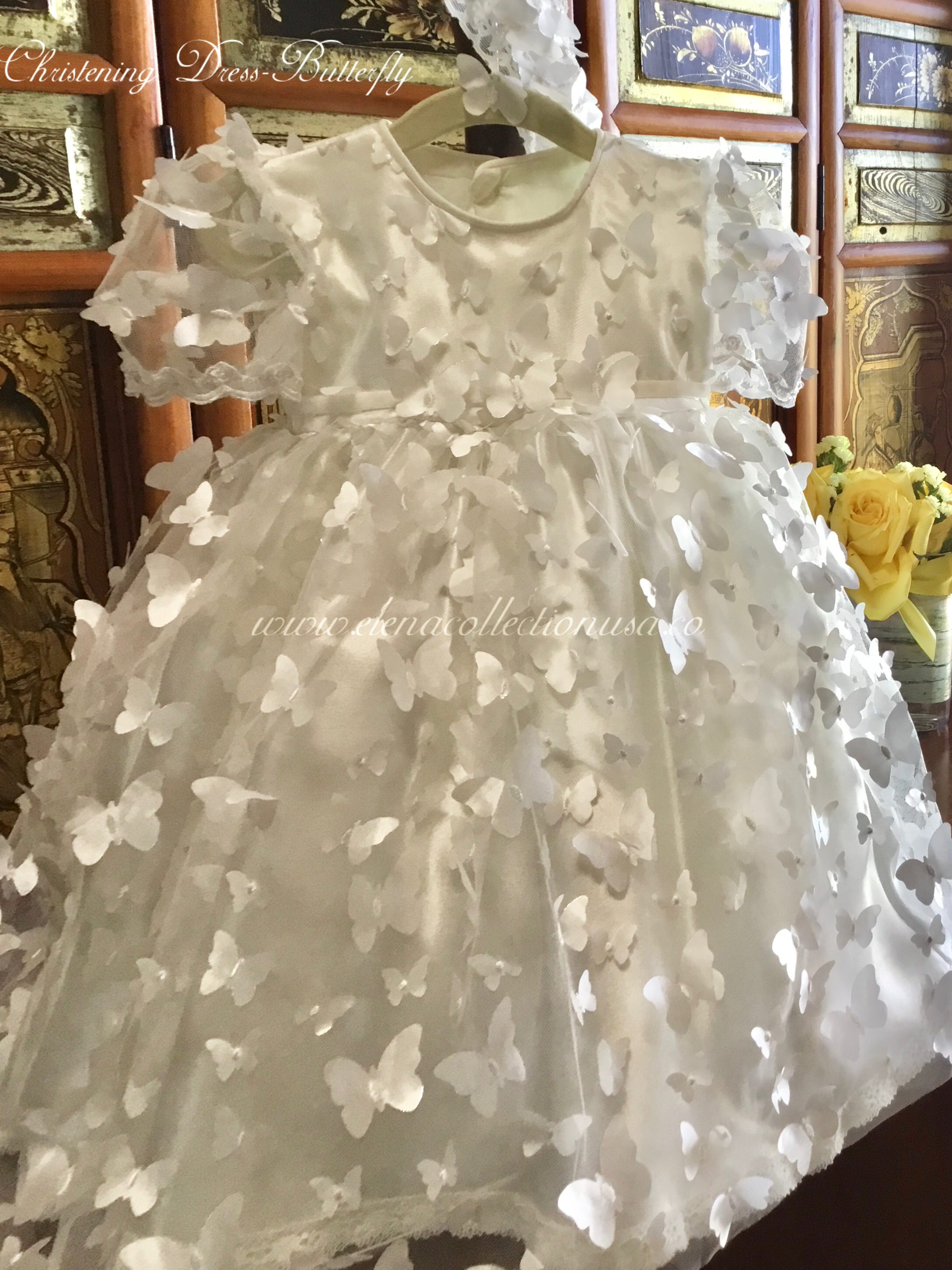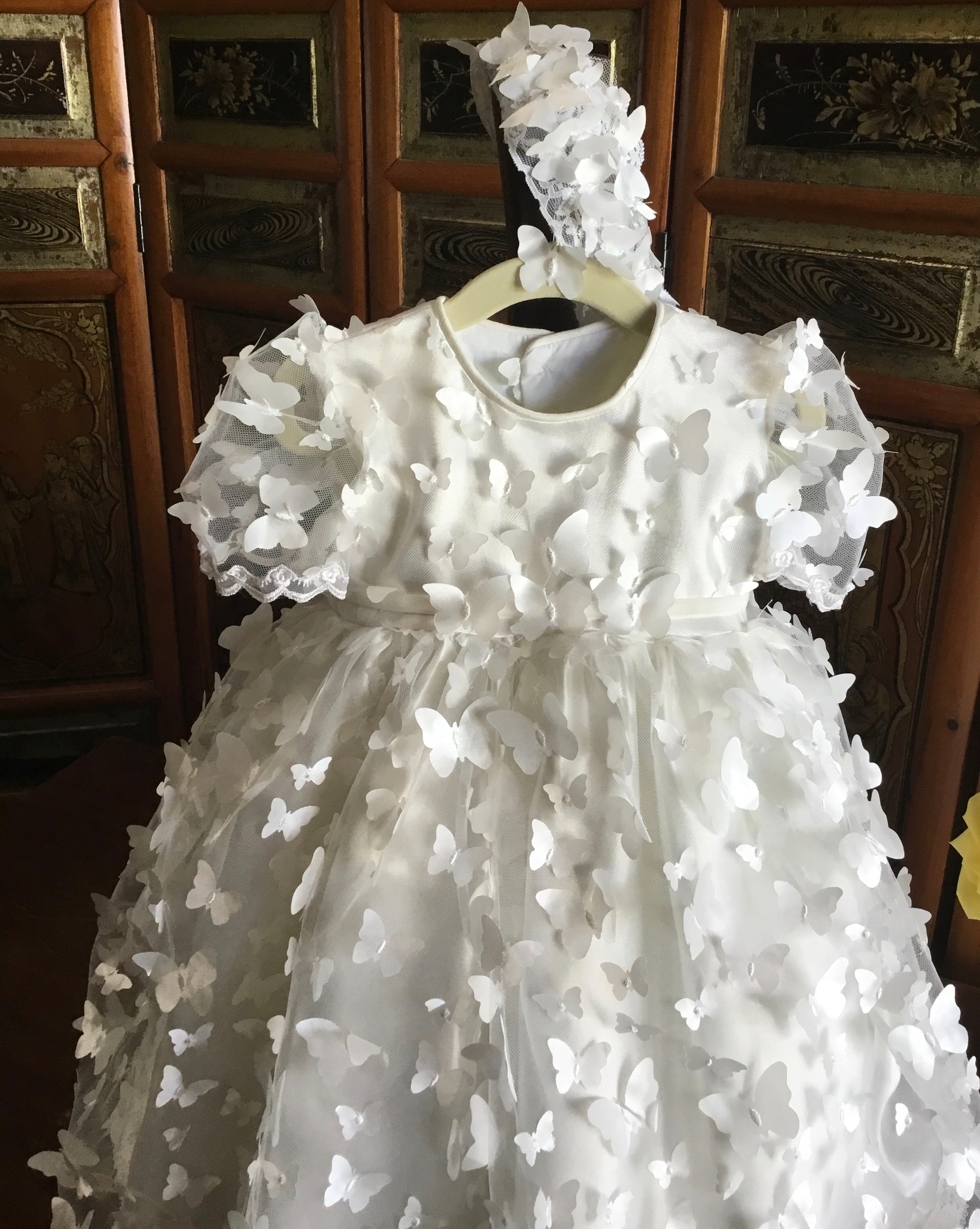 Christening Butterfly Dress with matching headband or bonnet, ideal for first birthdays, baptisms, or photoshoots. Fully lined with attached crinoline for elegant fullness. Includes: - Luxurious fabric 3d mesh butterfly’s - Soft lining