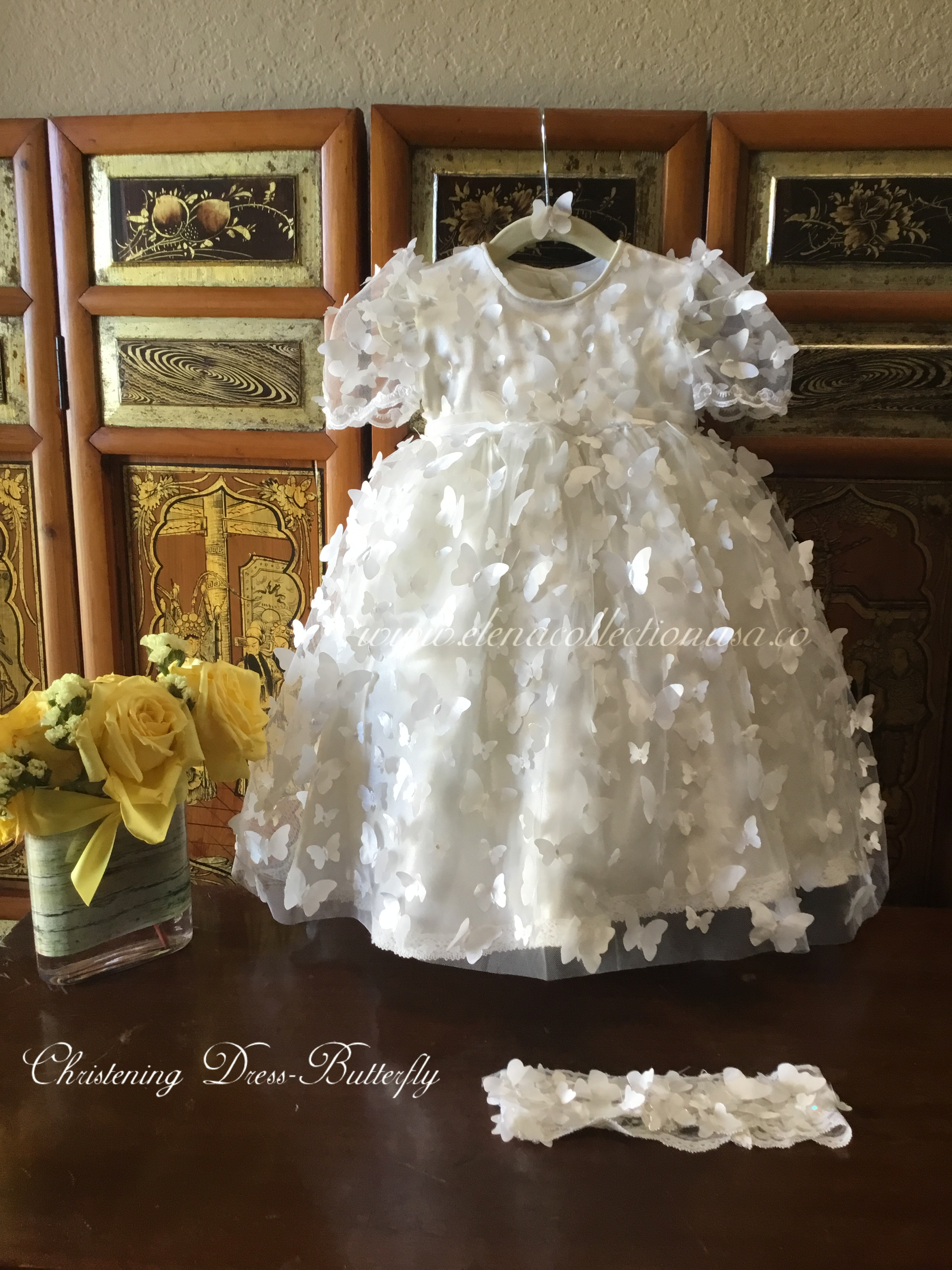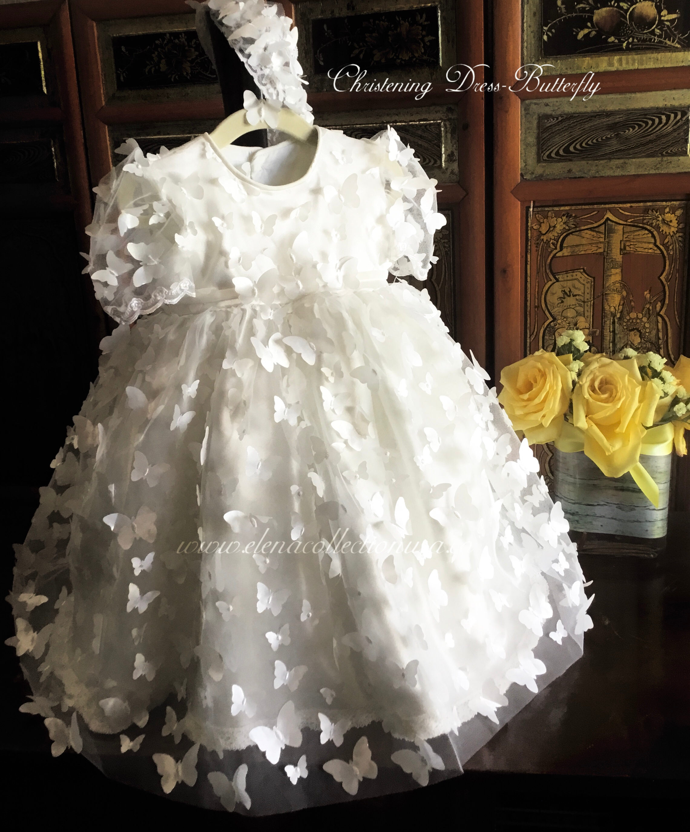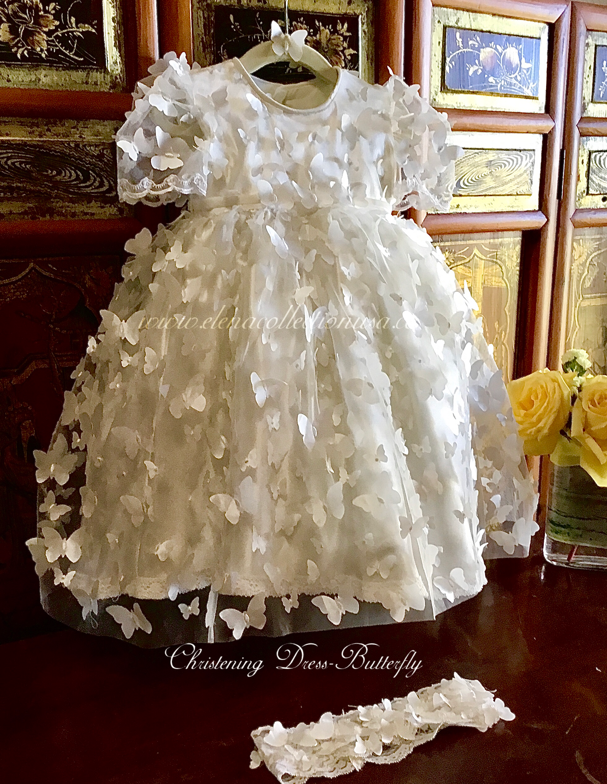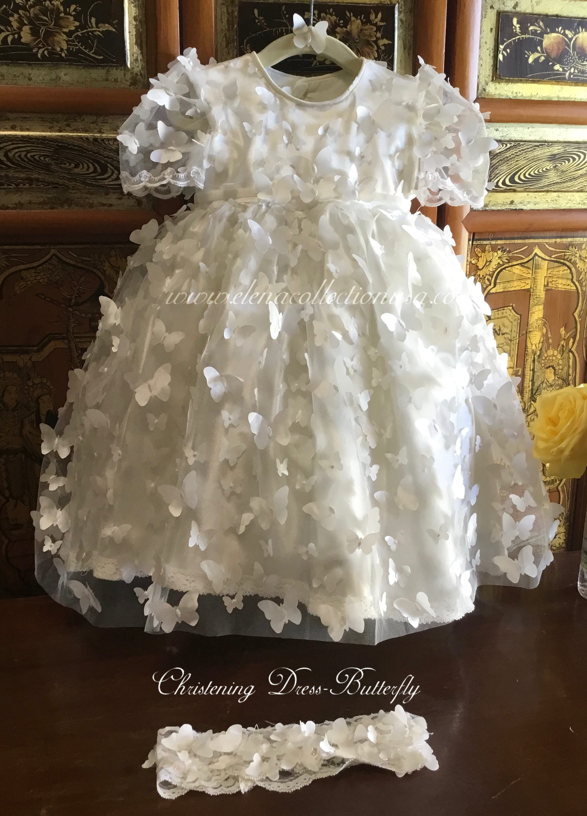 Christening Butterfly Dress with matching headband or bonnet, ideal for first birthdays, baptisms, or photoshoots. Fully lined with attached crinoline for elegant fullness. Includes: - Luxurious fabric 3d mesh butterfly’s - Soft lining