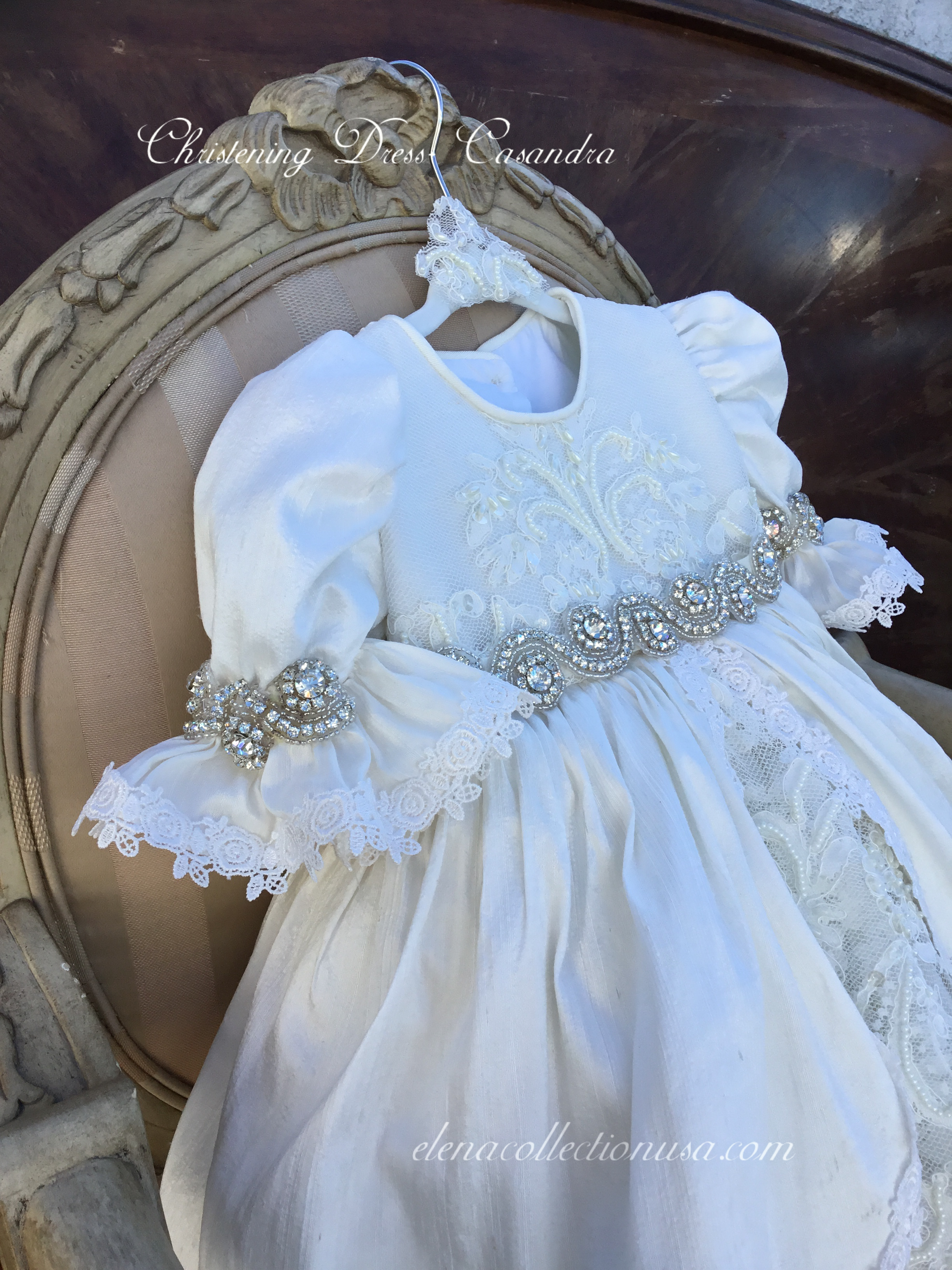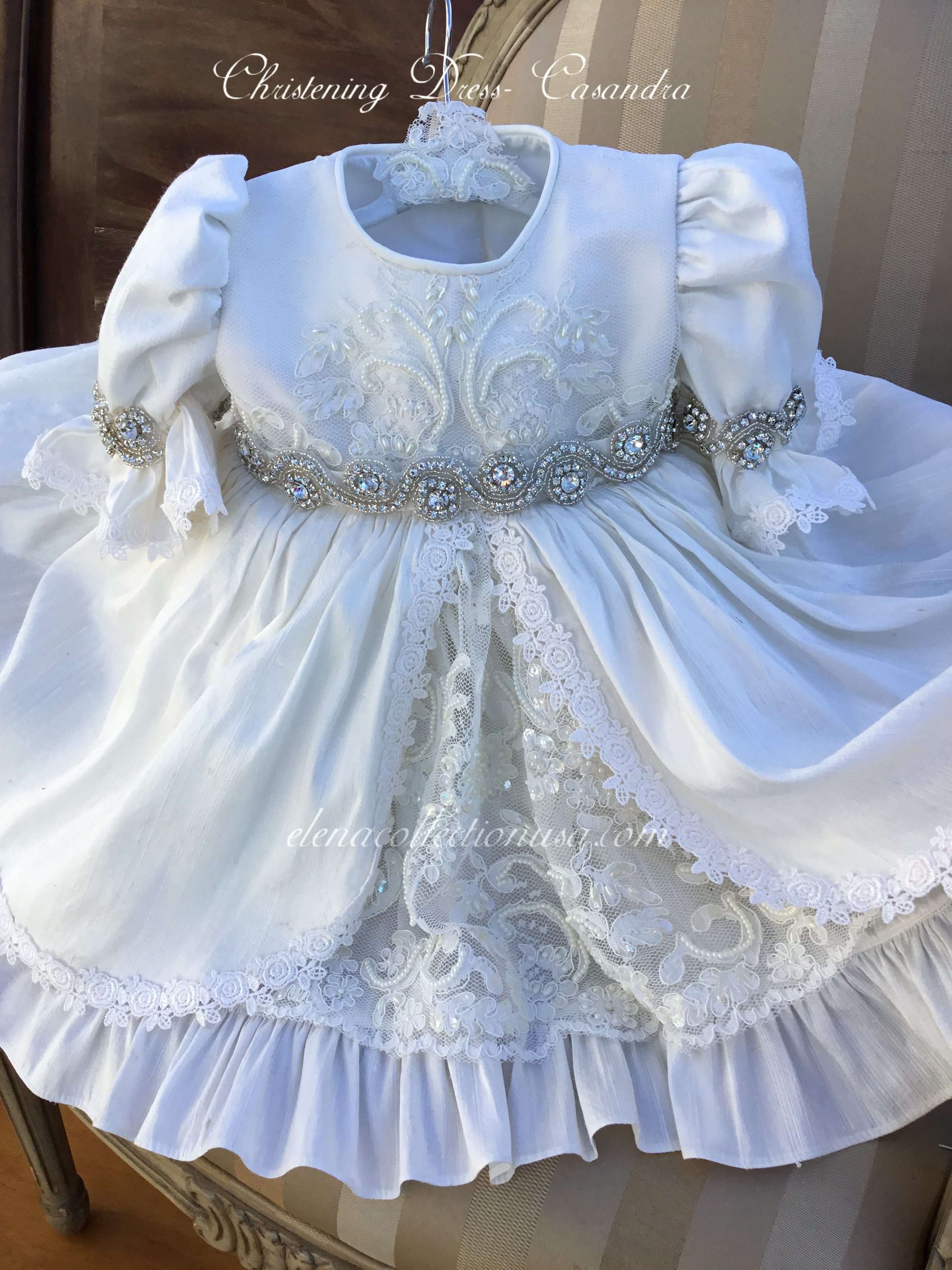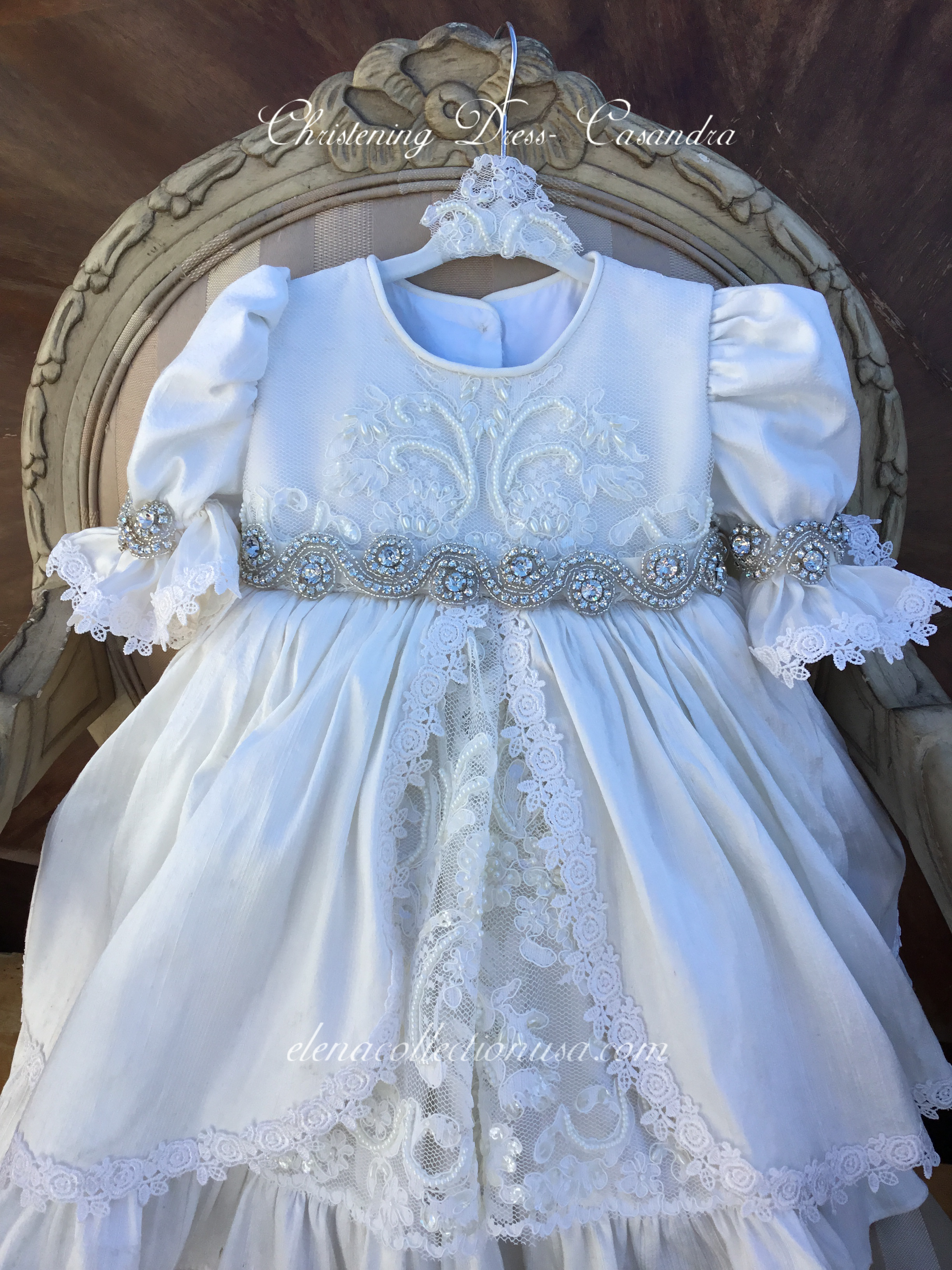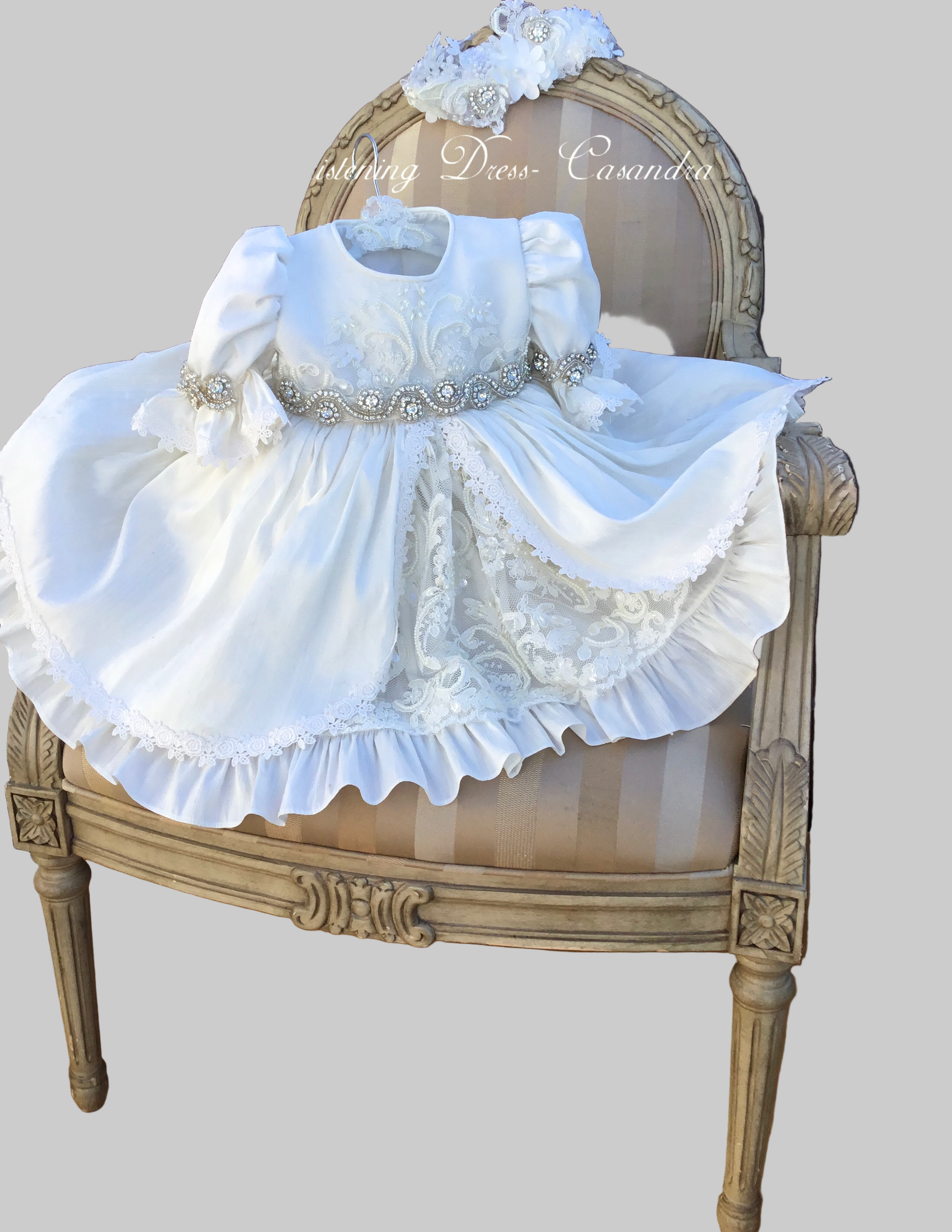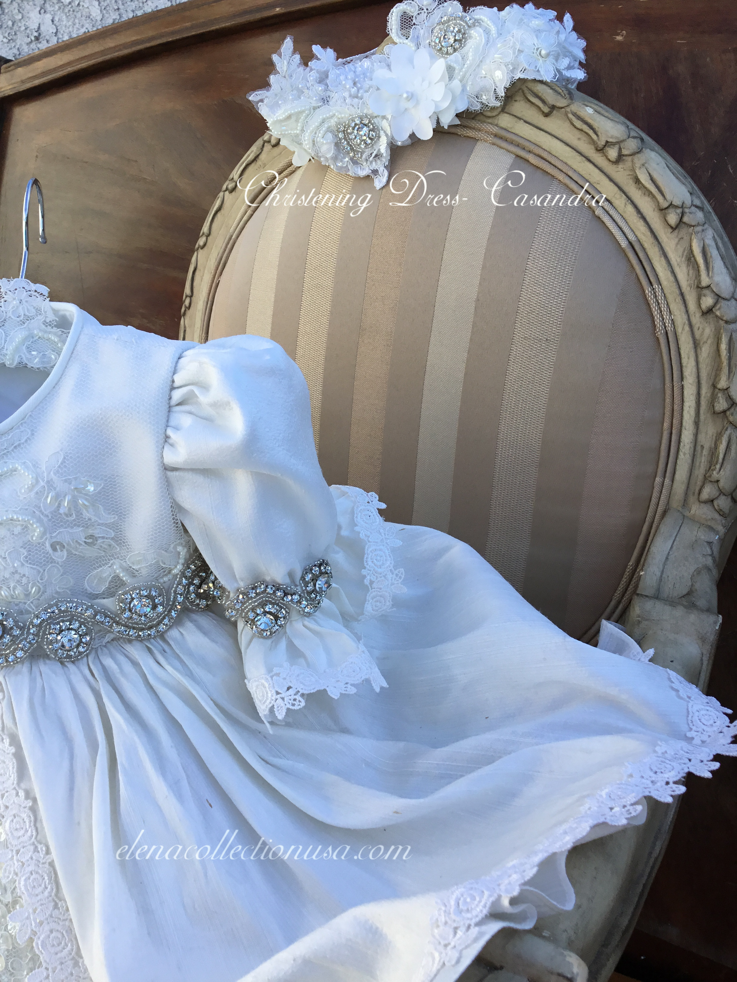 Casandra is a luxurious Victorian-inspired christening dress made with exquisite fabrics and delicate details. Perfect for walking baby girls and toddlers, it includes your choice of a bonnet or headband (sold separately). Sizes are based on precise chest measurements, with custom options available. Each gown is handmade with care and shipped via Priority Mail with tracking. To preserve its elegance, dry clean or steam iron before use. Fabrics: - Raw silk - Hand-beaded lace - Venetian trim