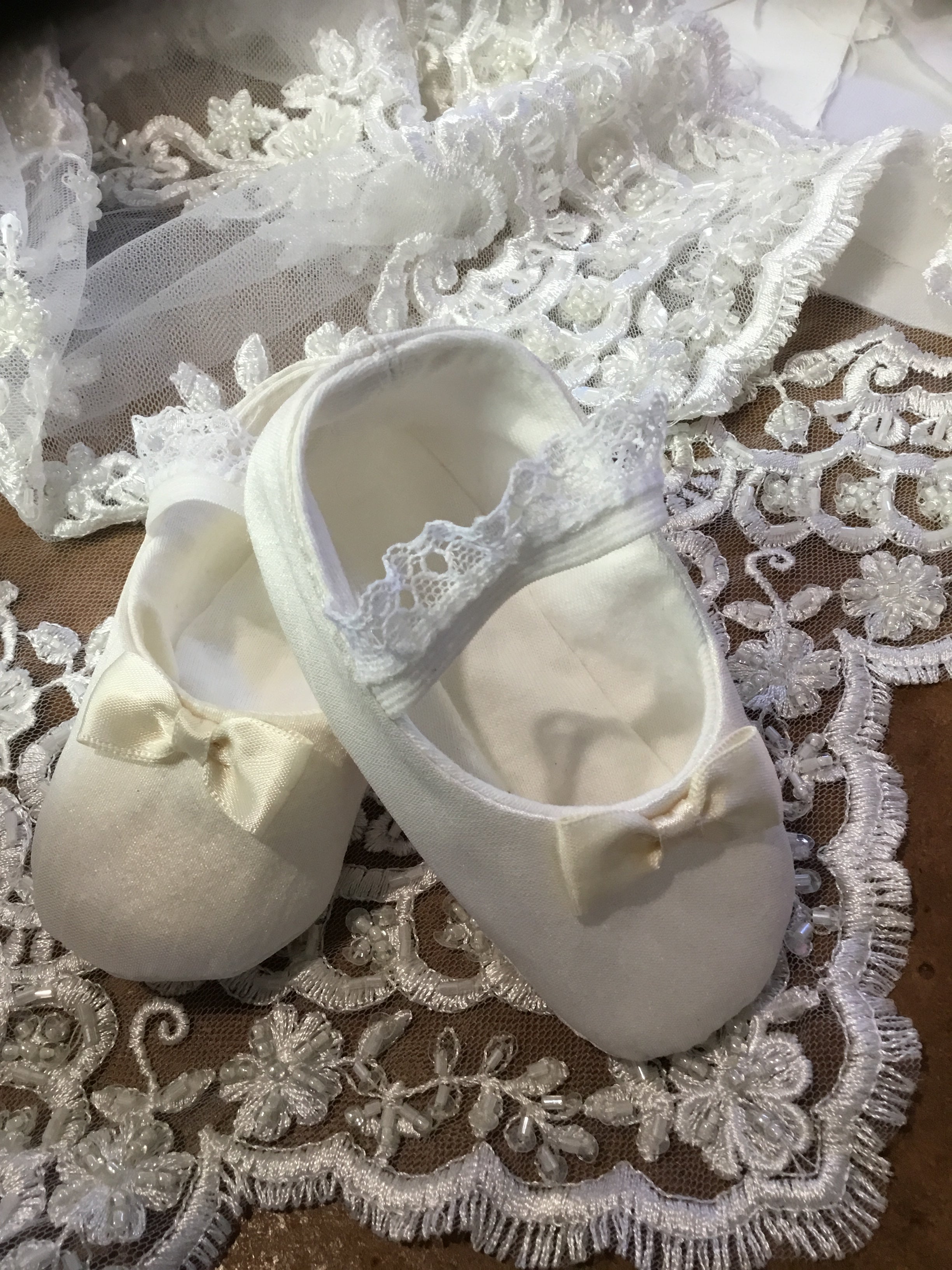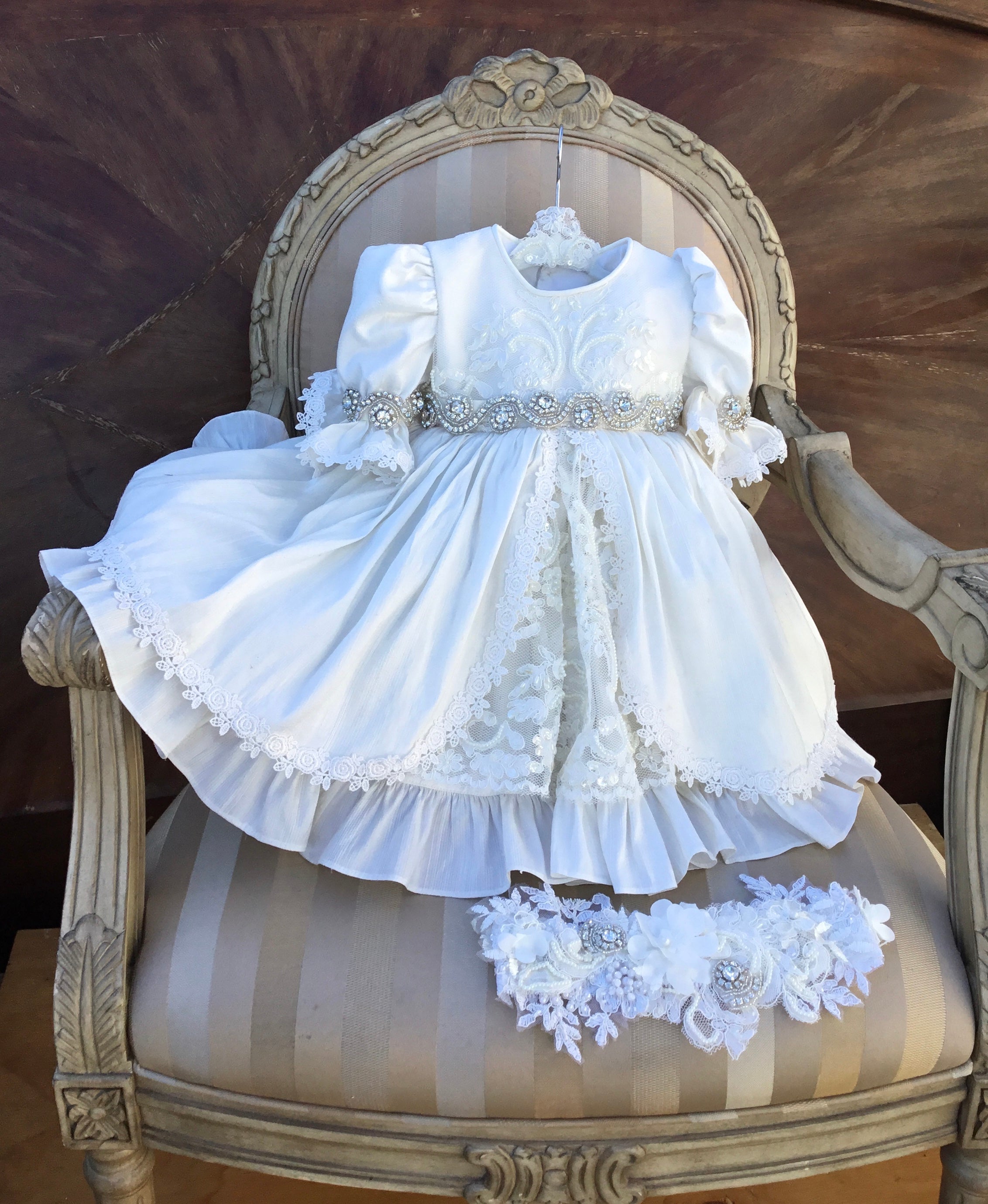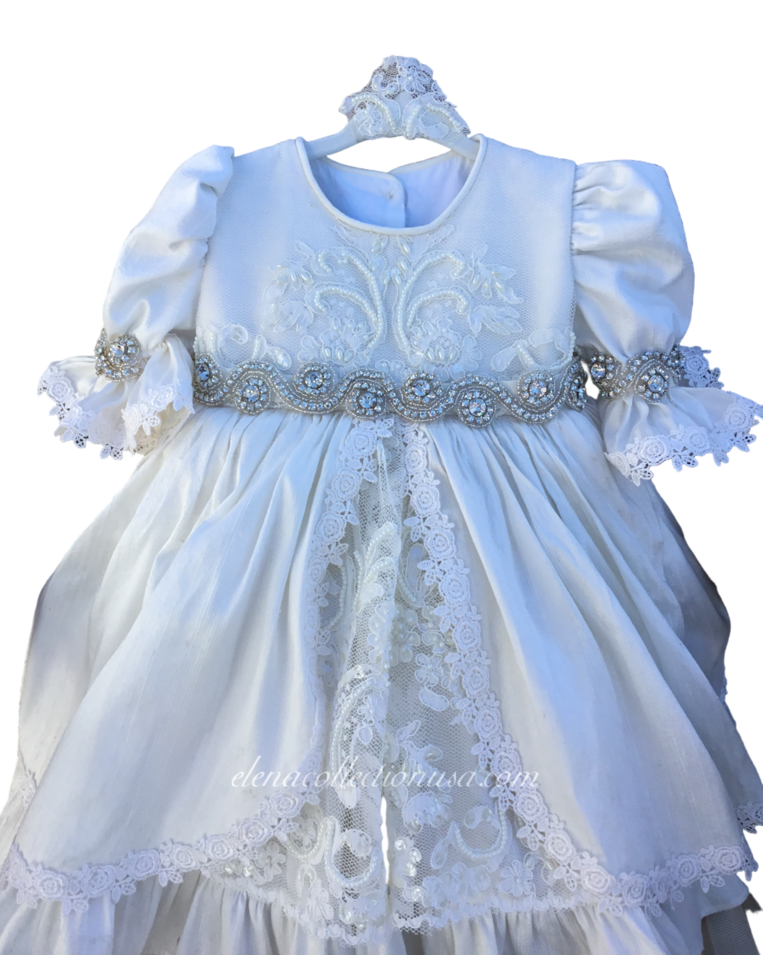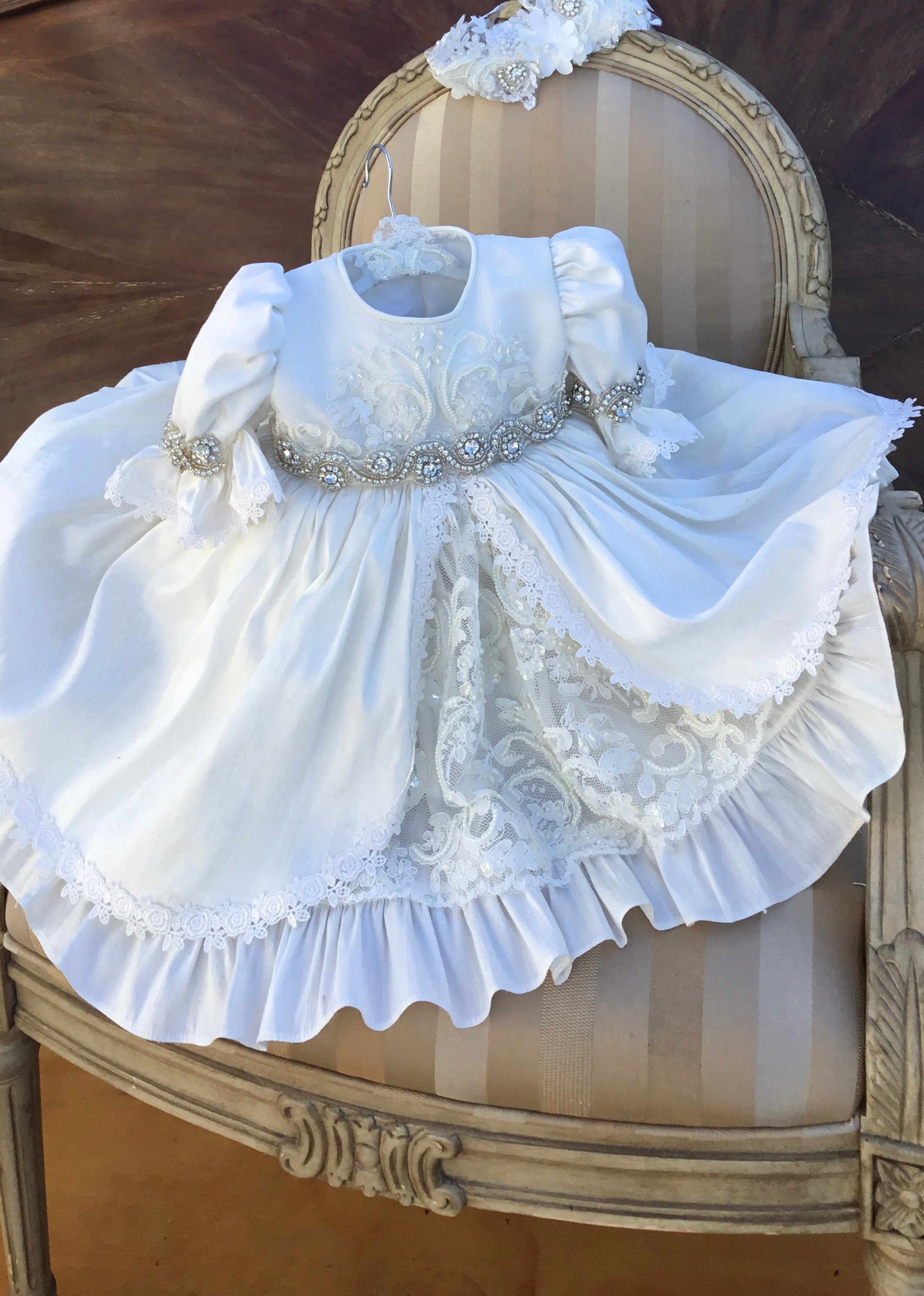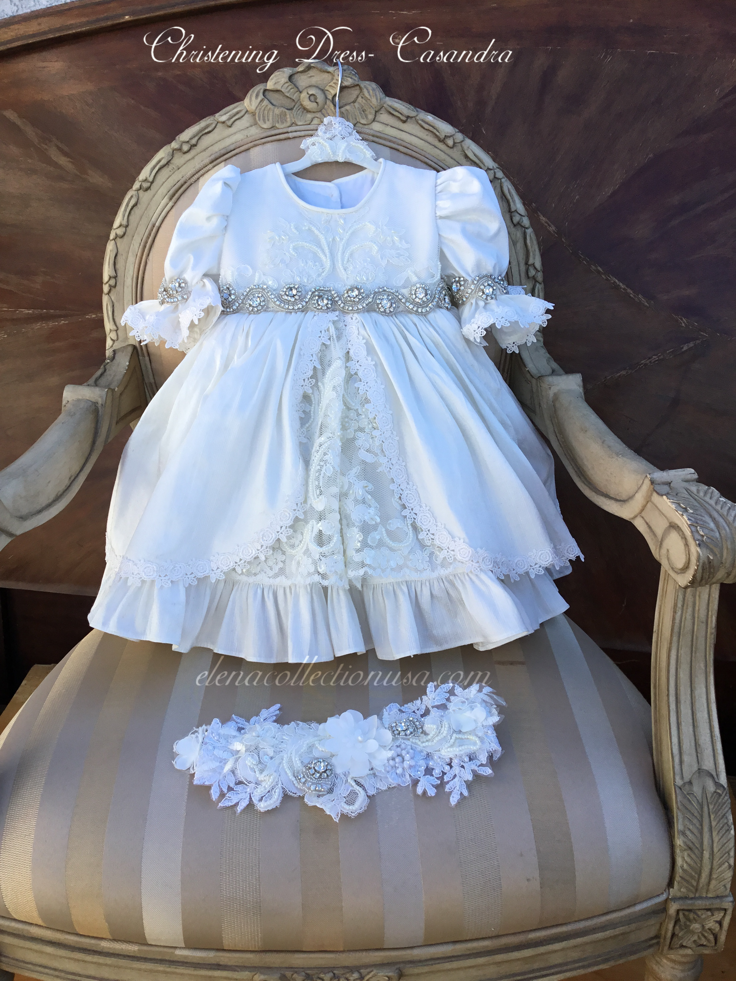 Casandra is a luxurious Victorian-inspired christening dress made with exquisite fabrics and delicate details. Perfect for walking baby girls and toddlers, it includes your choice of a bonnet or headband (sold separately). Sizes are based on precise chest measurements, with custom options available. Each gown is handmade with care and shipped via Priority Mail with tracking. To preserve its elegance, dry clean or steam iron before use. Fabrics: - Raw silk - Hand-beaded lace - Venetian trim