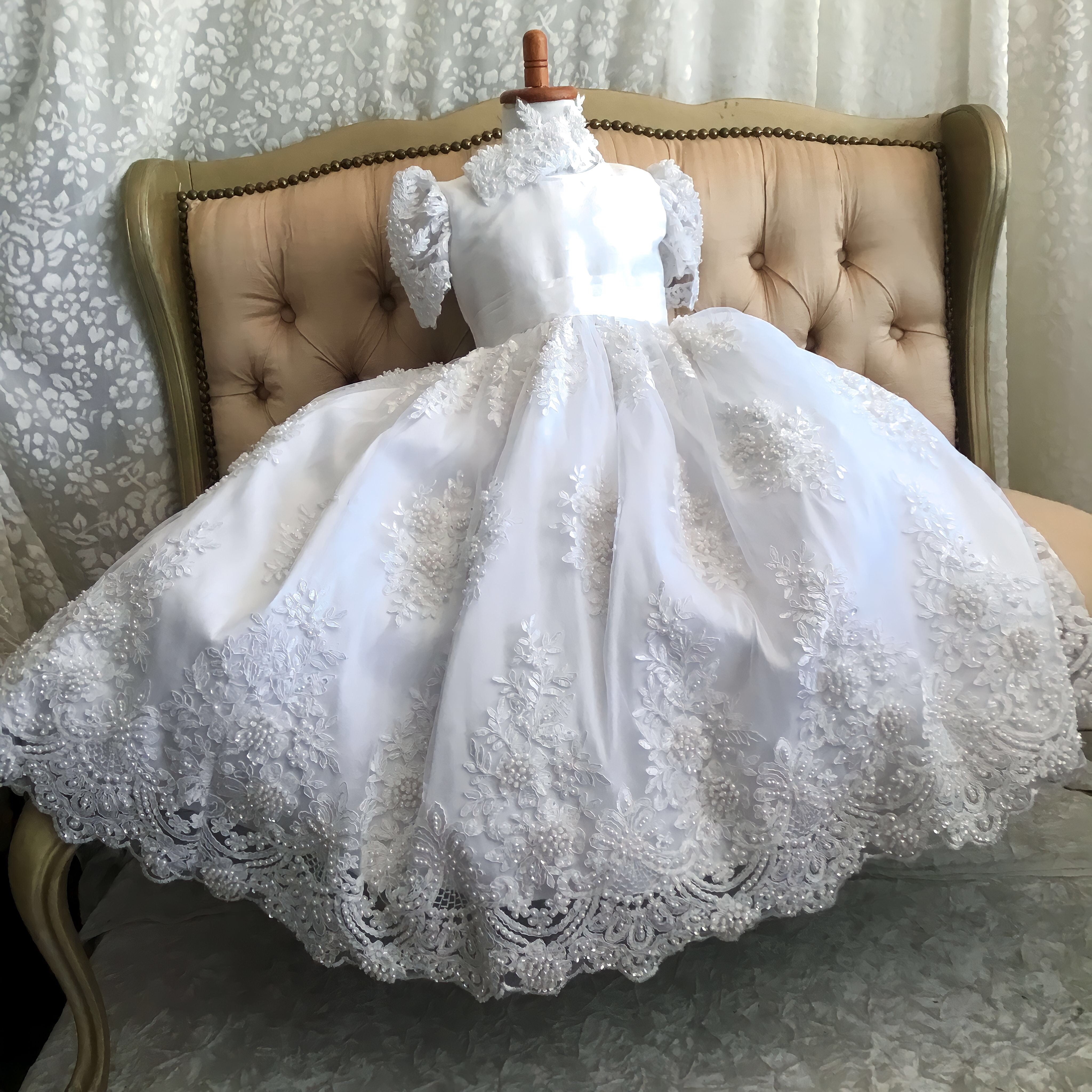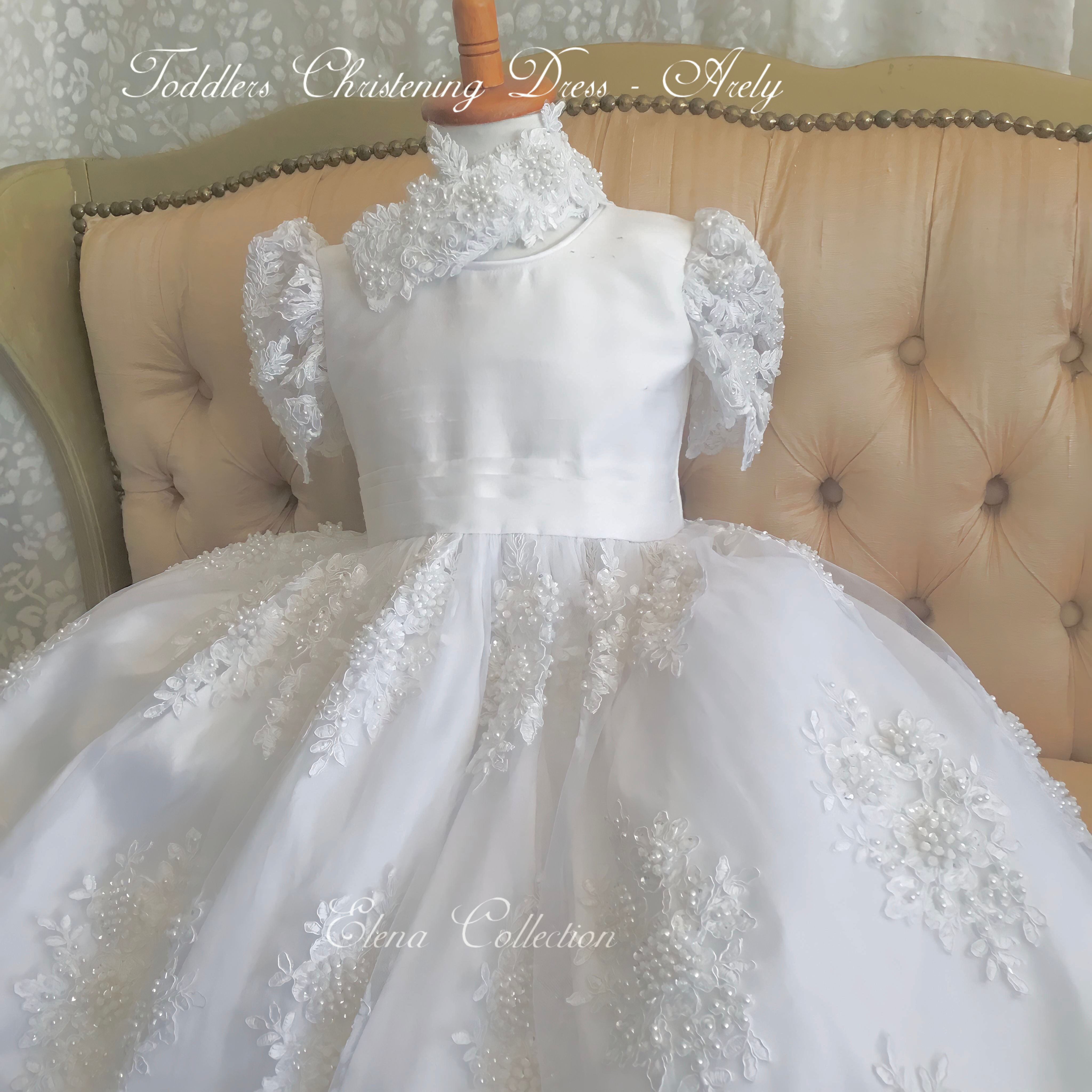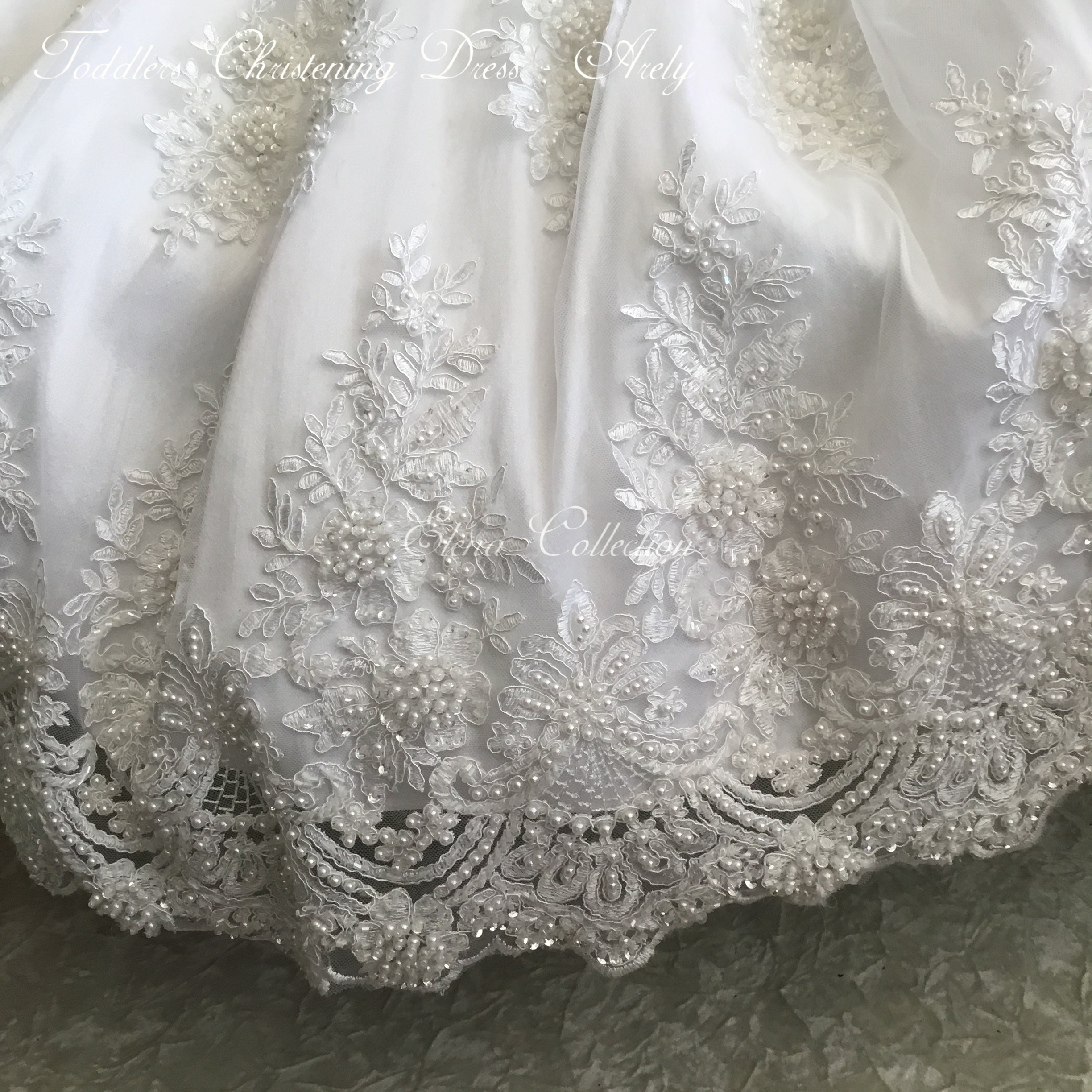 The Arely Christening dress is a luxurious gown designed for special baptism moments, combining elegance and timeless beauty. It features exquisite detailing such as pearls, beads, crystals, and shimmering sequins on delicate lace. The bodice is handmade from silk, accented with a front sash, piping on the neckline, and sheer lace sleeves. Fully lined with attached crinoline, it offers graceful fullness. Fabrics used: - Lace with pearl, bead, crystal, and sequin embellishments - Handmade silk bodice - Sheer lace sleeves - Fully lined with crinoline Please note that lace details may vary slightly depending on availability.