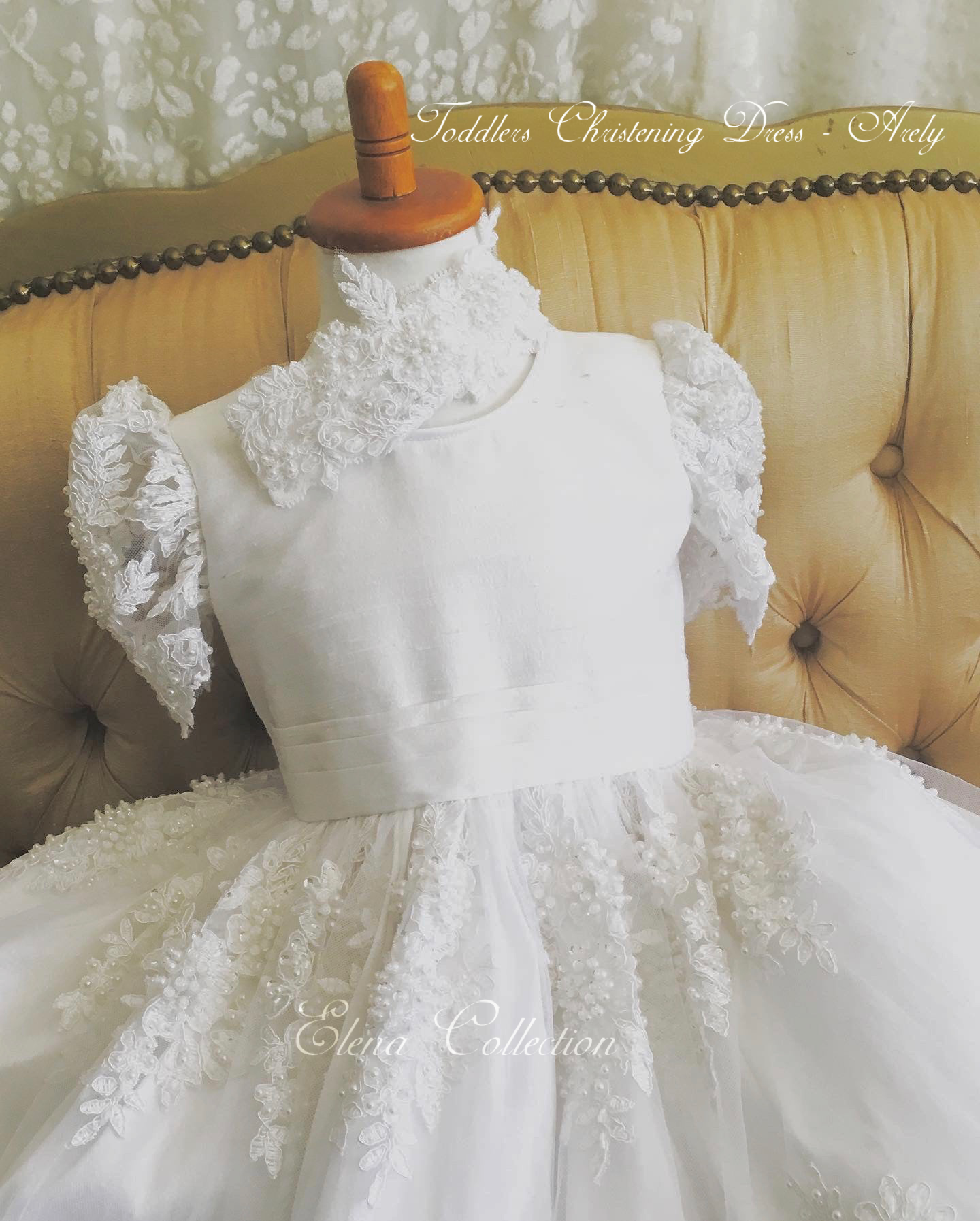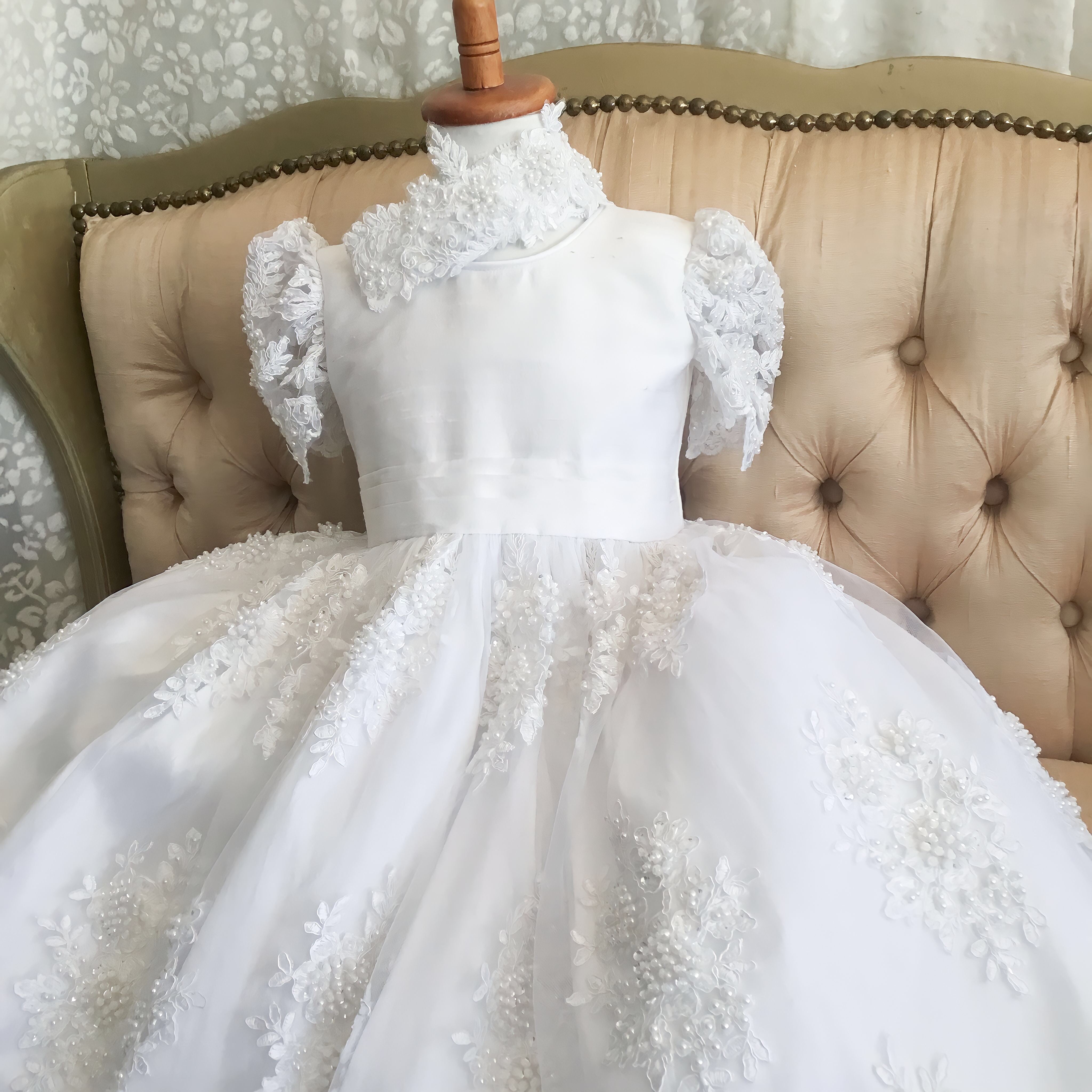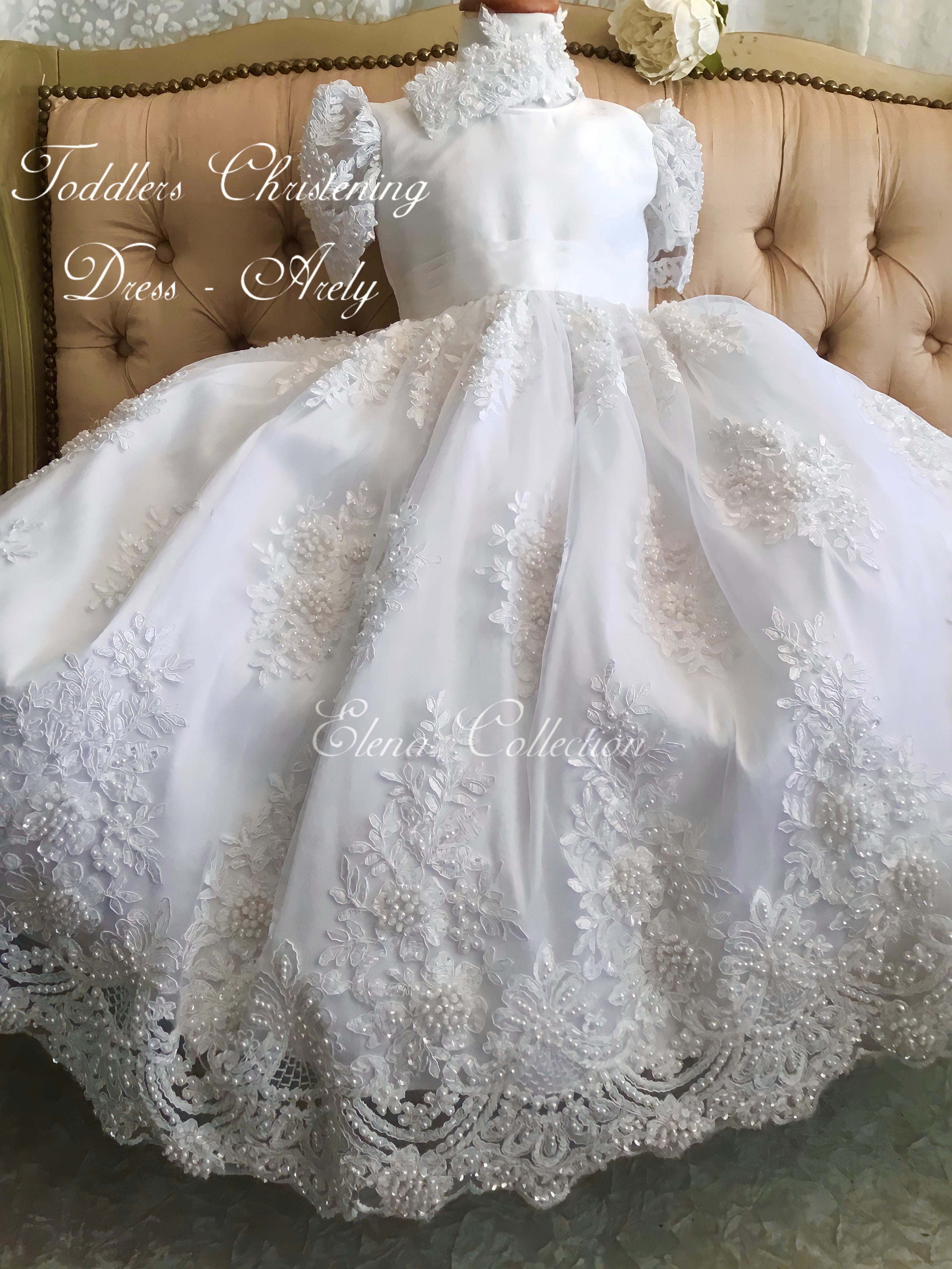 The Arely Christening dress is a luxurious gown designed for special baptism moments, combining elegance and timeless beauty. It features exquisite detailing such as pearls, beads, crystals, and shimmering sequins on delicate lace. The bodice is handmade from silk, accented with a front sash, piping on the neckline, and sheer lace sleeves. Fully lined with attached crinoline, it offers graceful fullness. Fabrics used: - Lace with pearl, bead, crystal, and sequin embellishments - Handmade silk bodice - Sheer lace sleeves - Fully lined with crinoline Please note that lace details may vary slightly depending on availability.