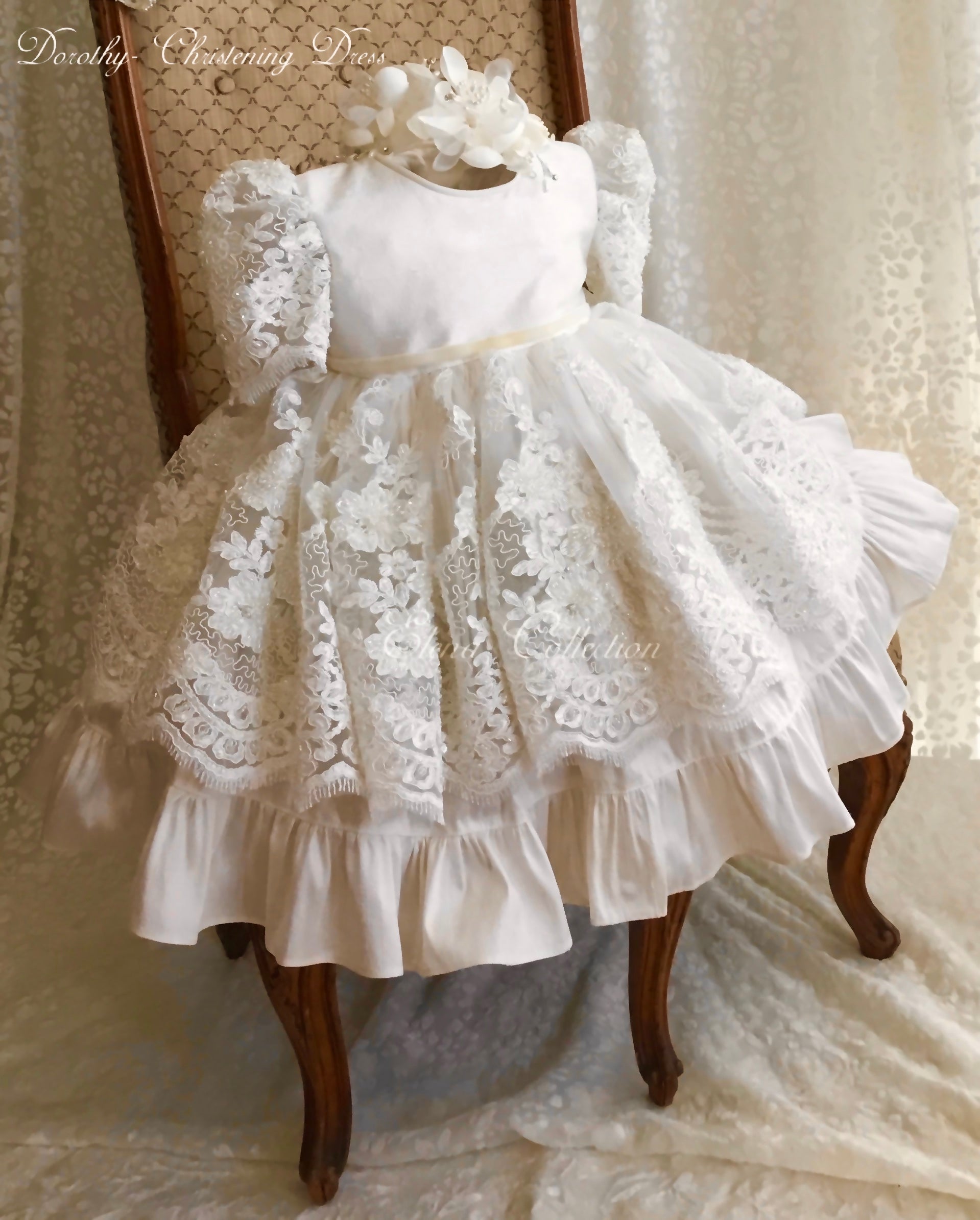 The Dorothy christening dress is a luxurious, handmade gown featuring exquisite hand-beaded lace over a silk skirt with sheer lace sleeves. Designed for baptism day, this heirloom-quality dress includes a matching bonnet and a back closure with hand-sewn buttons. It is fully lined with pure cotton for softness and comfort. Made to order in California with worldwide shipping, the dress fits true to size with optional custom measurements available. Fabrics: • Lace • Tulle • Piping • Fusing Pair it with elegant accessories to complete this timeless, precious look.
