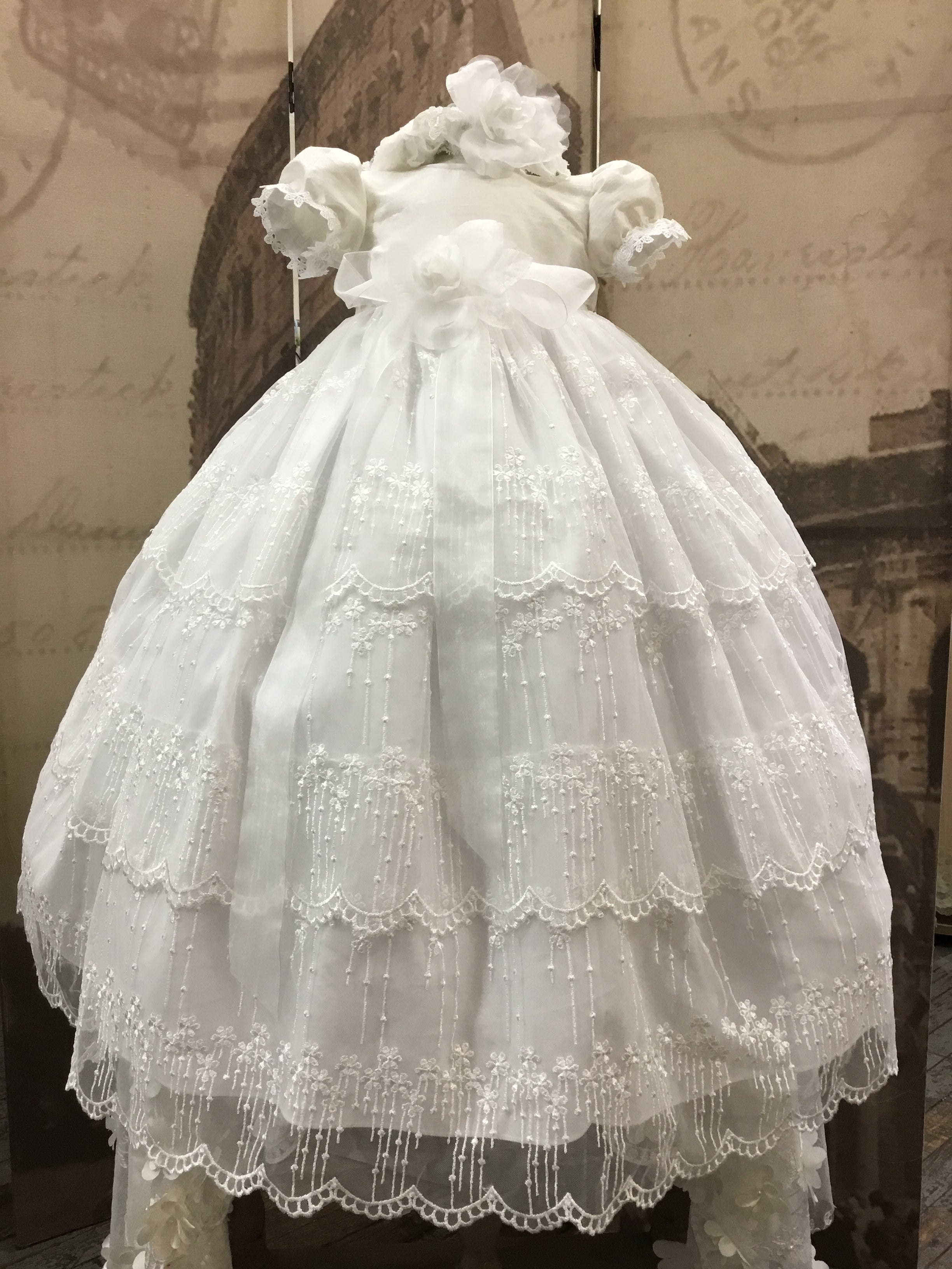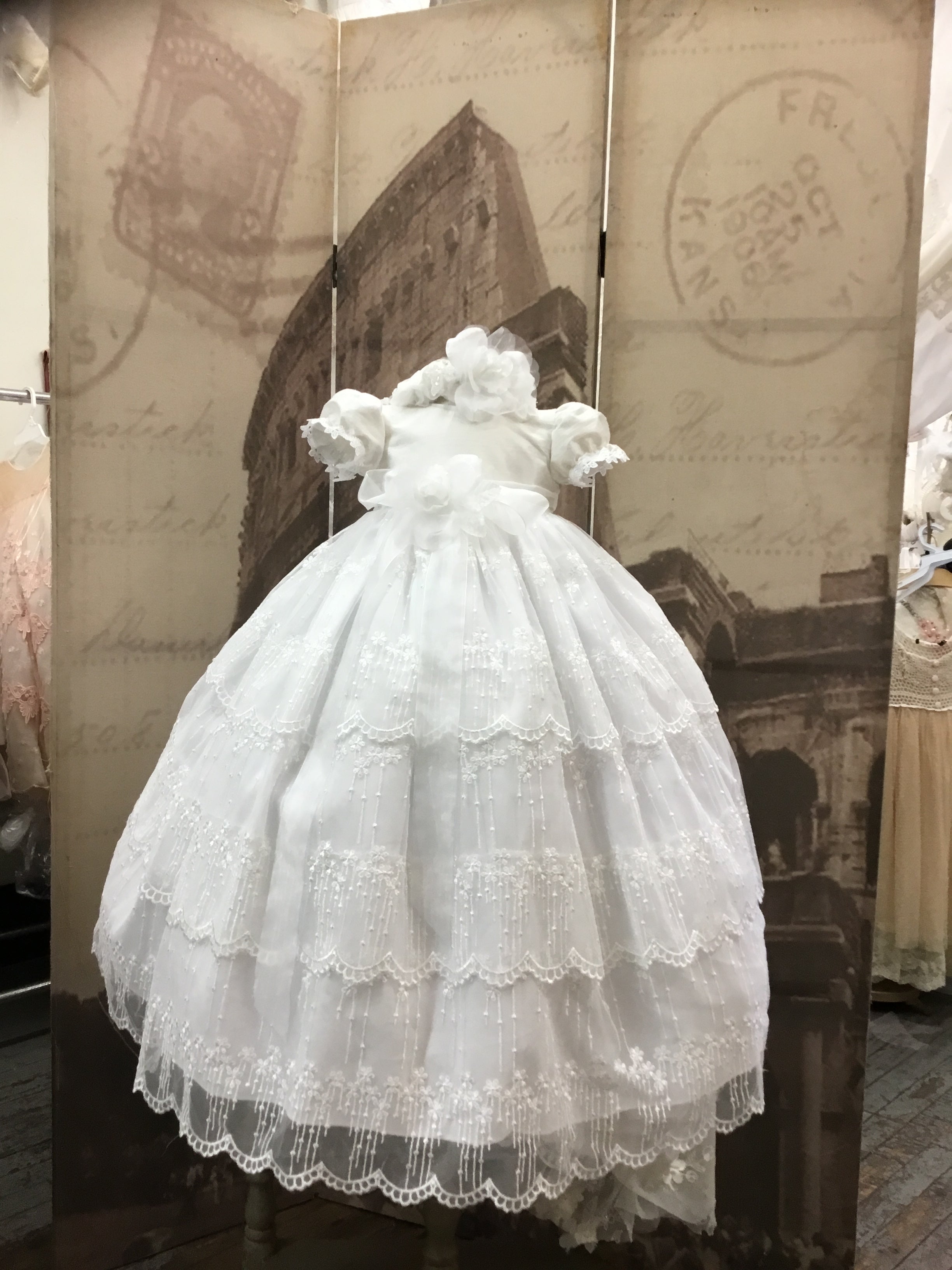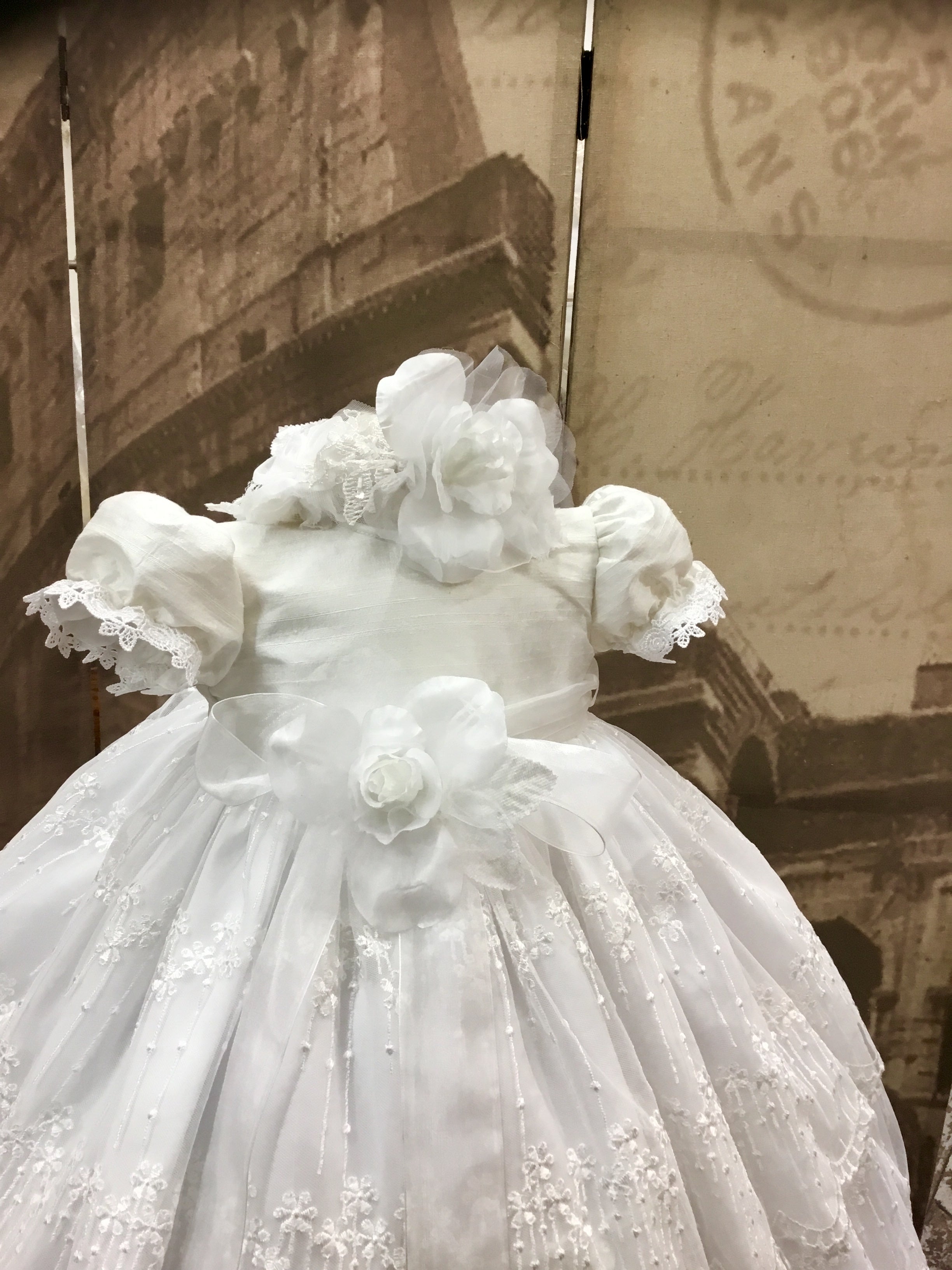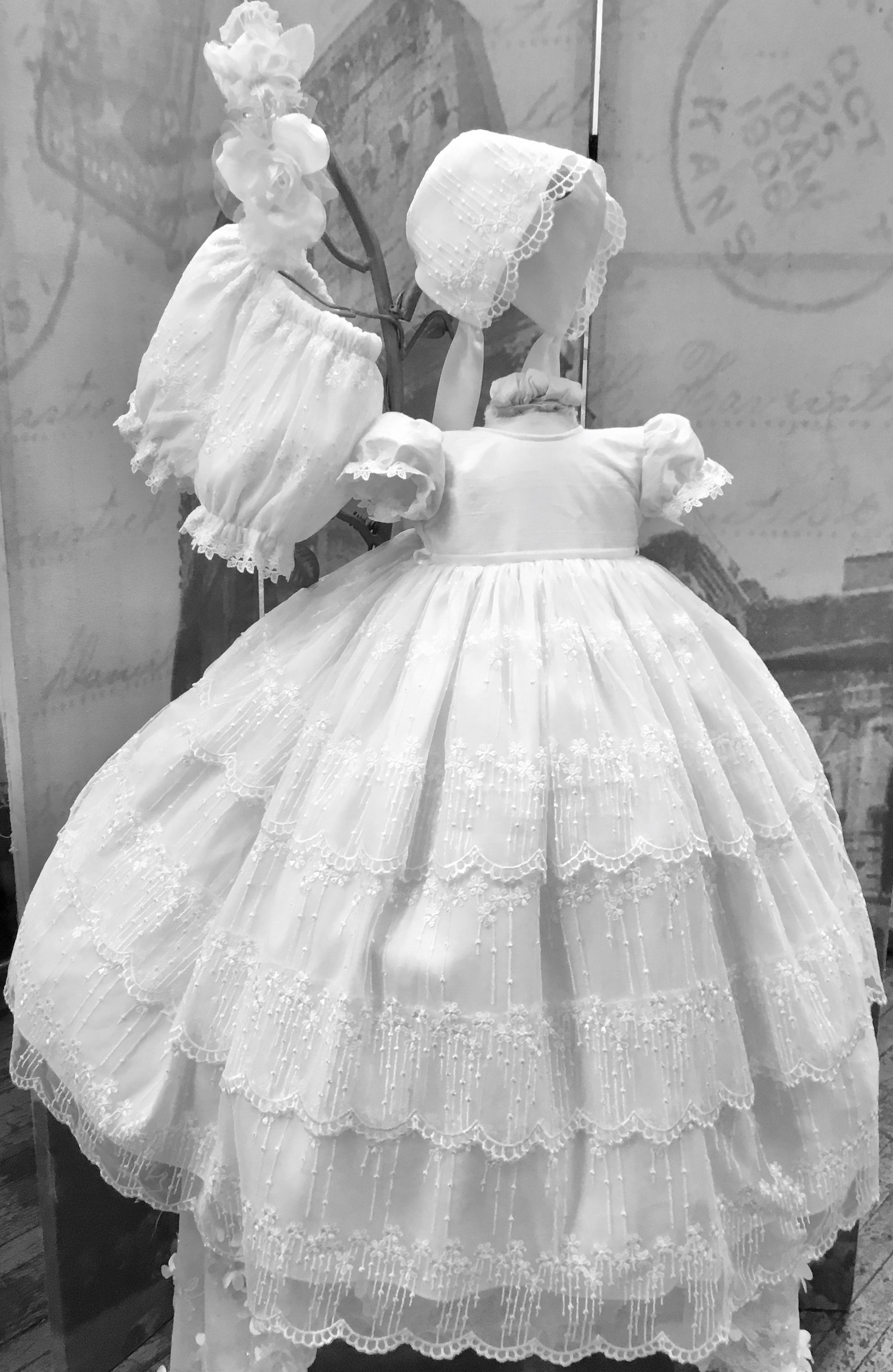 The Emily christening gown features exquisite fabrics for a luxurious baptism outfit: - Embroidery Lace - Tulle - Piping - Fusing - Cotton Handmade with delicate embroidery and a velvet ribbon waist, this heirloom-quality gown includes a matching bonnet, sheer lace sleeves, and an elegant open back with hand-sewn buttons. Designed for comfort and style, it is fully lined with a petticoat for a full skirt perfect for Special occasions. Custom sizing and accessories are available to ensure a flawless fit and timeless keepsake.