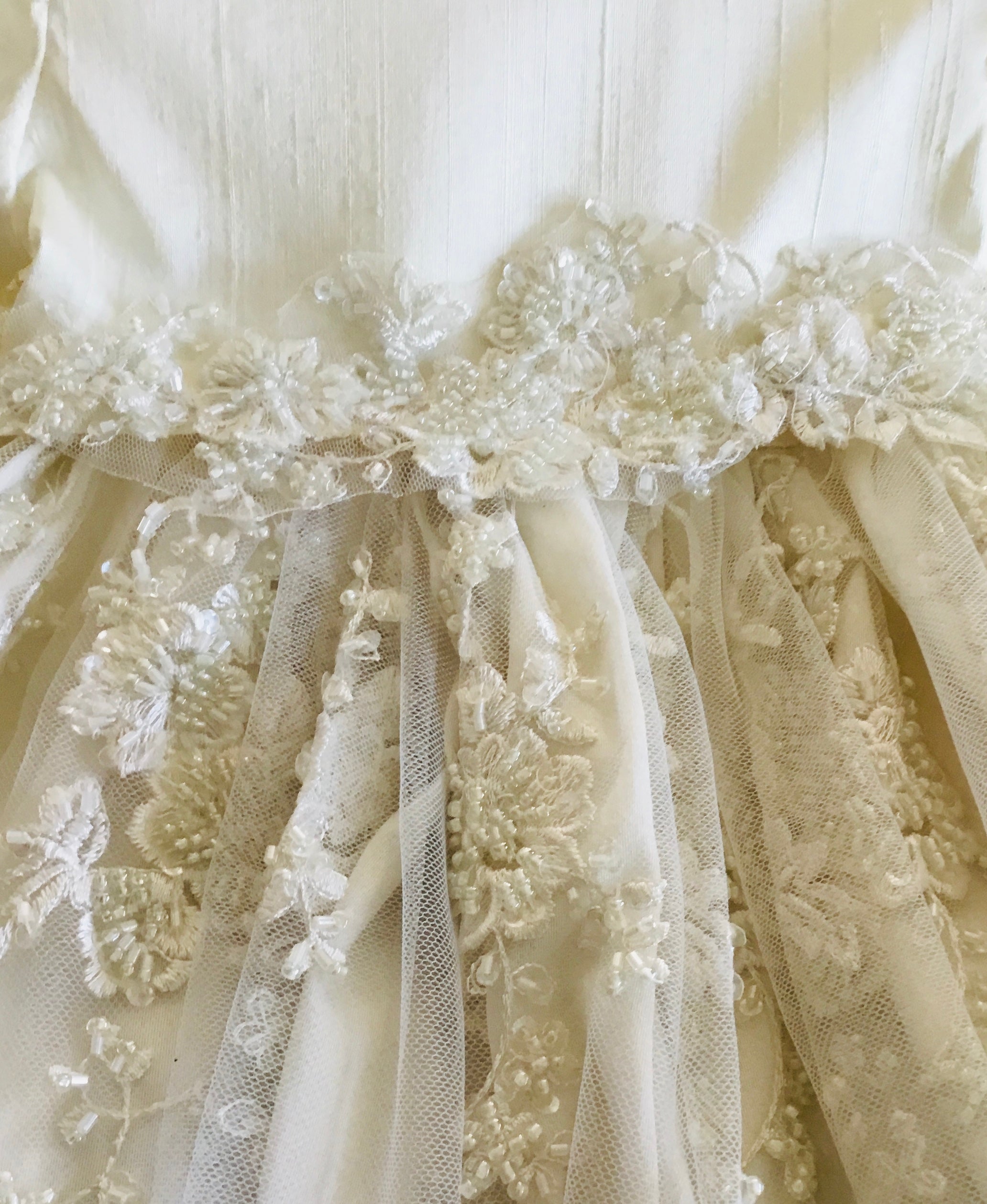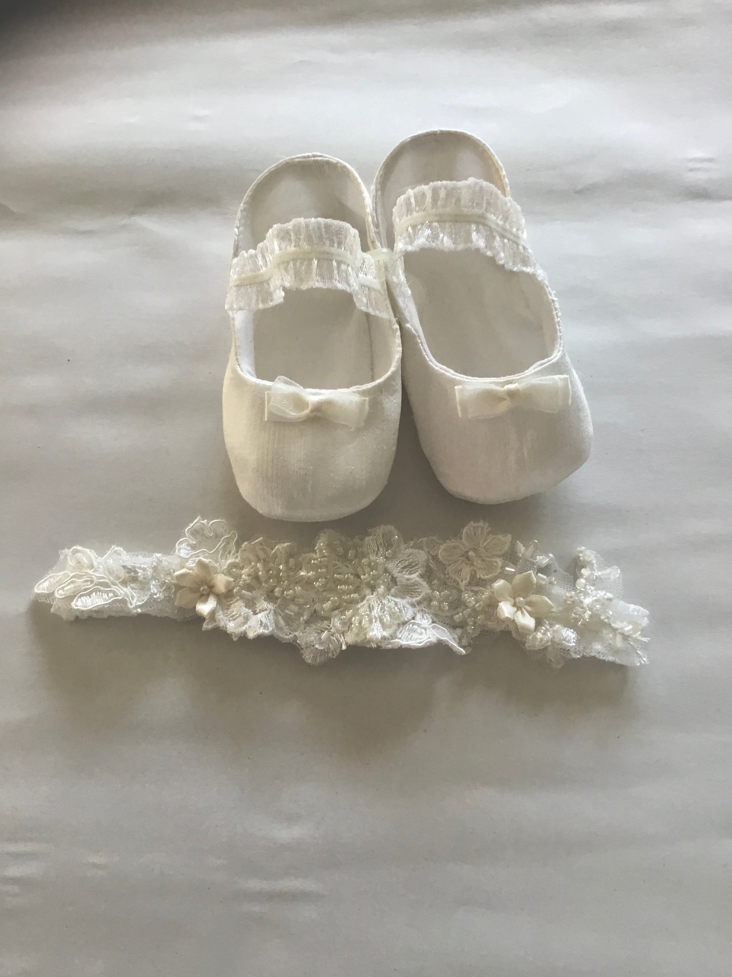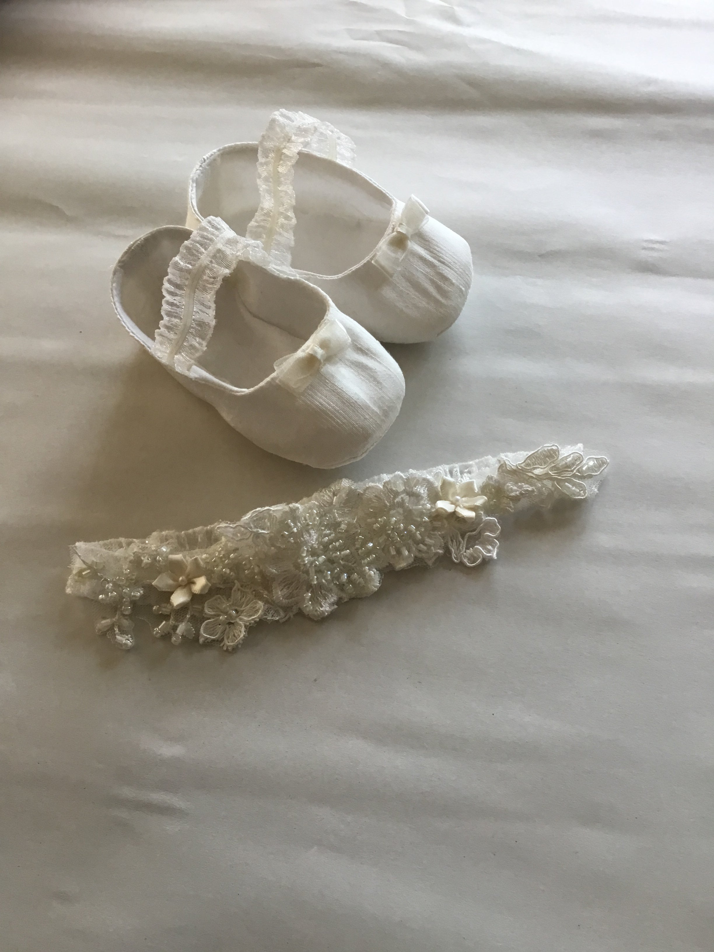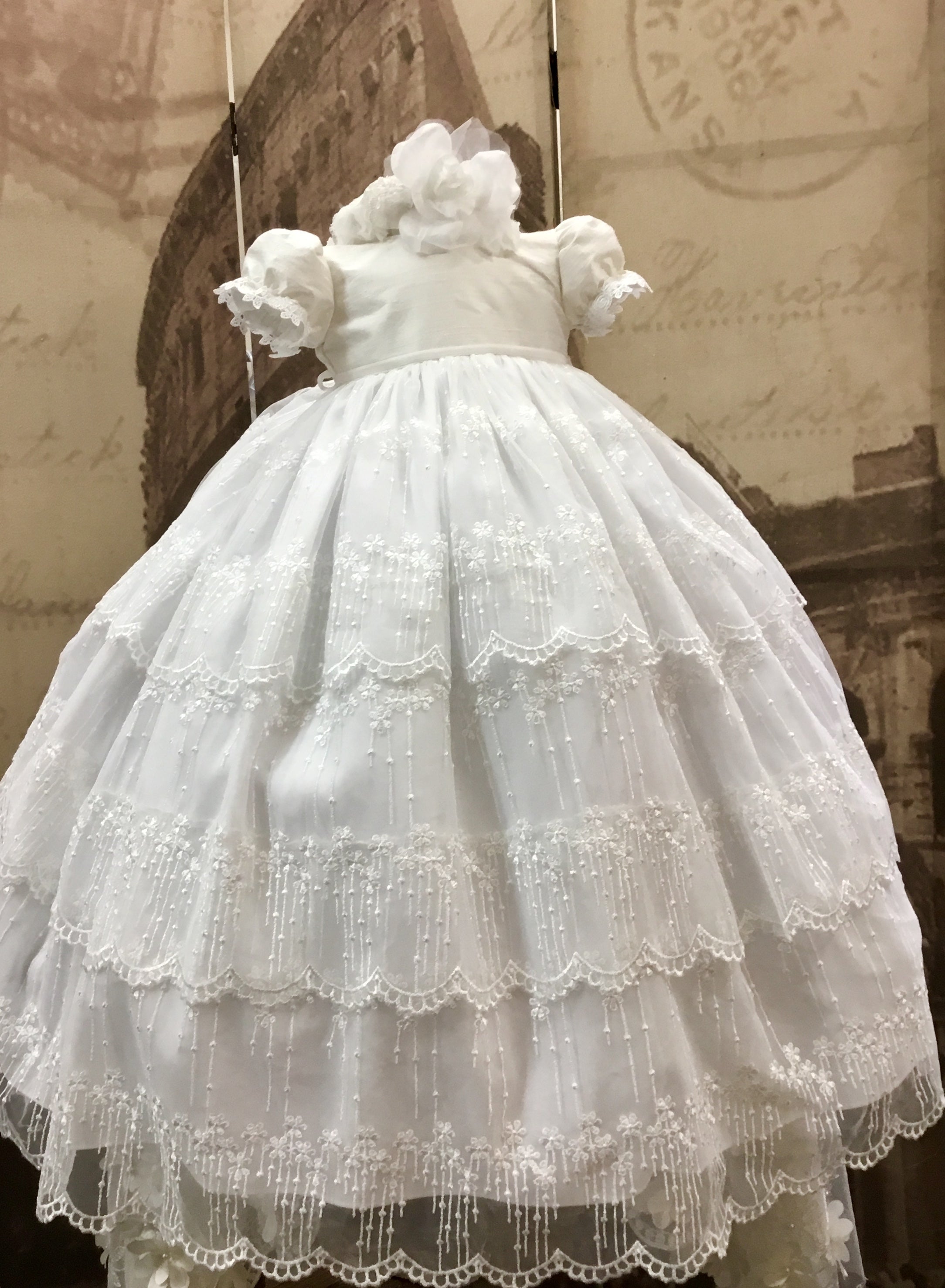 The Emily christening gown features exquisite fabrics for a luxurious baptism outfit: - Embroidery Lace - Tulle - Piping - Fusing - Cotton Handmade with delicate embroidery and a velvet ribbon waist, this heirloom-quality gown includes a matching bonnet, sheer lace sleeves, and an elegant open back with hand-sewn buttons. Designed for comfort and style, it is fully lined with a petticoat for a full skirt perfect for Special occasions. Custom sizing and accessories are available to ensure a flawless fit and timeless keepsake.
