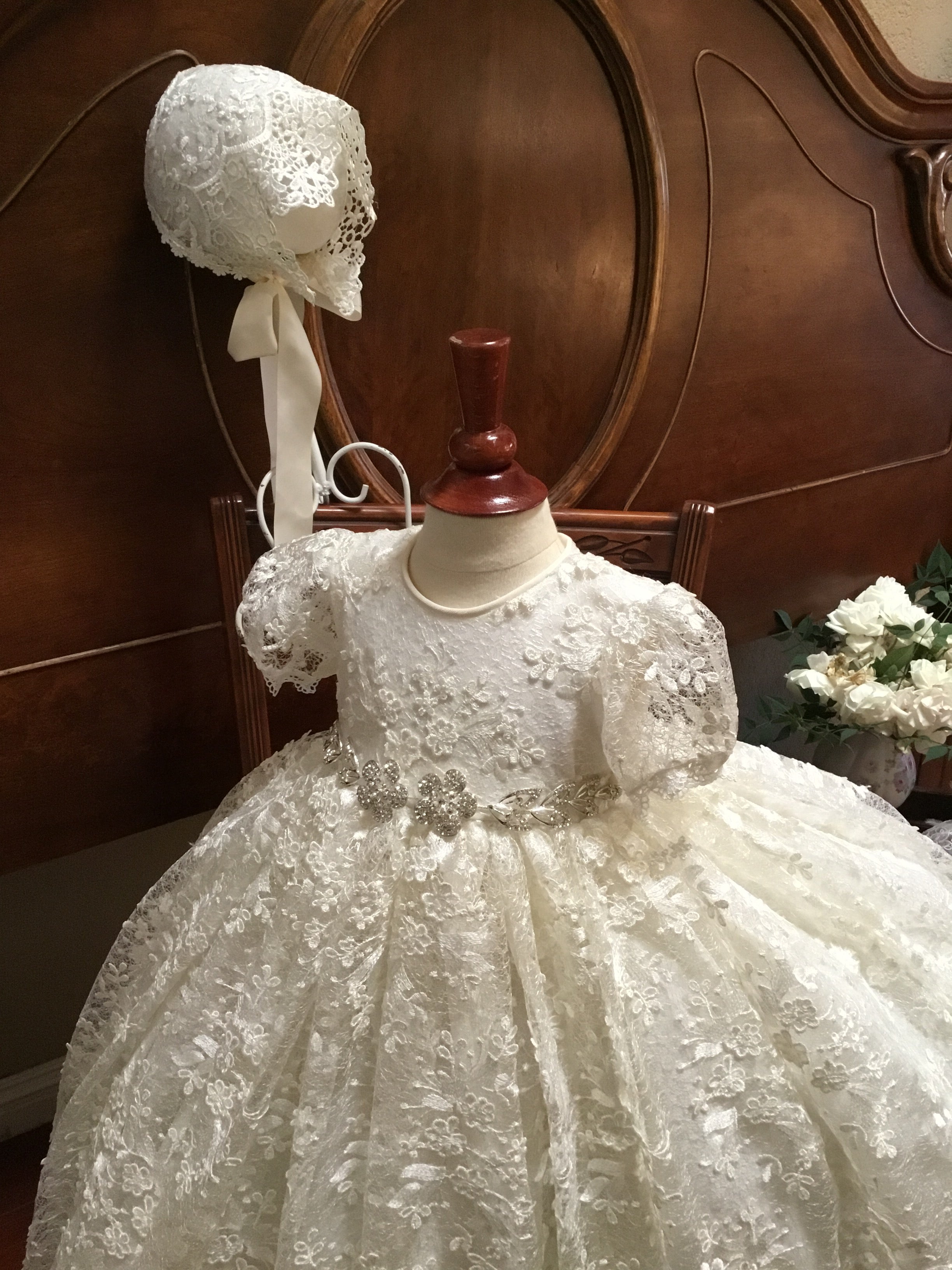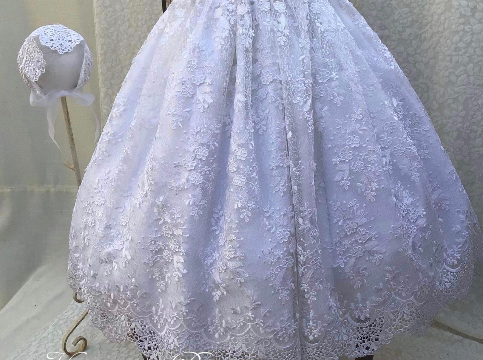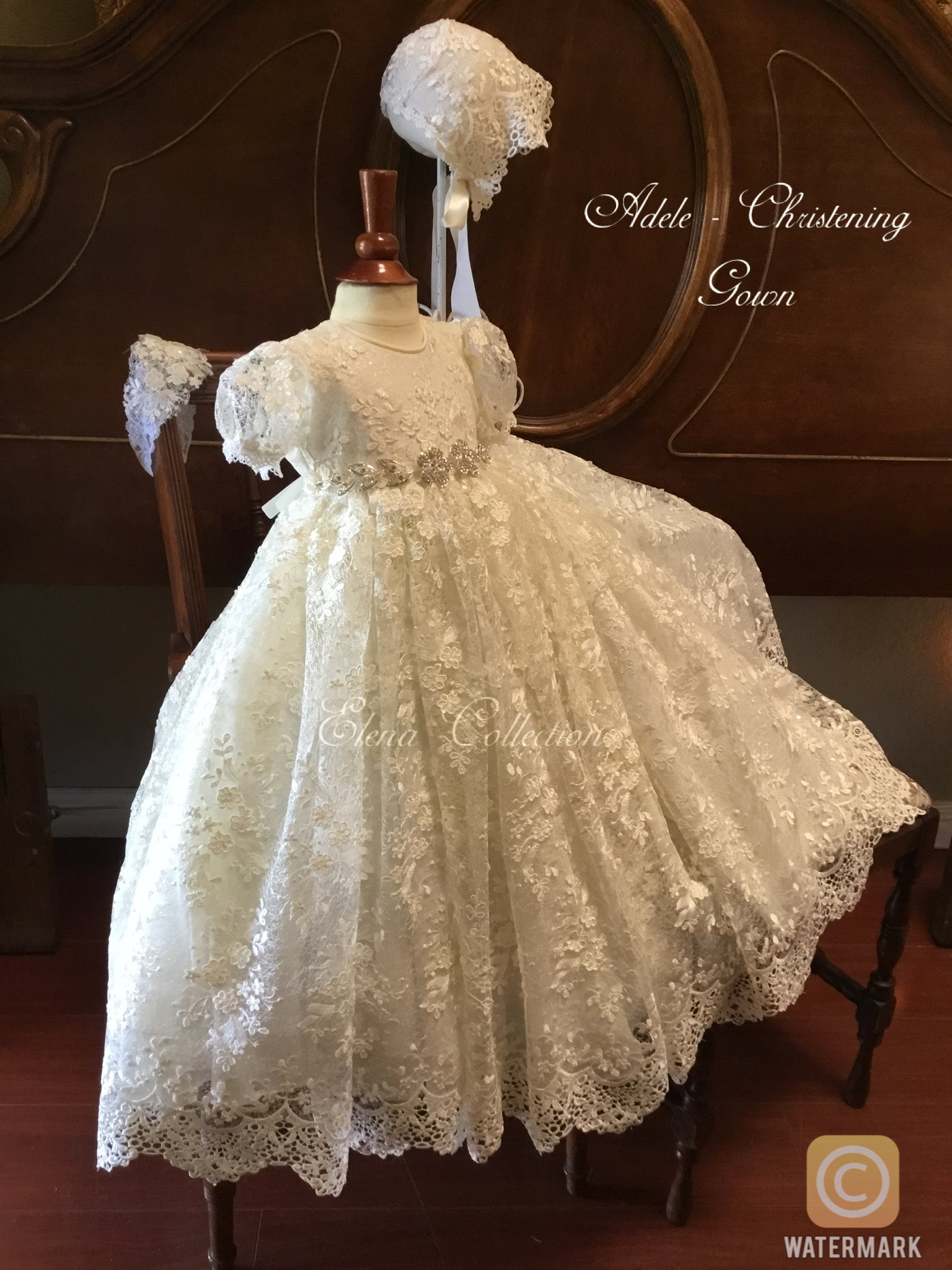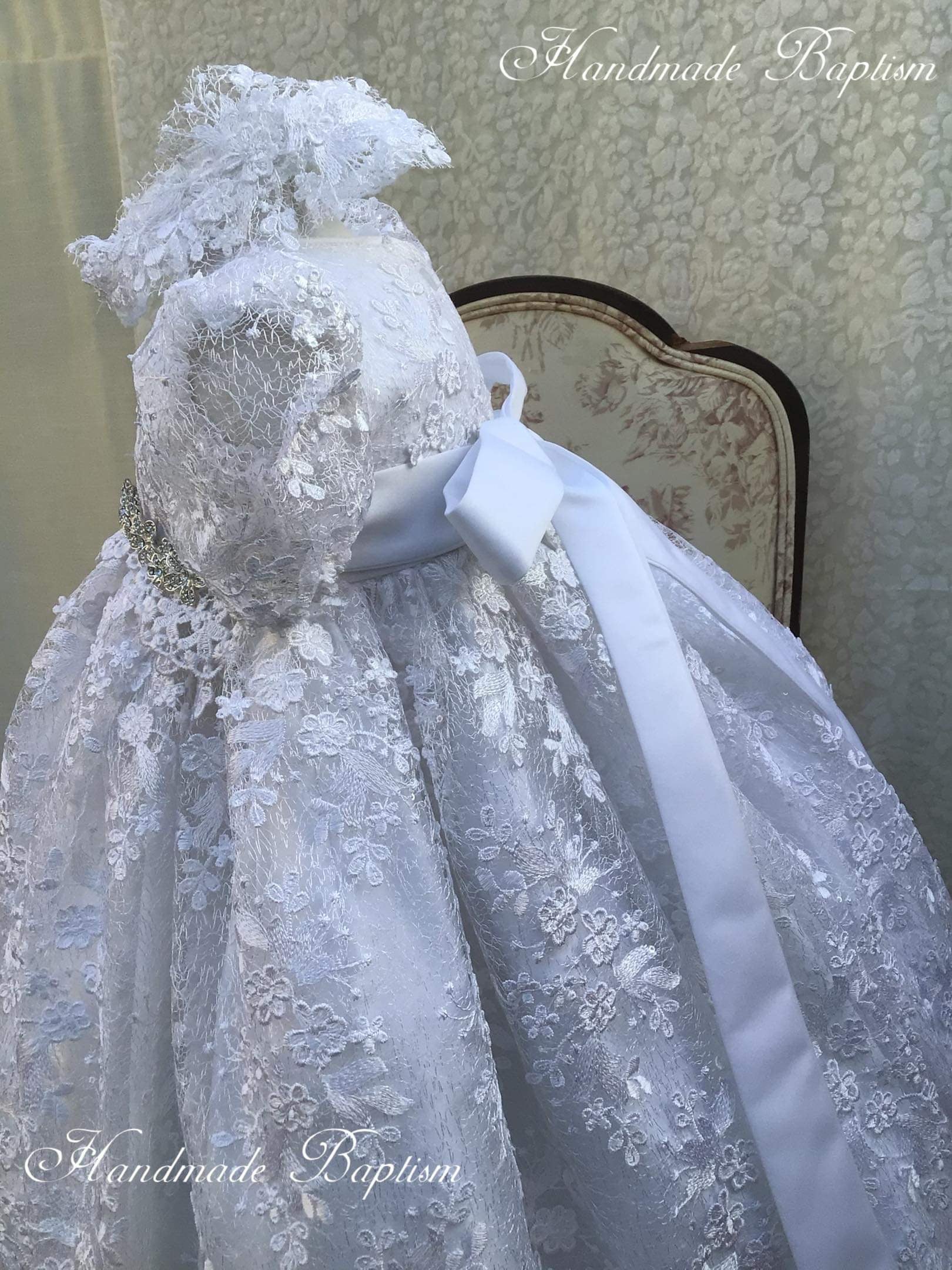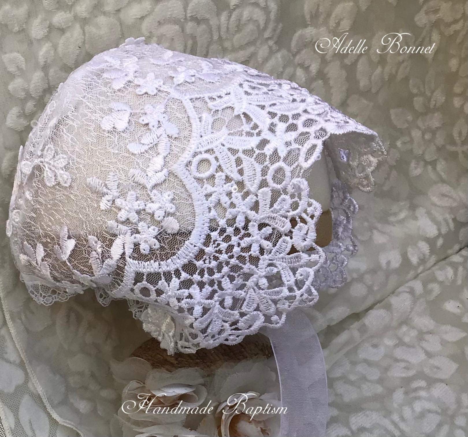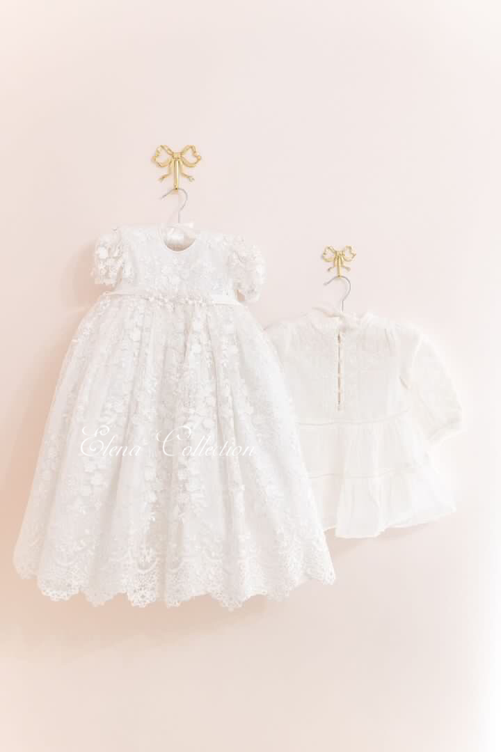 The Lace Adel Christening Gown is a beautifully handcrafted heirloom piece, designed for your baby's special baptism day. It features exquisite 3D embroidered white lace with sequins overlaid on satin, paired with a matching bonnet and sheer lace sleeves trimmed with Venetian lace. The gown is fully lined with 100% pure cotton for comfort and measures 33 inches in length. Fabrics: - Satin - Lace - Tulle - Fusing - Sequins This true-to-size gown is made to order and ships worldwide from California. Custom sizing and coordinating accessories are available to complete this luxurious baptism ensemble destined to be treasured for generations. Dry clean only.
