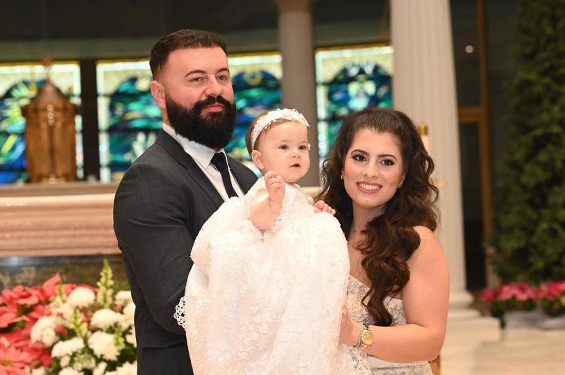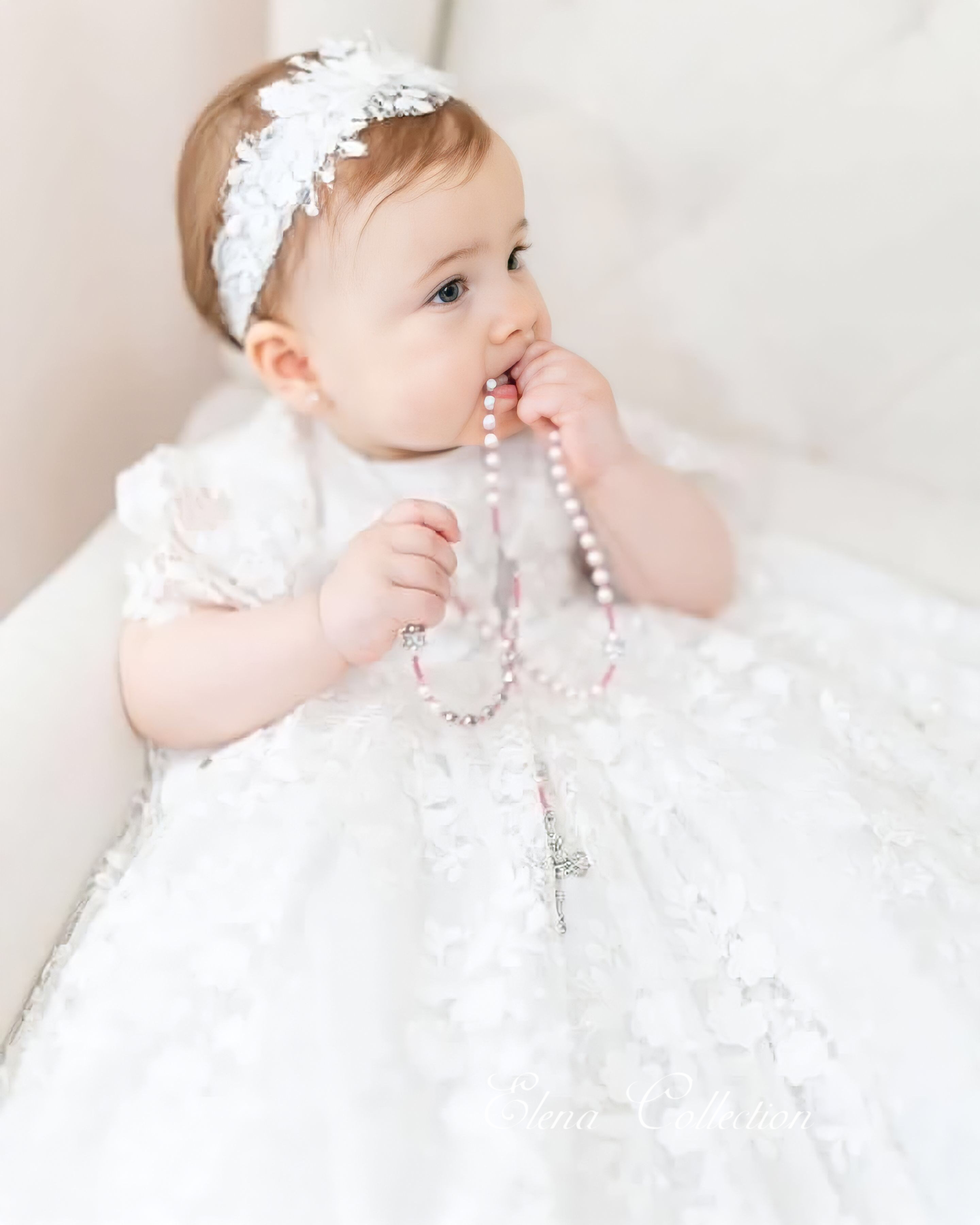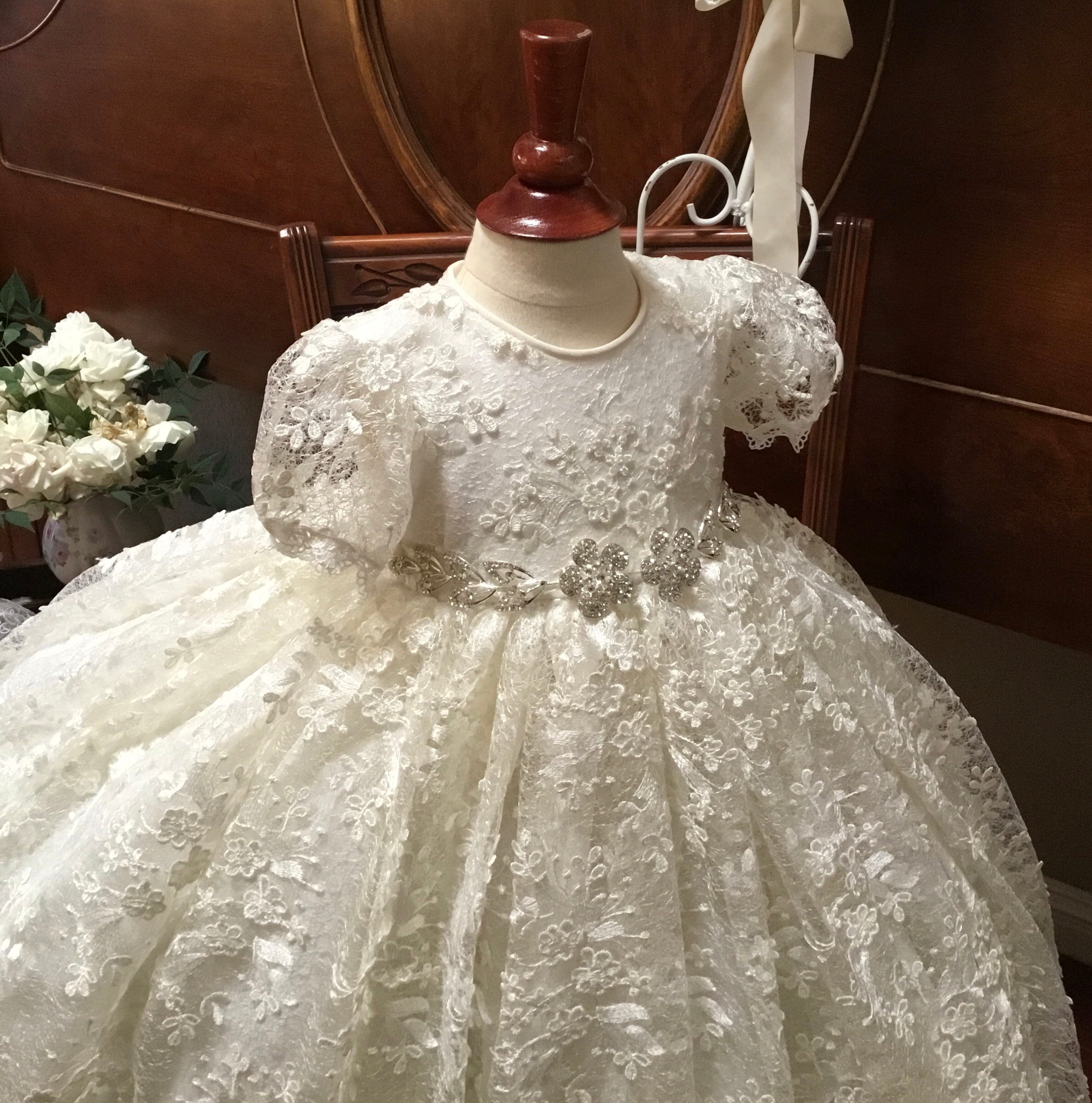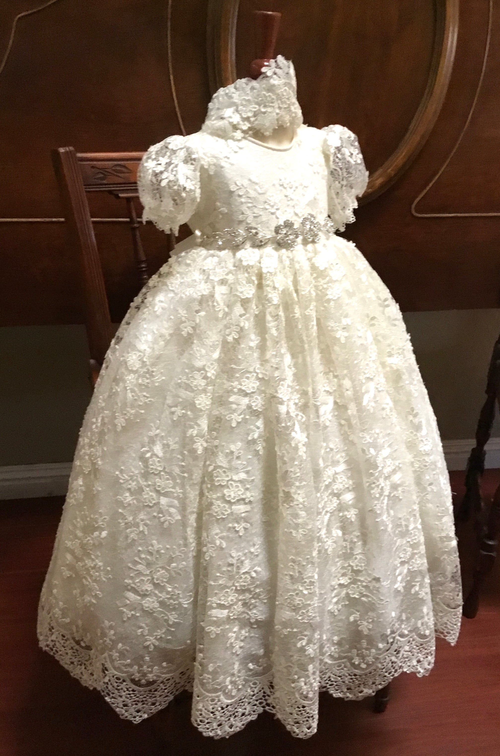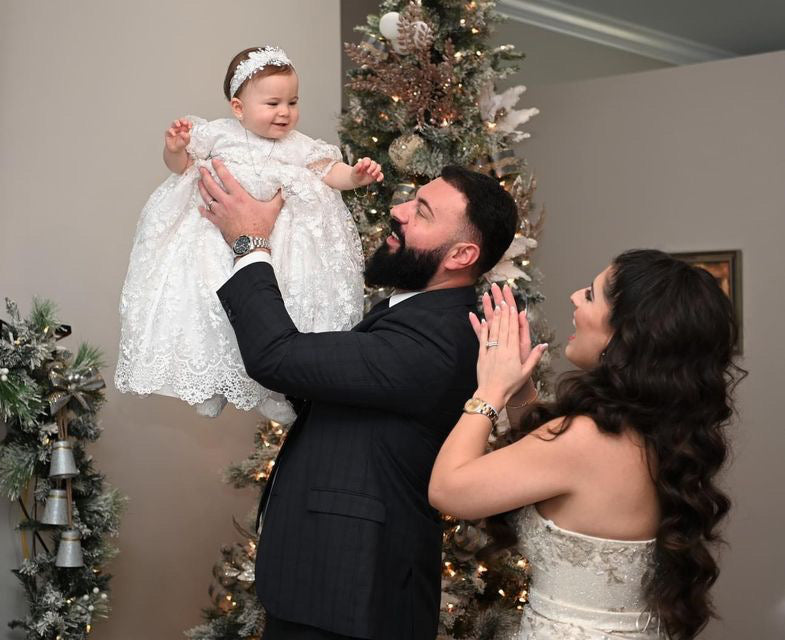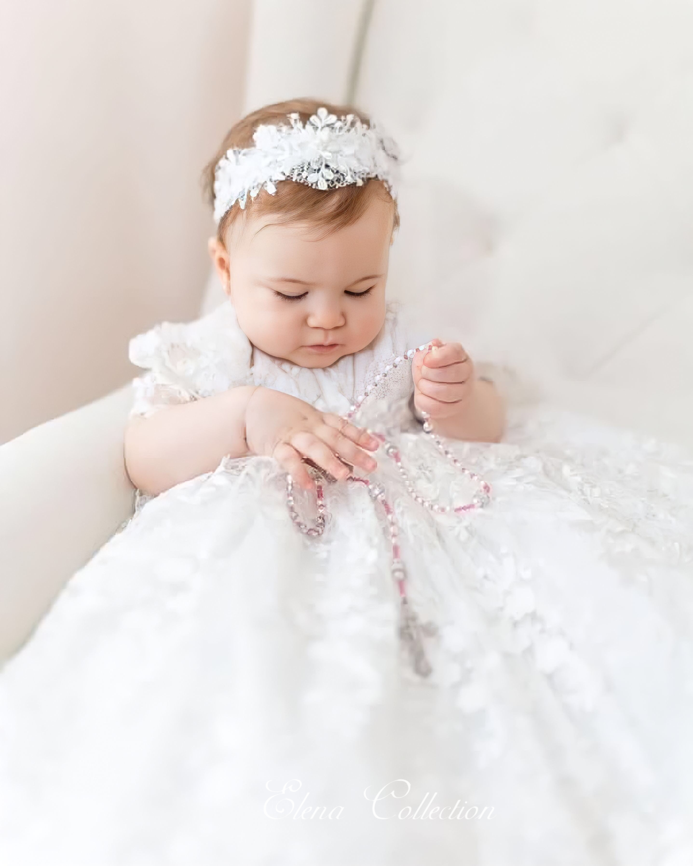 The Lace Adel Christening Gown is a beautifully handcrafted heirloom piece, designed for your baby's special baptism day. It features exquisite 3D embroidered white lace with sequins overlaid on satin, paired with a matching bonnet and sheer lace sleeves trimmed with Venetian lace. The gown is fully lined with 100% pure cotton for comfort and measures 33 inches in length. Fabrics: - Satin - Lace - Tulle - Fusing - Sequins This true-to-size gown is made to order and ships worldwide from California. Custom sizing and coordinating accessories are available to complete this luxurious baptism ensemble destined to be treasured for generations. Dry clean only.