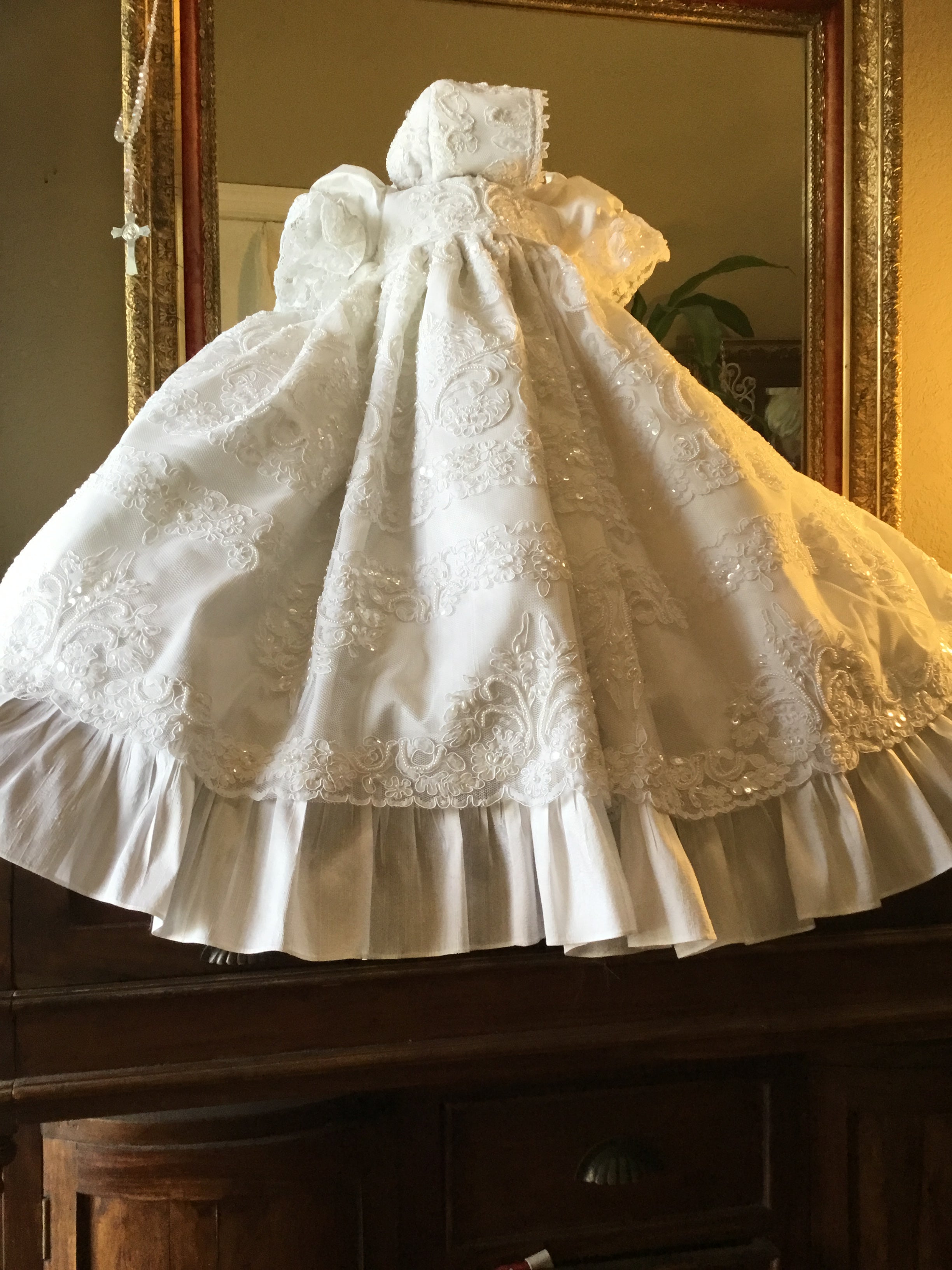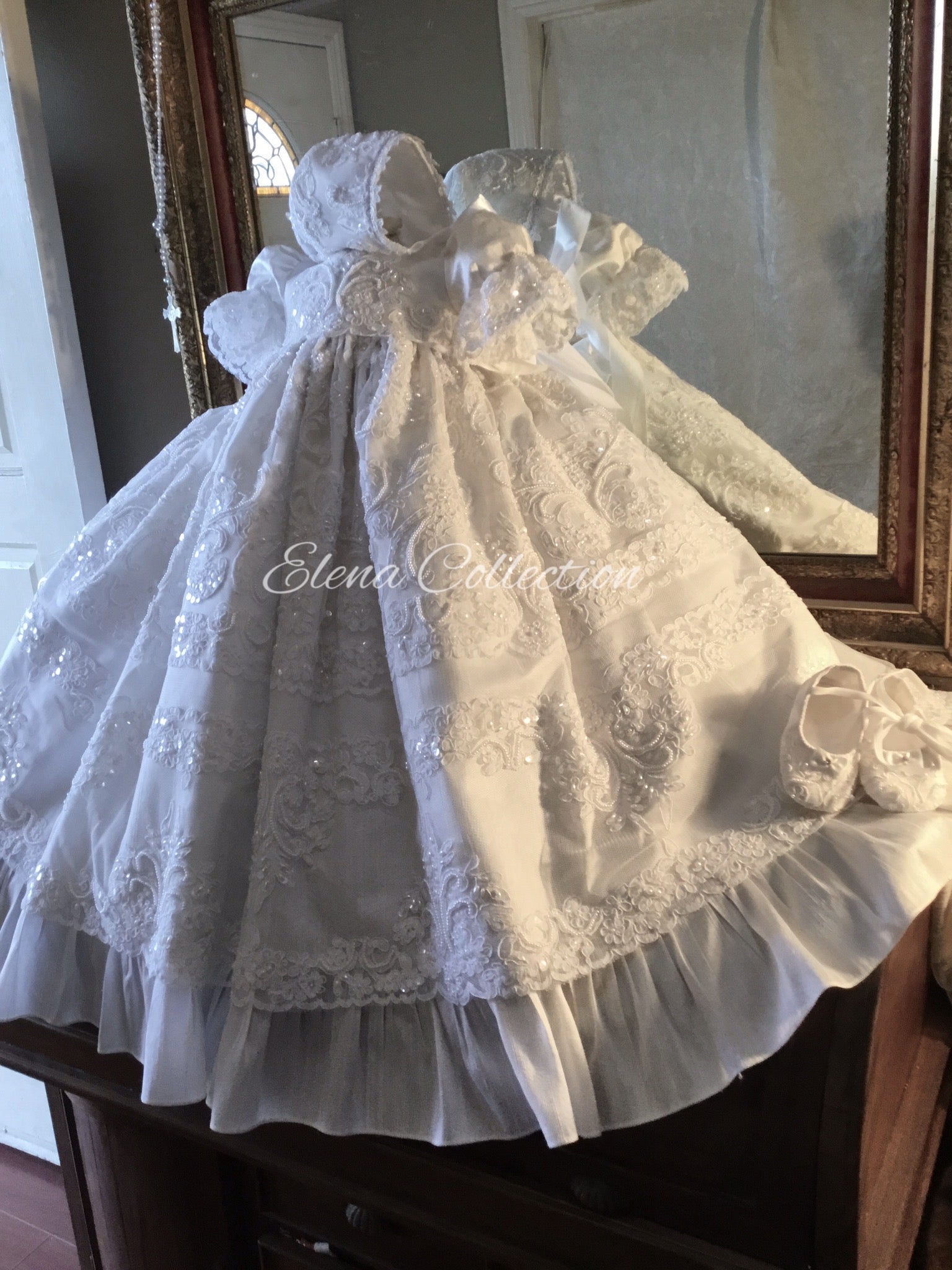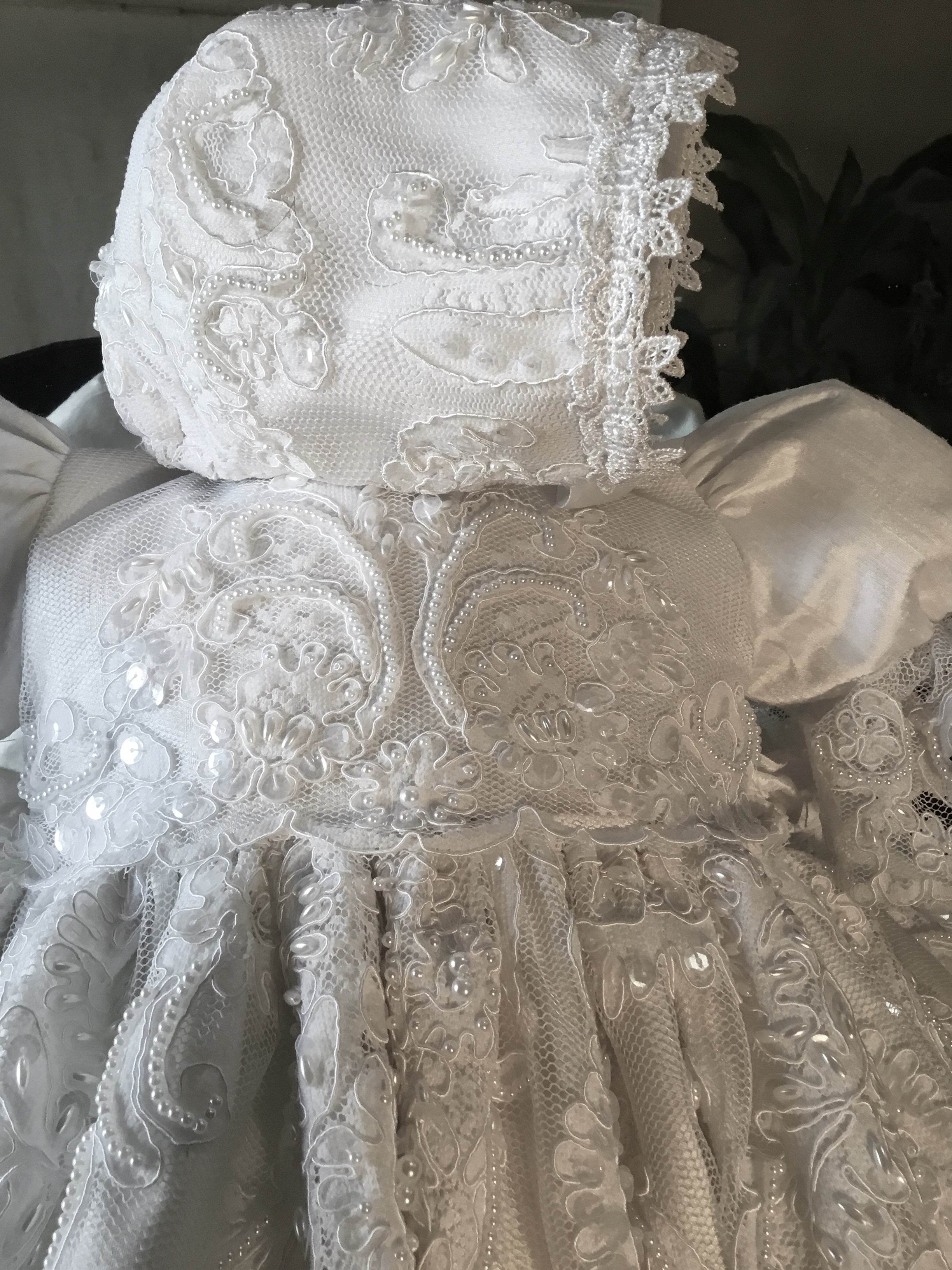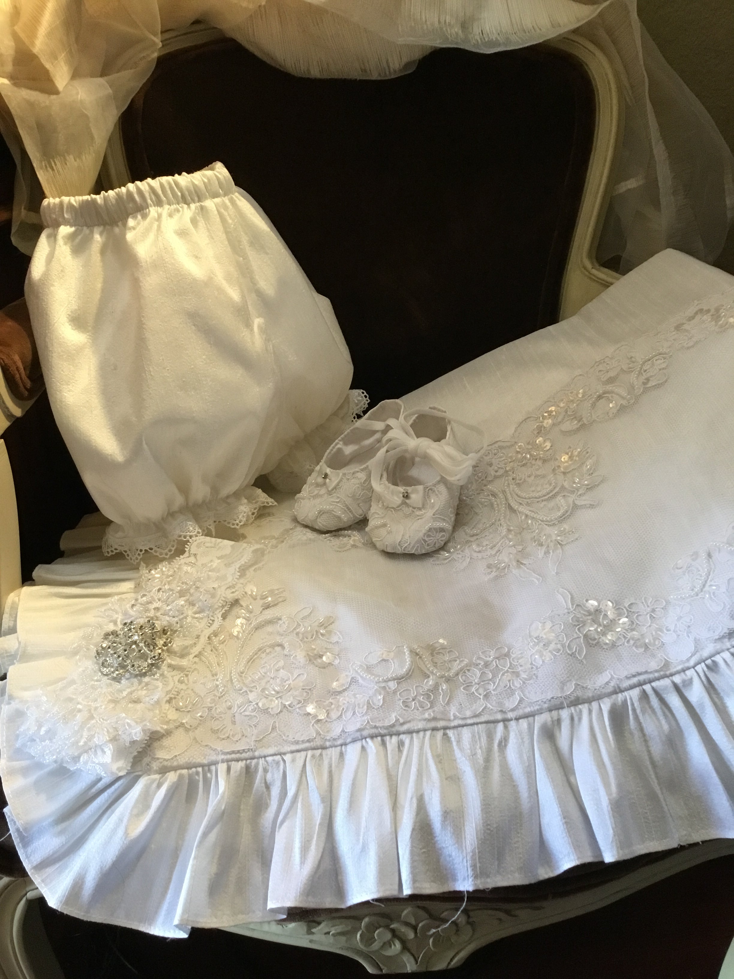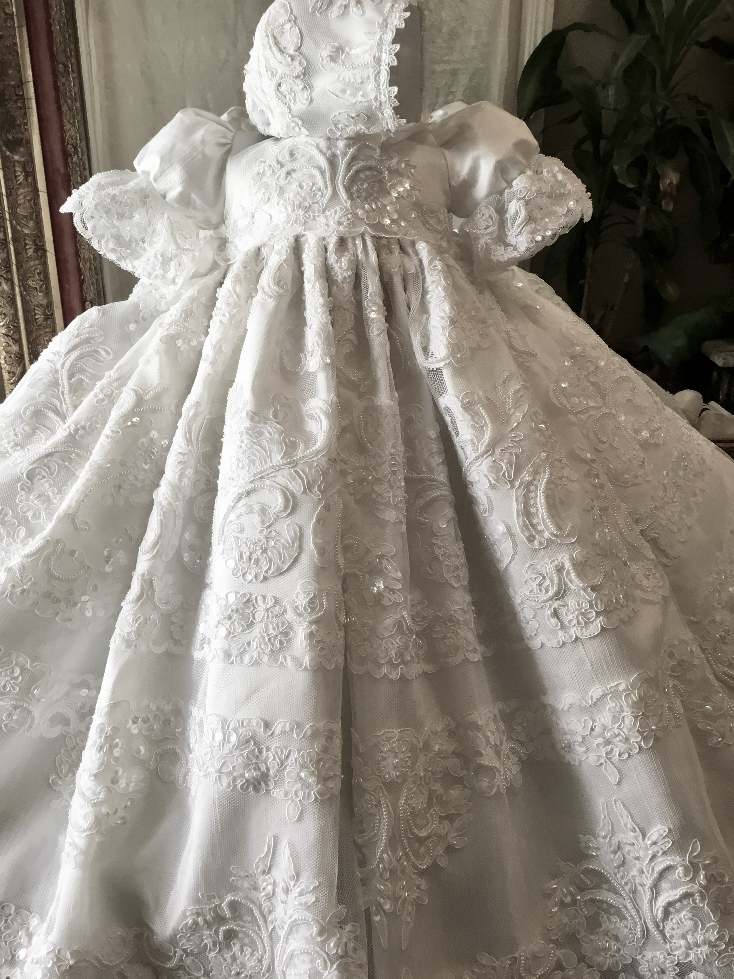 Annie is a luxurious, heirloom-quality silk christening gown featuring graceful bell sleeves and a delicate Venetian lace front panel. Fully lined with a petticoat for added fullness, it includes hand beading on the lace overlay and a piped neckline for durability and elegance. Made to order and handmade in California, this gown ensures a perfect fit and timeless beauty for your baby’s special day. Materials: • Silk Satin • Lace with hand beading • Tulle petticoat Dry clean only. Matching bonnet and accessories available, crafted with equal care.