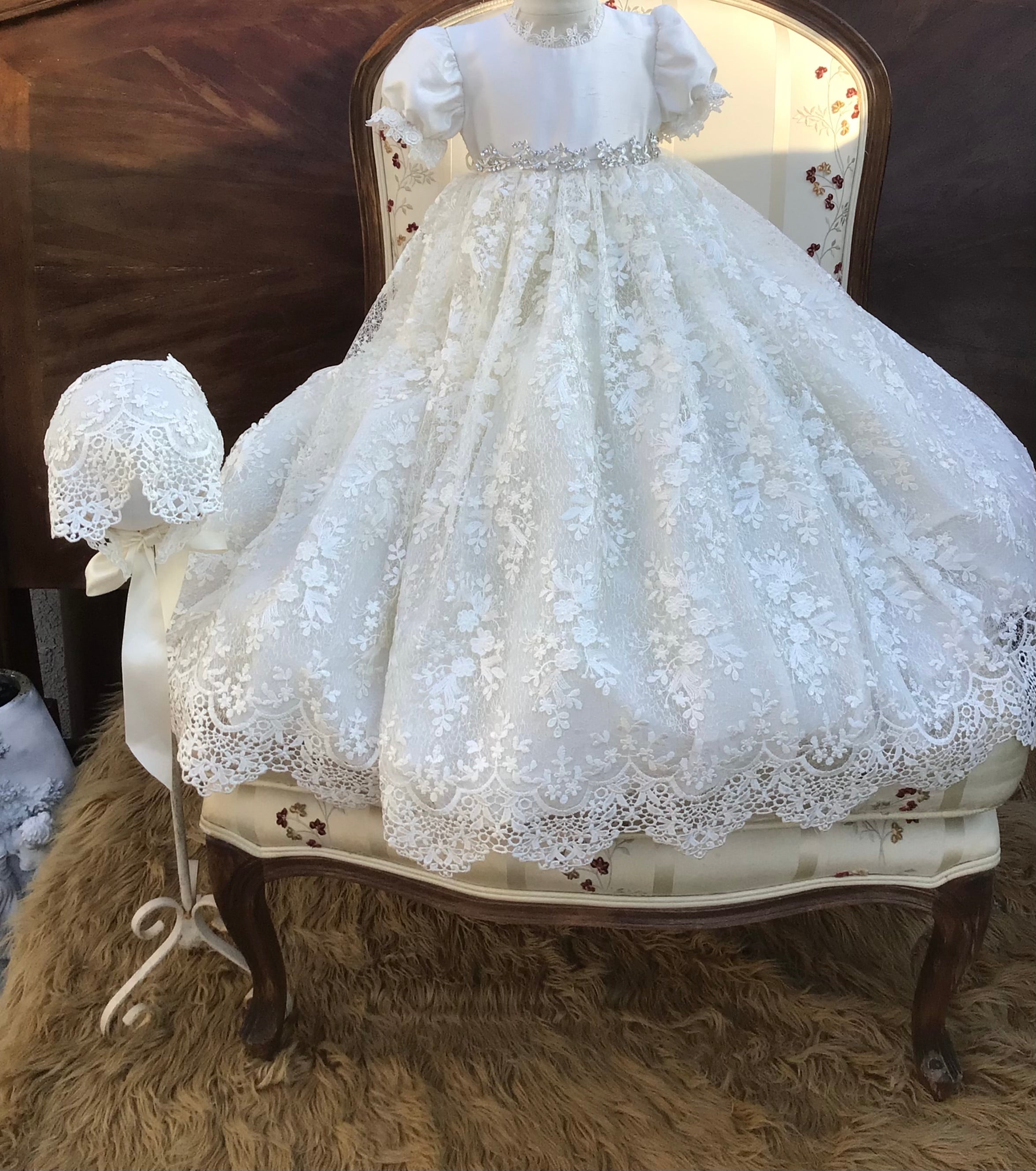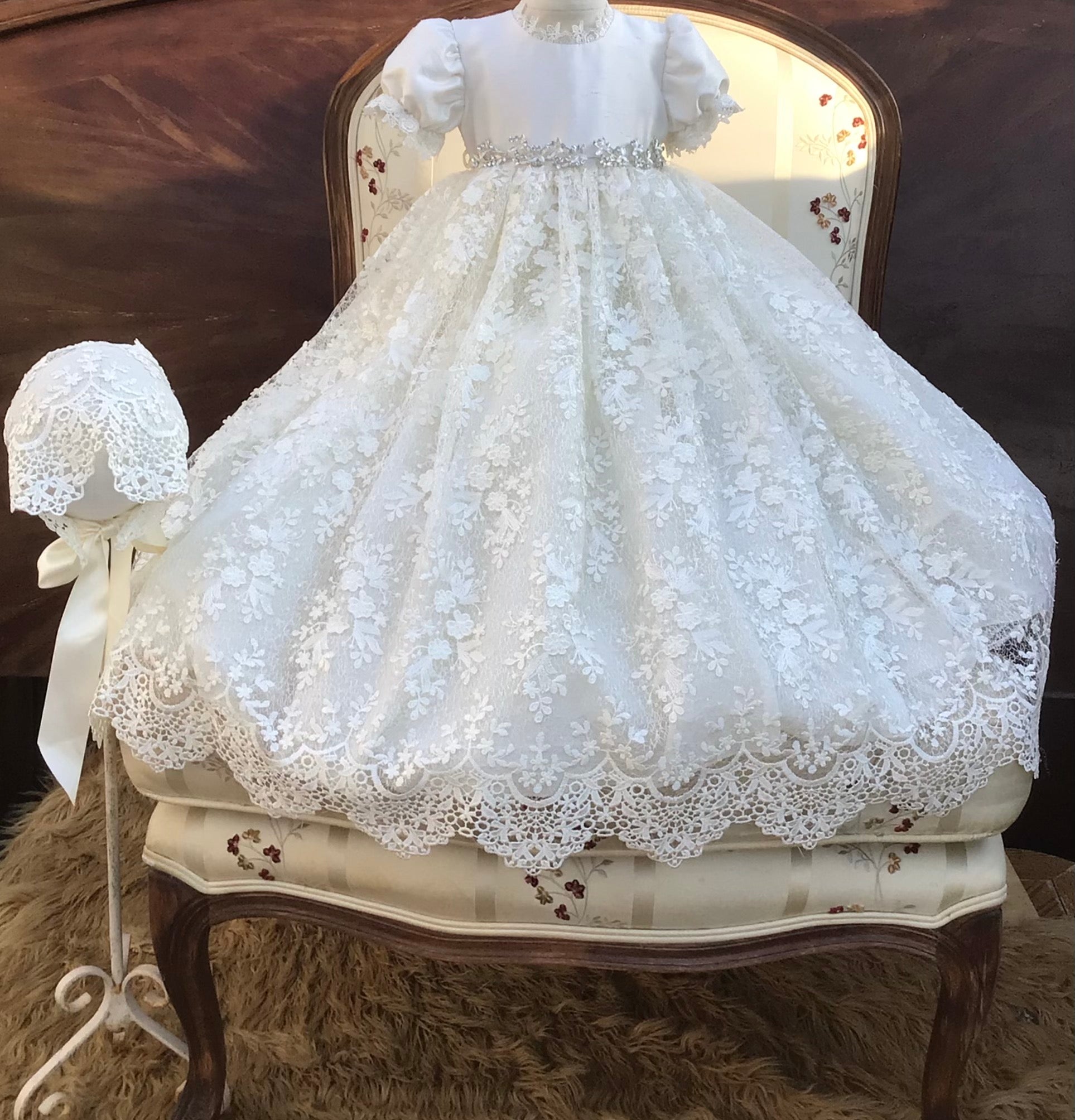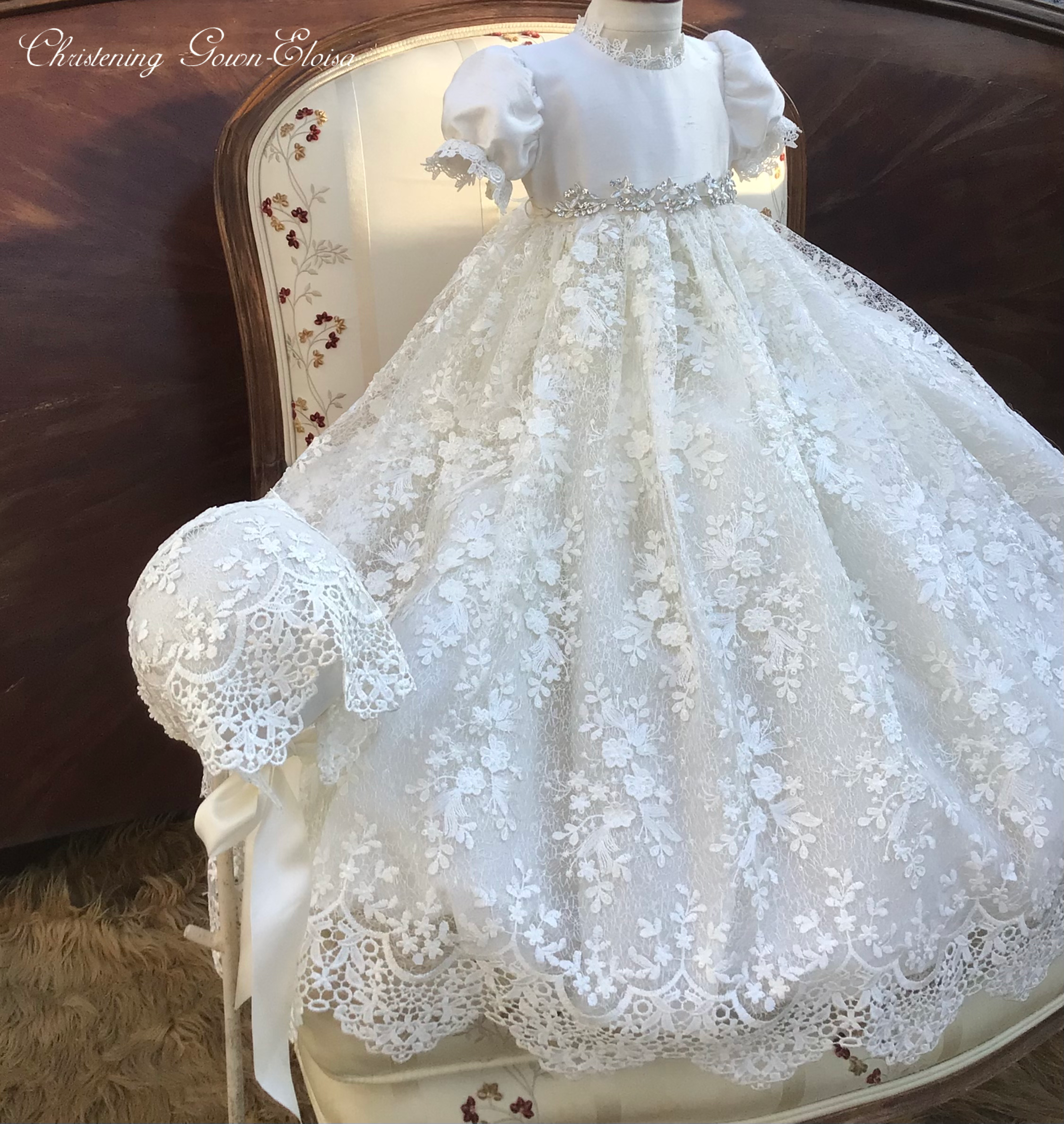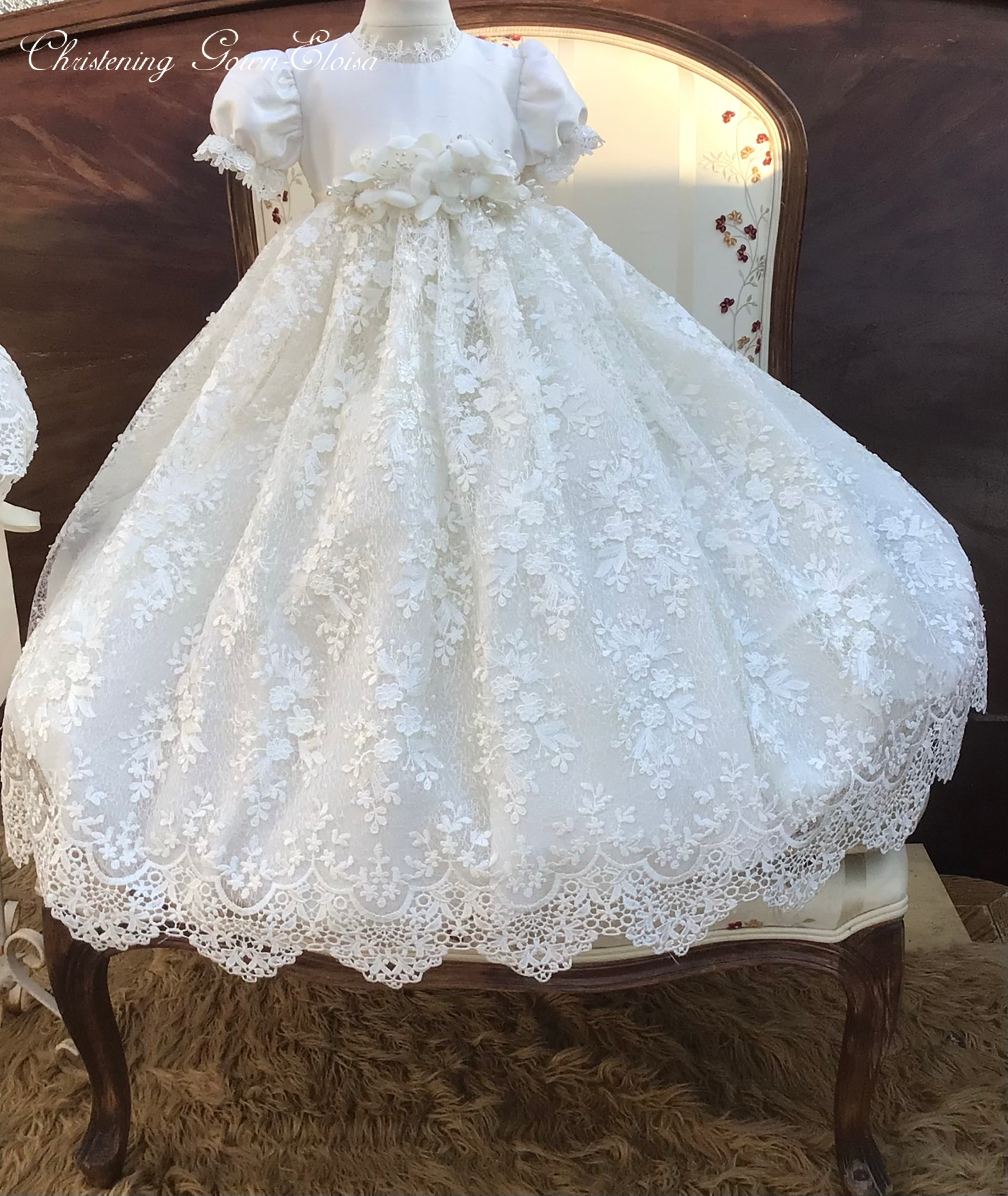 The Luisa christening gown offers heirloom-quality luxury with delicate embroidery, sequined 3D lace, and a silk bodice. Designed with puff sleeves, Venetian trim, and a satin ribbon at the waist, it is fully lined and seamless for your baby's comfort. The gown is 32 inches long and 90 inches wide, featuring an attached petticoat for signature fullness. Fabrics and materials: - Embroidered sequined 3D lace - Silk bodice - Venetian trim - Full lining - Petticoat Handmade in the USA, this gown is perfect for a baptism day filled with elegance. Accessories are sold separately to complete the look.