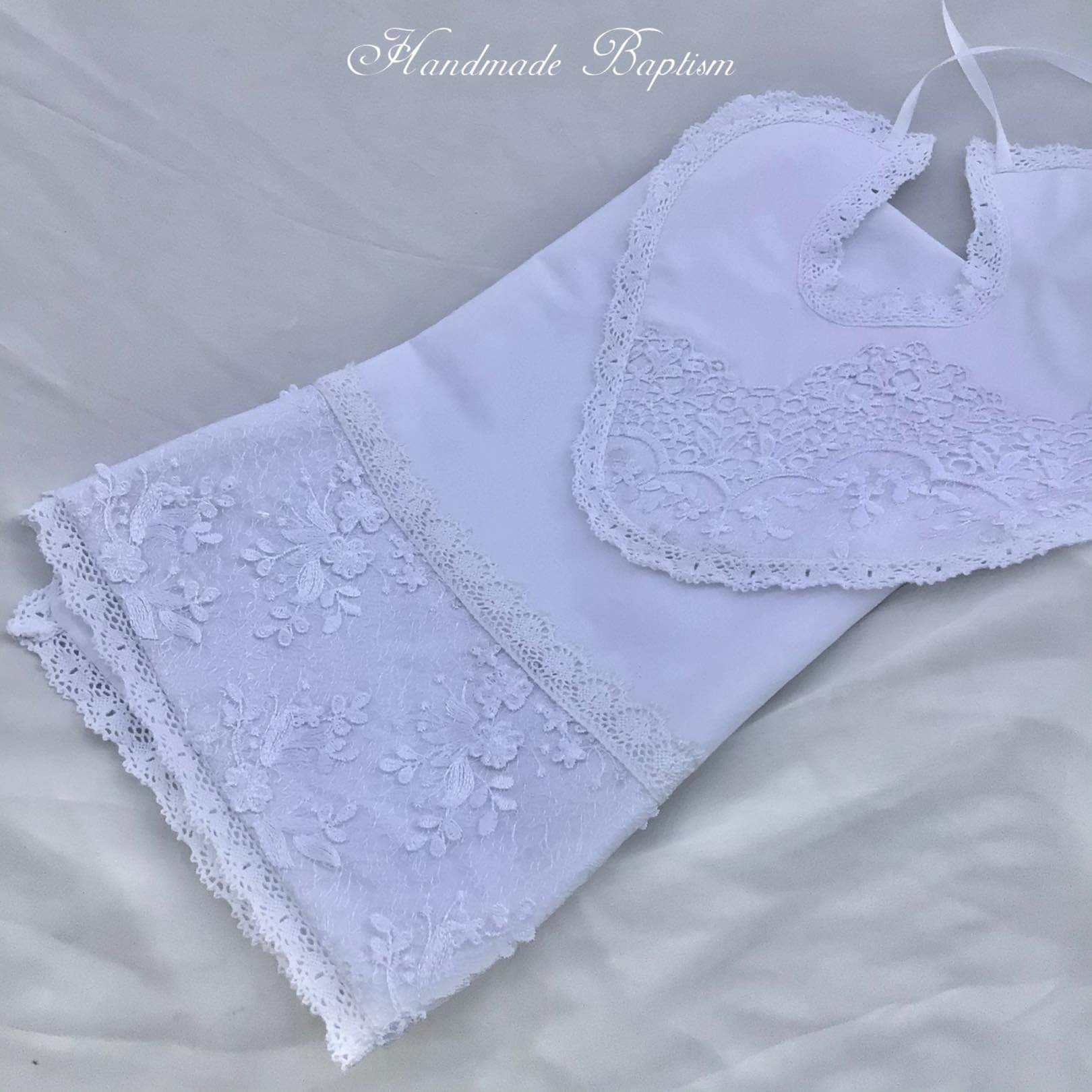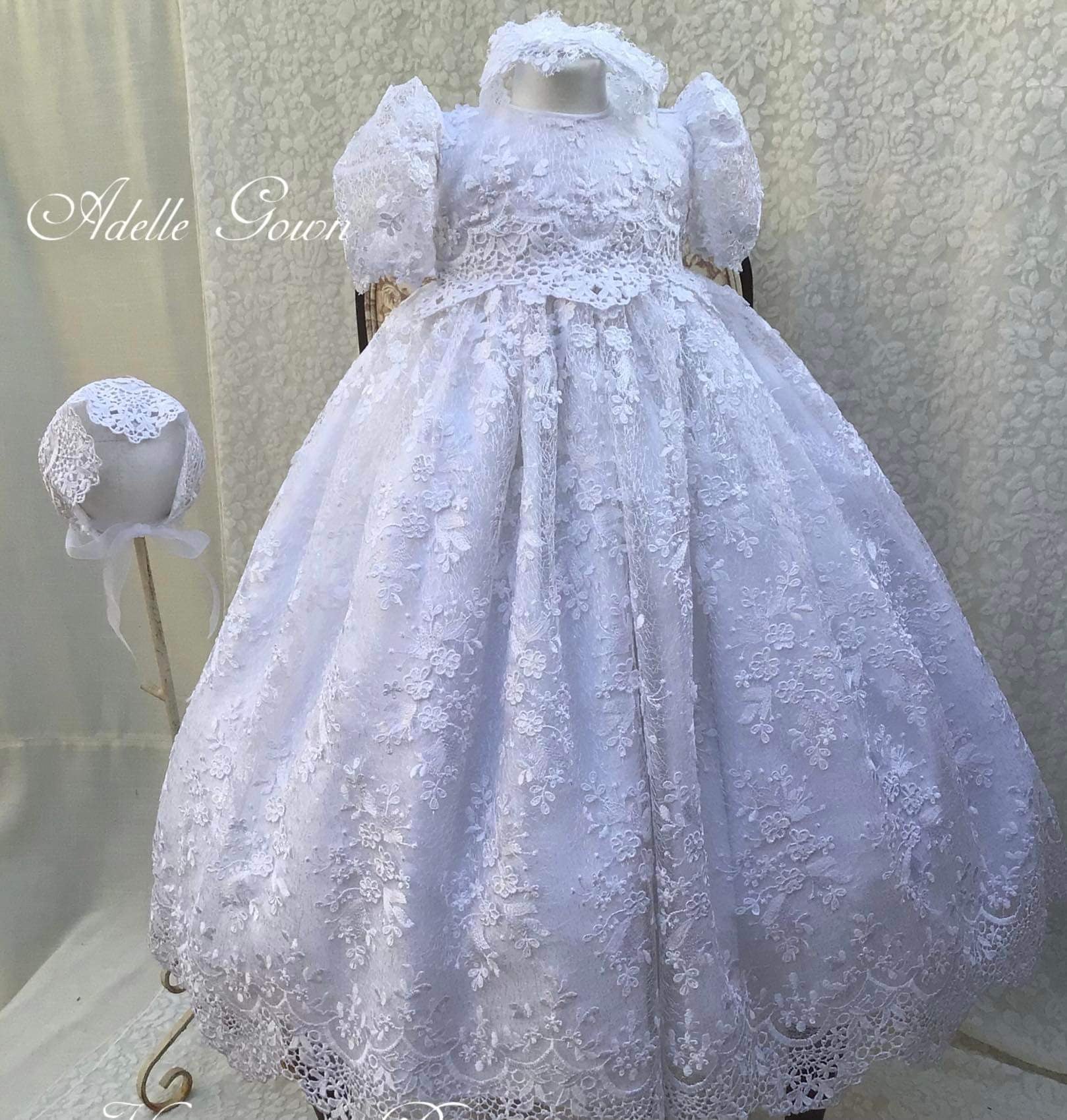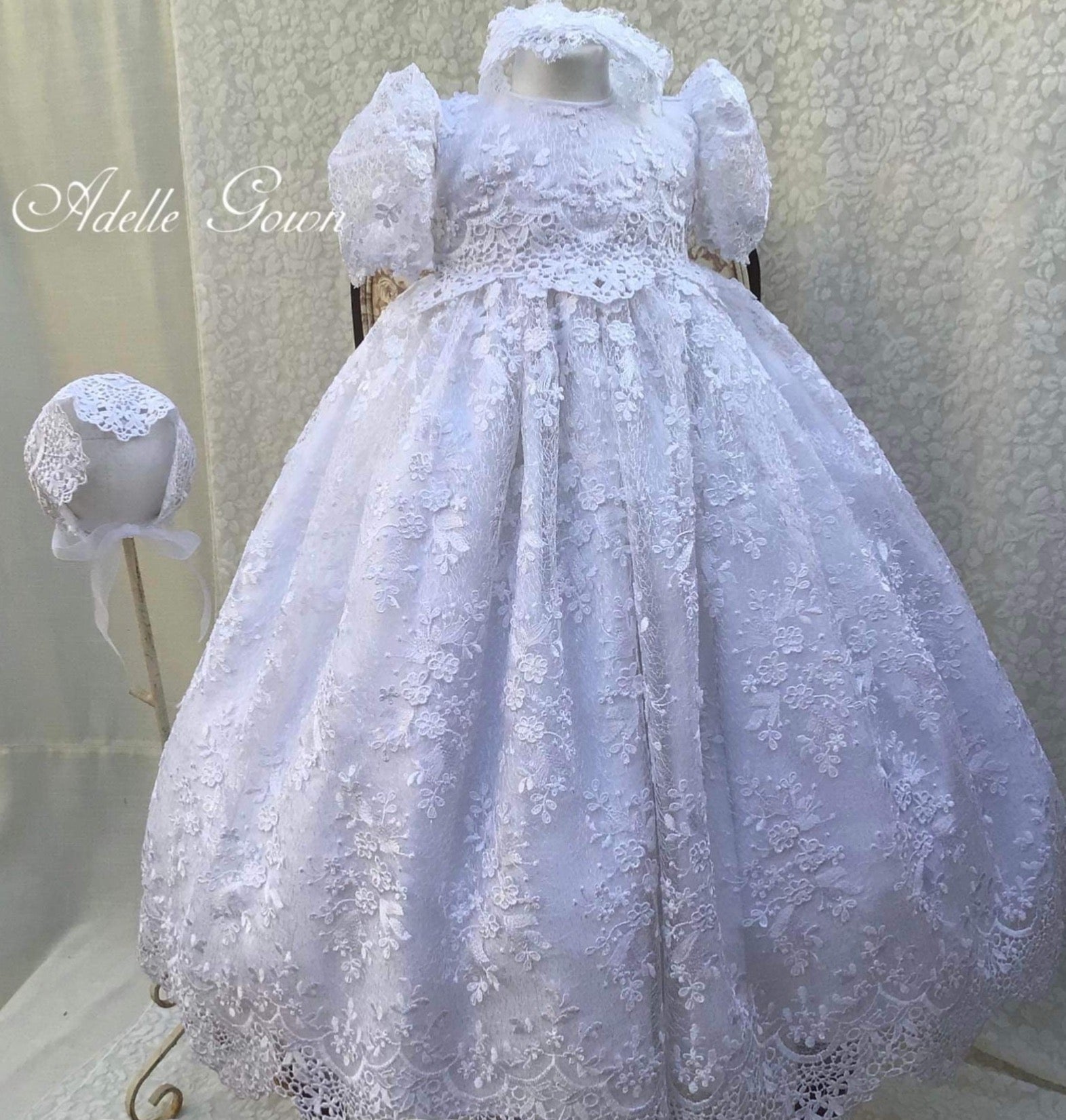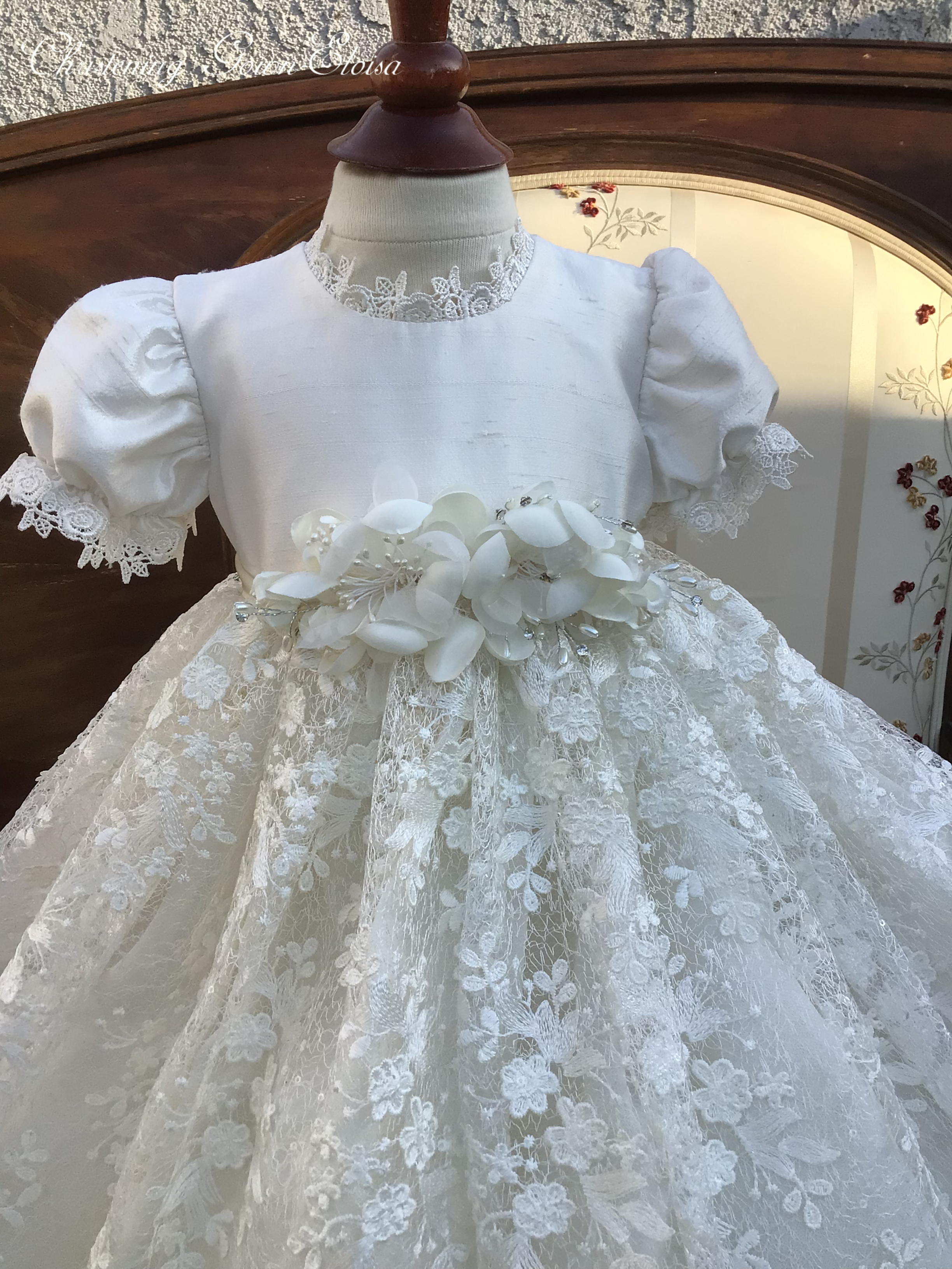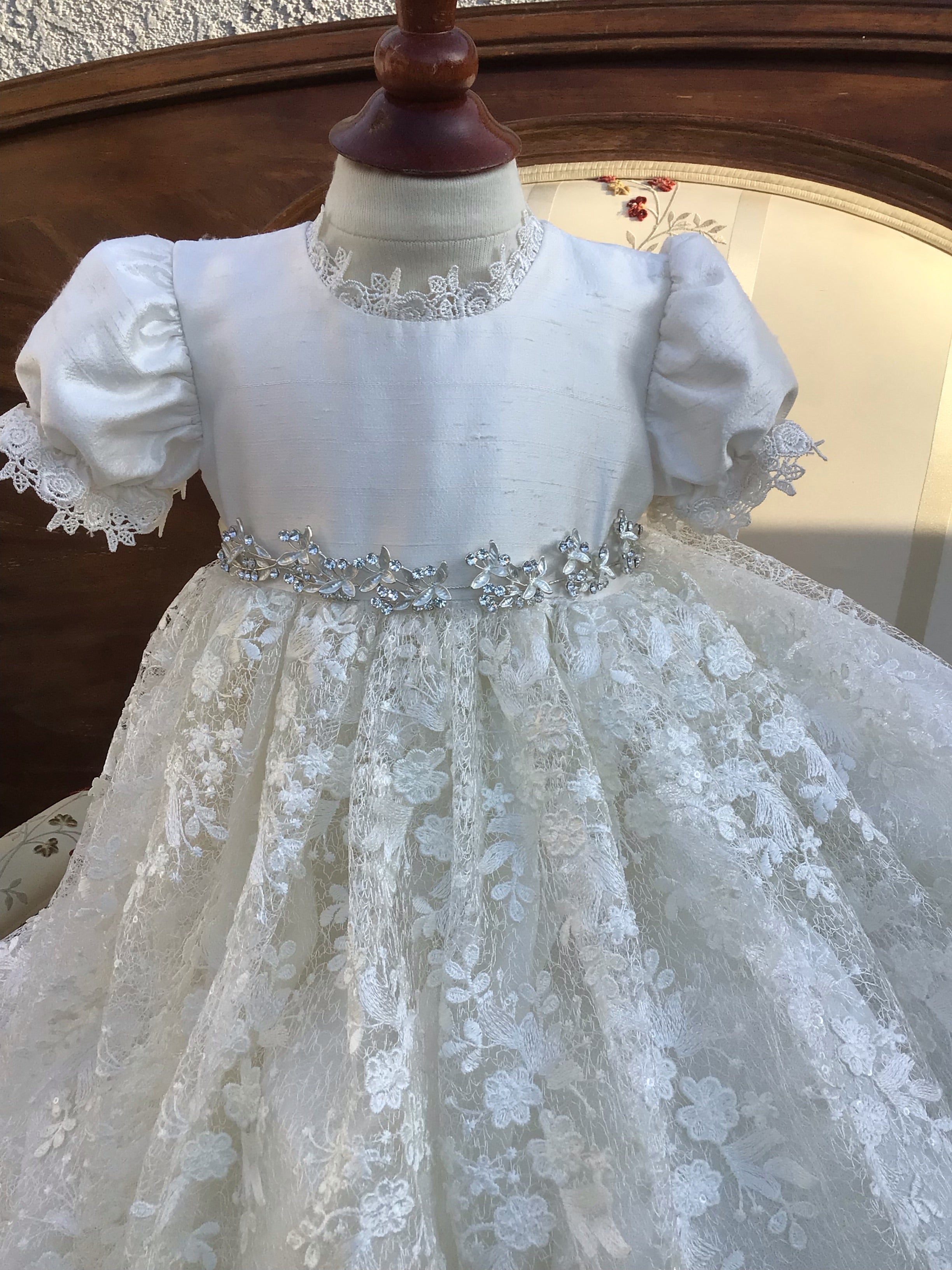 The Luisa christening gown offers heirloom-quality luxury with delicate embroidery, sequined 3D lace, and a silk bodice. Designed with puff sleeves, Venetian trim, and a satin ribbon at the waist, it is fully lined and seamless for your baby's comfort. The gown is 32 inches long and 90 inches wide, featuring an attached petticoat for signature fullness. Fabrics and materials: - Embroidered sequined 3D lace - Silk bodice - Venetian trim - Full lining - Petticoat Handmade in the USA, this gown is perfect for a baptism day filled with elegance. Accessories are sold separately to complete the look.