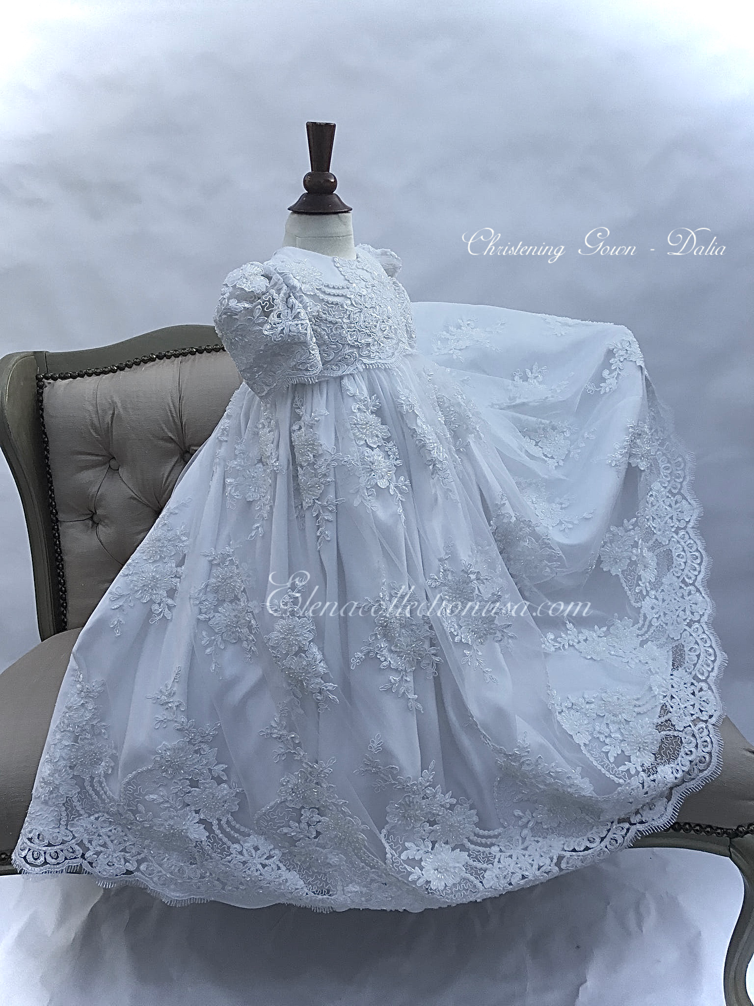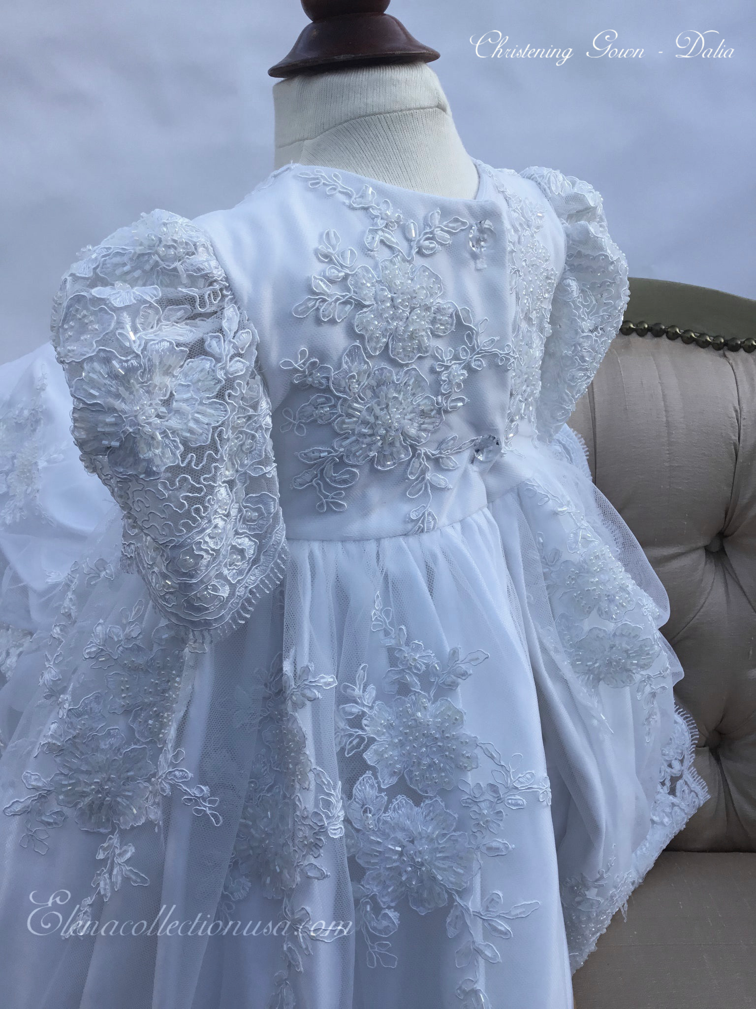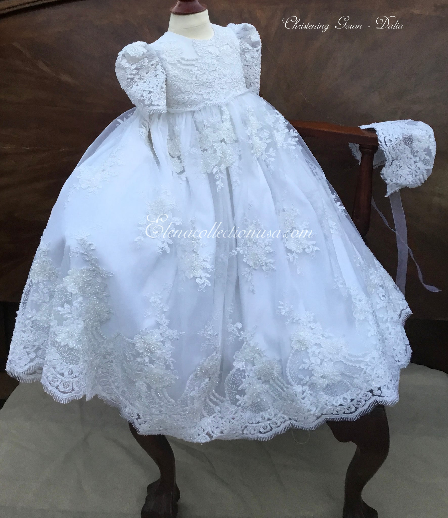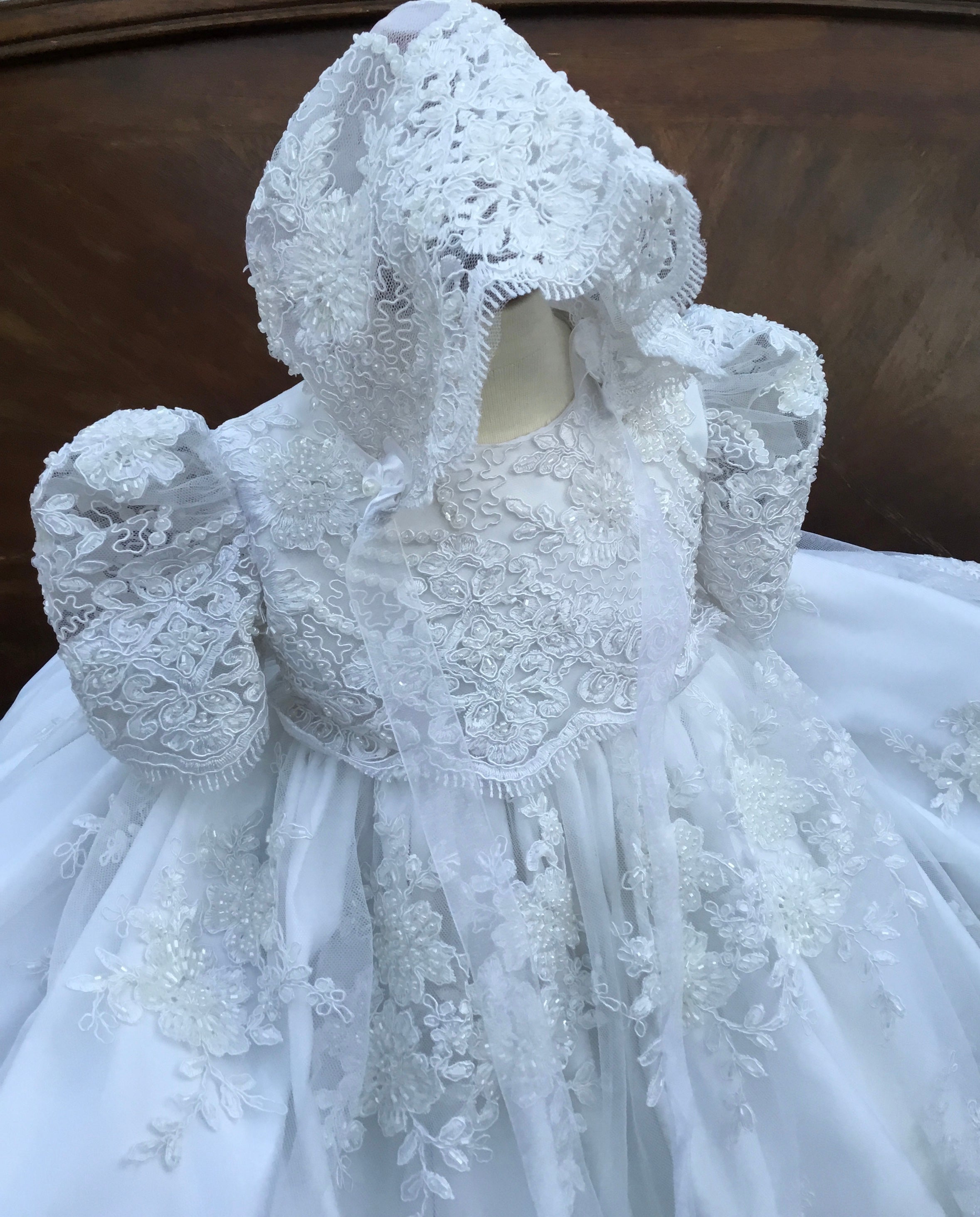 Dalia is an exquisite handcrafted christening gown in antique white, designed for both boys and girls. It features intricate beaded lace appliqués, puffed lace sleeves, and a delicate matching bonnet. This heirloom piece is fully lined for comfort and made to order in the USA, perfect for baptisms, blessings, and special portraits. Fabrics used: - Soft tulle - Organza layers Each gown is tailored with care to offer timeless elegance and luxurious craftsmanship, destined to be treasured across generations.