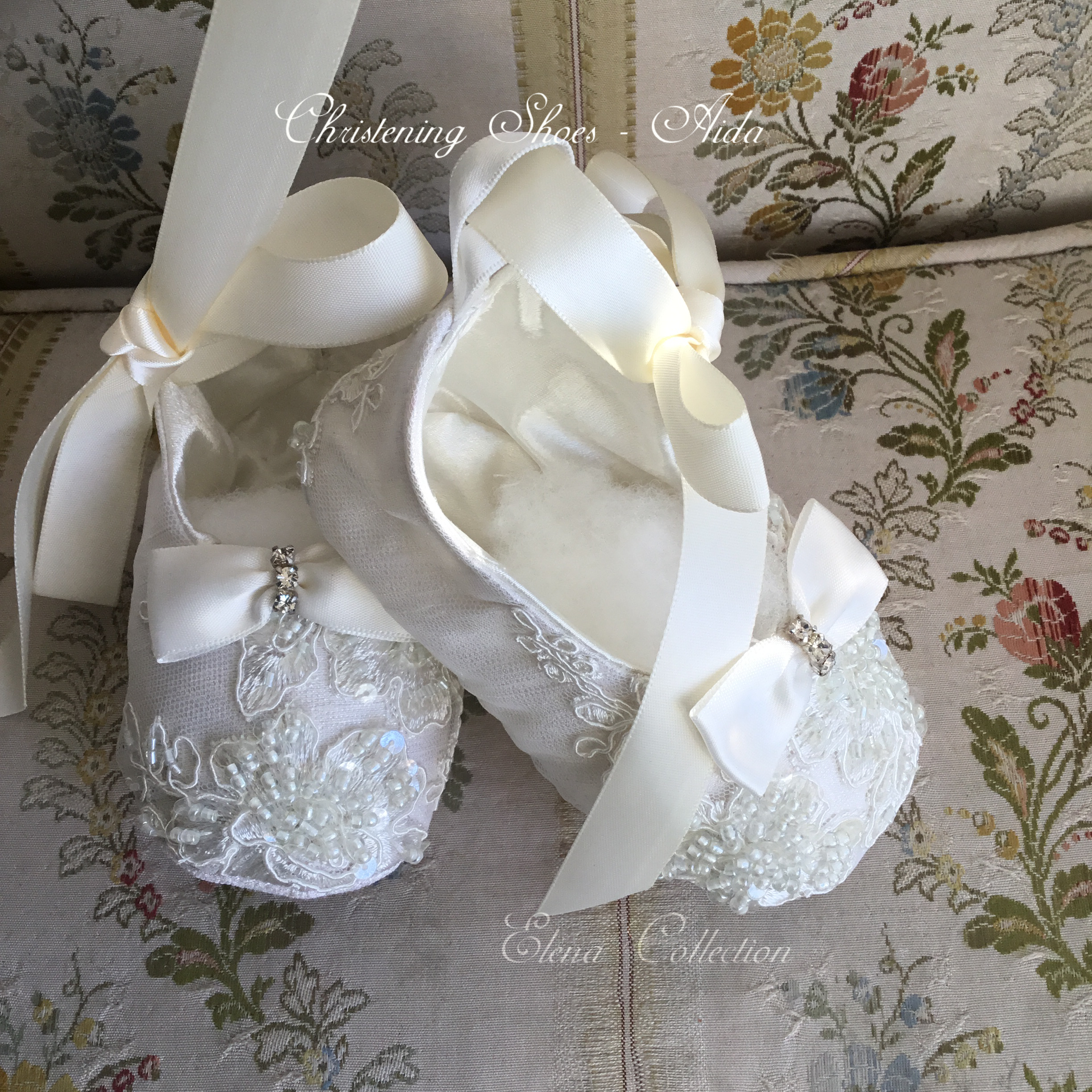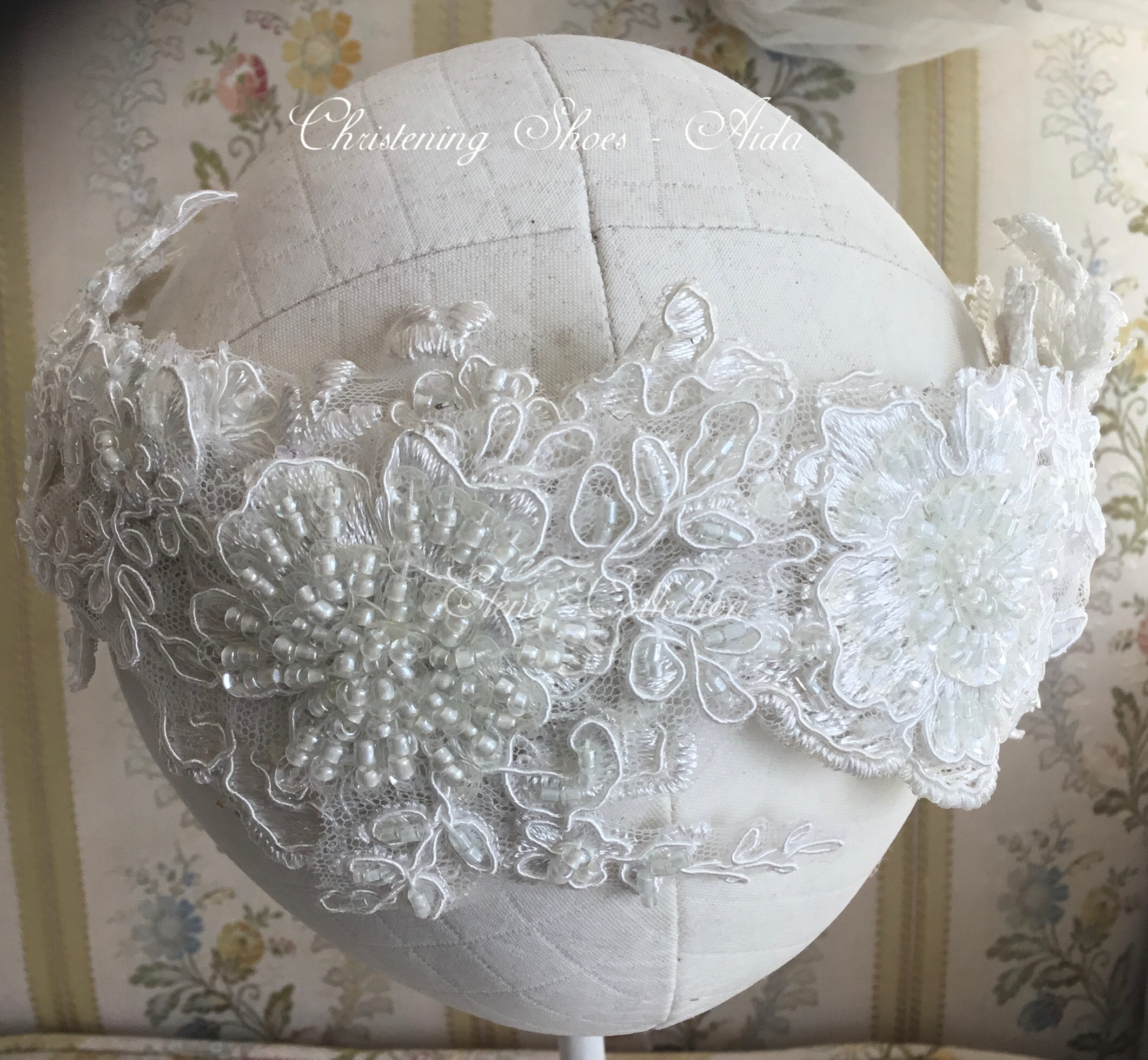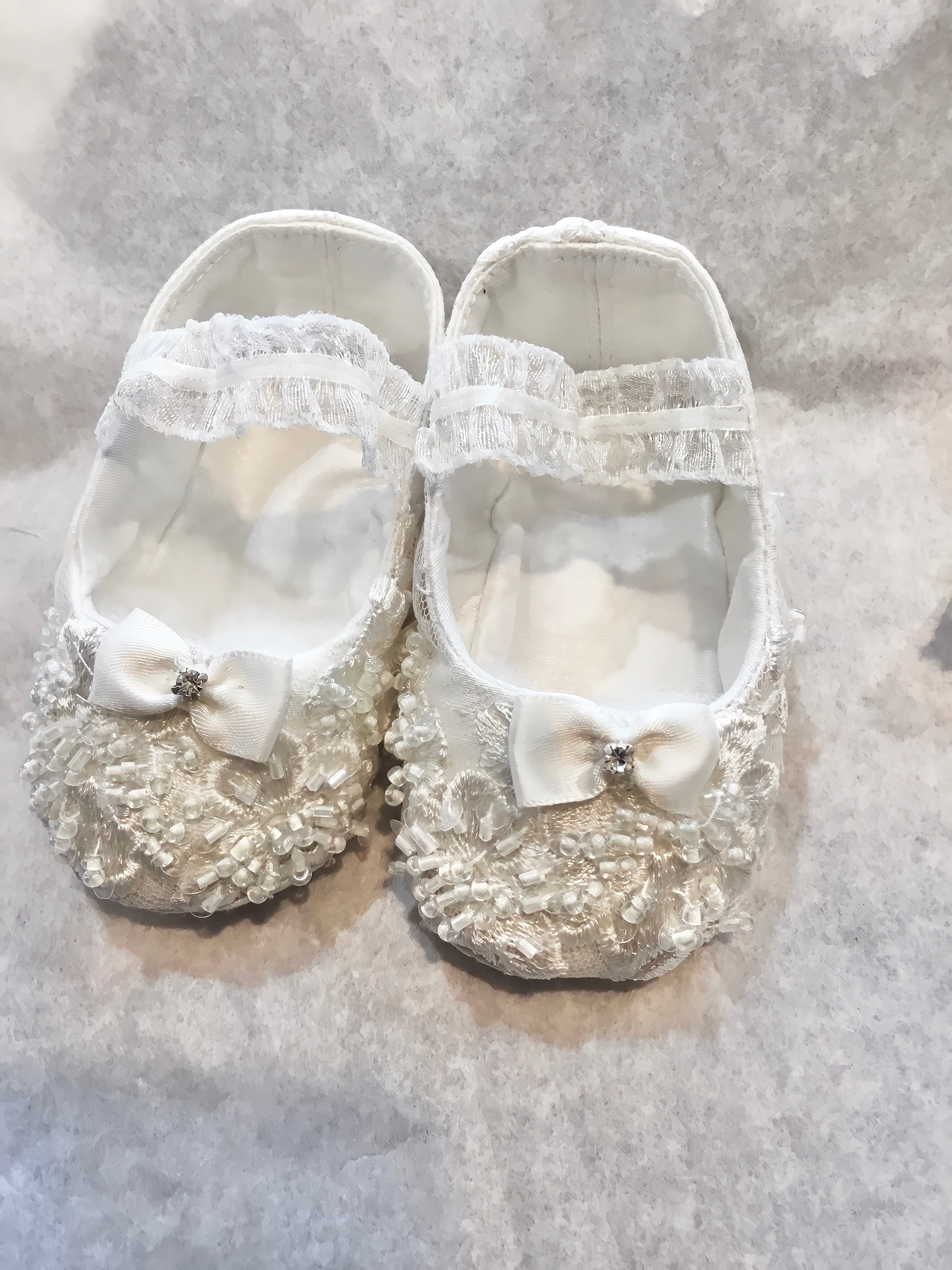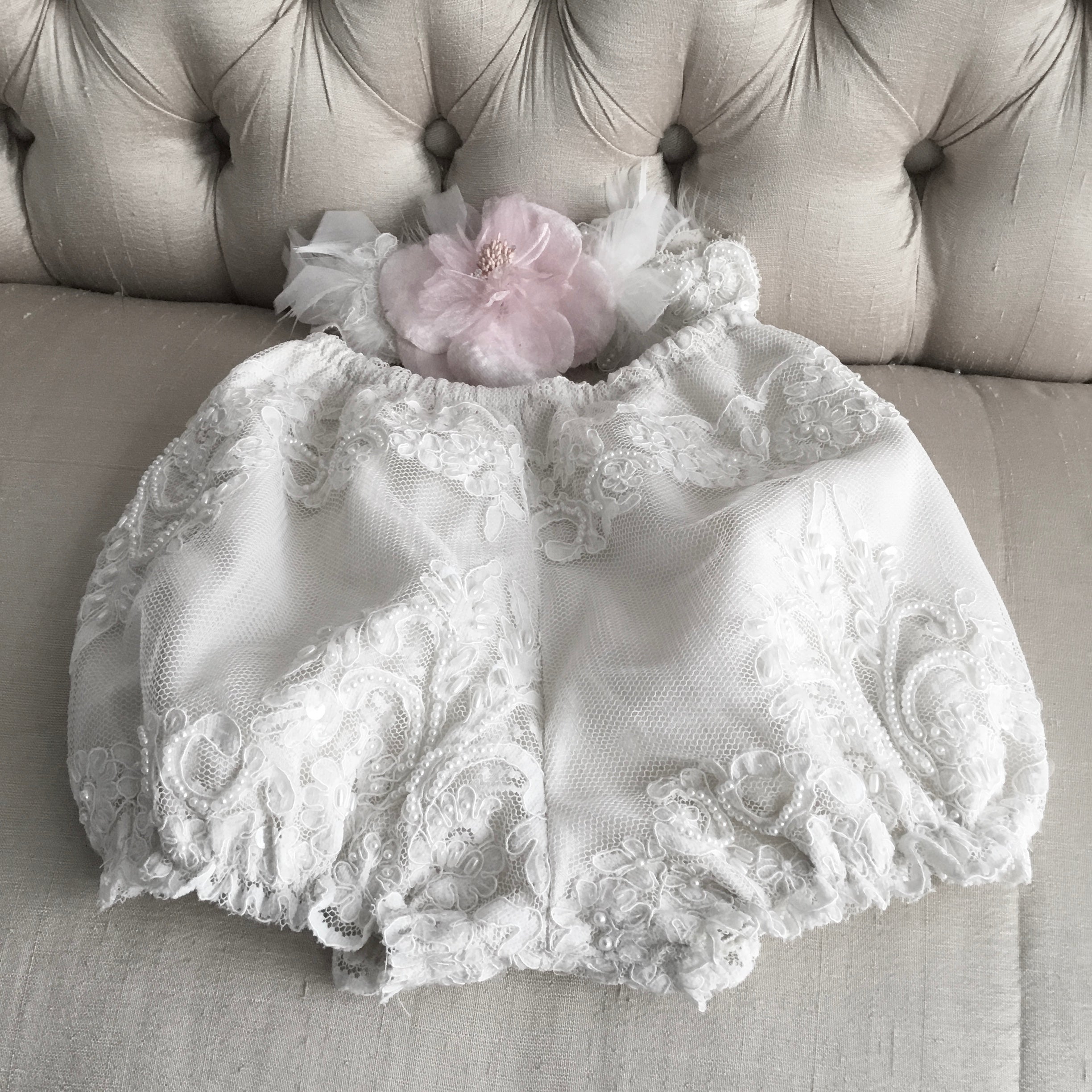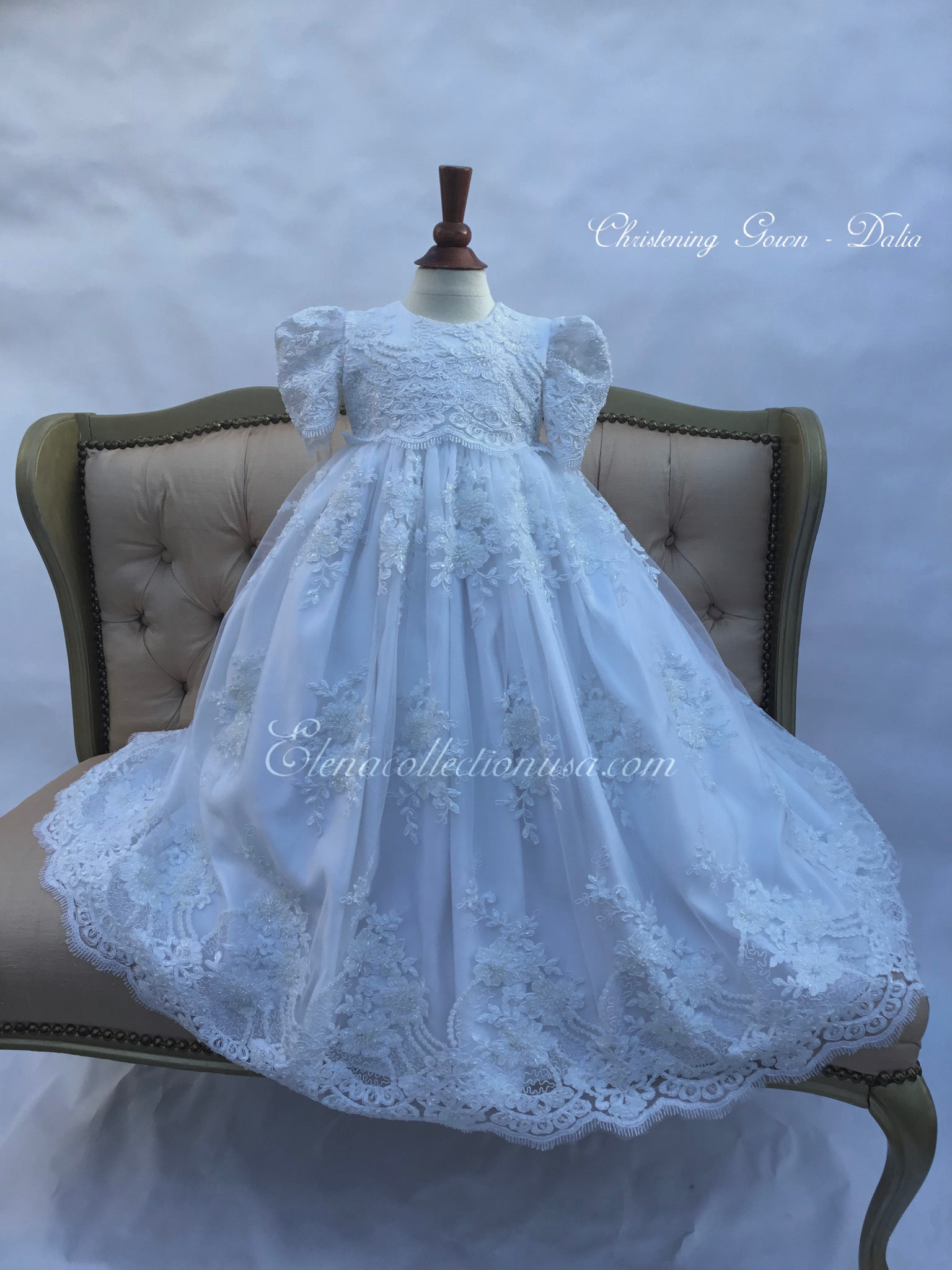 Dalia is an exquisite handcrafted christening gown in antique white, designed for both boys and girls. It features intricate beaded lace appliqués, puffed lace sleeves, and a delicate matching bonnet. This heirloom piece is fully lined for comfort and made to order in the USA, perfect for baptisms, blessings, and special portraits. Fabrics used: - Soft tulle - Organza layers Each gown is tailored with care to offer timeless elegance and luxurious craftsmanship, destined to be treasured across generations.