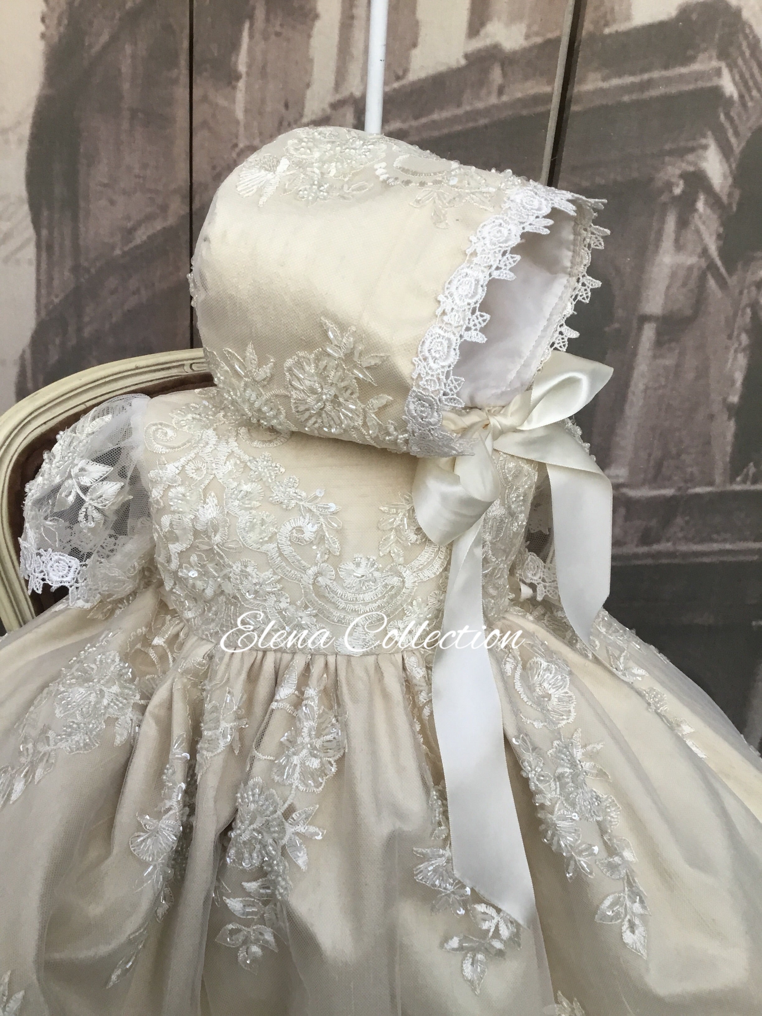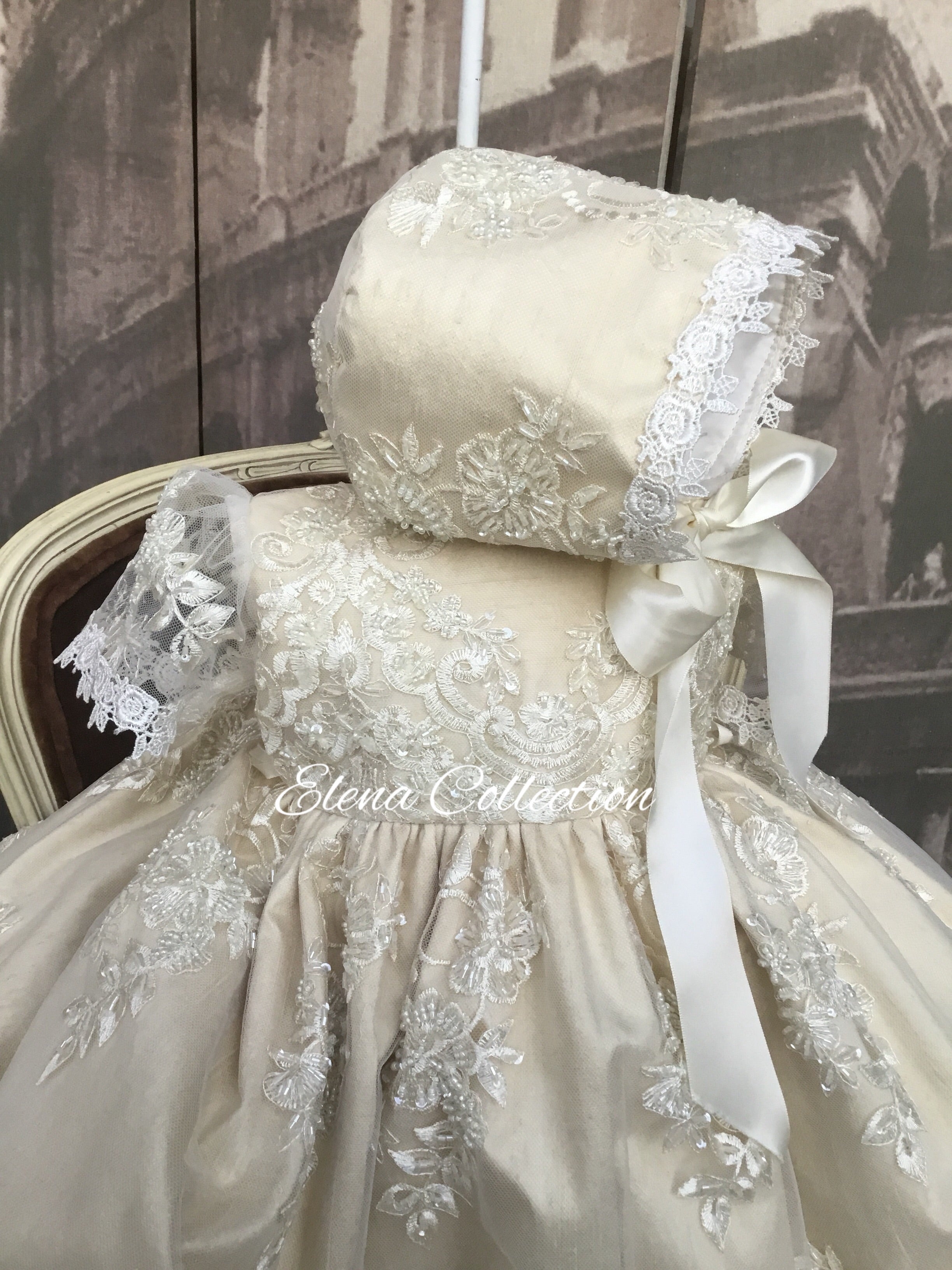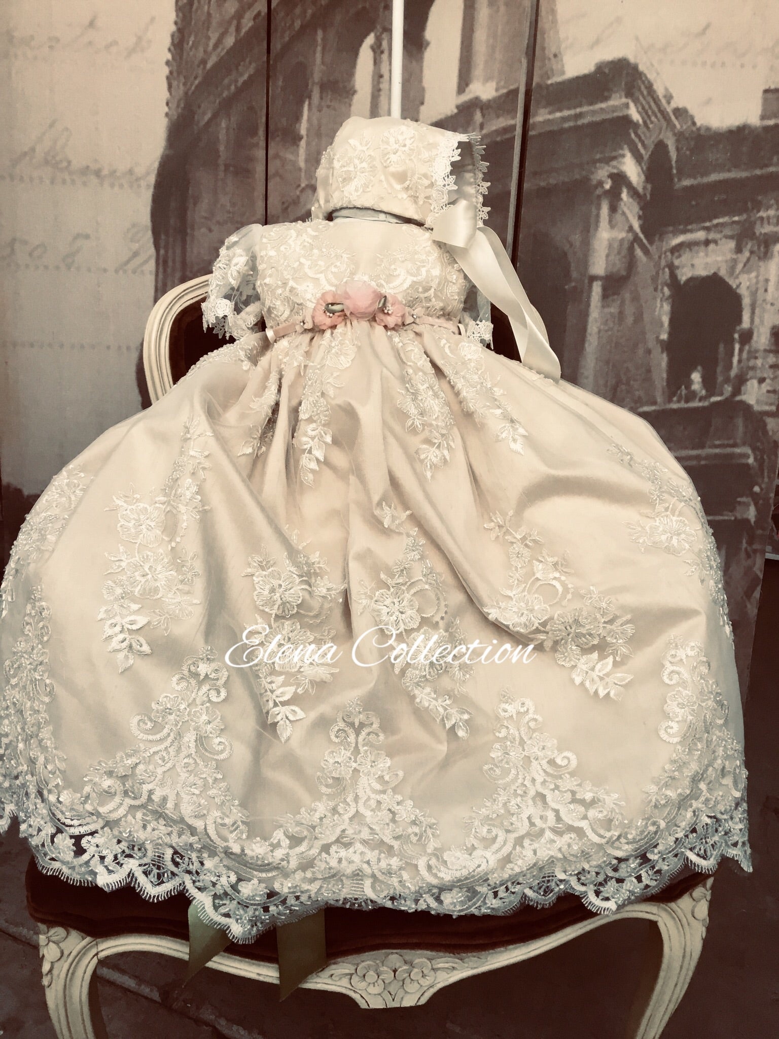 Joelene is a luxurious hand-beaded lace baptism gown with a matching bonnet, featuring sheer lace sleeves and a full, lined skirt with added petticoat for volume. Each gown is handmade to ensure exceptional craftsmanship and timeless elegance, perfect for passing down through generations. Fabrics used: - Hand-beaded lace - Sheer lace sleeves - Fully lined skirt - Petticoat for added fullness Complete the look with matching accessories like lace shoes, bib, headband, candle set, or silk blanket.