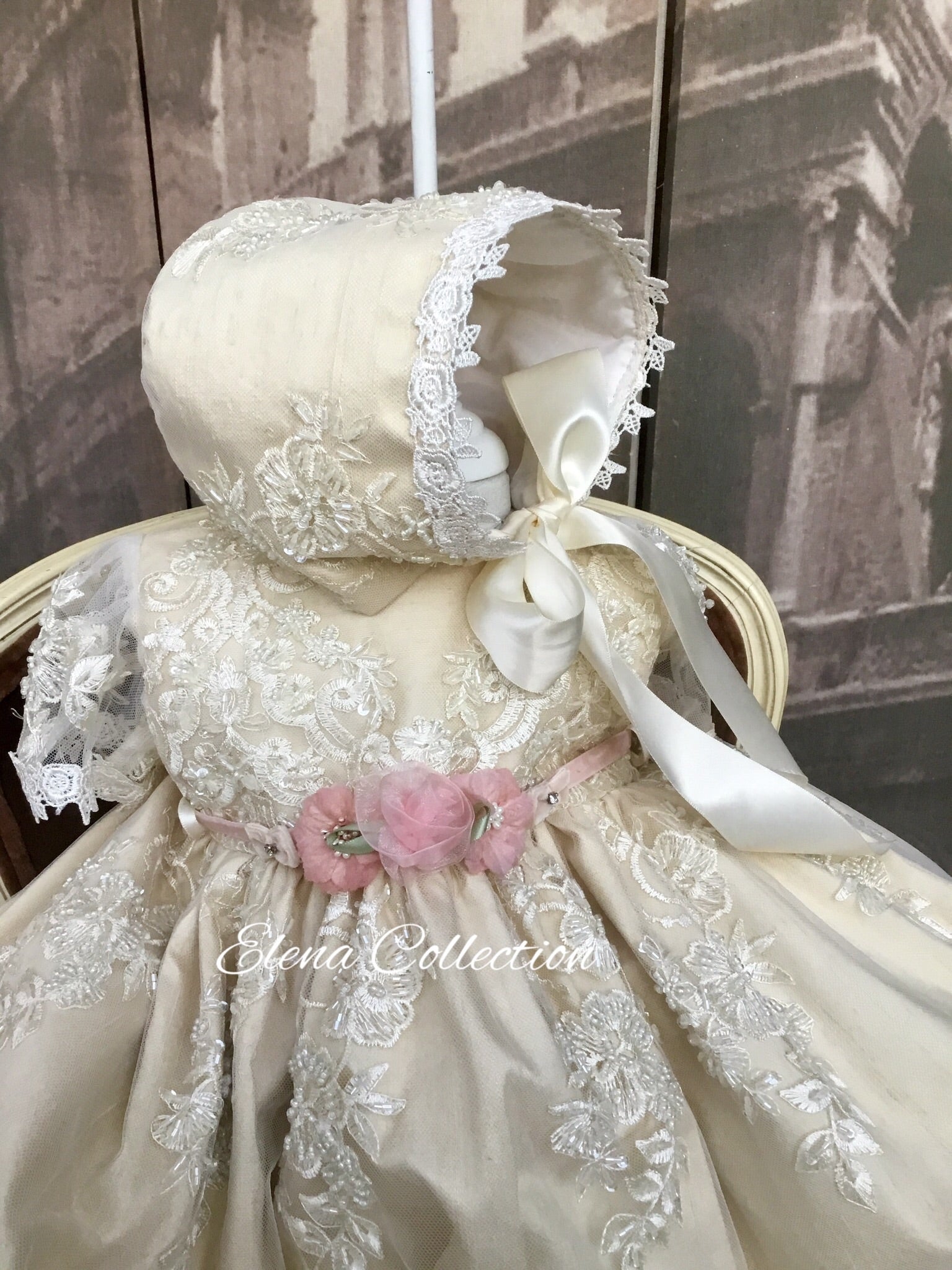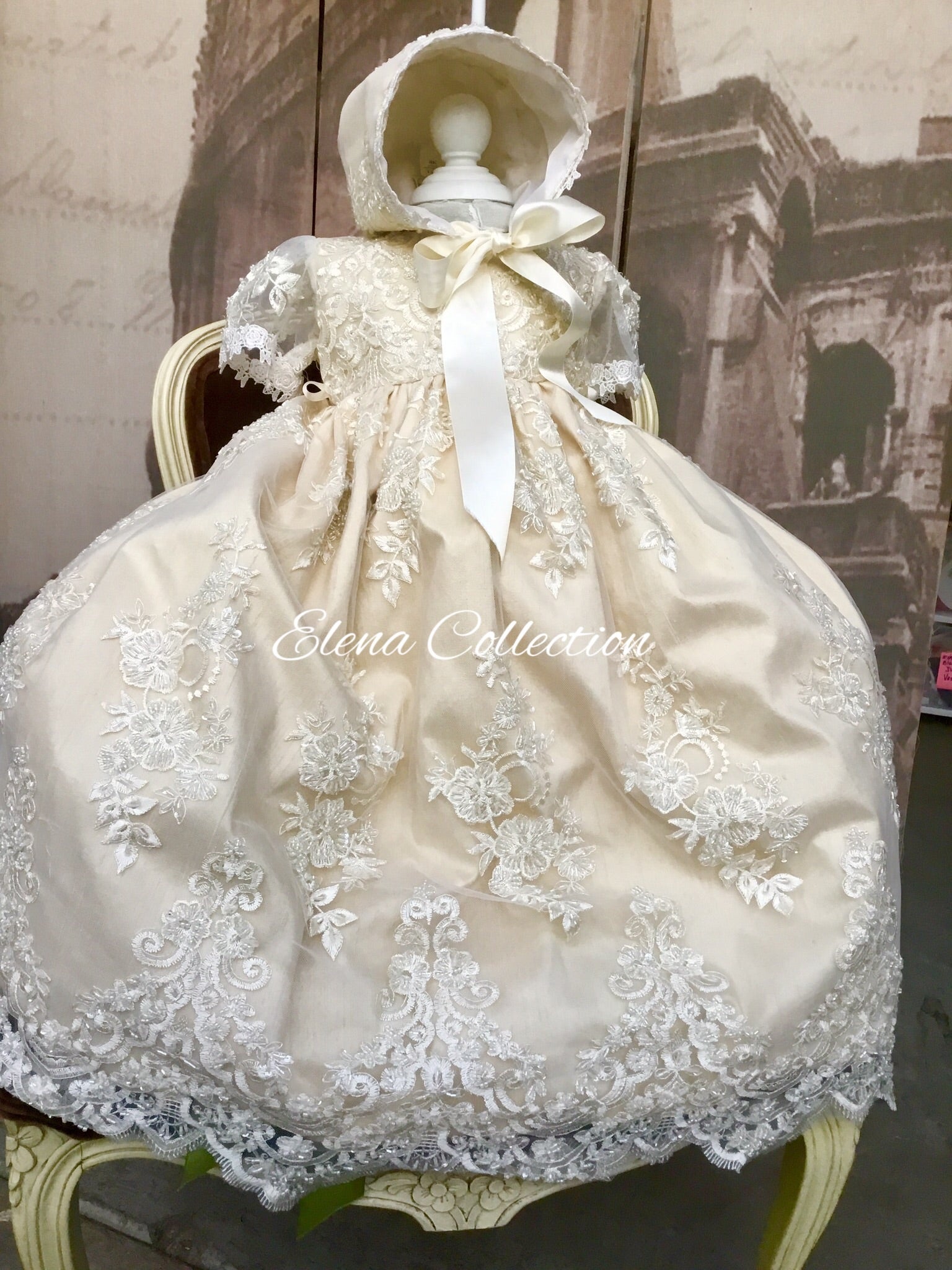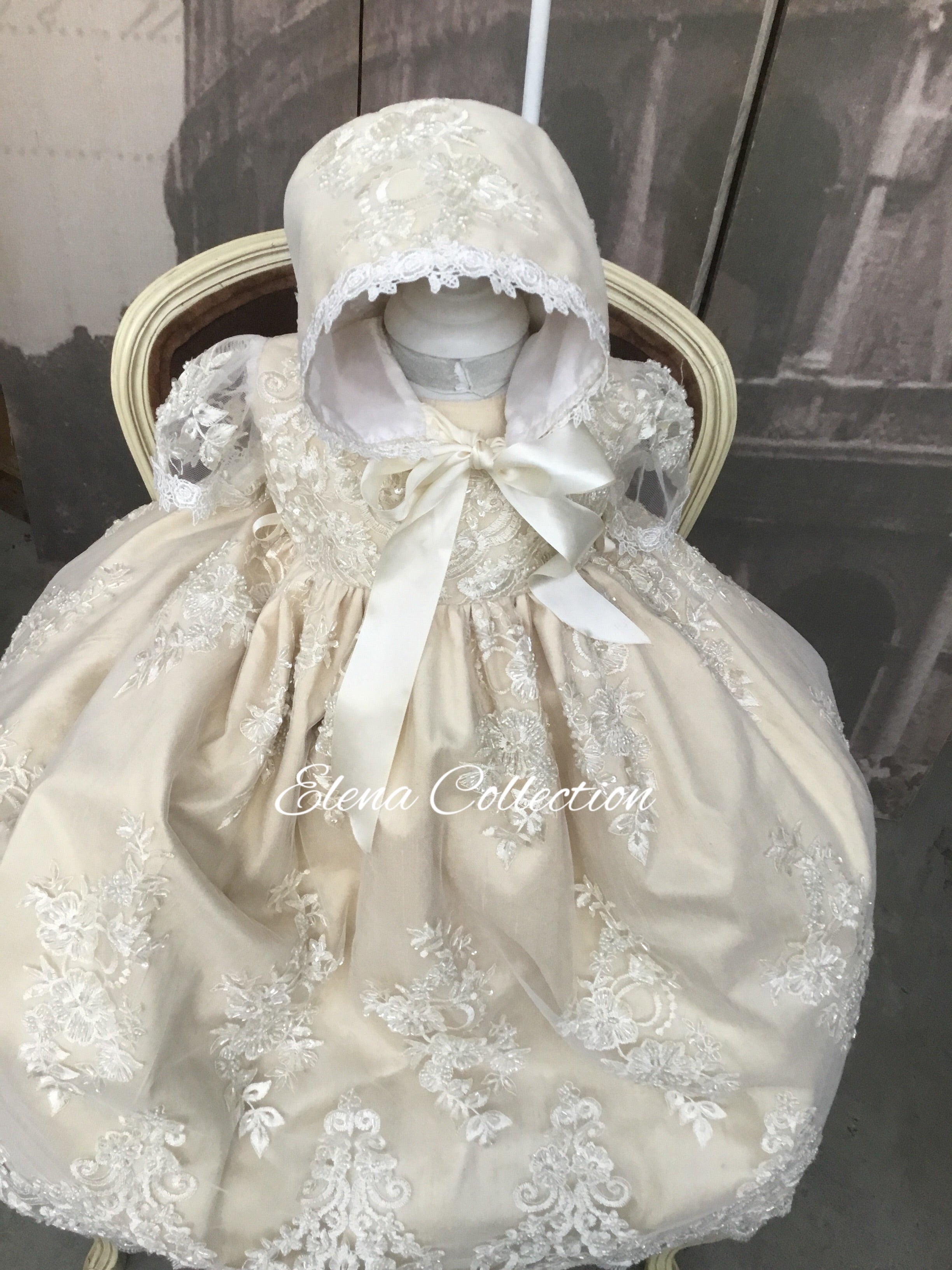 Joelene is a luxurious hand-beaded lace baptism gown with a matching bonnet, featuring sheer lace sleeves and a full, lined skirt with added petticoat for volume. Each gown is handmade to ensure exceptional craftsmanship and timeless elegance, perfect for passing down through generations. Fabrics used: - Hand-beaded lace - Sheer lace sleeves - Fully lined skirt - Petticoat for added fullness Complete the look with matching accessories like lace shoes, bib, headband, candle set, or silk blanket.