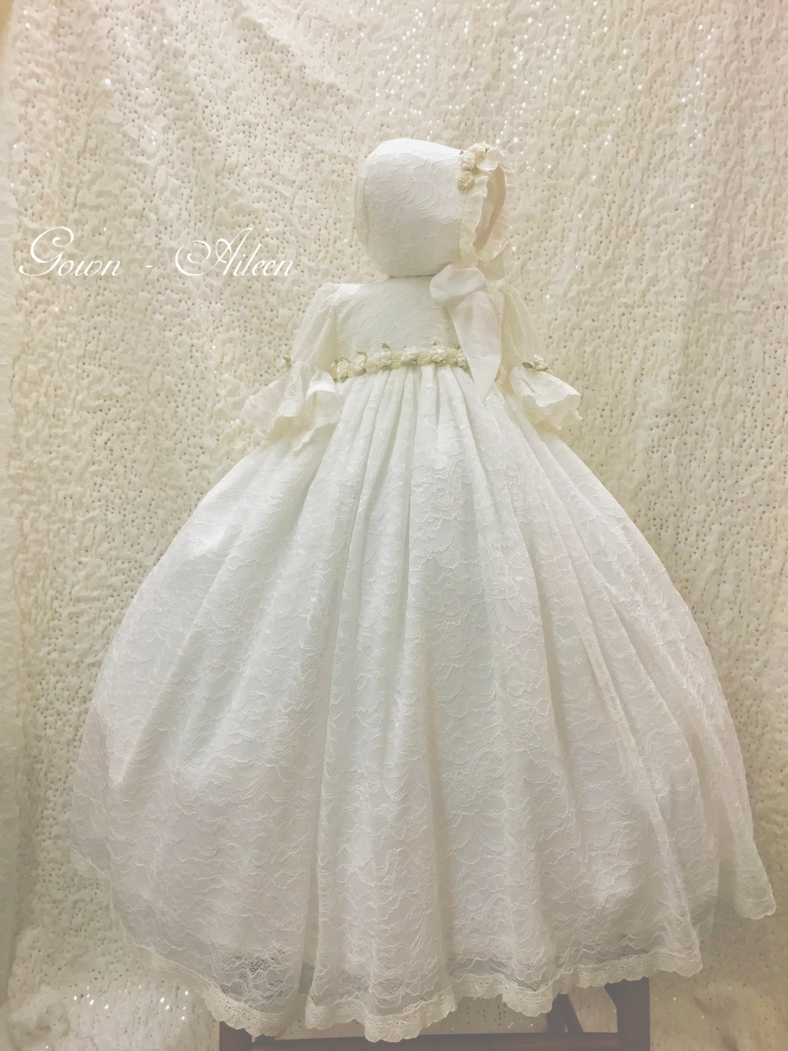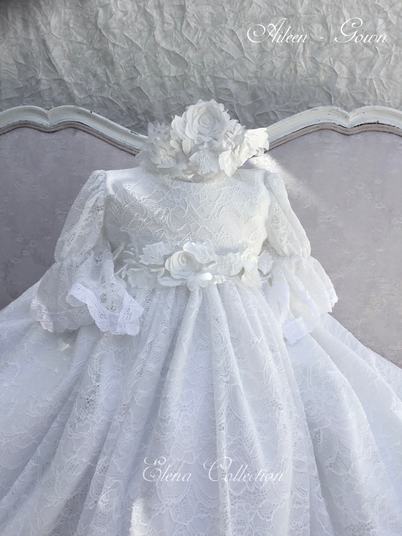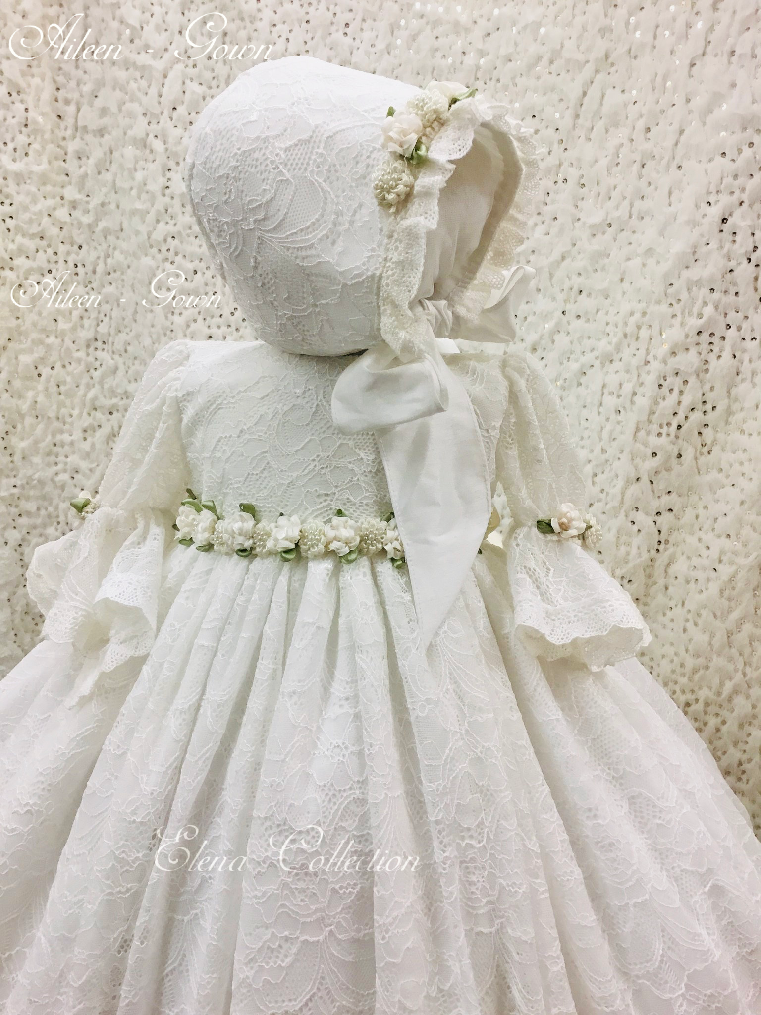 Aileen is a traditional christening gown, handmade baptism gown featuring a delicate corded lace with cotton trim and long sheer bell sleeves. The gown is an open back is secured with two hand sewn buttons, adorned with hand made silk flowers on the bonnet pearl beads, and intricate lace for an elegant finish. This quality traditional outfit includes a matching bonnet and is lined with 100% pure cotton for comfort. Perfectly crafted for a special baptism day, it is made to order and ships worldwide from California. Fabrics and materials: - Satin - Lace - Tulle - Cotton trim - Pure cotton lining