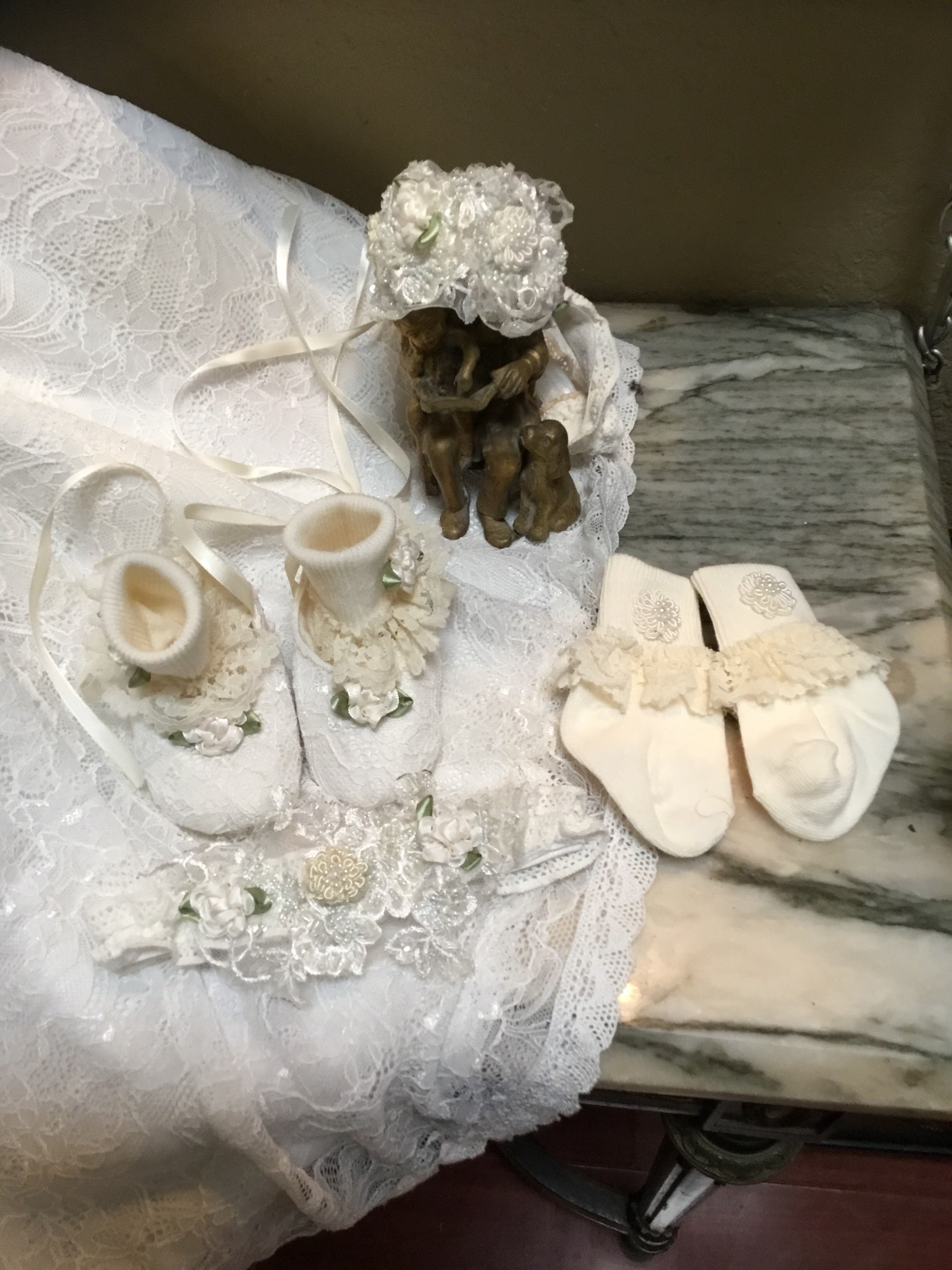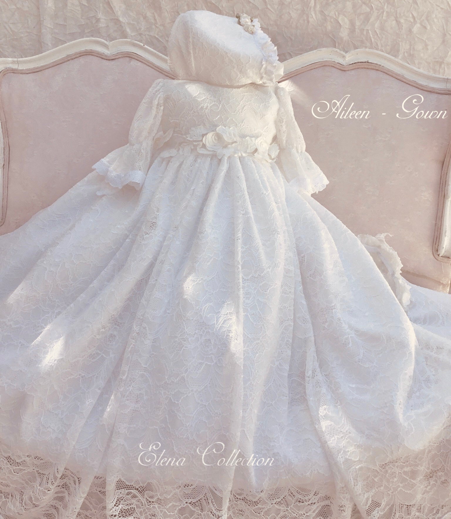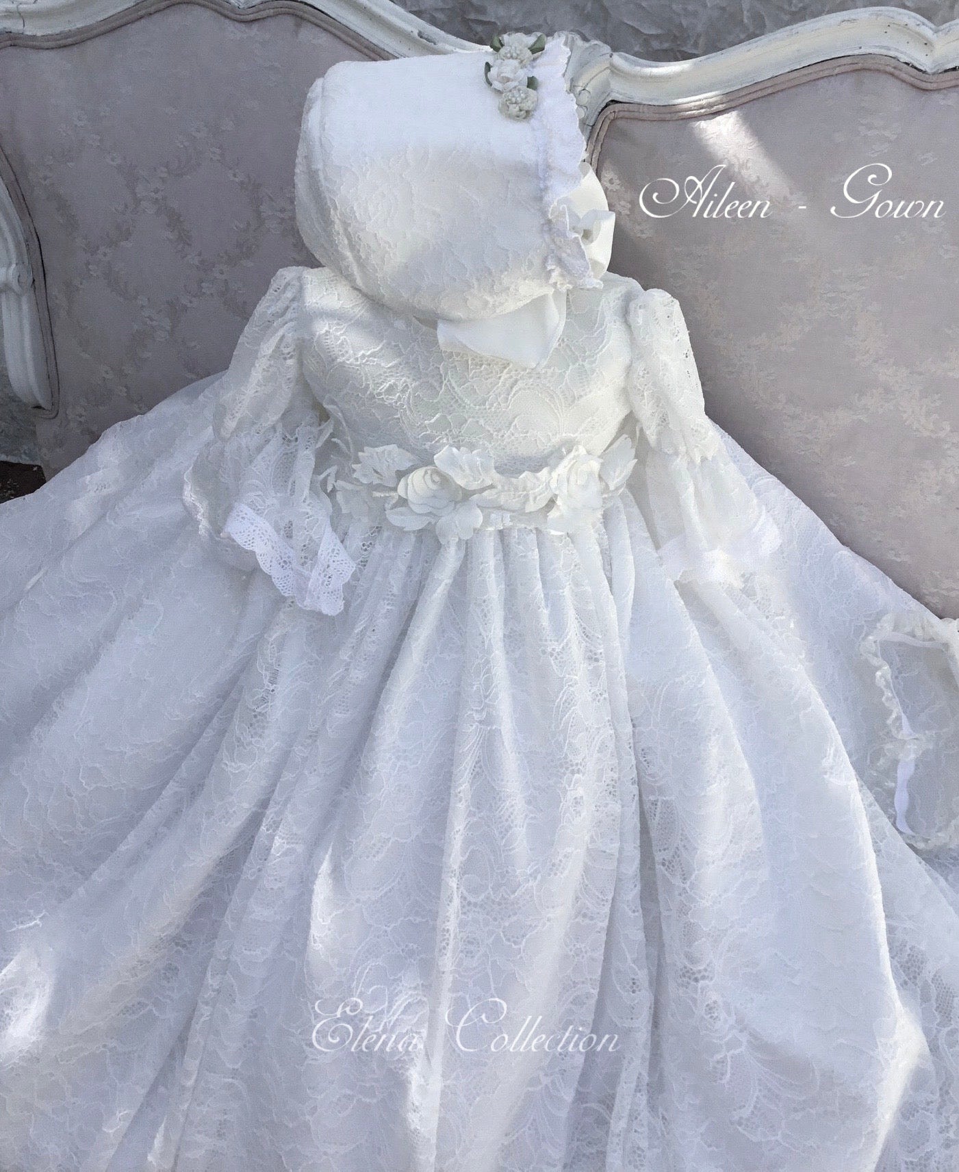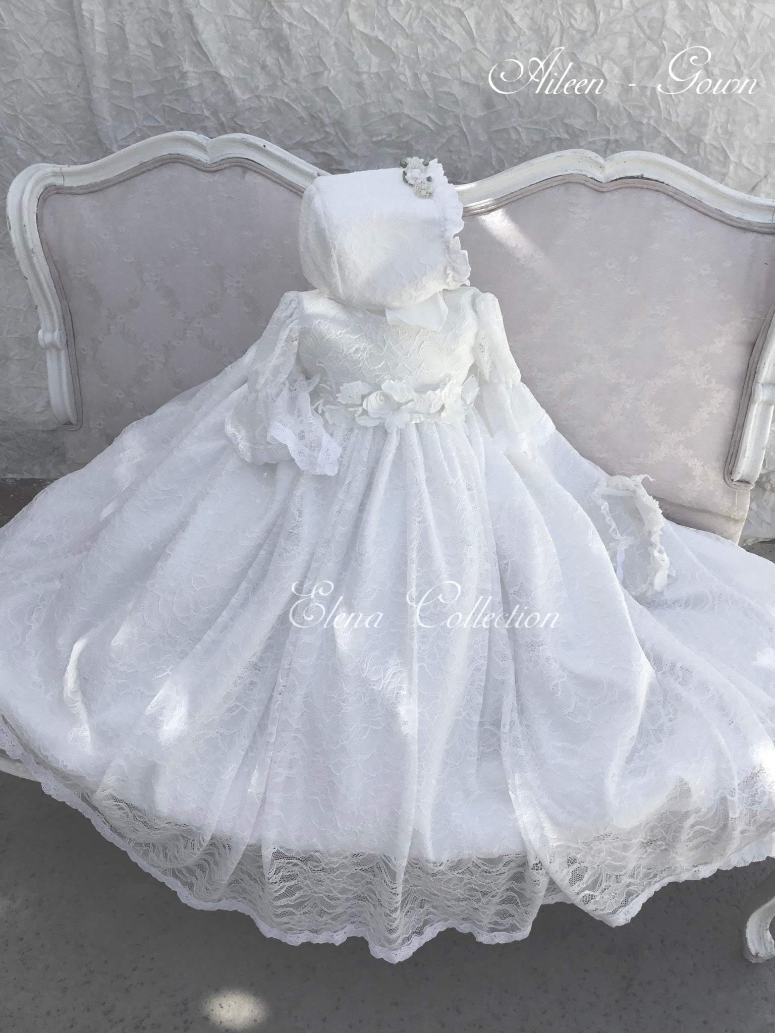 Aileen is a traditional christening gown, handmade baptism gown featuring a delicate corded lace with cotton trim and long sheer bell sleeves. The gown is an open back is secured with two hand sewn buttons, adorned with hand made silk flowers on the bonnet pearl beads, and intricate lace for an elegant finish. This quality traditional outfit includes a matching bonnet and is lined with 100% pure cotton for comfort. Perfectly crafted for a special baptism day, it is made to order and ships worldwide from California. Fabrics and materials: - Satin - Lace - Tulle - Cotton trim - Pure cotton lining
