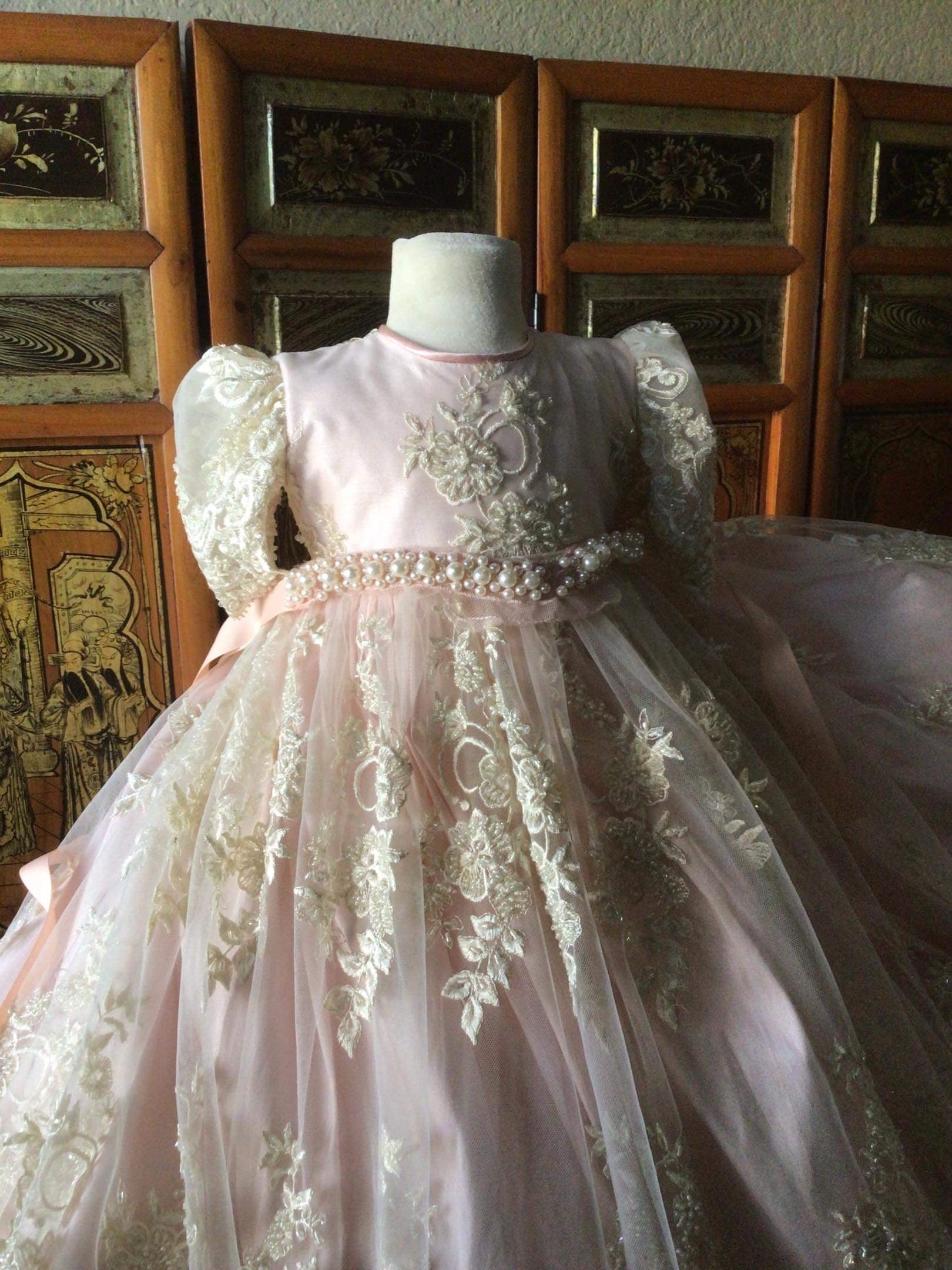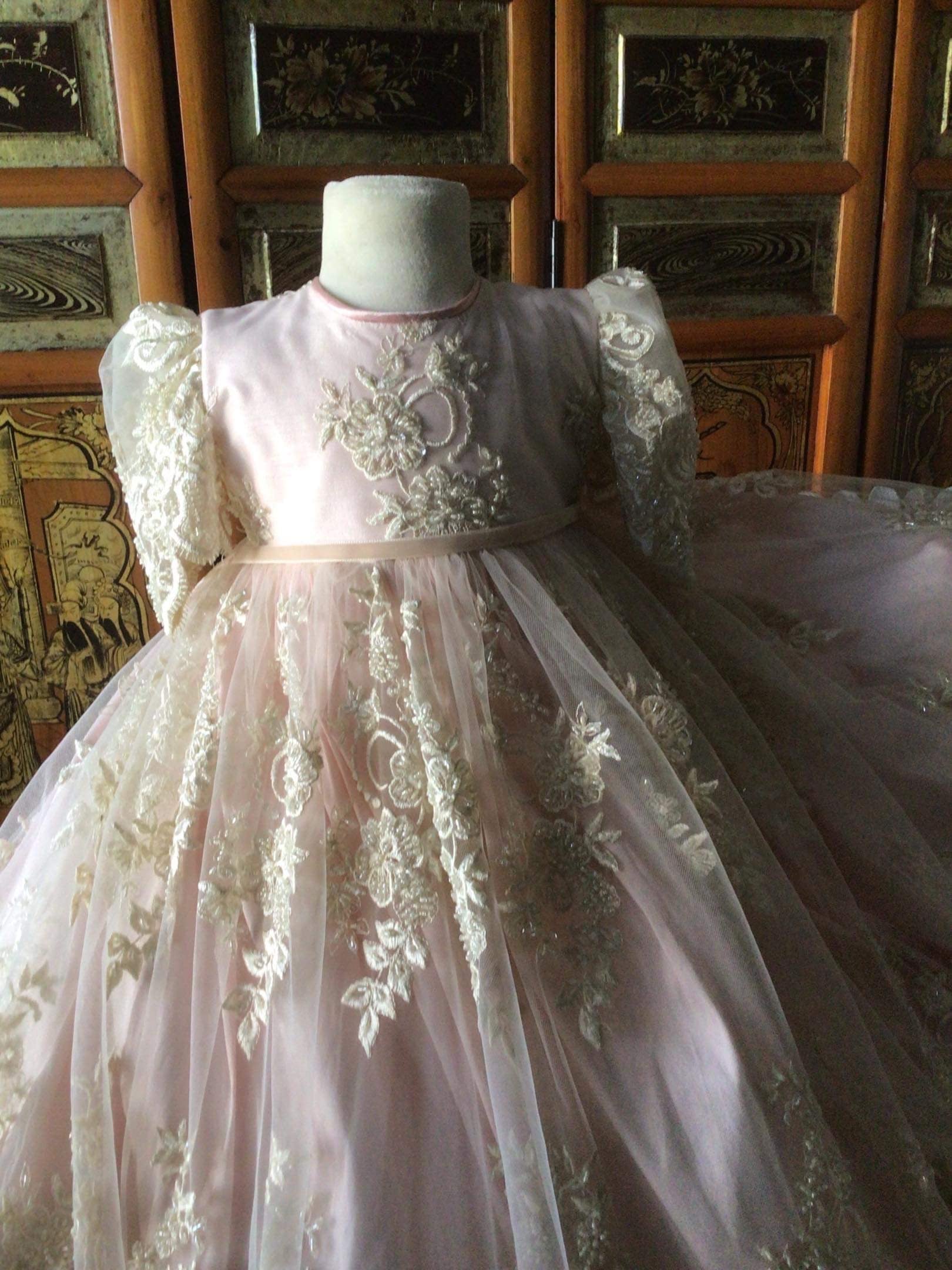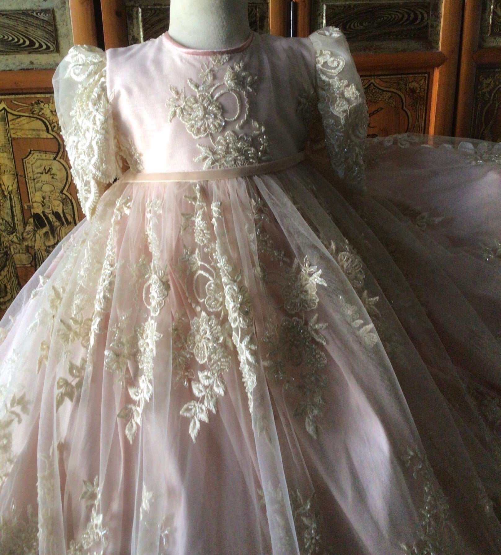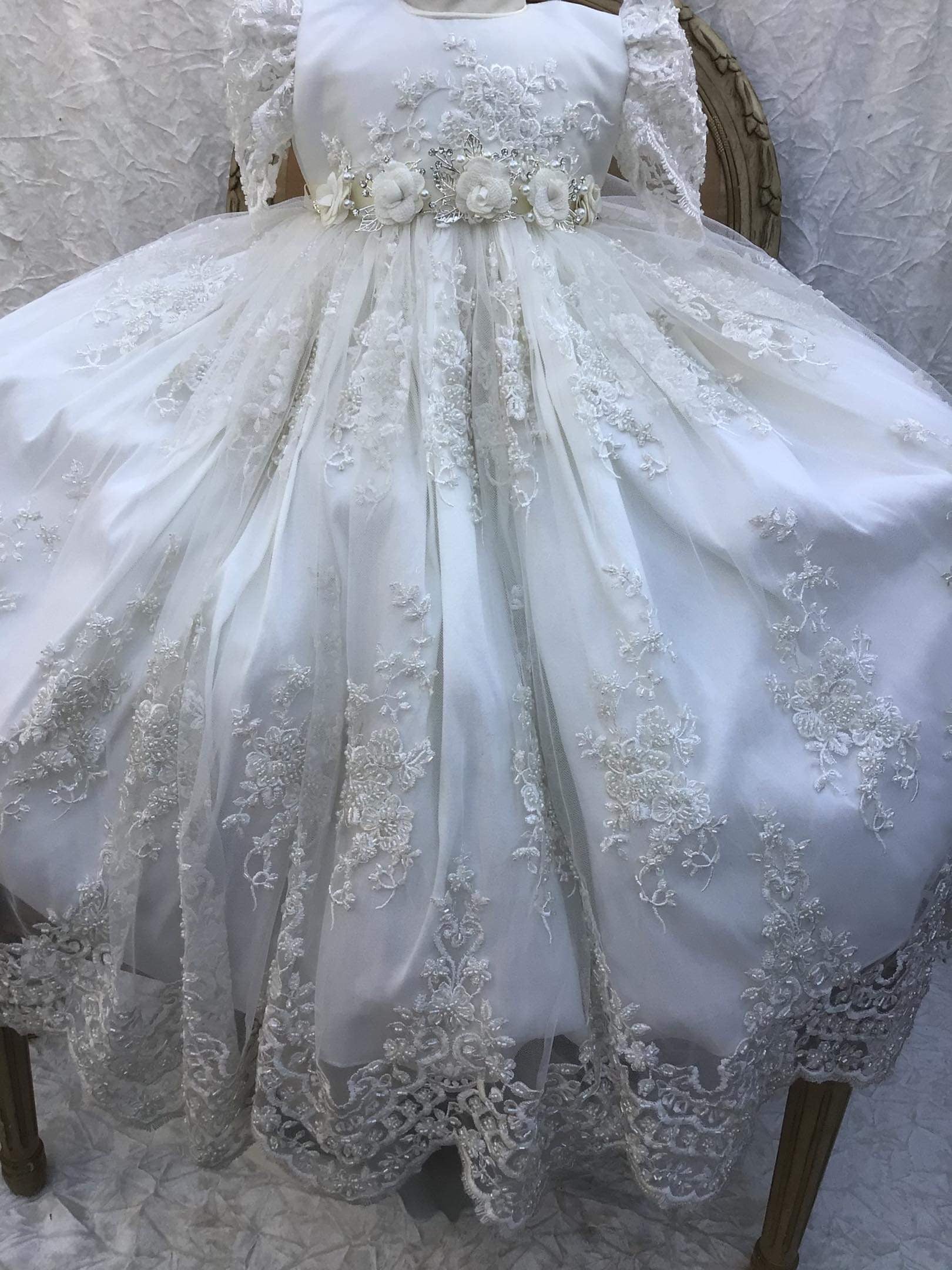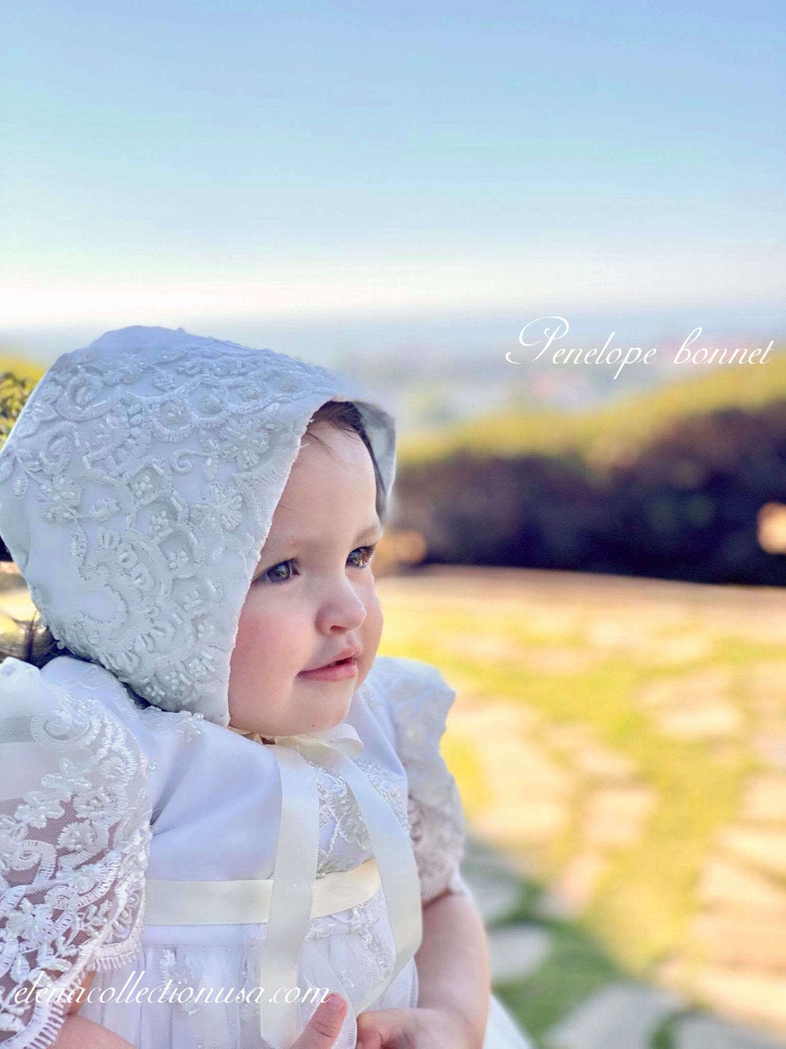 The Penelope Christening gown is a luxurious, handcrafted heirloom piece featuring exquisite hand-beaded lace with floral embroidery and sheer Victorian sleeves. Fully lined with a petticoat for added fullness, it includes a matching lace bonnet. This elegant gown is designed to be cherished across generations and is perfect for your baby's special baptism day. Materials used: - Soft lining - Lace - Tulle - Piping - Fusing crinoline - - Venetian trim