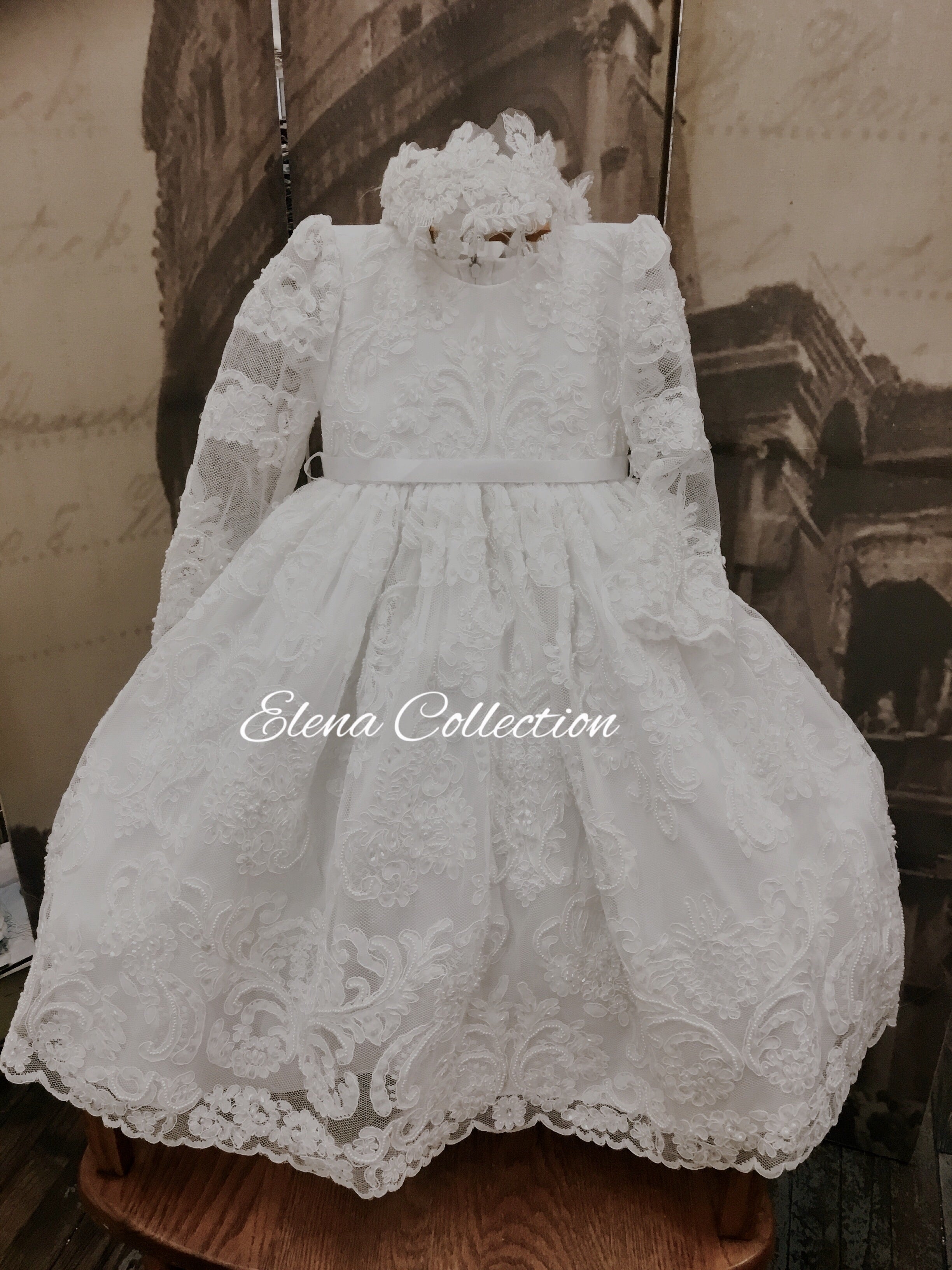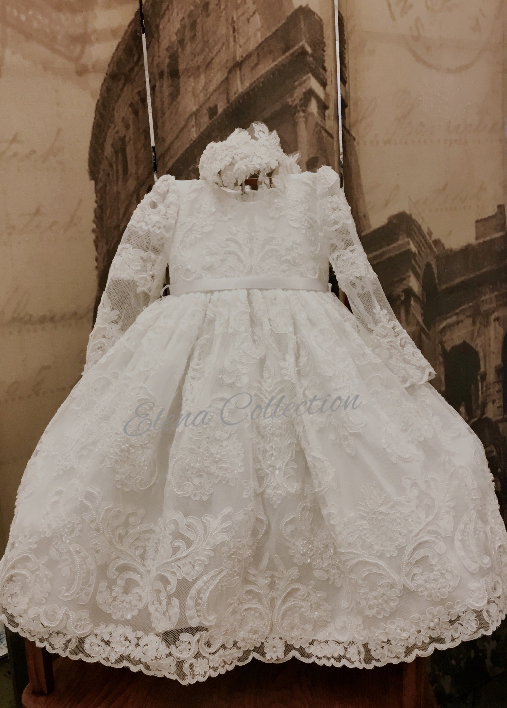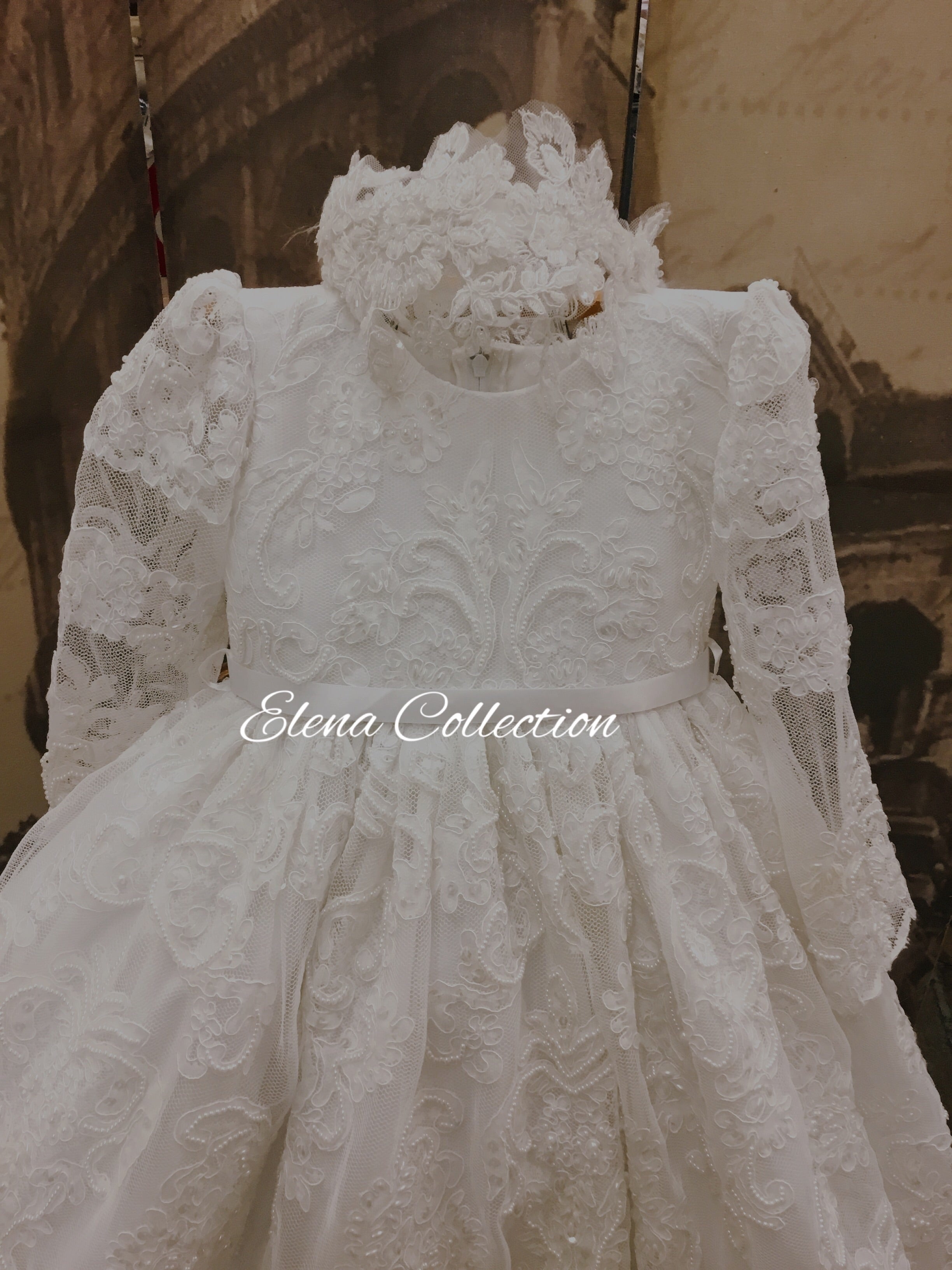Brenda is a luxurious christening dress from our exclusive couture lace collection. Made in our studio for superior quality, it features sheer long sleeves and a full petticoat for elegant volume. The seamless lining ensures gentle comfort for your baby. Fabrics: - Couture lace - Sheer fabric (sleeves) - Soft lining A matching headband is available for $35.00.