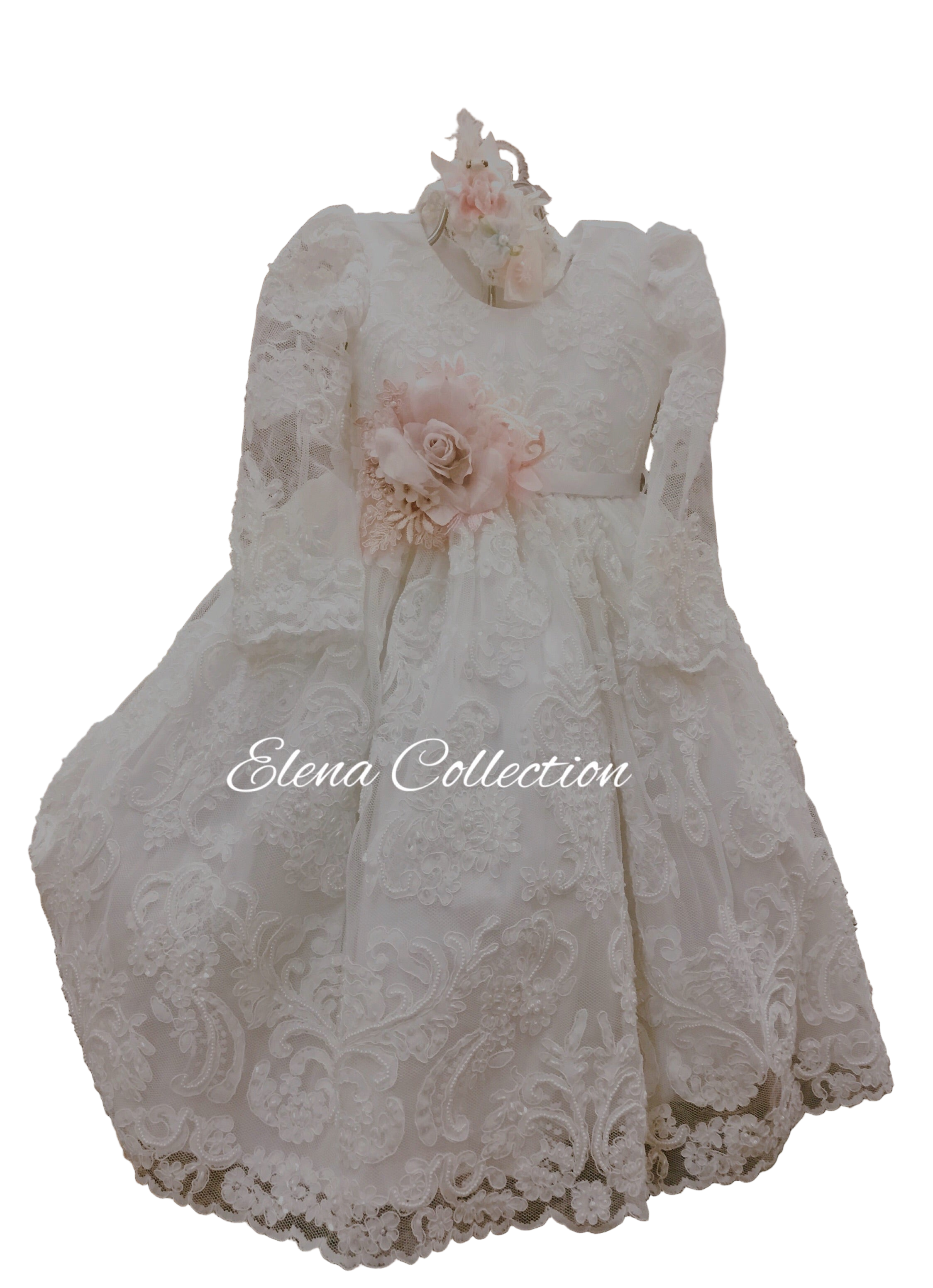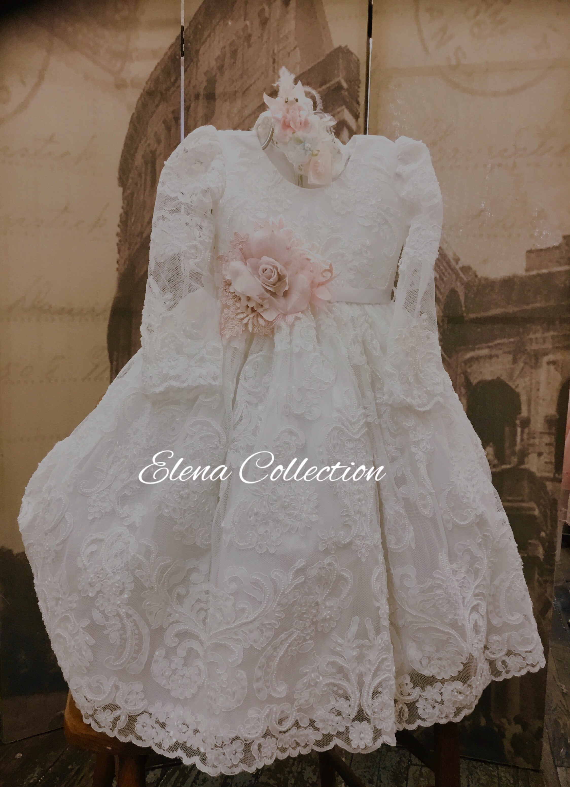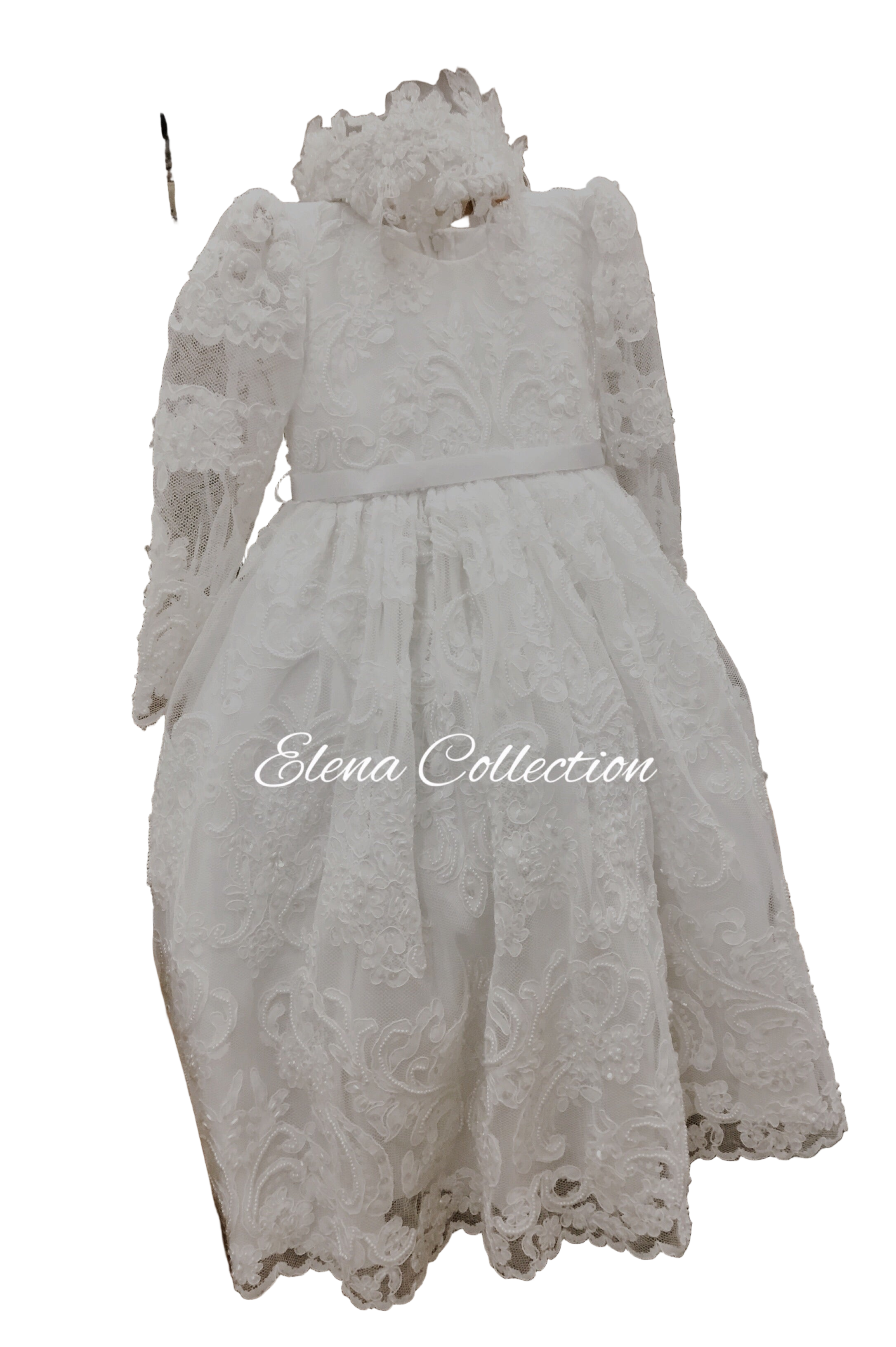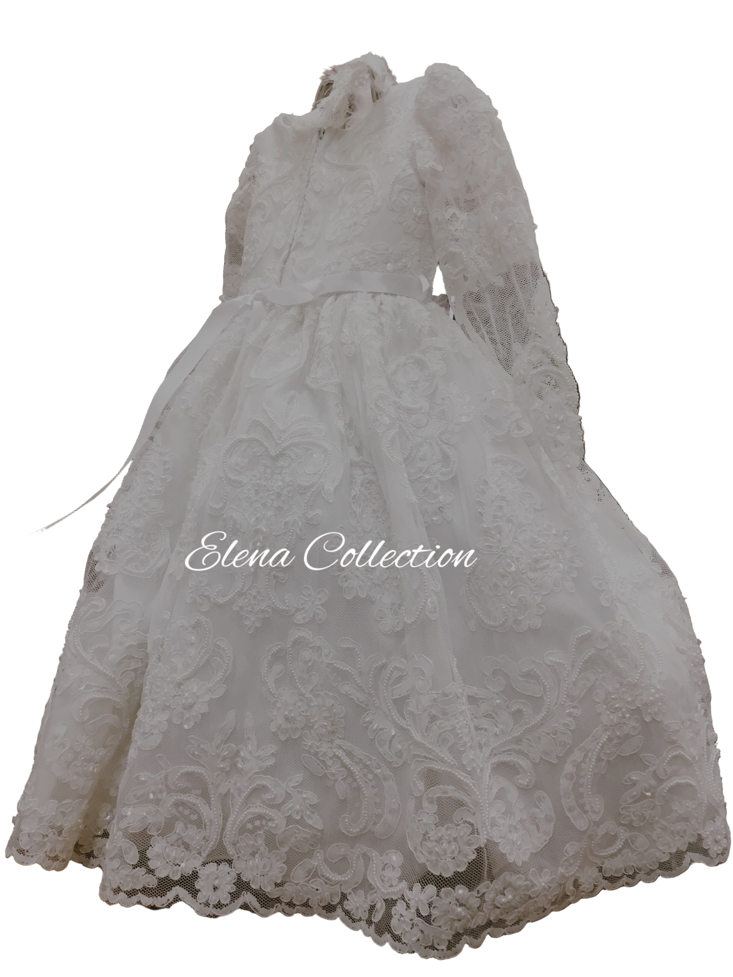 Brenda is a luxurious christening dress from our exclusive couture lace collection. Made in our studio for superior quality, it features sheer long sleeves and a full petticoat for elegant volume. The seamless lining ensures gentle comfort for your baby. Fabrics: - Couture lace - Sheer fabric (sleeves) - Soft lining A matching headband is available for $35.00.