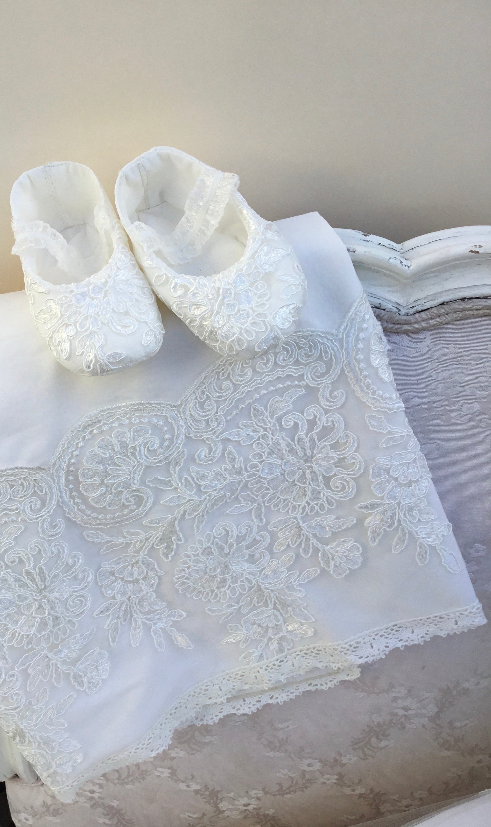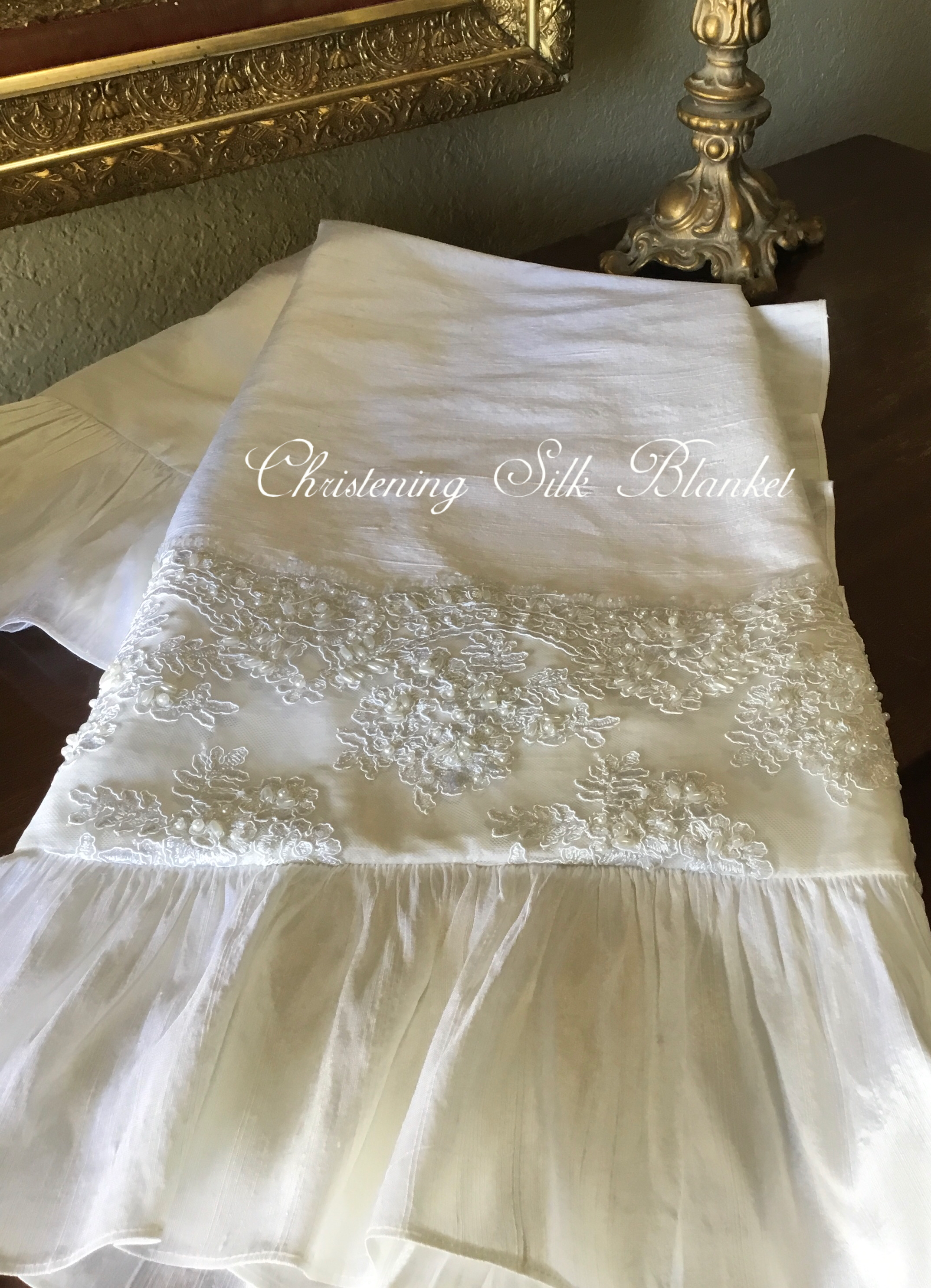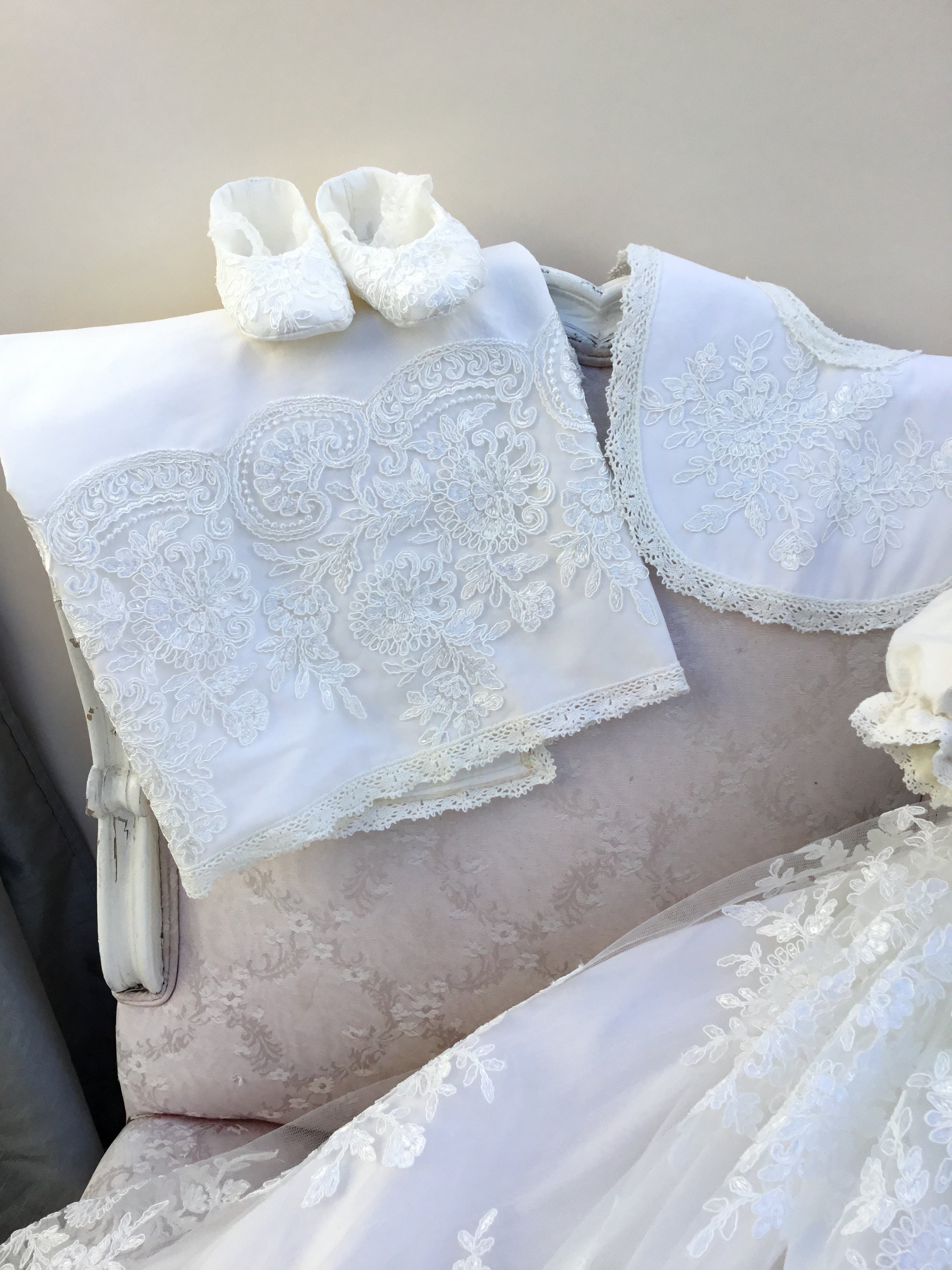Elevate your baby's special day with the MATCHING Silk Blanket 36x36, crafted to perfectly complement your elegant christening gown. This blanket features a lustrous silk outer layer that radiates refined luxury, paired with a soft cotton lining that ensures delicate comfort against your baby's skin. Generously sized to provide warmth and gentle coziness, it offers both practicality and sophistication. Designed as a harmonious accessory, it enhances the overall ensemble with an air of timeless opulence while serving as a cherished keepsake for years to come. Indulge in pure elegance with this beautifully coordinated silk blanket.