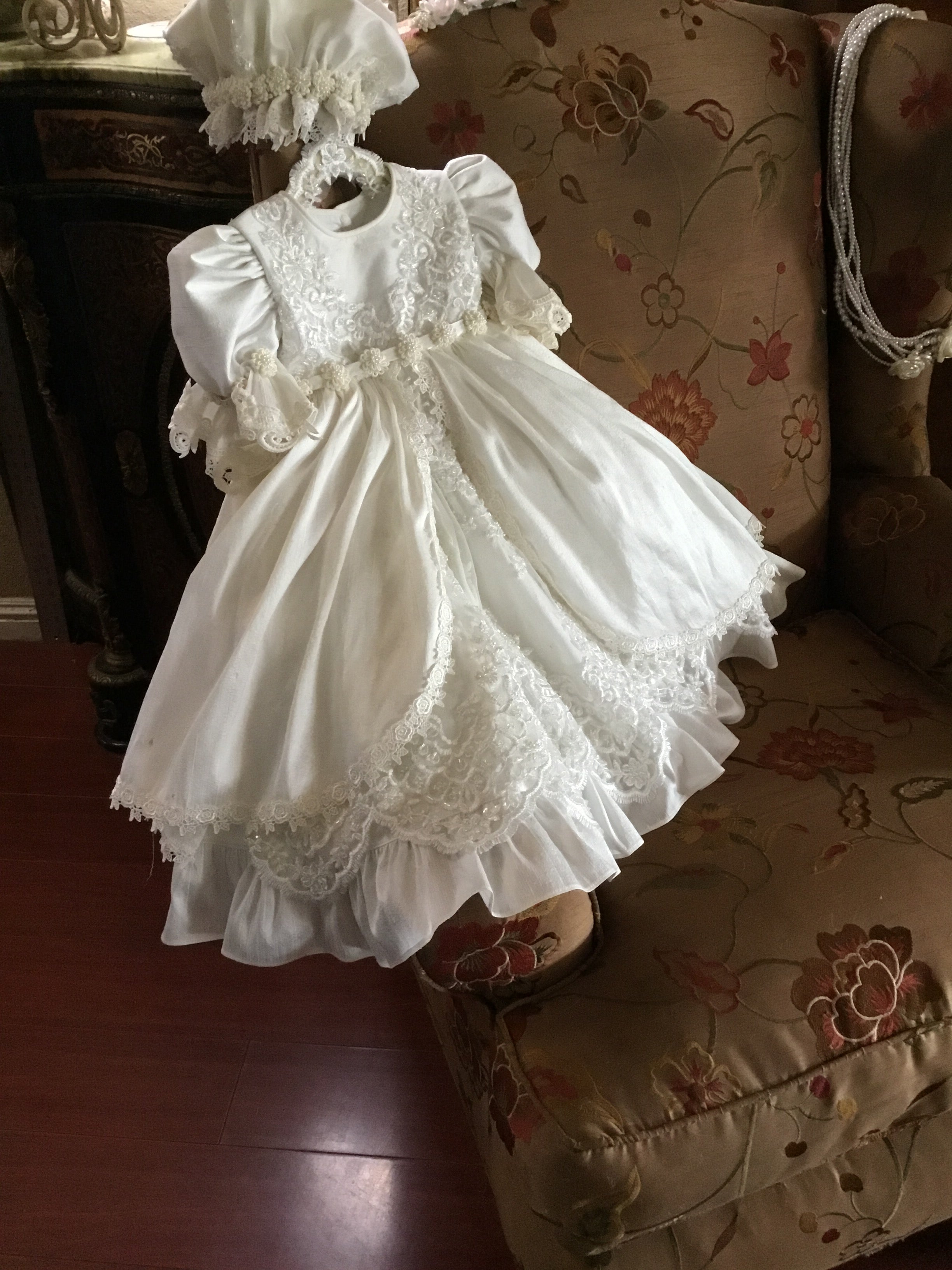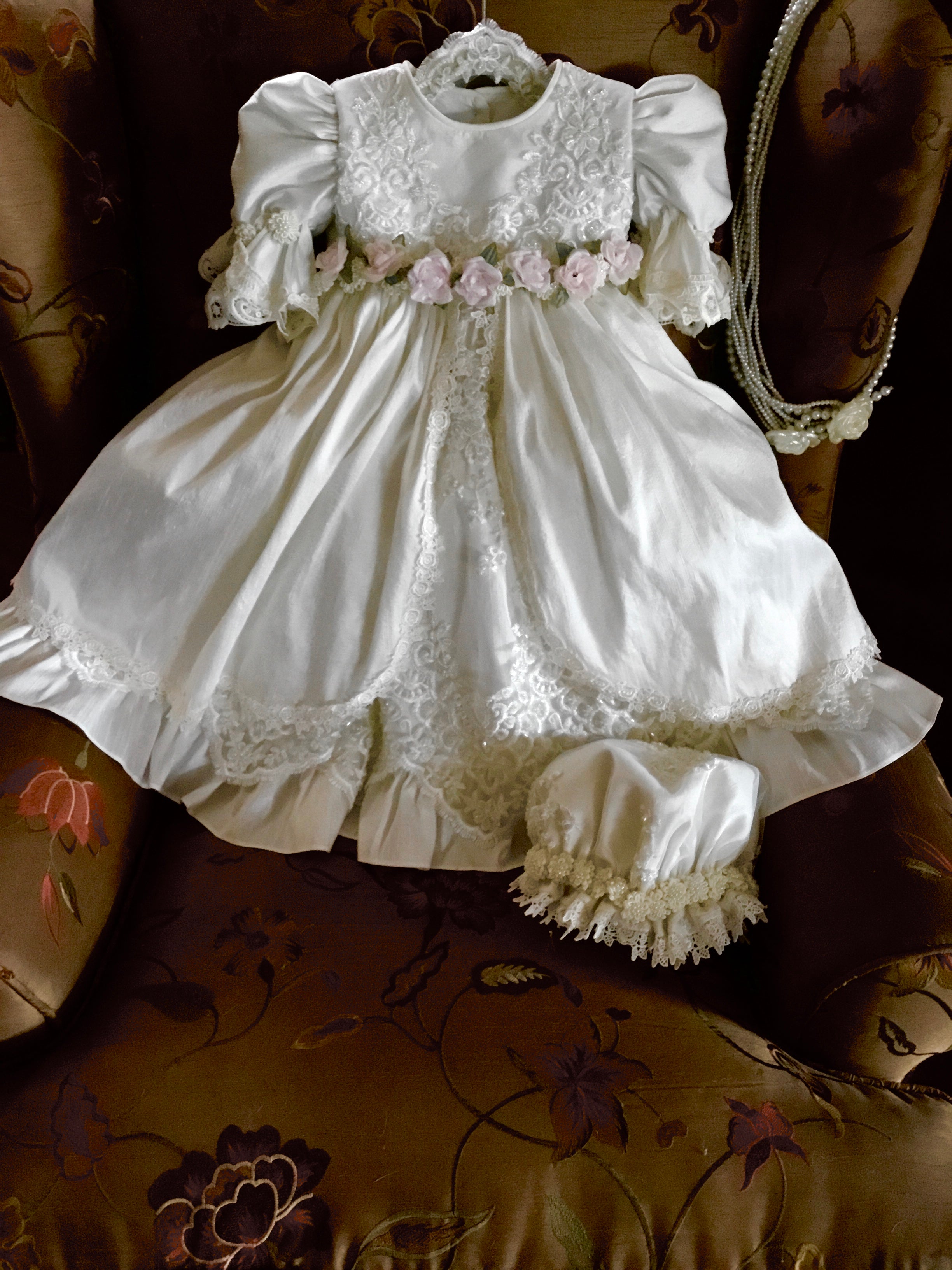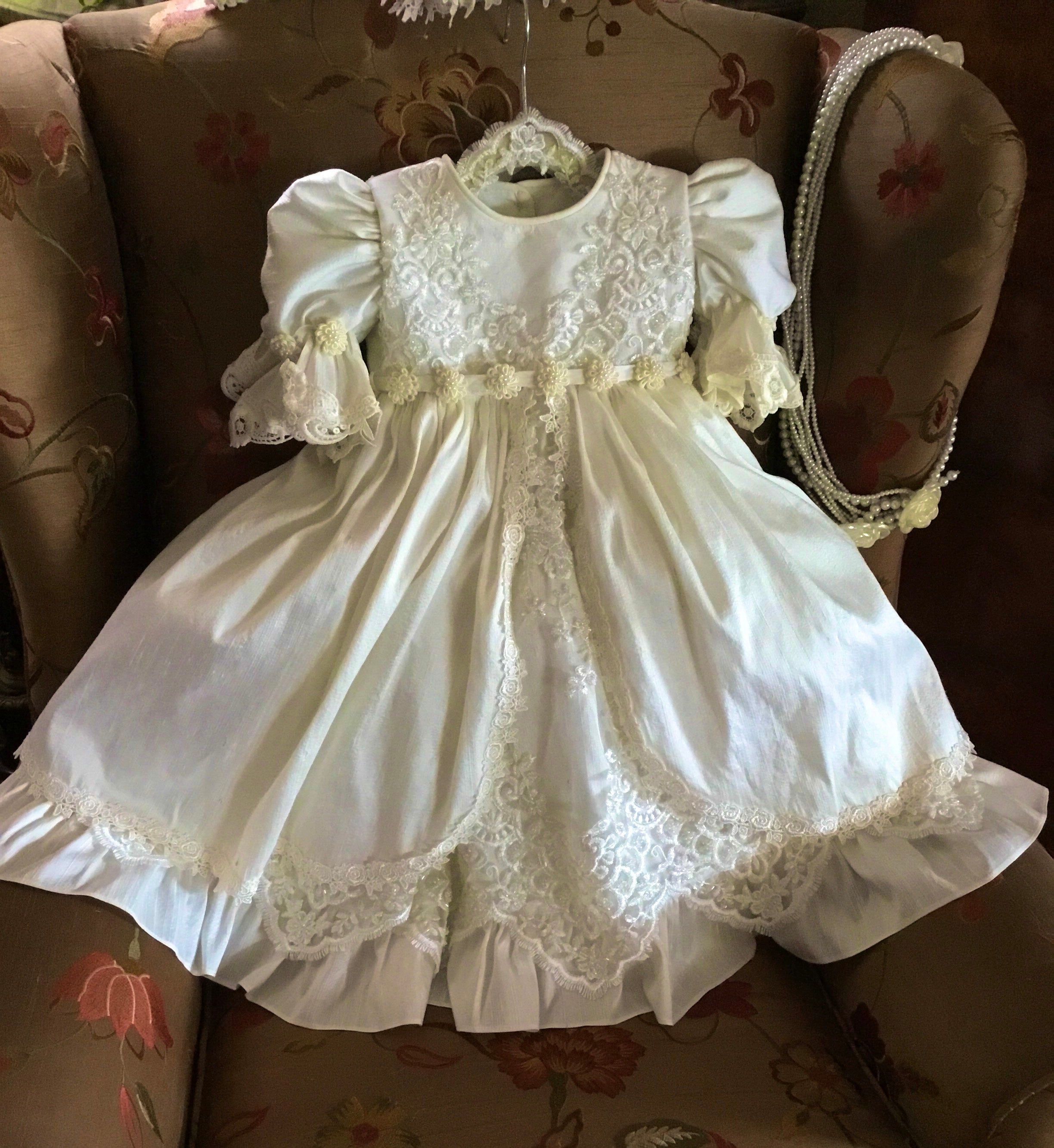 This luxurious Victorian christening dress is perfect for baptisms or special occasions. It features: - Silk - Beaded lace - Puff Victorian sleeves - Silk skirt overlay with open front - Fully lined with added crinoline for volume The dress includes a satin ribbon; accessories are sold separately.