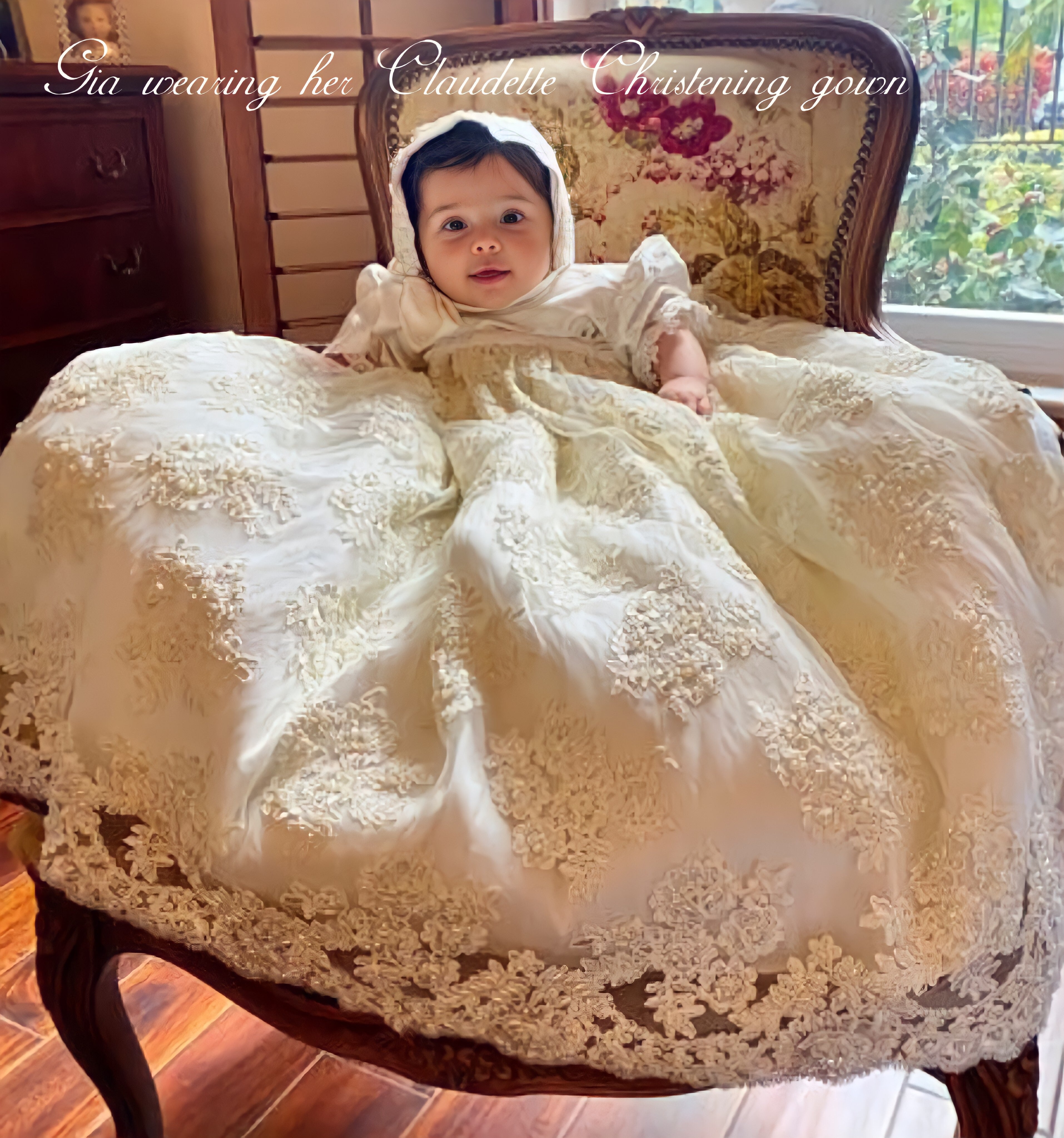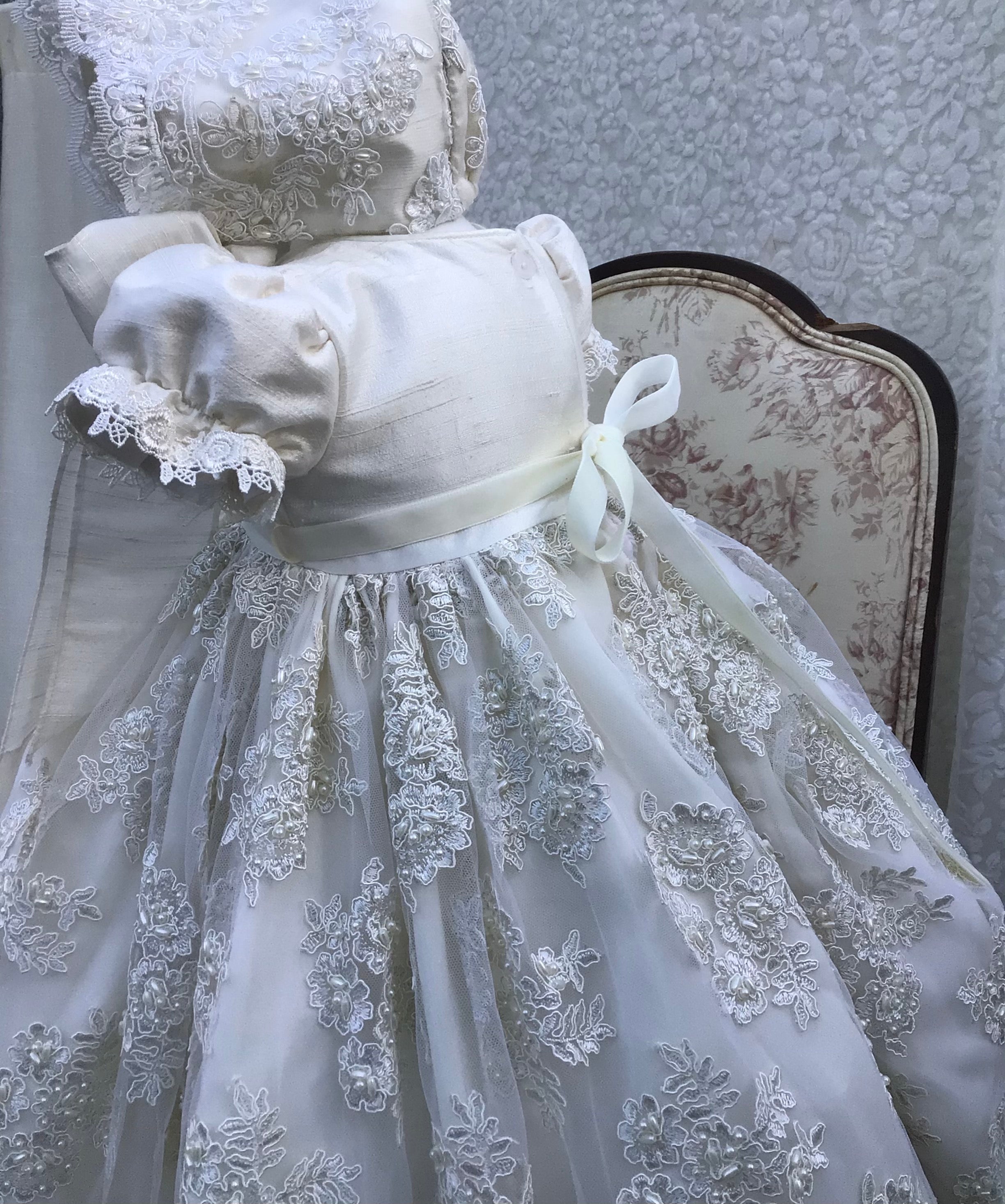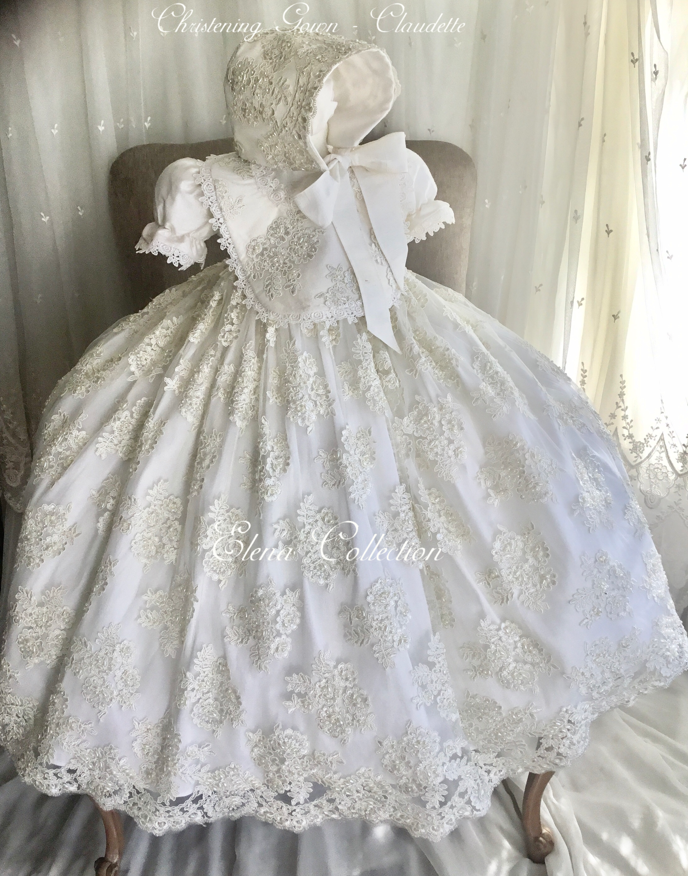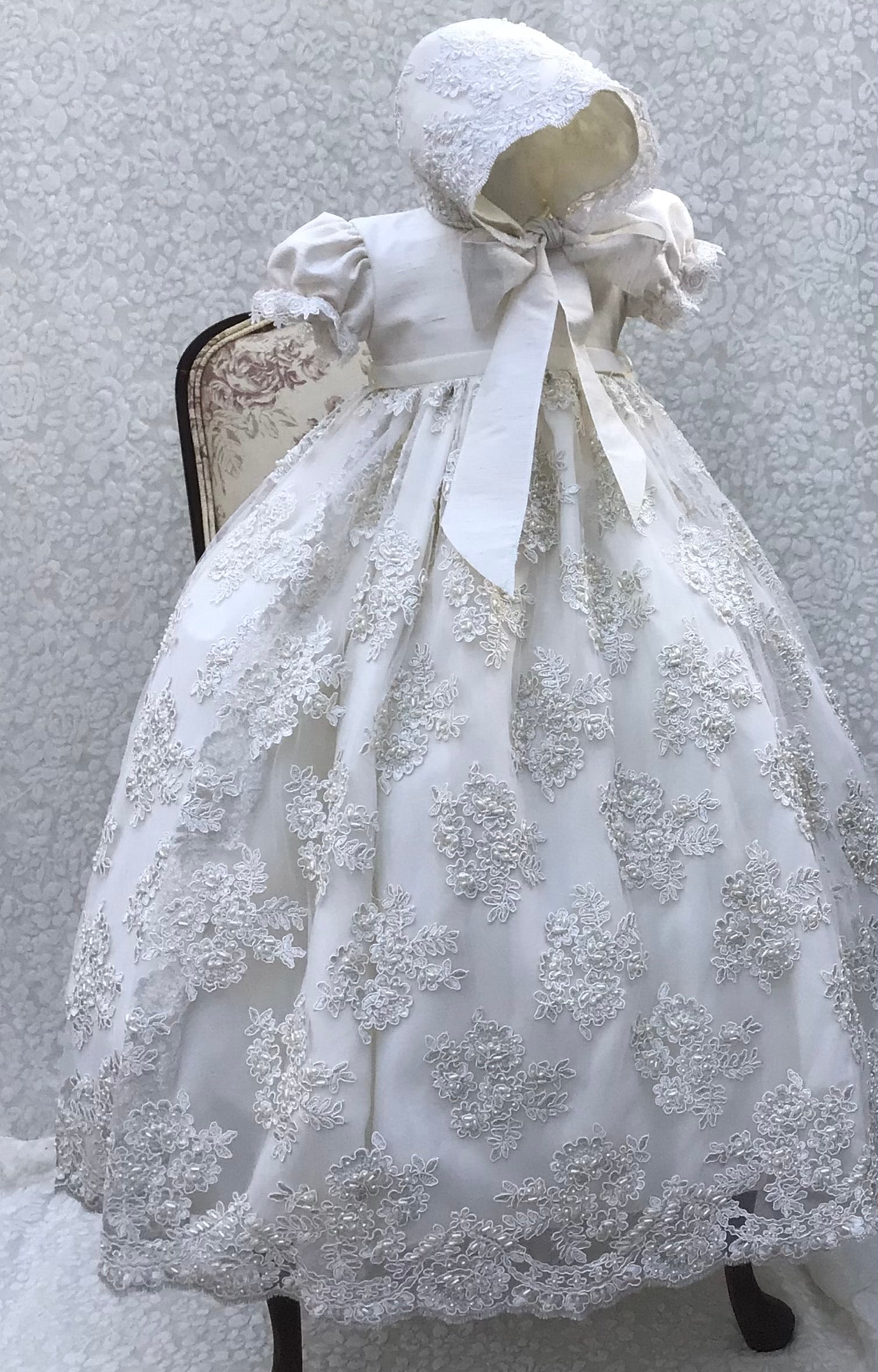 Claudette is a luxurious heirloom christening gown crafted from pure silk and adorned with delicate beaded lace embroidery. Featuring a full-length skirt, hand-finished hem, and matching bonnet, it offers vintage elegance for boys or girls. Choose between puffed or long sleeves to suit your preference. Made for newborns to 24 months, this gown is designed to be treasured and passed down for generations. Dry clean only to maintain its timeless beauty.