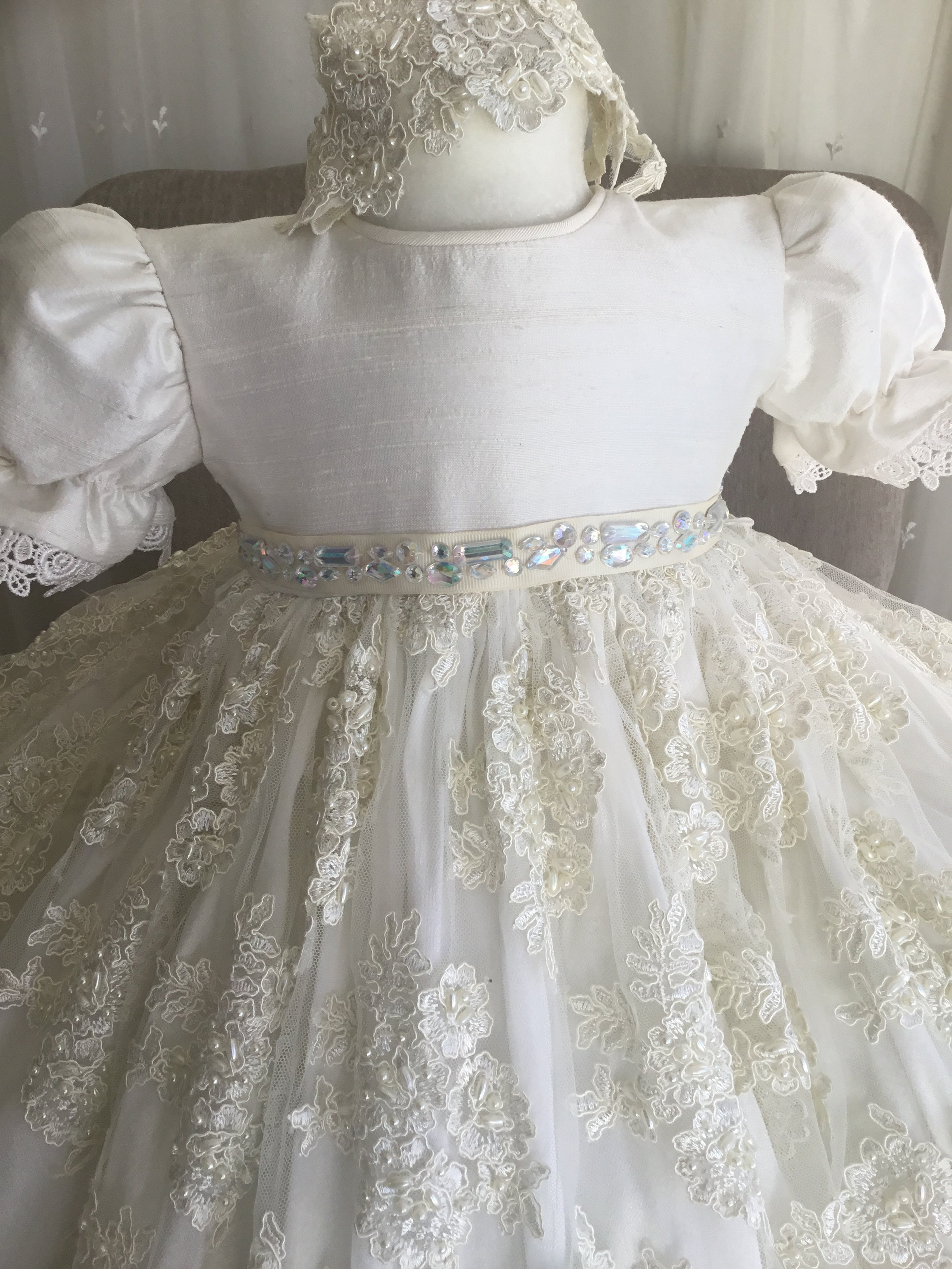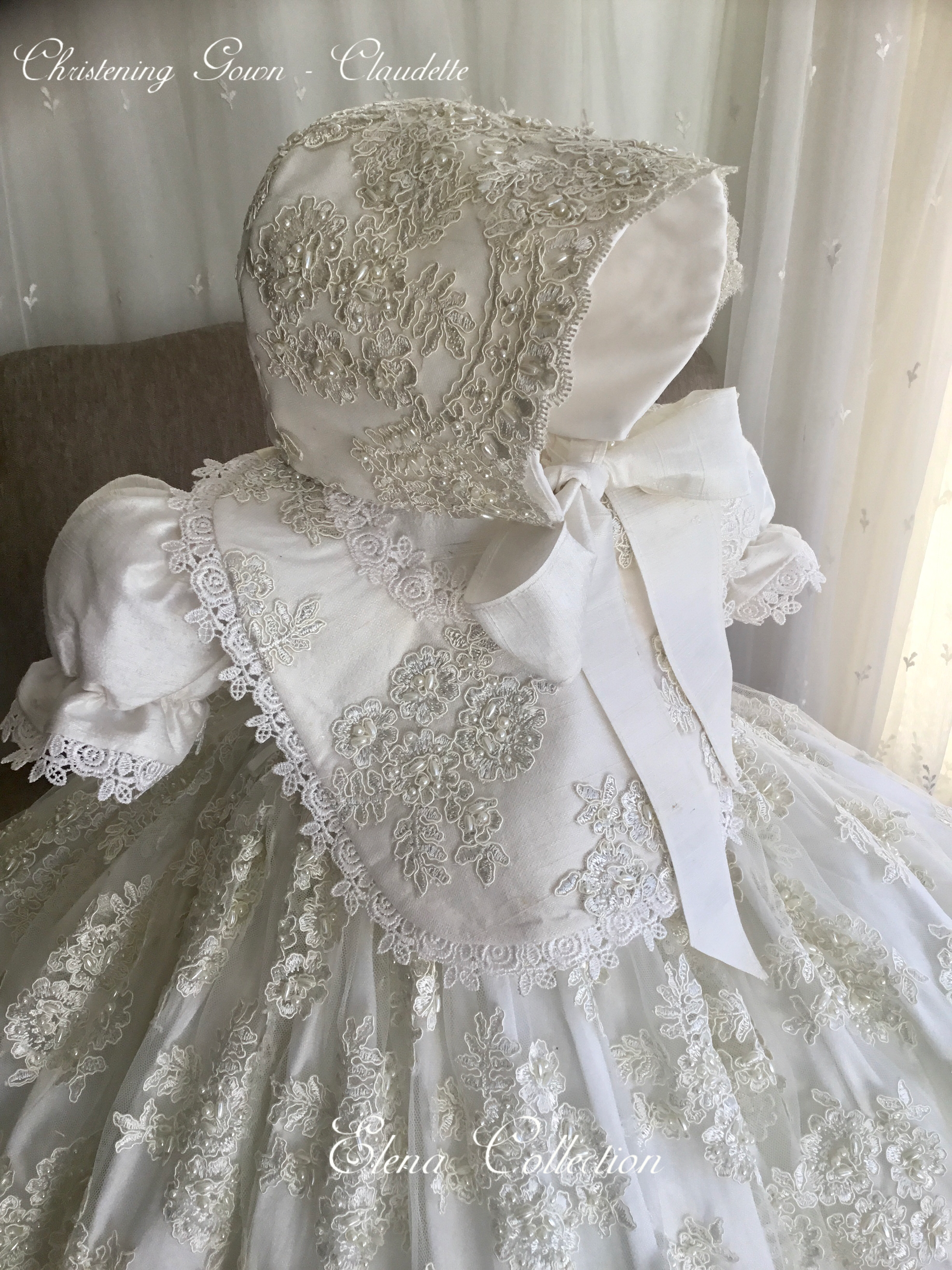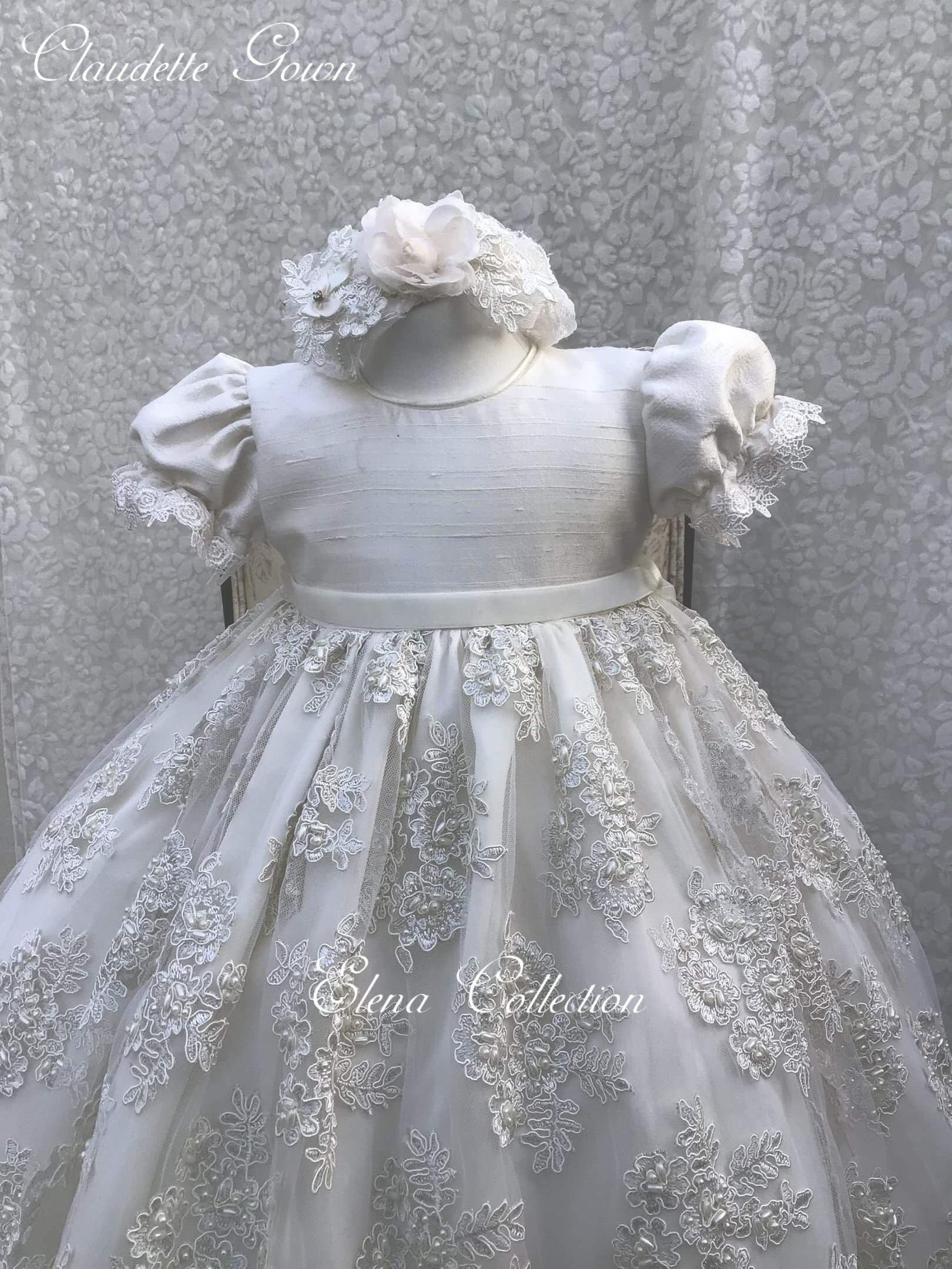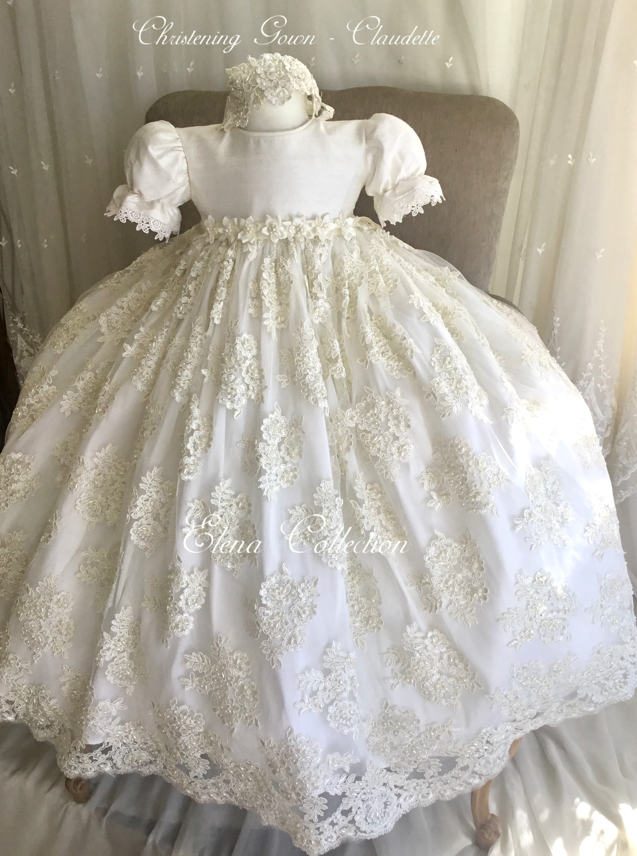 Claudette is a luxurious heirloom christening gown crafted from pure silk and adorned with delicate beaded lace embroidery. Featuring a full-length skirt, hand-finished hem, and matching bonnet, it offers vintage elegance for boys or girls. Choose between puffed or long sleeves to suit your preference. Made for newborns to 24 months, this gown is designed to be treasured and passed down for generations. Dry clean only to maintain its timeless beauty.