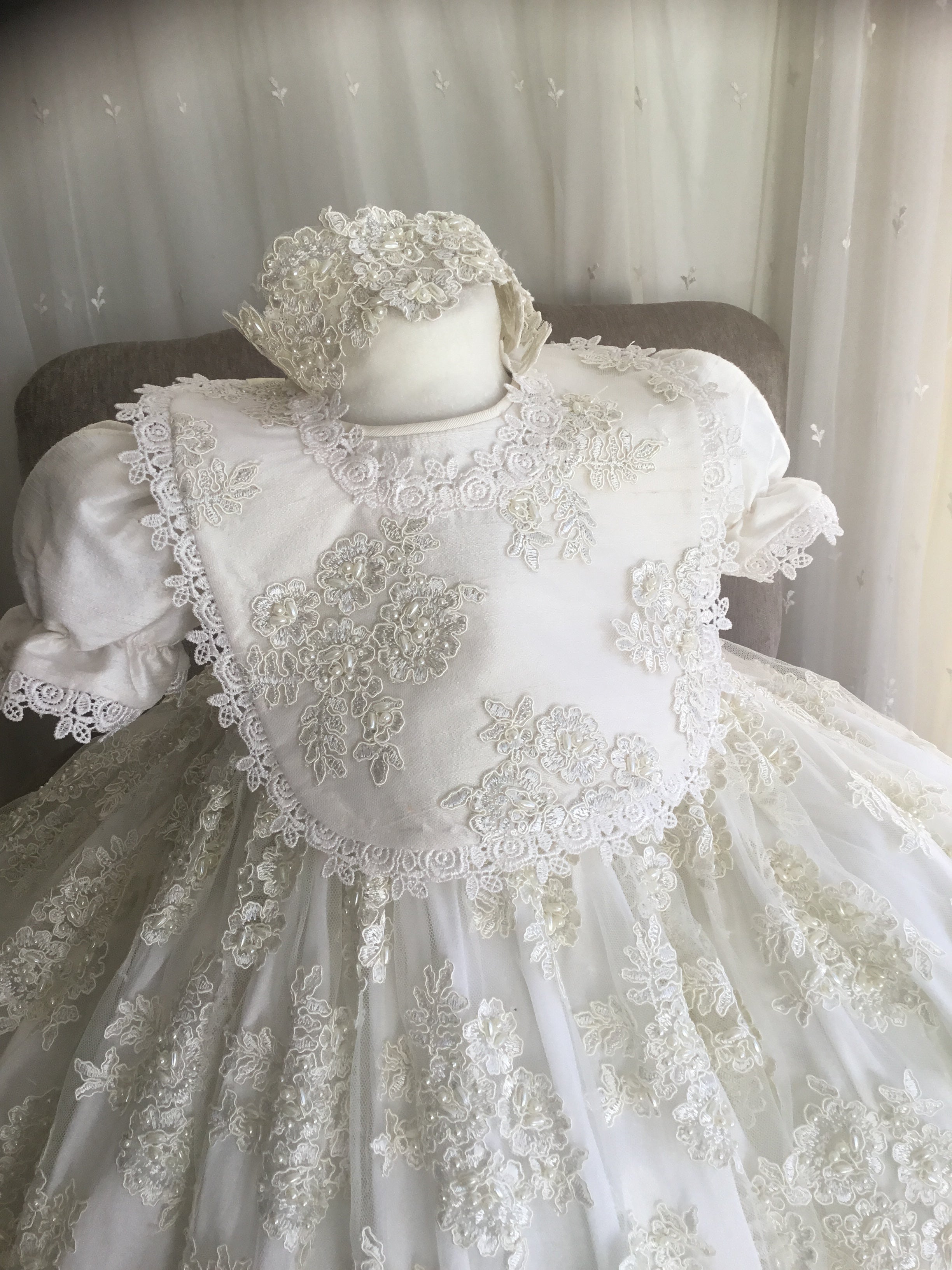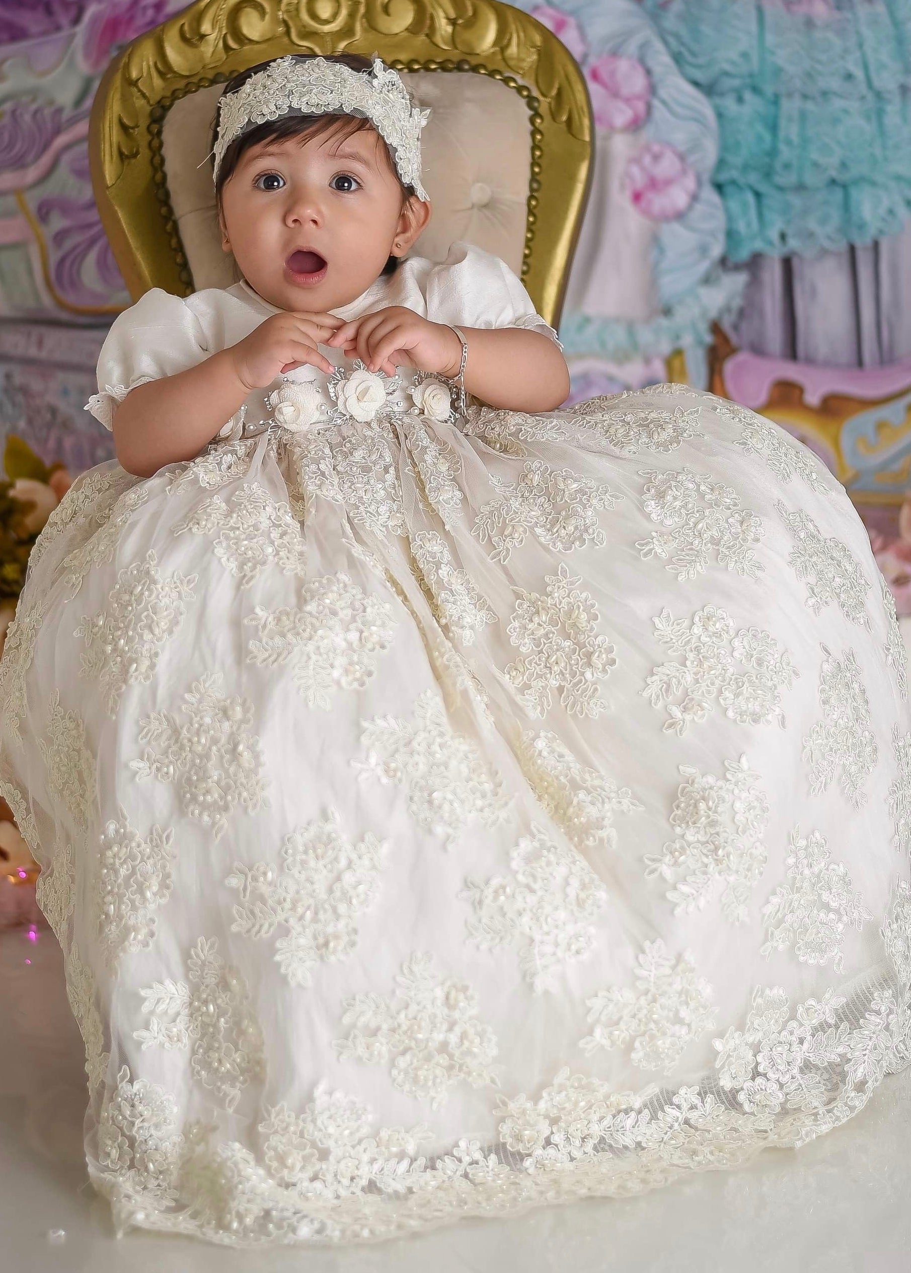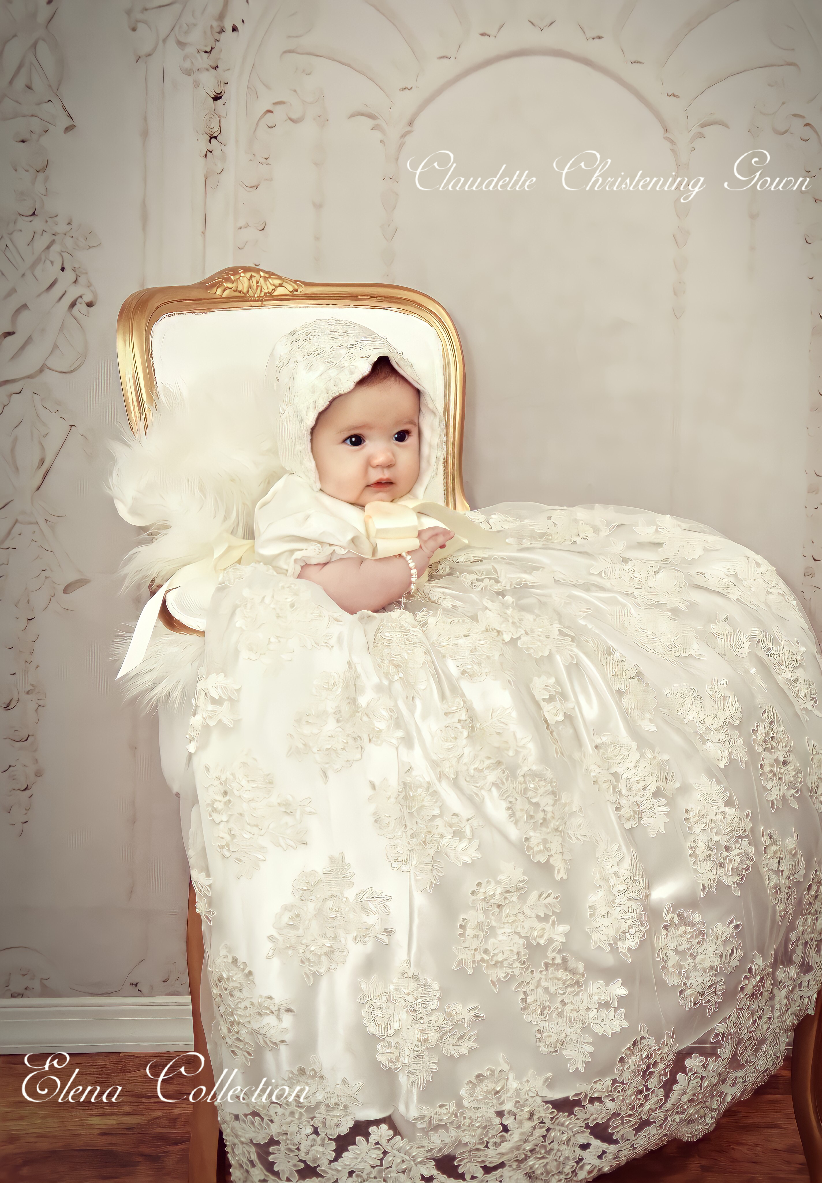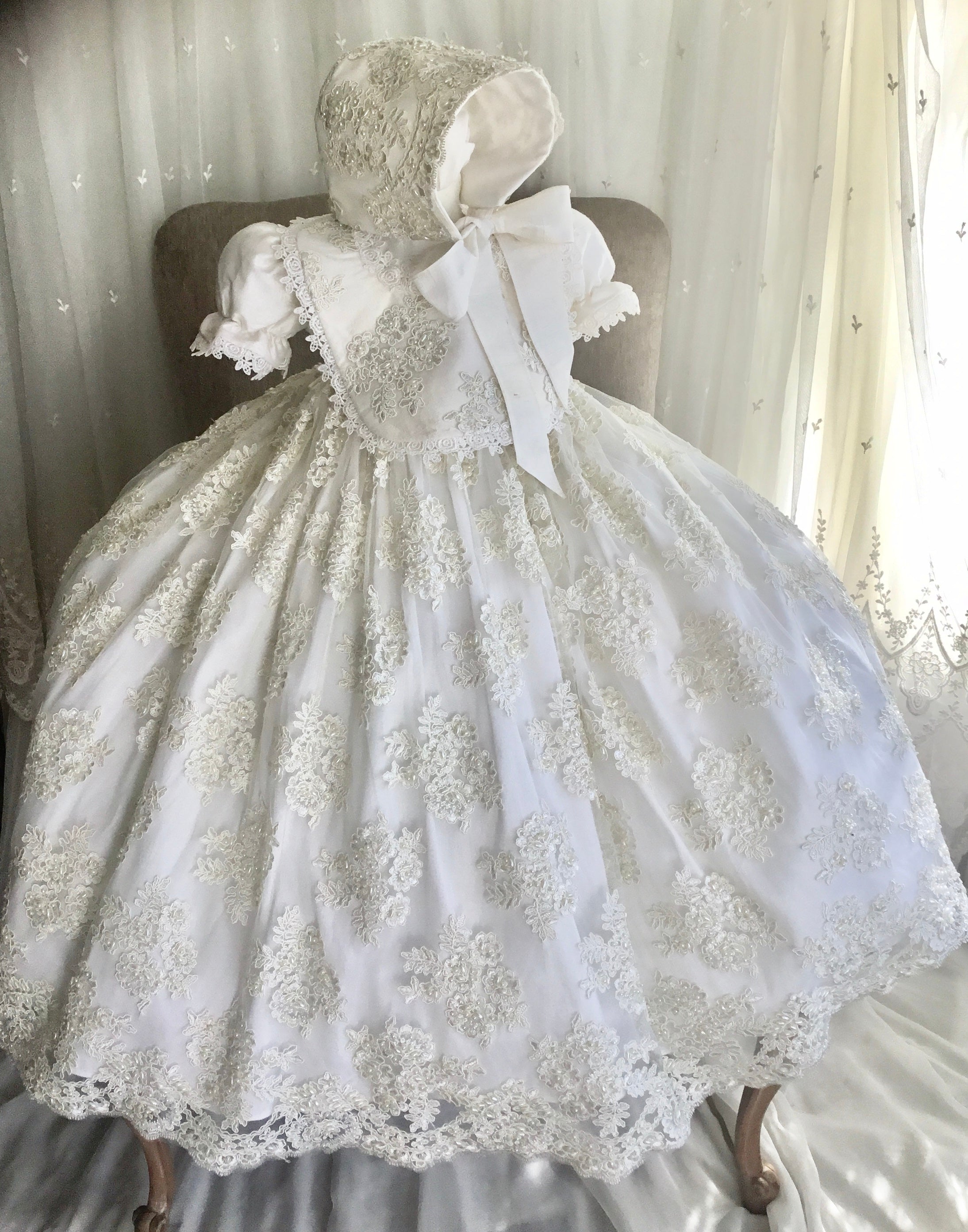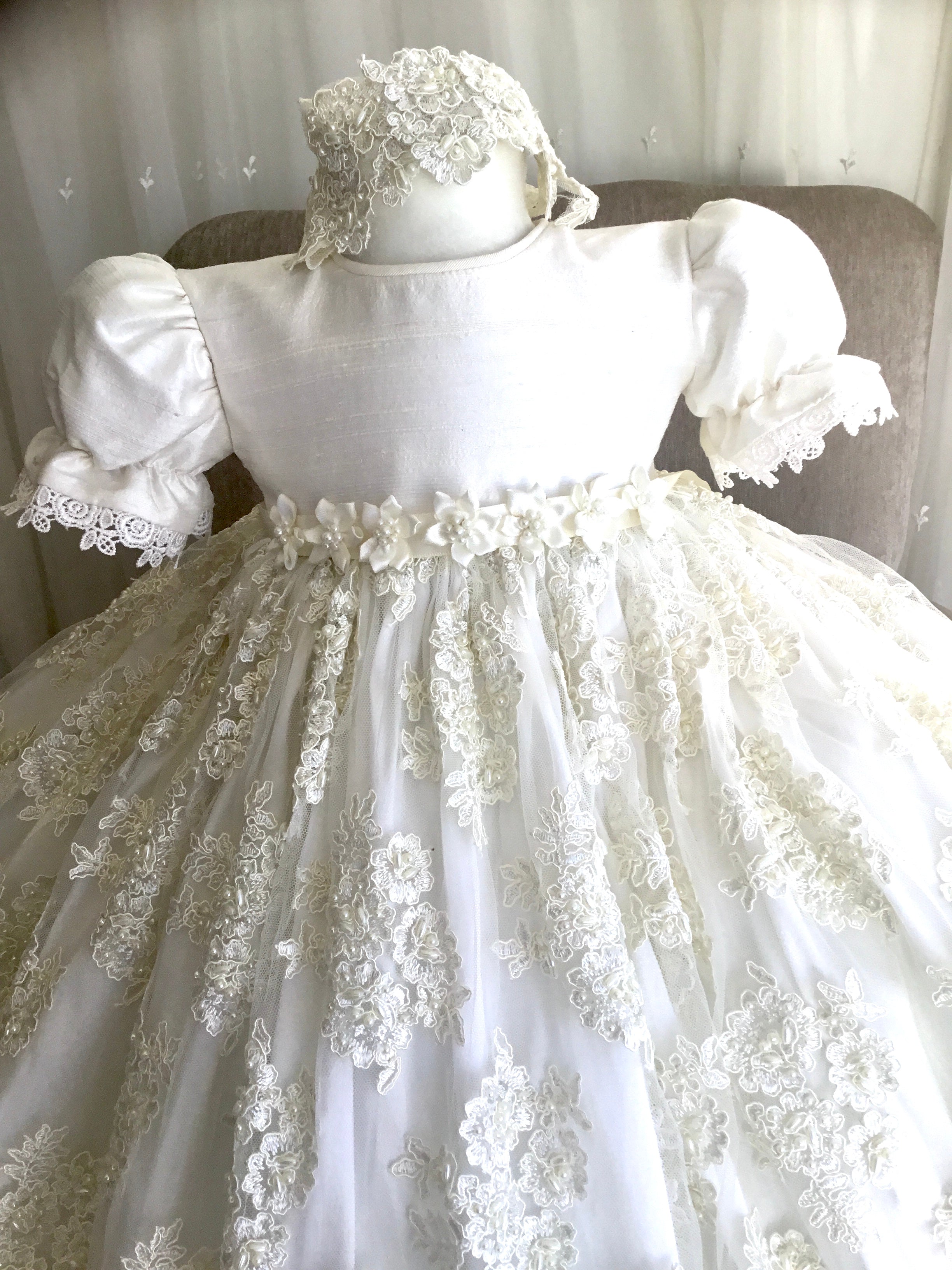 Claudette is a luxurious heirloom christening gown crafted from pure silk and adorned with delicate beaded lace embroidery. Featuring a full-length skirt, hand-finished hem, and matching bonnet, it offers vintage elegance for boys or girls. Choose between puffed or long sleeves to suit your preference. Made for newborns to 24 months, this gown is designed to be treasured and passed down for generations. Dry clean only to maintain its timeless beauty.