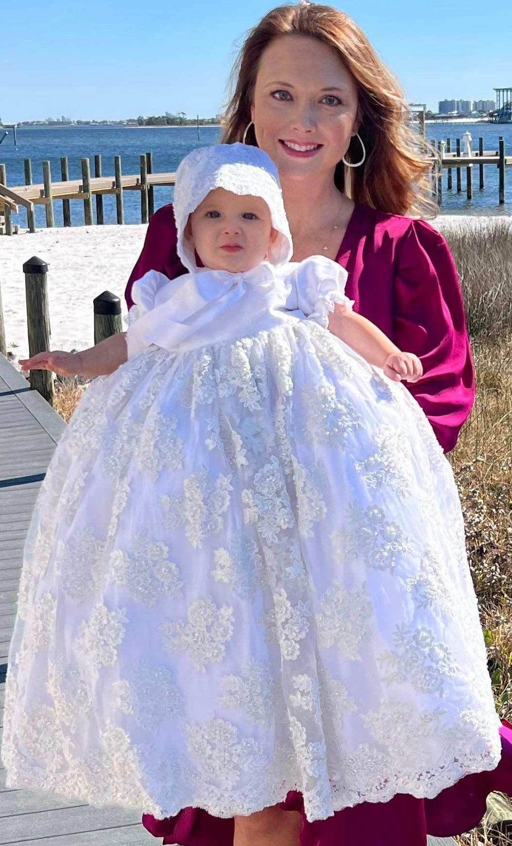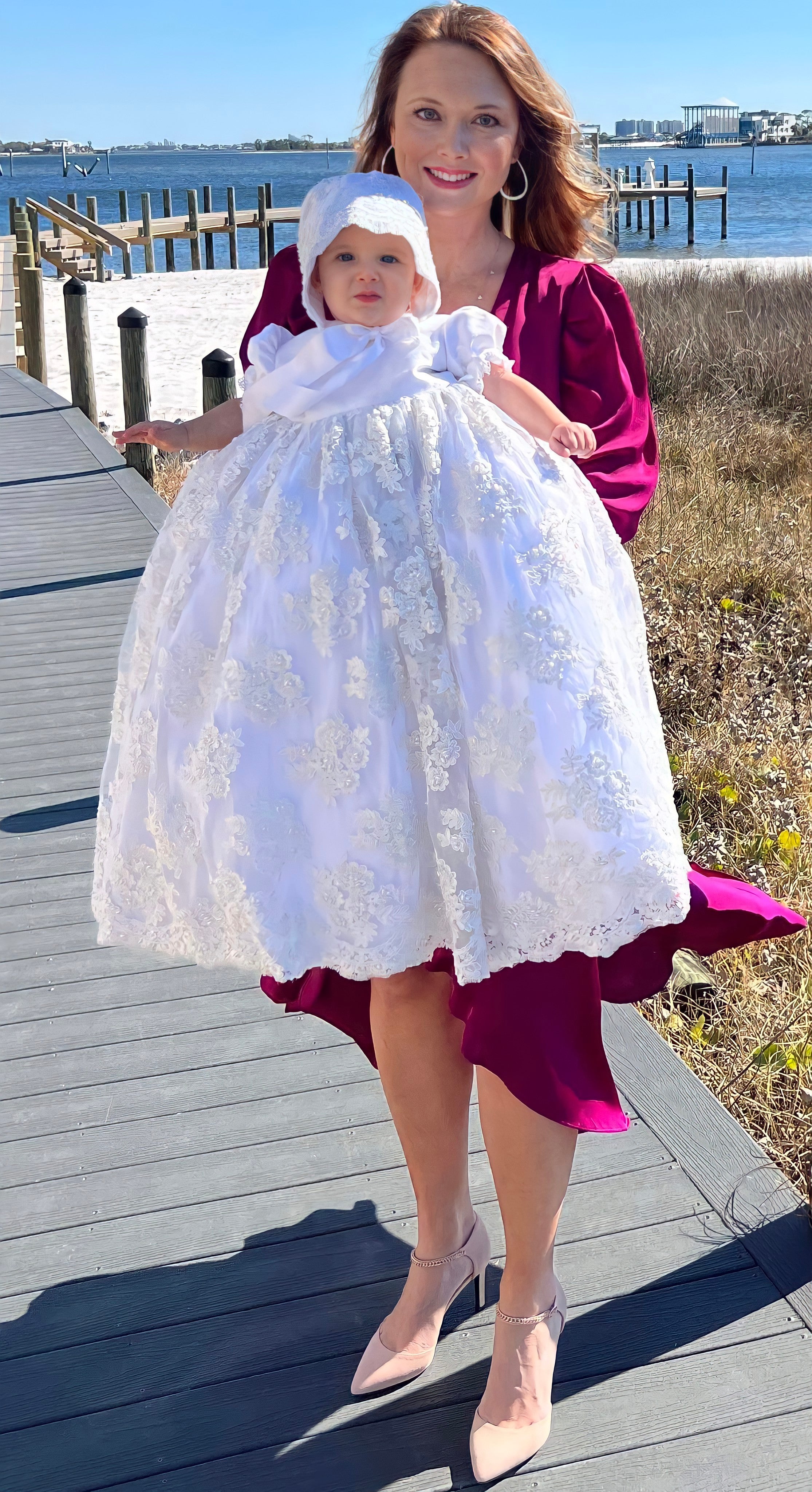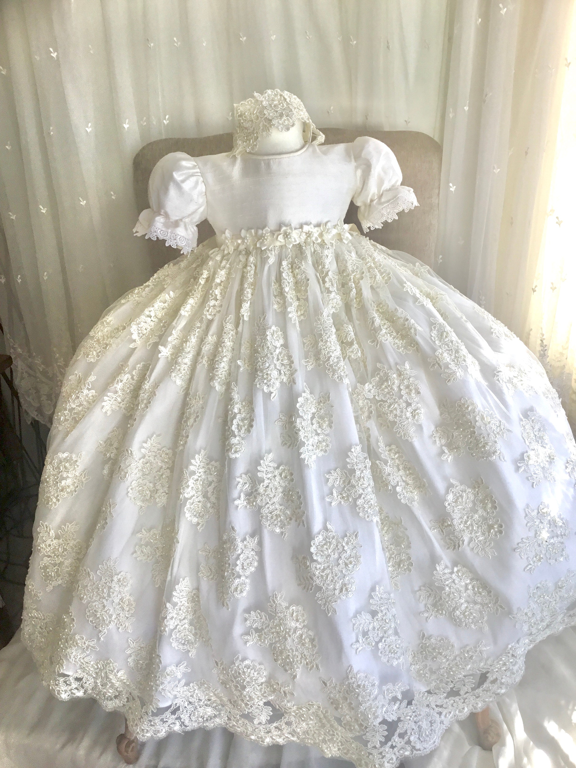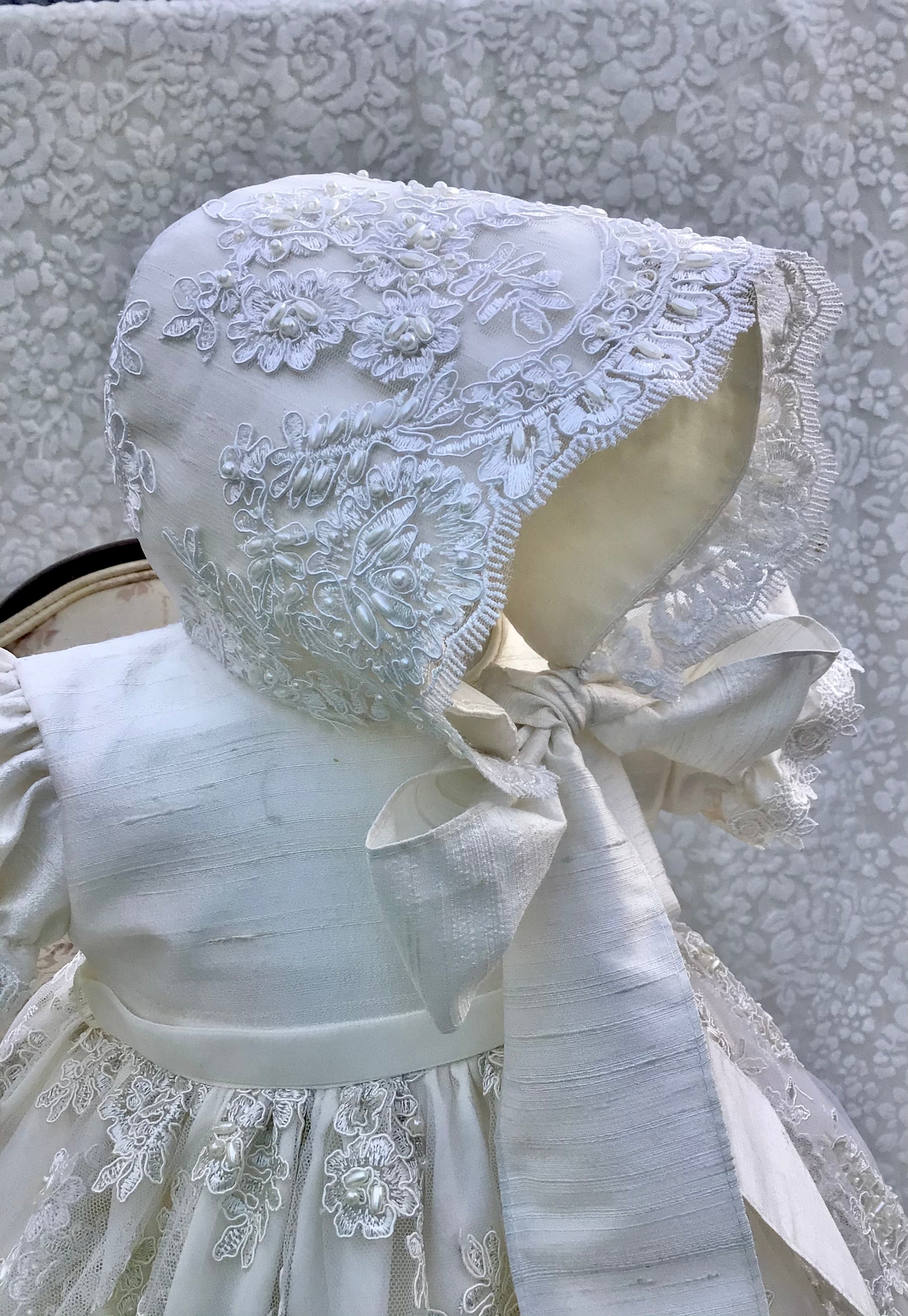Claudette is a luxurious heirloom christening gown crafted from pure silk and adorned with delicate beaded lace embroidery. Featuring a full-length skirt, hand-finished hem, and matching bonnet, it offers vintage elegance for boys or girls. Choose between puffed or long sleeves to suit your preference. Made for newborns to 24 months, this gown is designed to be treasured and passed down for generations. Dry clean only to maintain its timeless beauty.