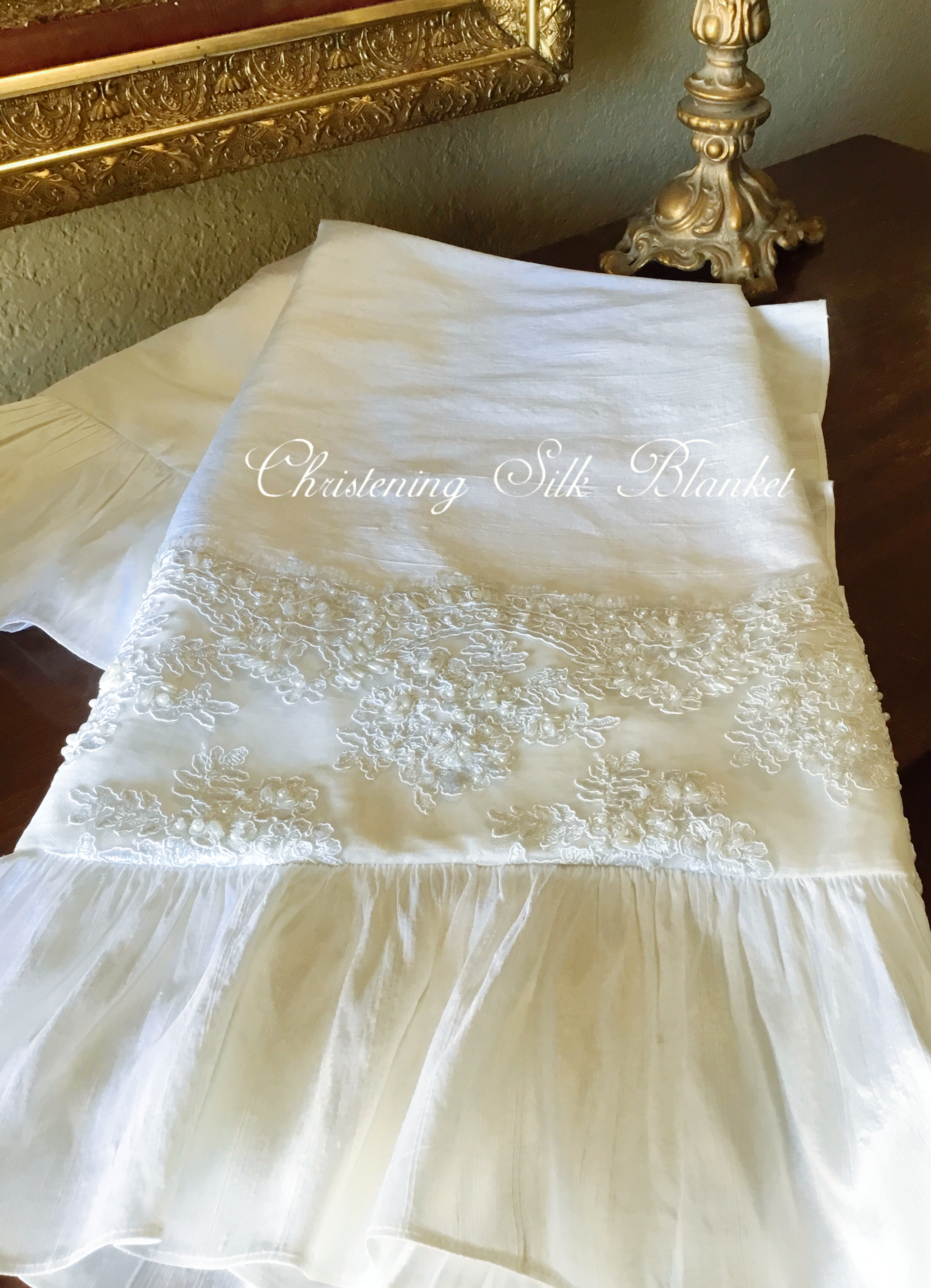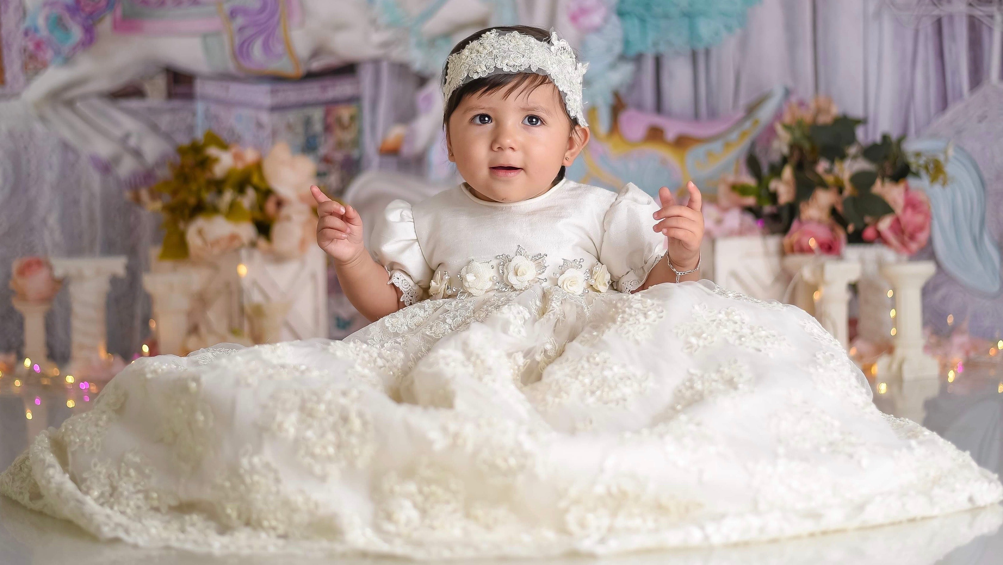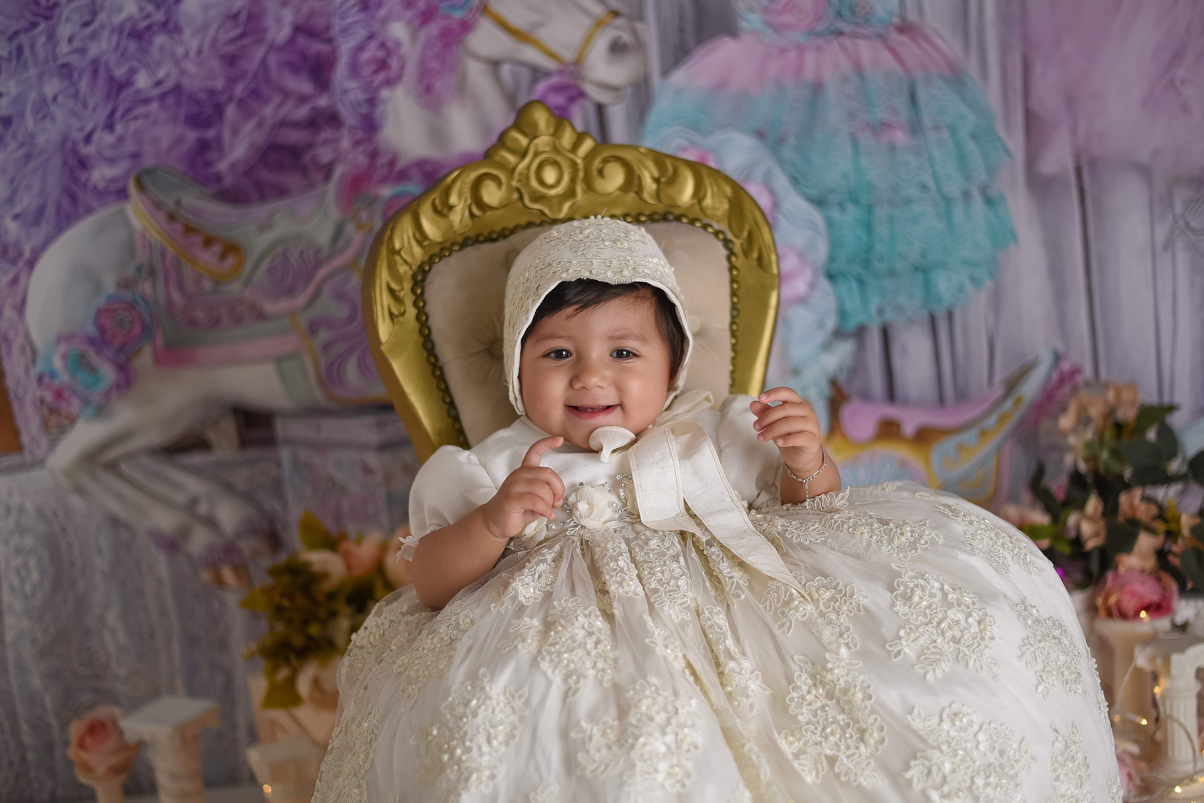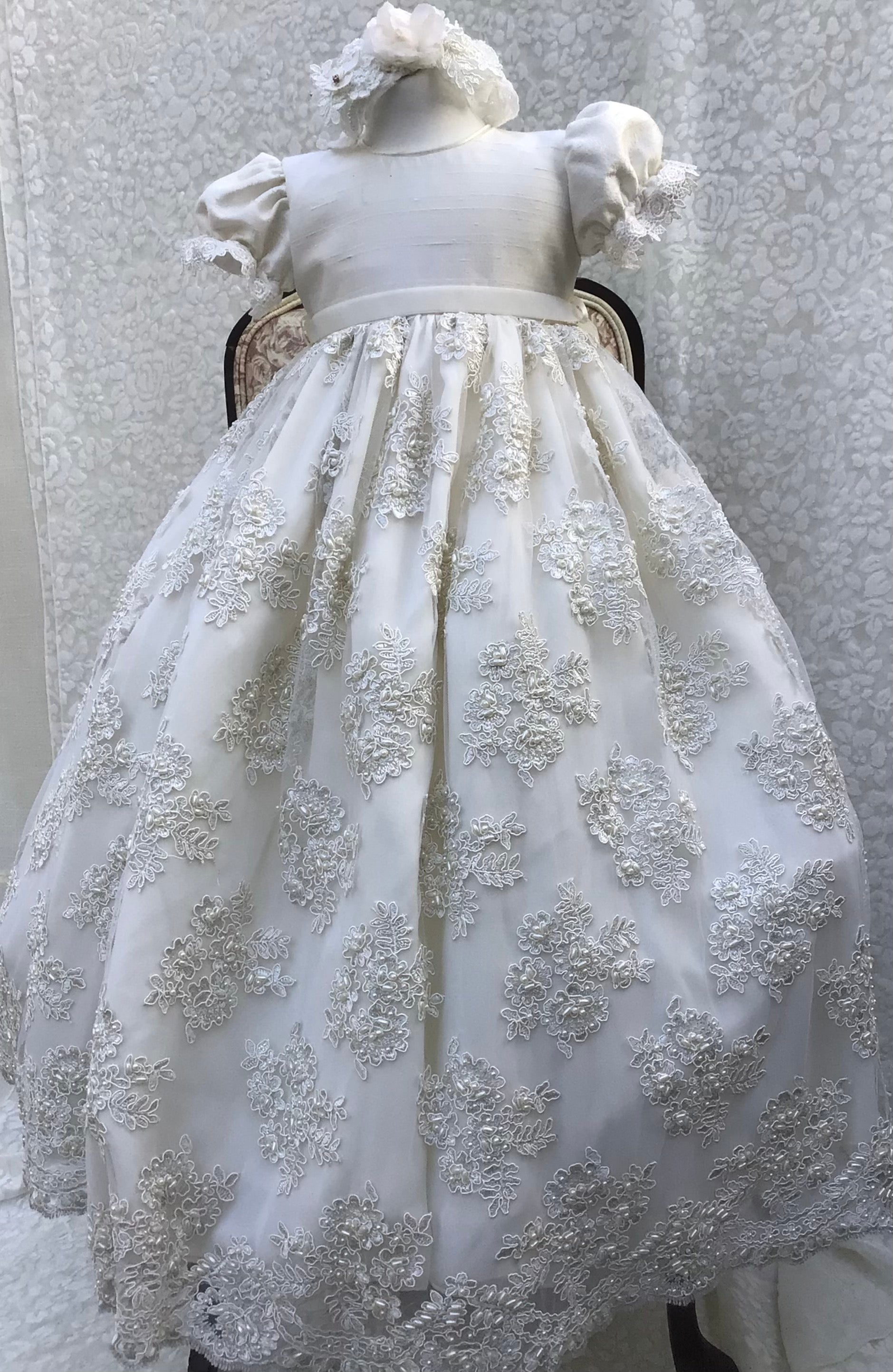 Claudette is a luxurious heirloom christening gown crafted from pure silk and adorned with delicate beaded lace embroidery. Featuring a full-length skirt, hand-finished hem, and matching bonnet, it offers vintage elegance for boys or girls. Choose between puffed or long sleeves to suit your preference. Made for newborns to 24 months, this gown is designed to be treasured and passed down for generations. Dry clean only to maintain its timeless beauty.