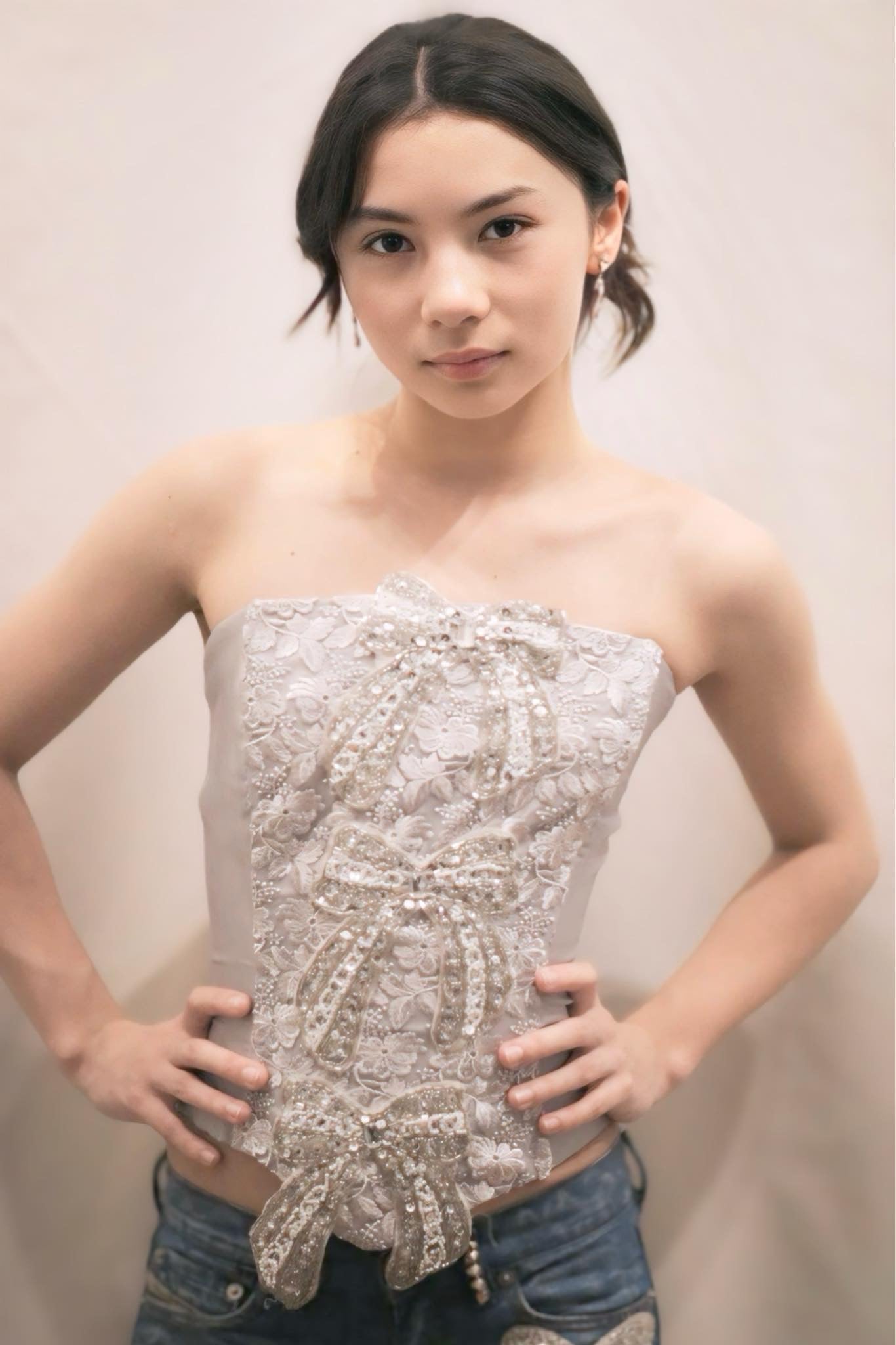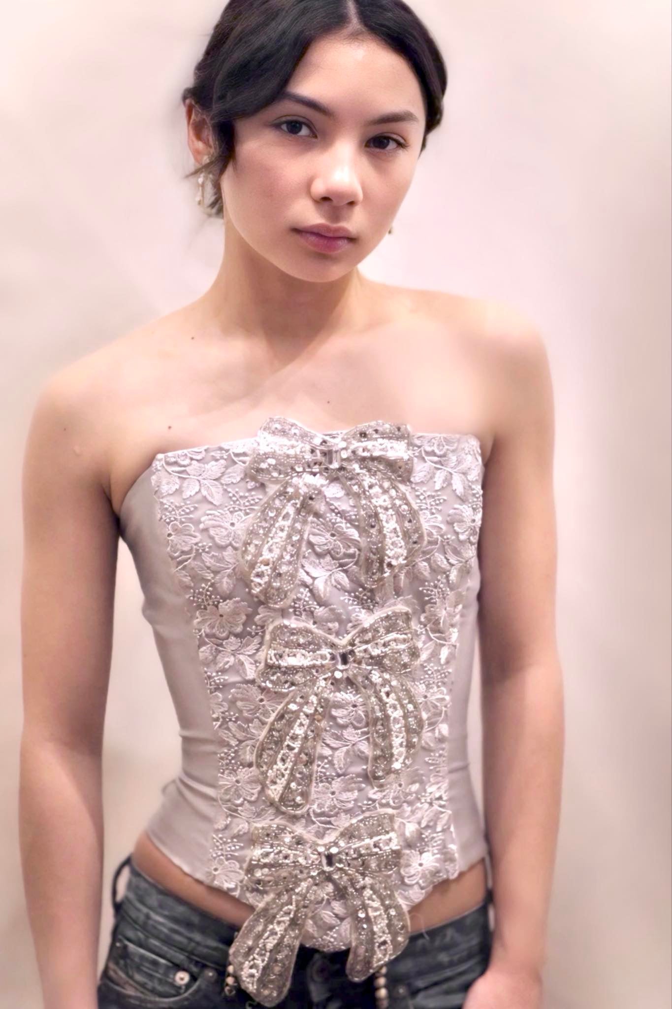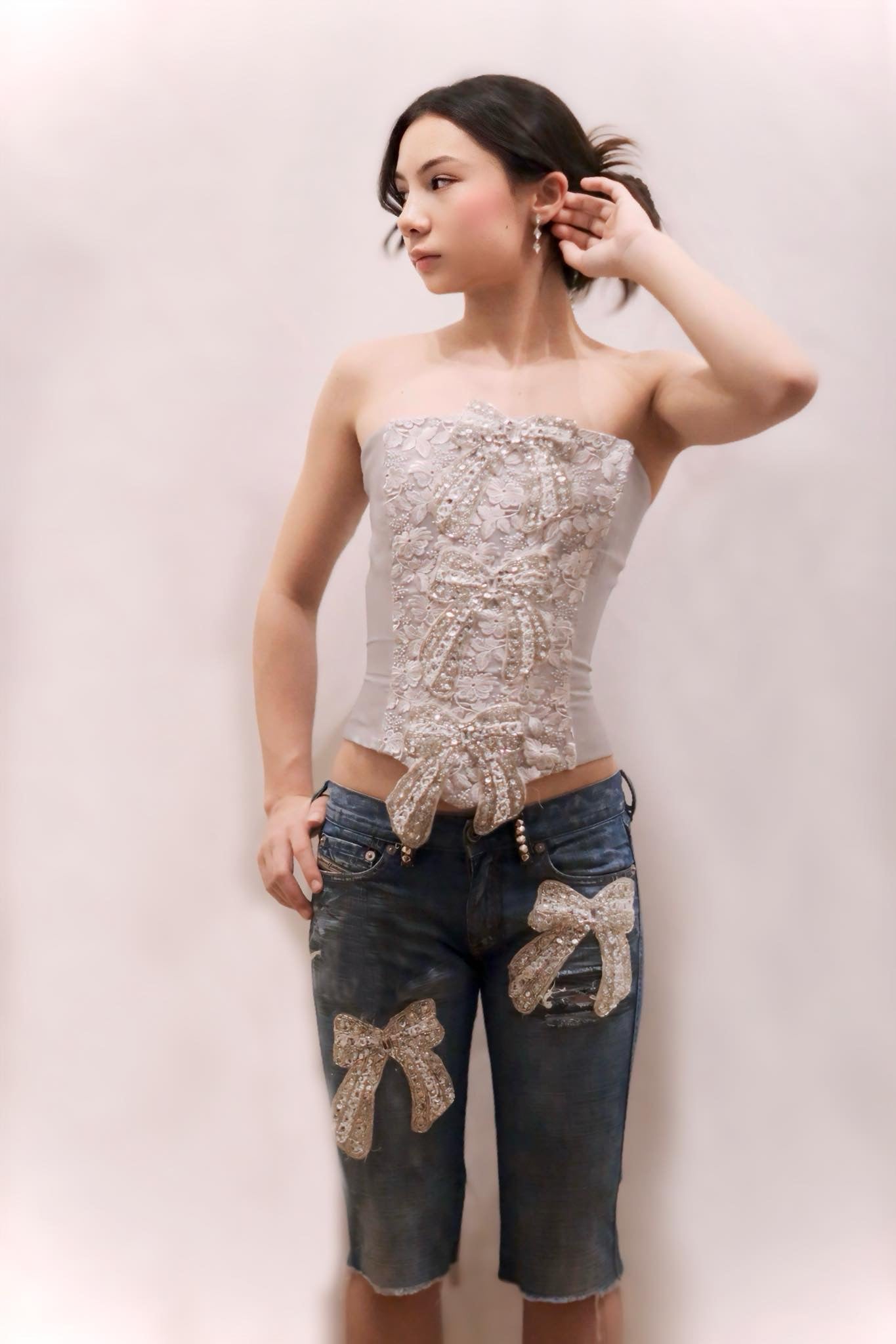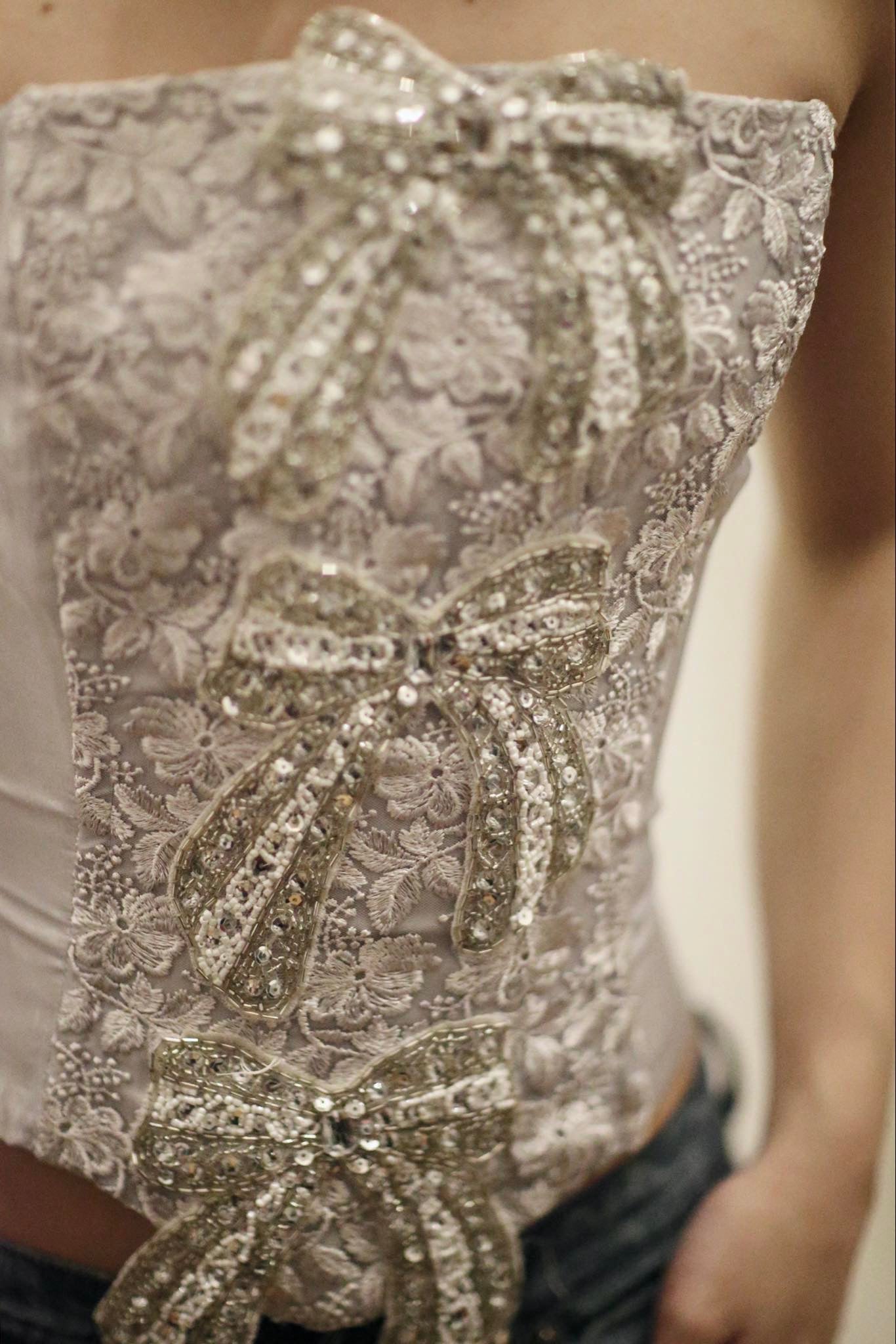 Corset and Distress custom decorated jean short (Diesel) with hand beaded bows to match the corset top.
