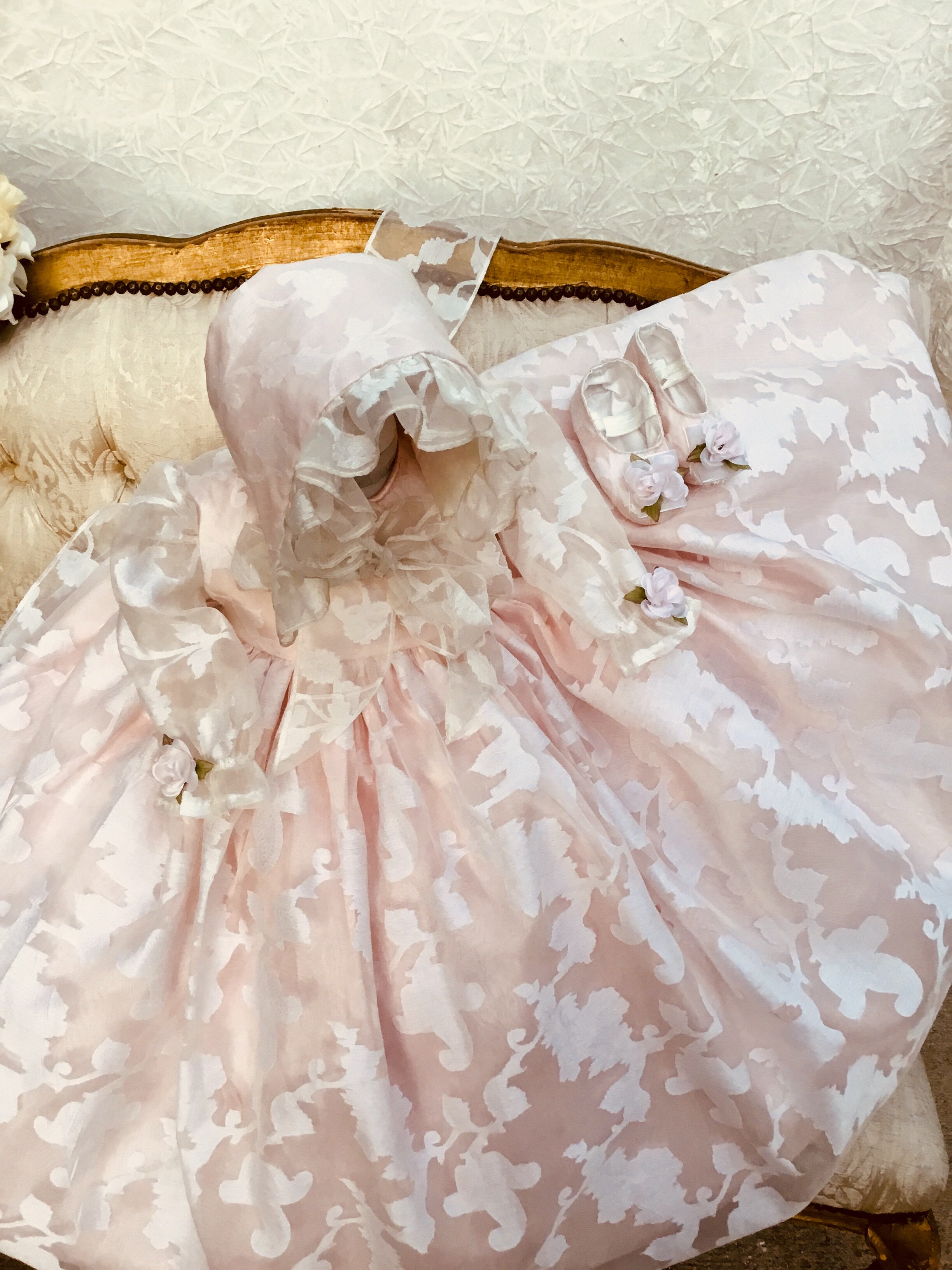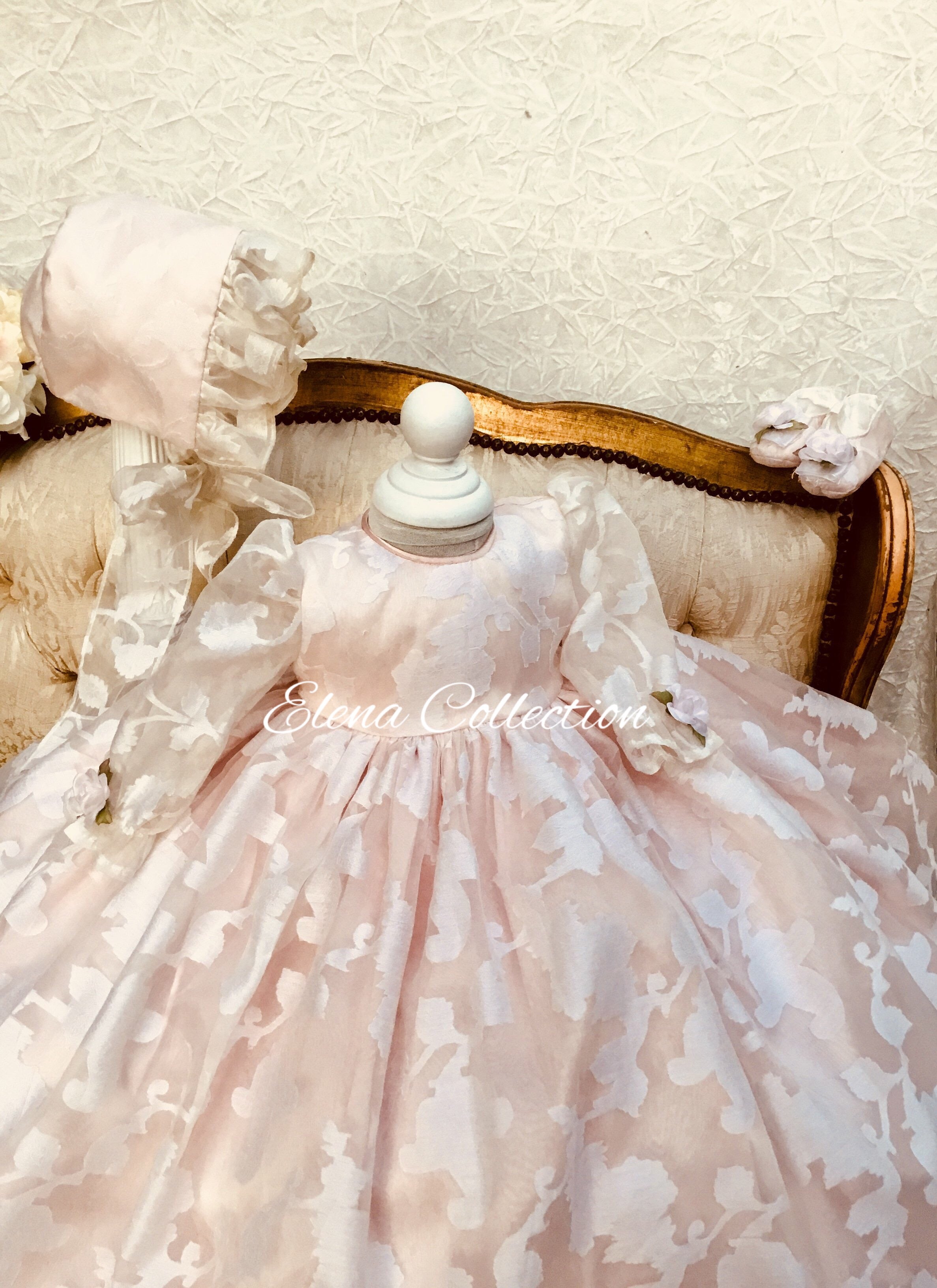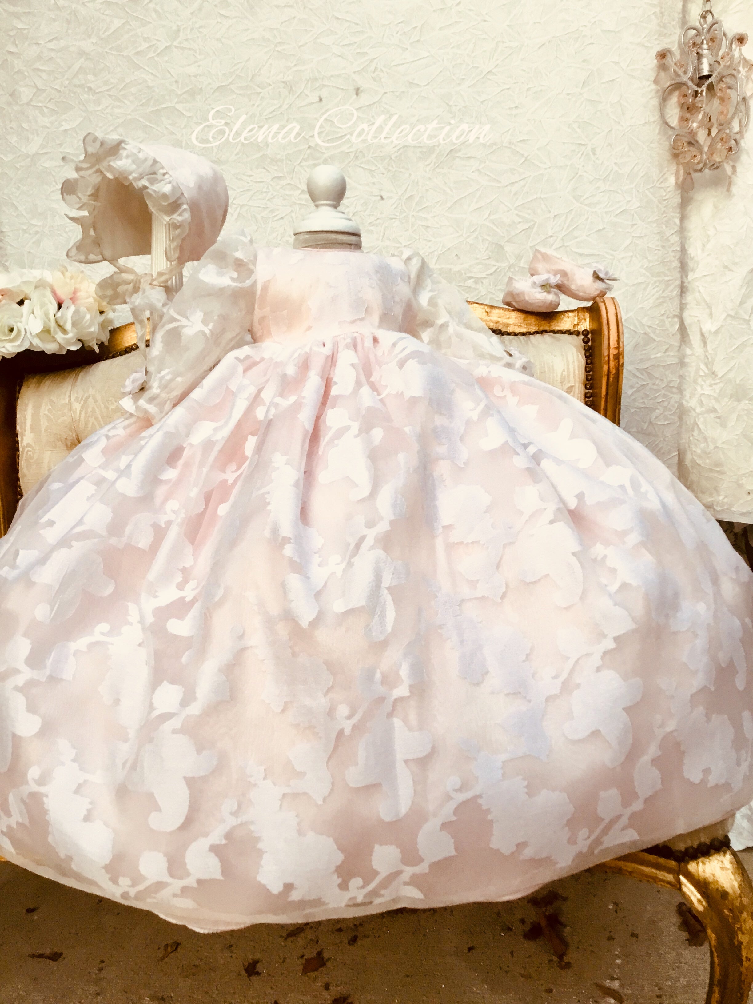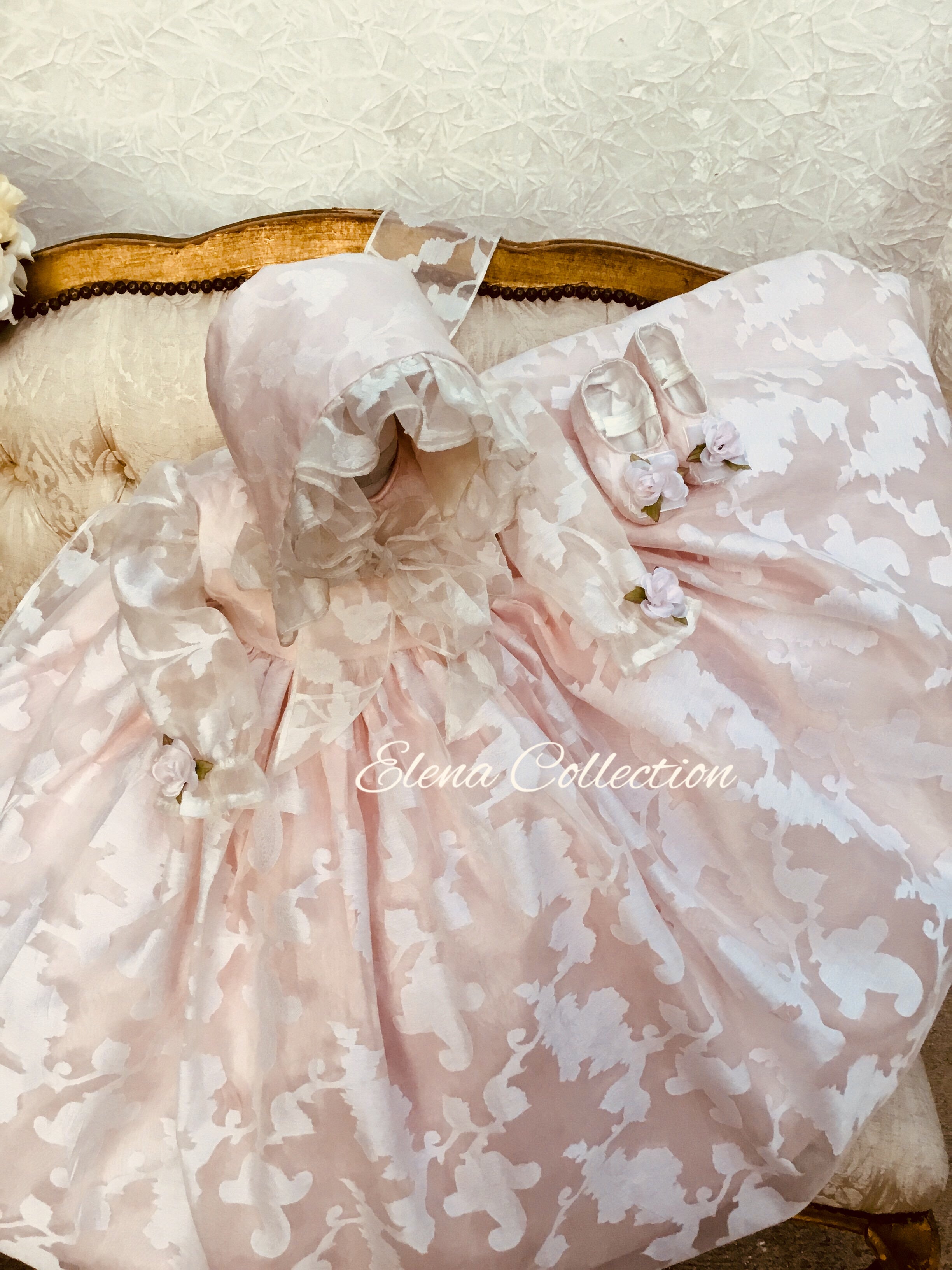Eleanor Baptism Gown is a luxurious silk organza heirloom piece designed for lasting memories. It features a voluminous silhouette with delicate floral jacquard and romantic puff sleeves. The gown comes with a matching ruffled bonnet and soft shoes for a complete ceremonial look, with an open-back closure for easy dressing. A short-sleeve option is available upon request. Fully lined for baby’s comfort, this made-to-order gown is crafted with exquisite fabrics: - Vintage silk embroidery damask organza - Floral jacquard patterns - Antique white lining (optional) Handcrafted with timeless detail and elegance.